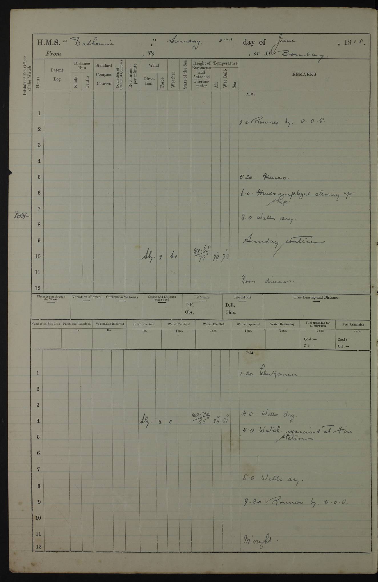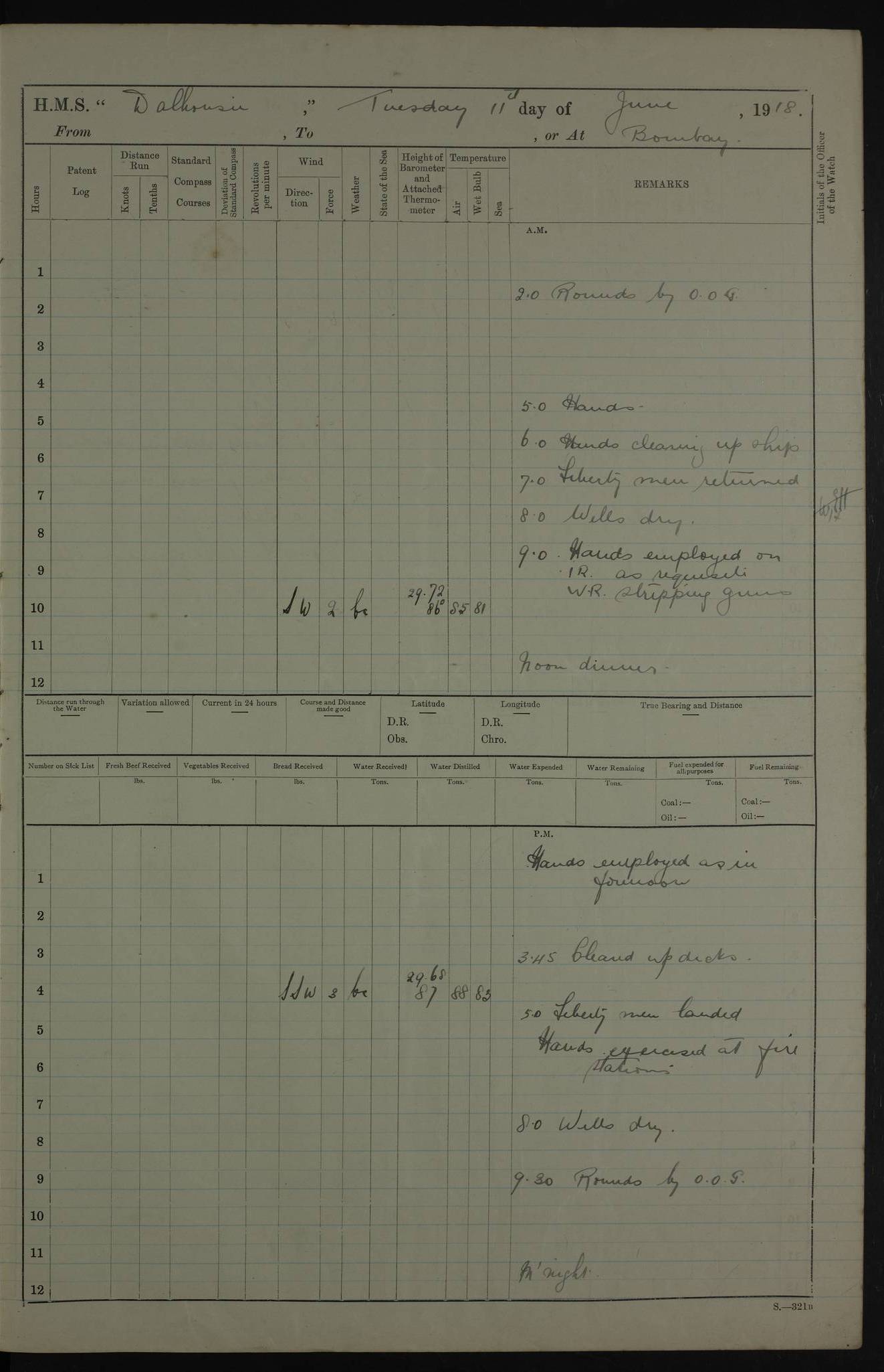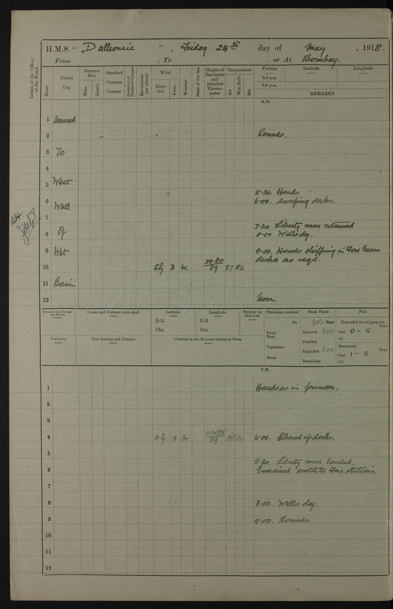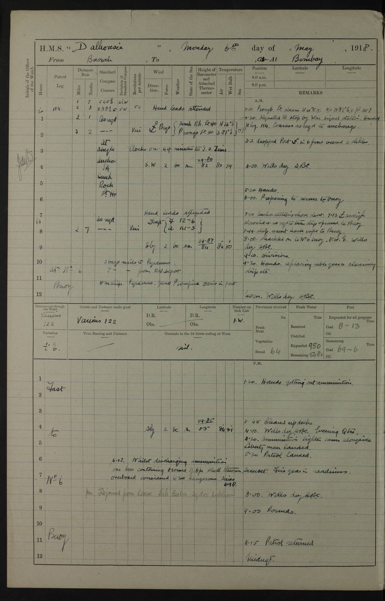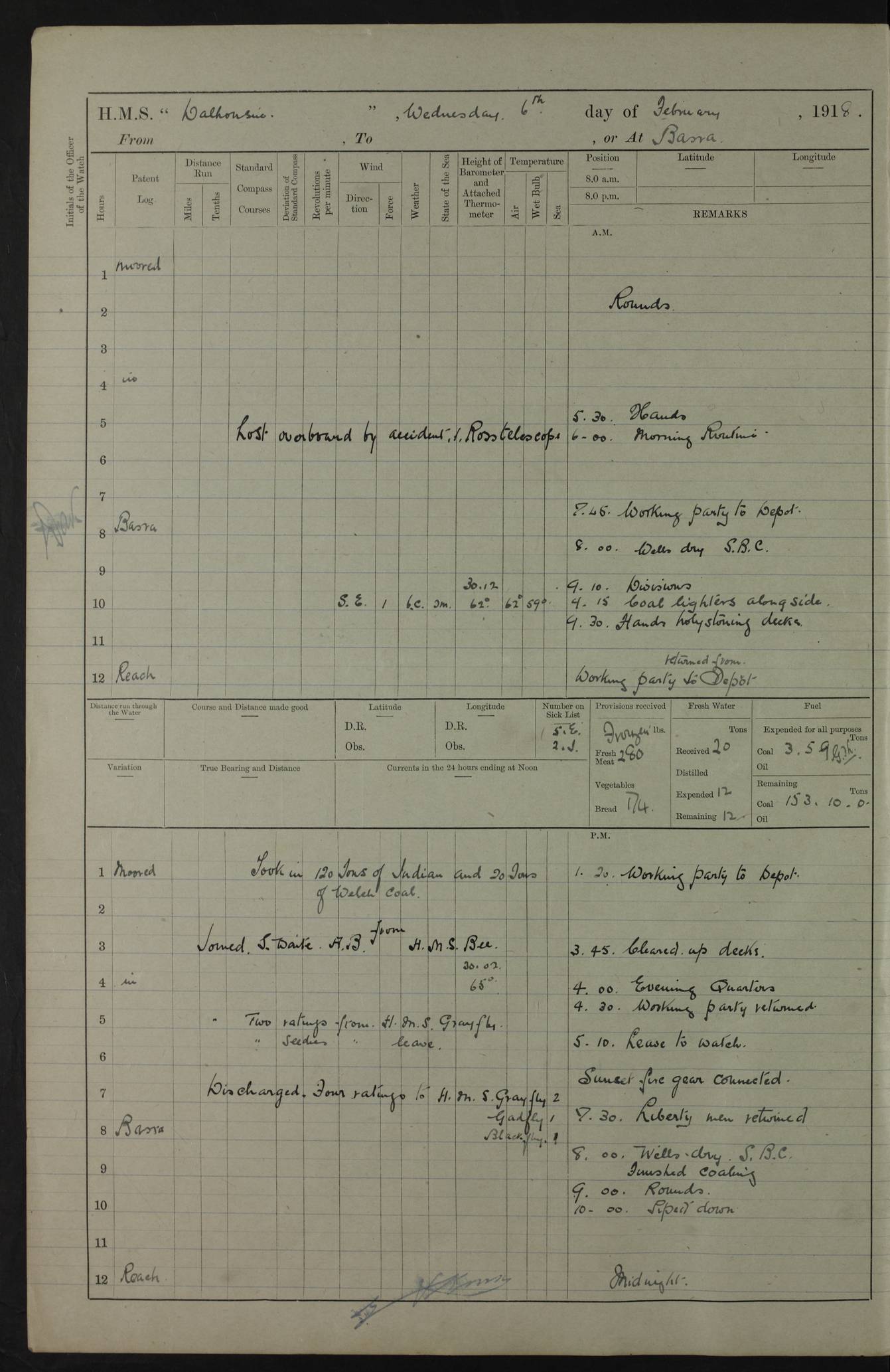 AM – Discharged To EKMA: PJ O’Connor, Lieutenant Royal Navy To Passage: 2 Indian Ratings To FLYCATCHER: D Butcher, Leading Seaman 4ef4fb19e53e0a0c910059d0: (https://s3.amazonaws.com:443/oldweather/ADM53-39410/0015_0.jpg) 26 February 1918 Place: Basrah Lat 30.5269, Long 47.8407 2:00am: Rounds 5:30am: Hands 6:00am: Morning Routine 7:45am: Working party to Depot 8:00am: Wells dry - Signal Books correct 9:10am: Divisions 10:00am: Hands employed painting in cabins & as requisite 12:00pm: Signal Books correct – Working party returned 1:20pm: Working party to Depot 3:45pm: Cleared up decks 4:00pm: Evening Quarters – Signal Books correct 4:30pm: Working party returned 5:10pm: Leave to Watch 6:00pm: Sunset - Fire Gear connected 7:30pm: Liberty men returned 8:00pm: Wells dry - Signal Books correct 9:00pm: Rounds – Signal Books correct PM – Joined From TARANTULA: J Baldwin, Leading Signalman From Hospital: Louis Mones, Engineering driver PM - Discharged To MANTIS: G Munay, Leading Signalman – C Killburn, Signalman To TARANTULA: CM Leary, Telegrapher 4ef4fb19e53e0a0c910059d1: (https://s3.amazonaws.com:443/oldweather/ADM53-39410/0015_1.jpg) 27 February 1918 Place: Basrah Lat 30.5269, Long 47.8407 2:00am: Rounds 5:30am: Hands 6:00am: Morning Routine 7:45am: Working party to Depot 8:00am: Wells dry - Signal Books correct 9:10am: Divisions 10:00am: Hands employed packing surveyed stores, cleaning out boats & painting in Warrant Ratings 12:00pm: Signal Books correct – Working party returned 1:20pm: Working party to Depot 3:45pm: Cleared up decks 4:00pm: Evening Quarters – Signal Books correct 4:30pm: Working party returned 5:10pm: Leave to Watch 6:00pm: Sunset - Fire Gear connected 7:30pm: Liberty men returned 8:00pm: Wells dry - Signal Books correct 9:00pm: Rounds – Signal Books correct AM – Joined From ELEPHANTA: No. 22 Sheik Kadir Sheik Mahomed, Lascar 2nd – No. 41 Abdool Rahman Sheik Dawood, Lamp Trimmer – No. 56 Mahomed Sabia Sheik Bosman, Stoker 2nd – No. 50A Sheik Mahomed Sheik Hassan, Stoker 2nd – No. 90 Abelino Fernandez, Topass – No. 86 Avelino Leitas, Topass 4ef4fb1ae53e0a0c910059d2: (https://s3.amazonaws.com:443/oldweather/ADM53-39410/0016_0.jpg) 28 February 1918 Place: Basrah Lat 30.5269, Long 47.8407 2:00am: Rounds 5:30am: Hands 6:00am: Morning Routine 7:45am: Working party to Depot 8:00am: Wells dry - Signal Books correct 9:10am: Divisions 10:00am: Hands employed discharging stores 12:00pm: Signal Books correct – Working party returned 1:00pm: Issued Quinine to Naval Ratings - Issued Quinine to Native Ratings 1:20pm: Working party to Depot 3:45pm: Cleared up decks 4:00pm: Evening Quarters – Signal Books correct 4:30pm: Working party returned 5:10pm: Leave to Watch 6:00pm: Sunset - Fire Gear connected 7:30pm: Liberty men returned 8:00pm: Wells dry - Signal Books correct 9:00pm: Rounds – Signal Books correct PM – Joined From SAPPHIRE: WC Woolley, Petty Officer PM - Discharged To TARANTULA: L Harris, Signalman To SEDGEFLY: T Hughes, Able Seaman To MANTIS: S Redshaw, Able Seaman To Depot: R Matheison, Stoker – H Philo, Stoker TO GRAYFLY: H Stockbridge, Senior Petty Officer 4ef4fb1ae53e0a0c910059d3: (https://s3.amazonaws.com:443/oldweather/ADM53-39410/0016_1.jpg) Log Page – Blank – no data on Page 4ef4fb1ae53e0a0c910059d4: (https://s3.amazonaws.com:443/oldweather/ADM53-39410/0017_0.jpg) Log Page – Blank – no data on Page 4ef4fb1ae53e0a0c910059d5: (https://s3.amazonaws.com:443/oldweather/ADM53-39410/0017_1.jpg) Log Page – Blank 4ef4fb1ae53e0a0c910059d6: (https://s3.amazonaws.com:443/oldweather/ADM53-39410/0018_0.jpg) Log Page – Blank 4ef4fb1ae53e0a0c910059d7: (https://s3.amazonaws.com:443/oldweather/ADM53-39410/0018_1.jpg) Log Page – Blank LOGS FOR MARCH 1918 4ef4fb1be53e0a0c910059d8: (https://s3.amazonaws.com:443/oldweather/ADM53-39411/0000_0.jpg) Log Page – Cover March 1918 4ef4fb1be53e0a0c910059d9: (https://s3.amazonaws.com:443/oldweather/ADM53-39411/0000_1.jpg) Log Page – Cover – March 1918 4ef4fb1be53e0a0c910059da: (https://s3.amazonaws.com:443/oldweather/ADM53-39411/0001_0.jpg) Log Page – Blank 4ef4fb1be53e0a0c910059db: (https://s3.amazonaws.com:443/oldweather/ADM53-39411/0001_1.jpg) Log Page – Blank – no data on Page 4ef4fb1ce53e0a0c910059dc: (https://s3.amazonaws.com:443/oldweather/ADM53-39411/0002_0.jpg) Log Page – Blank – no data on Page 4ef4fb1ce53e0a0c910059dd: (https://s3.amazonaws.com:443/oldweather/ADM53-39411/0002_1.jpg) 1 March 1918 Place: Basrah Lat 30.5269, Long 47.8407 1:00am: drew from Field Chest Treasury Officer Basrah Five thousand (5,000) Rupees only 2:00am: Rounds 5:30am: Hands 6:00am: Morning Routine 7:45am: Working party to Depot 8:00am: Wells dry – Signal Books correct – CHAKLA arrived with 5 Officers & 60 Ratings 12:00pm: Signal Books correct – Working party returned 1:15pm: Working party to Depot 2:00pm: Paid Lascar Ratings 3:45pm: Cleared up decks 4:00pm: Evening Quarters 4:30pm: Working party returned 5:10pm: Leave to Watch 5:30pm: 5 Petty Officers & 57 Ratings to Bandra for Passage 6:00pm: Sunset - Fire Gear connected 7:30pm: Liberty men returned 9:00pm: Rounds – Petty Officers returned AM – Joined From CHALKA: Hawkins, Paymaster Royal Navy PM - Discharged To FLYCATCHER: Dennis, Sub Lieutenant Royal Navy Volunteer Reserve To TARANTULA: L Harris, Signalman To SEDGEFLY: TG Hughes, Able Seaman To MANTIS: S Redshaw, Able Seaman To Depot: R Mathieson, Stoker To GRAYFLY: H Stockbridge, Senior Petty Officer 4ef4fb1ce53e0a0c910059de: (https://s3.amazonaws.com:443/oldweather/ADM53-39411/0003_0.jpg) 2 March 1918 Place: Basrah Lat 30.5269, Long 47.8407 2:00am: Rounds 5:30am: Hands 6:00am: Morning Routine 7:00am: Exercised Fire Stations 7:45am: Working party to Depot 8:00am: Wells dry - Signal Books correct 9:10am: Divisions 10:00am: Hands employed as requisite 12:00pm: Working party returned 1:15pm: Working party to Depot 3:45pm: Cleared up decks 4:00pm: Evening Quarters – Signal Books corr