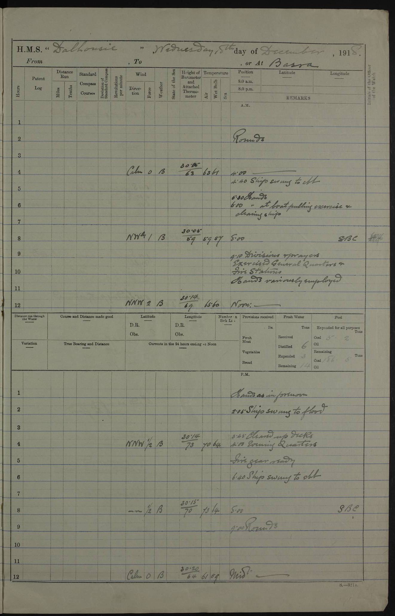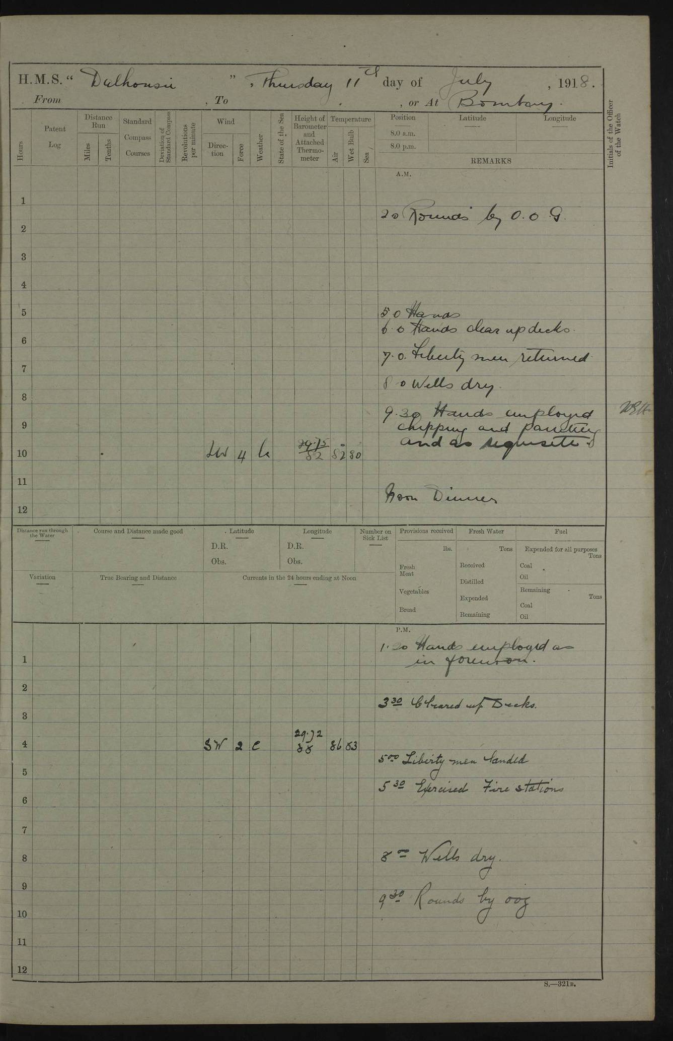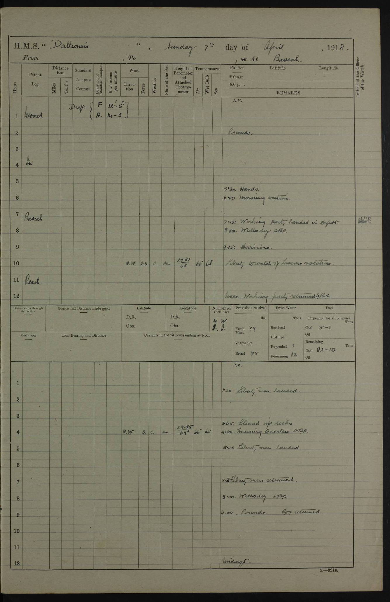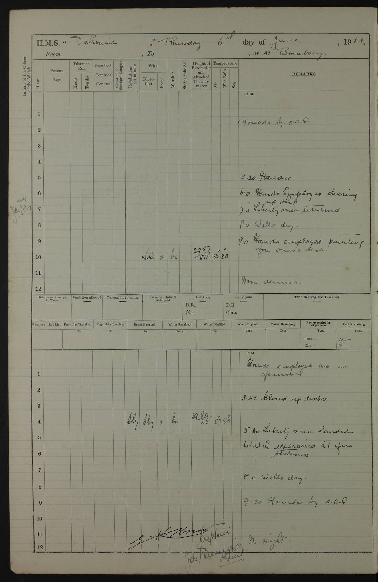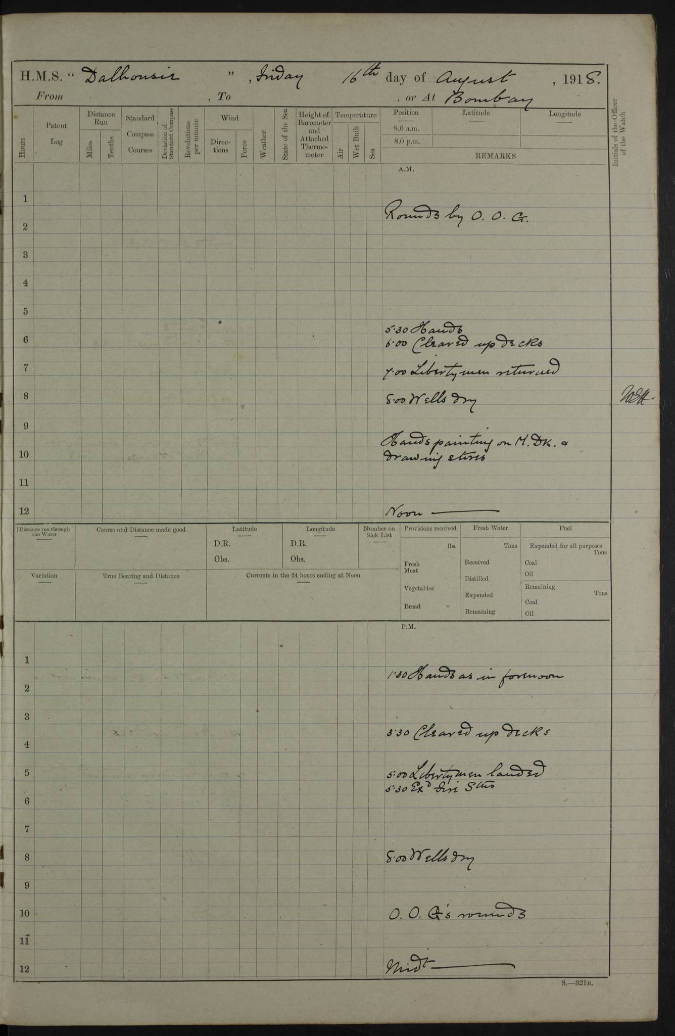 AM – Discharged To EKMA: PJ O’Connor, Lieutenant Royal Navy To Passage: 2 Indian Ratings To FLYCATCHER: D Butcher, Leading Seaman 4ef4fb19e53e0a0c910059d0: (https://s3.amazonaws.com:443/oldweather/ADM53-39410/0015_0.jpg) 26 February 1918 Place: Basrah Lat 30.5269, Long 47.8407 2:00am: Rounds 5:30am: Hands 6:00am: Morning Routine 7:45am: Working party to Depot 8:00am: Wells dry - Signal Books correct 9:10am: Divisions 10:00am: Hands employed painting in cabins & as requisite 12:00pm: Signal Books correct – Working party returned 1:20pm: Working party to Depot 3:45pm: Cleared up decks 4:00pm: Evening Quarters – Signal Books correct 4:30pm: Working party returned 5:10pm: Leave to Watch 6:00pm: Sunset - Fire Gear connected 7:30pm: Liberty men returned 8:00pm: Wells dry - Signal Books correct 9:00pm: Rounds – Signal Books correct PM – Joined From TARANTULA: J Baldwin, Leading Signalman From Hospital: Louis Mones, Engineering driver PM - Discharged To MANTIS: G Munay, Leading Signalman – C Killburn, Signalman To TARANTULA: CM Leary, Telegrapher 4ef4fb19e53e0a0c910059d1: (https://s3.amazonaws.com:443/oldweather/ADM53-39410/0015_1.jpg) 27 February 1918 Place: Basrah Lat 30.5269, Long 47.8407 2:00am: Rounds 5:30am: Hands 6:00am: Morning Routine 7:45am: Working party to Depot 8:00am: Wells dry - Signal Books correct 9:10am: Divisions 10:00am: Hands employed packing surveyed stores, cleaning out boats & painting in Warrant Ratings 12:00pm: Signal Books correct – Working party returned 1:20pm: Working party to Depot 3:45pm: Cleared up decks 4:00pm: Evening Quarters – Signal Books correct 4:30pm: Working party returned 5:10pm: Leave to Watch 6:00pm: Sunset - Fire Gear connected 7:30pm: Liberty men returned 8:00pm: Wells dry - Signal Books correct 9:00pm: Rounds – Signal Books correct AM – Joined From ELEPHANTA: No. 22 Sheik Kadir Sheik Mahomed, Lascar 2nd – No. 41 Abdool Rahman Sheik Dawood, Lamp Trimmer – No. 56 Mahomed Sabia Sheik Bosman, Stoker 2nd – No. 50A Sheik Mahomed Sheik Hassan, Stoker 2nd – No. 90 Abelino Fernandez, Topass – No. 86 Avelino Leitas, Topass 4ef4fb1ae53e0a0c910059d2: (https://s3.amazonaws.com:443/oldweather/ADM53-39410/0016_0.jpg) 28 February 1918 Place: Basrah Lat 30.5269, Long 47.8407 2:00am: Rounds 5:30am: Hands 6:00am: Morning Routine 7:45am: Working party to Depot 8:00am: Wells dry - Signal Books correct 9:10am: Divisions 10:00am: Hands employed discharging stores 12:00pm: Signal Books correct – Working party returned 1:00pm: Issued Quinine to Naval Ratings - Issued Quinine to Native Ratings 1:20pm: Working party to Depot 3:45pm: Cleared up decks 4:00pm: Evening Quarters – Signal Books correct 4:30pm: Working party returned 5:10pm: Leave to Watch 6:00pm: Sunset - Fire Gear connected 7:30pm: Liberty men returned 8:00pm: Wells dry - Signal Books correct 9:00pm: Rounds – Signal Books correct PM – Joined From SAPPHIRE: WC Woolley, Petty Officer PM - Discharged To TARANTULA: L Harris, Signalman To SEDGEFLY: T Hughes, Able Seaman To MANTIS: S Redshaw, Able Seaman To Depot: R Matheison, Stoker – H Philo, Stoker TO GRAYFLY: H Stockbridge, Senior Petty Officer 4ef4fb1ae53e0a0c910059d3: (https://s3.amazonaws.com:443/oldweather/ADM53-39410/0016_1.jpg) Log Page – Blank – no data on Page 4ef4fb1ae53e0a0c910059d4: (https://s3.amazonaws.com:443/oldweather/ADM53-39410/0017_0.jpg) Log Page – Blank – no data on Page 4ef4fb1ae53e0a0c910059d5: (https://s3.amazonaws.com:443/oldweather/ADM53-39410/0017_1.jpg) Log Page – Blank 4ef4fb1ae53e0a0c910059d6: (https://s3.amazonaws.com:443/oldweather/ADM53-39410/0018_0.jpg) Log Page – Blank 4ef4fb1ae53e0a0c910059d7: (https://s3.amazonaws.com:443/oldweather/ADM53-39410/0018_1.jpg) Log Page – Blank LOGS FOR MARCH 1918 4ef4fb1be53e0a0c910059d8: (https://s3.amazonaws.com:443/oldweather/ADM53-39411/0000_0.jpg) Log Page – Cover March 1918 4ef4fb1be53e0a0c910059d9: (https://s3.amazonaws.com:443/oldweather/ADM53-39411/0000_1.jpg) Log Page – Cover – March 1918 4ef4fb1be53e0a0c910059da: (https://s3.amazonaws.com:443/oldweather/ADM53-39411/0001_0.jpg) Log Page – Blank 4ef4fb1be53e0a0c910059db: (https://s3.amazonaws.com:443/oldweather/ADM53-39411/0001_1.jpg) Log Page – Blank – no data on Page 4ef4fb1ce53e0a0c910059dc: (https://s3.amazonaws.com:443/oldweather/ADM53-39411/0002_0.jpg) Log Page – Blank – no data on Page 4ef4fb1ce53e0a0c910059dd: (https://s3.amazonaws.com:443/oldweather/ADM53-39411/0002_1.jpg) 1 March 1918 Place: Basrah Lat 30.5269, Long 47.8407 1:00am: drew from Field Chest Treasury Officer Basrah Five thousand (5,000) Rupees only 2:00am: Rounds 5:30am: Hands 6:00am: Morning Routine 7:45am: Working party to Depot 8:00am: Wells dry – Signal Books correct – CHAKLA arrived with 5 Officers & 60 Ratings 12:00pm: Signal Books correct – Working party returned 1:15pm: Working party to Depot 2:00pm: Paid Lascar Ratings 3:45pm: Cleared up decks 4:00pm: Evening Quarters 4:30pm: Working party returned 5:10pm: Leave to Watch 5:30pm: 5 Petty Officers & 57 Ratings to Bandra for Passage 6:00pm: Sunset - Fire Gear connected 7:30pm: Liberty men returned 9:00pm: Rounds – Petty Officers returned AM – Joined From CHALKA: Hawkins, Paymaster Royal Navy PM - Discharged To FLYCATCHER: Dennis, Sub Lieutenant Royal Navy Volunteer Reserve To TARANTULA: L Harris, Signalman To SEDGEFLY: TG Hughes, Able Seaman To MANTIS: S Redshaw, Able Seaman To Depot: R Mathieson, Stoker To GRAYFLY: H Stockbridge, Senior Petty Officer 4ef4fb1ce53e0a0c910059de: (https://s3.amazonaws.com:443/oldweather/ADM53-39411/0003_0.jpg) 2 March 1918 Place: Basrah Lat 30.5269, Long 47.8407 2:00am: Rounds 5:30am: Hands 6:00am: Morning Routine 7:00am: Exercised Fire Stations 7:45am: Working party to Depot 8:00am: Wells dry - Signal Books correct 9:10am: Divisions 10:00am: Hands employed as requisite 12:00pm: Working party returned 1:15pm: Working party to Depot 3:45pm: Cleared up decks 4:00pm: Evening Quarters – Signal Books corr