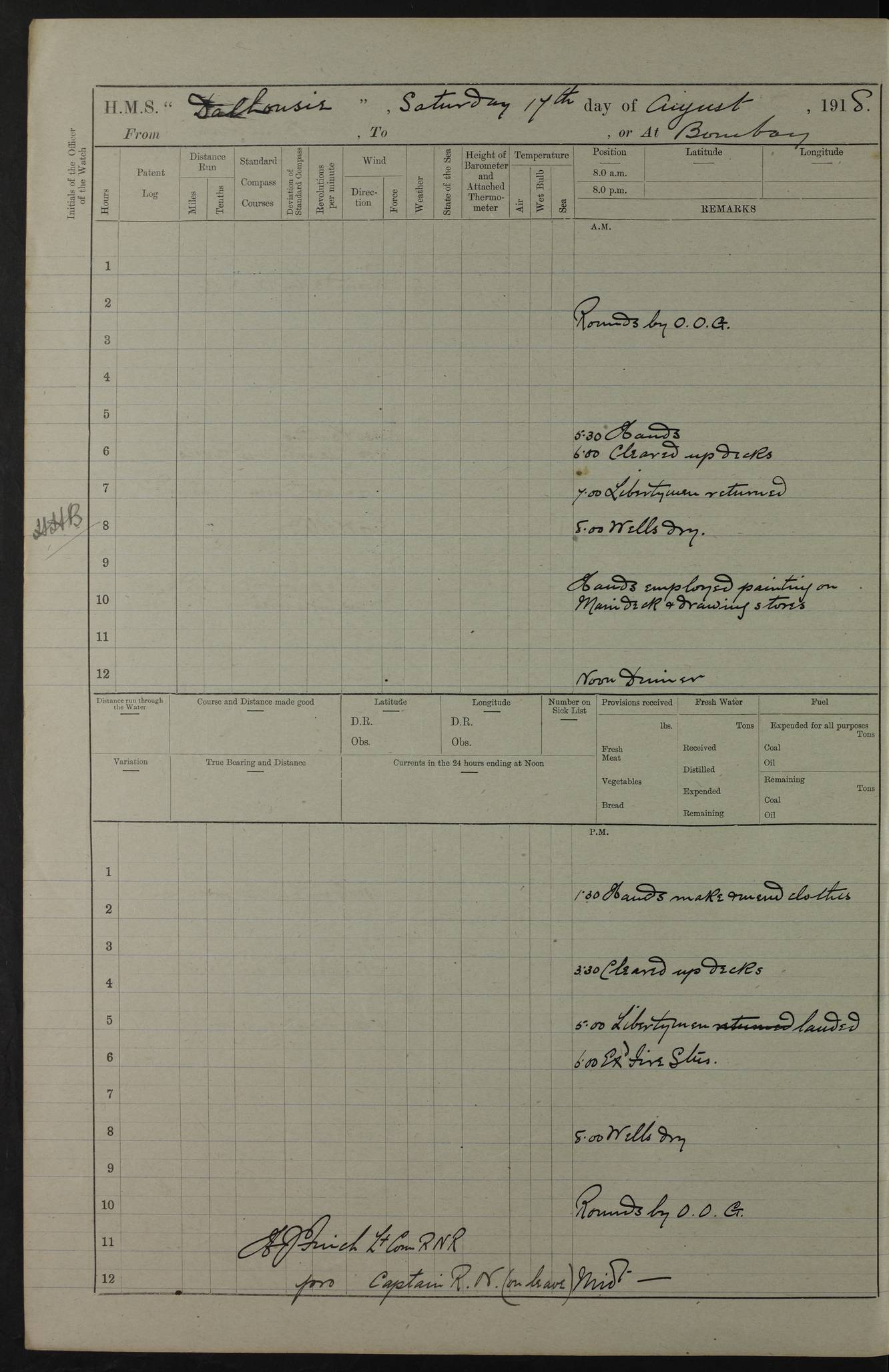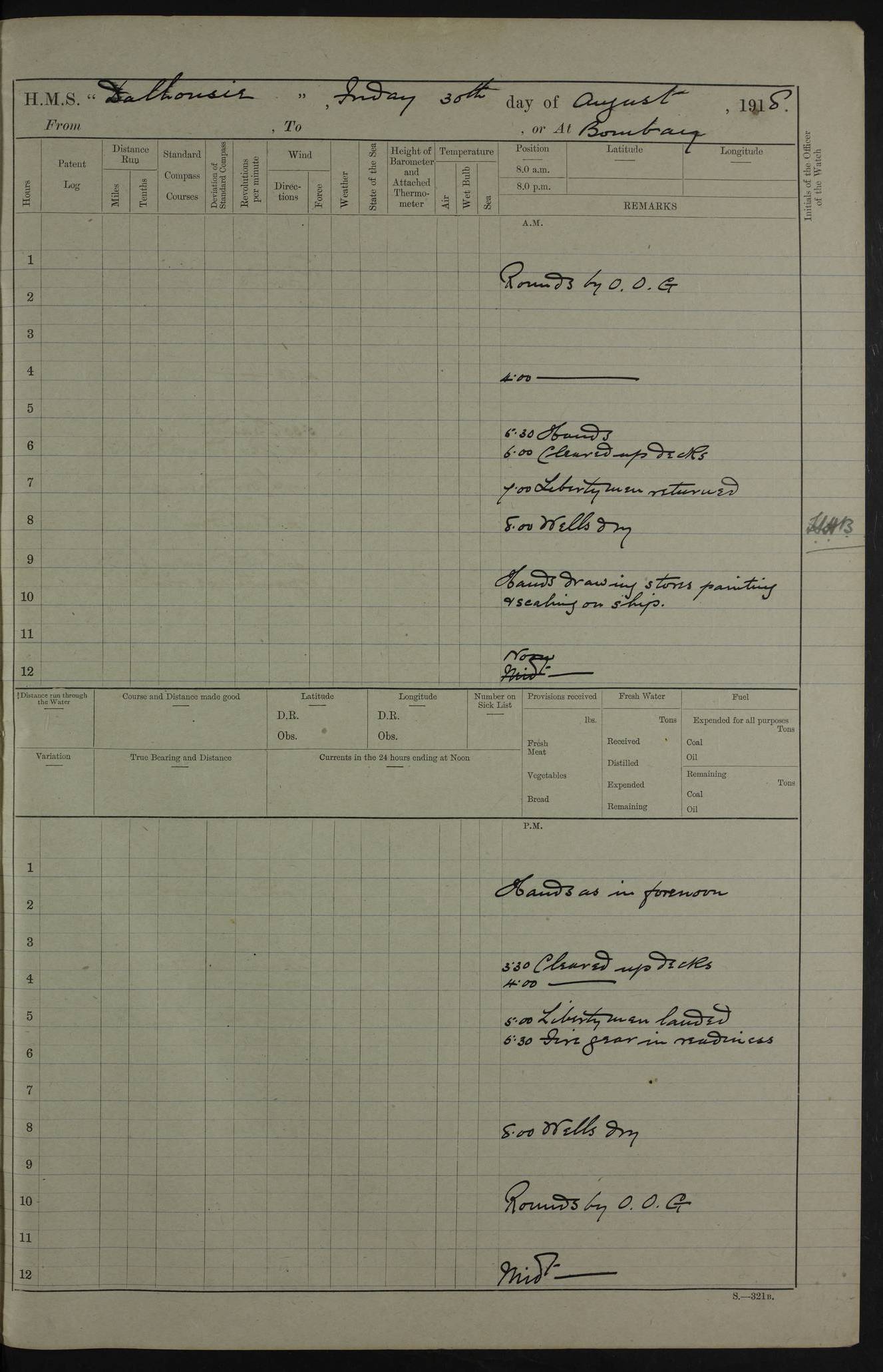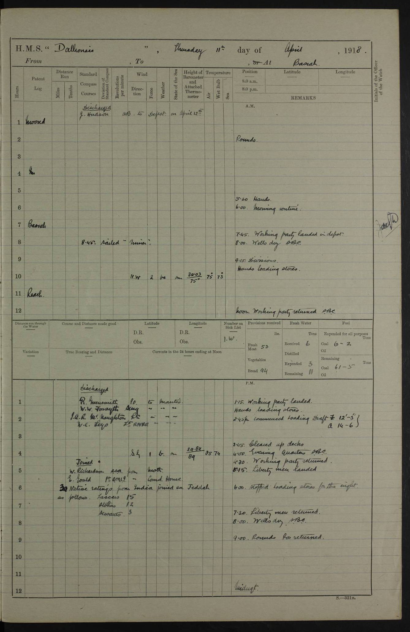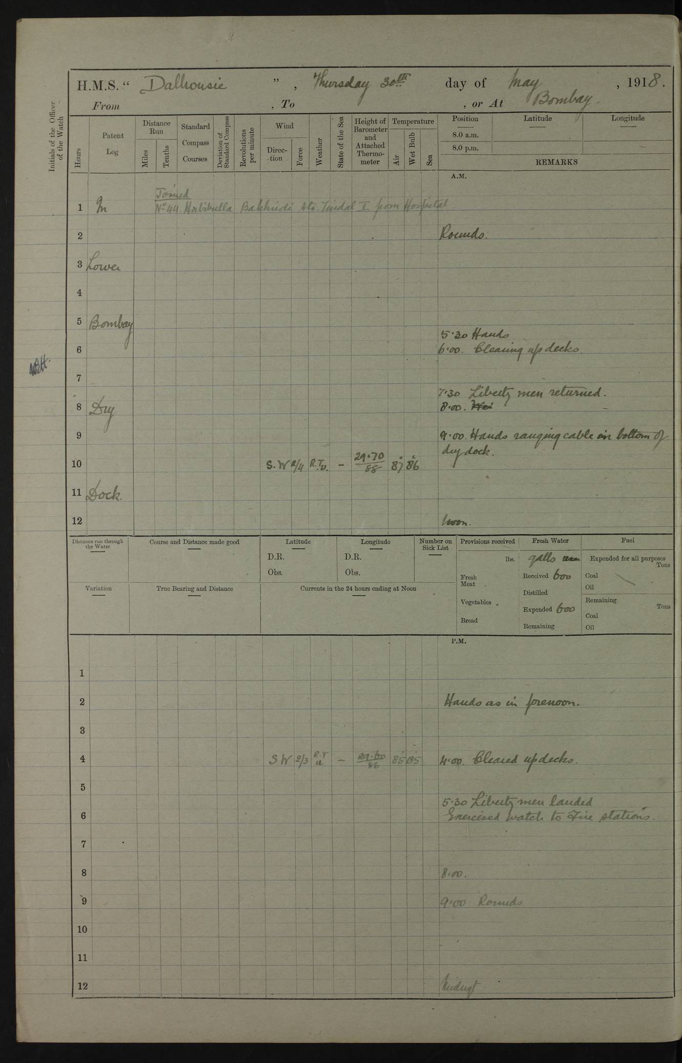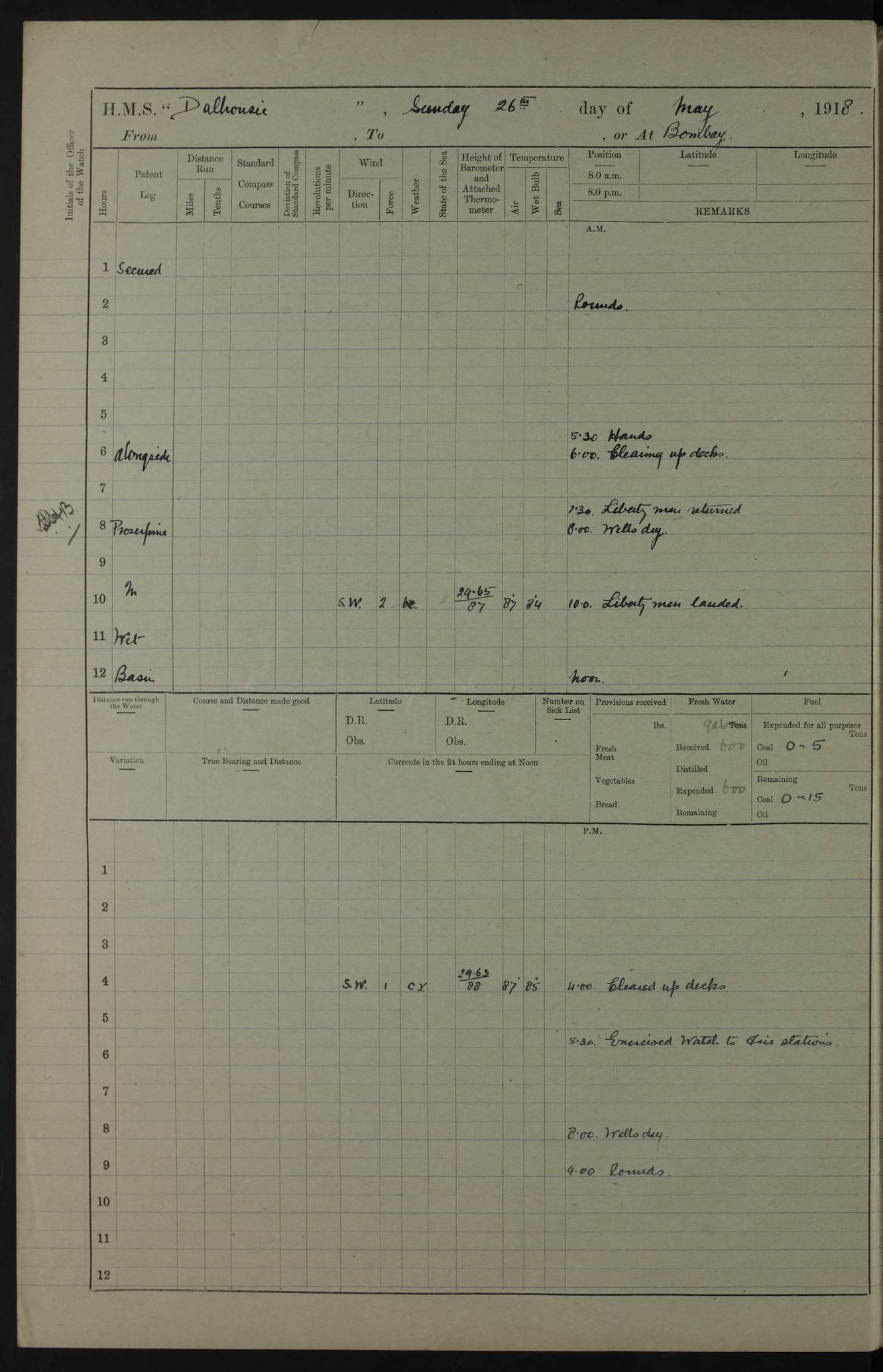 AM – Discharged To EKMA: PJ O’Connor, Lieutenant Royal Navy To Passage: 2 Indian Ratings To FLYCATCHER: D Butcher, Leading Seaman 4ef4fb19e53e0a0c910059d0: (https://s3.amazonaws.com:443/oldweather/ADM53-39410/0015_0.jpg) 26 February 1918 Place: Basrah Lat 30.5269, Long 47.8407 2:00am: Rounds 5:30am: Hands 6:00am: Morning Routine 7:45am: Working party to Depot 8:00am: Wells dry - Signal Books correct 9:10am: Divisions 10:00am: Hands employed painting in cabins & as requisite 12:00pm: Signal Books correct – Working party returned 1:20pm: Working party to Depot 3:45pm: Cleared up decks 4:00pm: Evening Quarters – Signal Books correct 4:30pm: Working party returned 5:10pm: Leave to Watch 6:00pm: Sunset - Fire Gear connected 7:30pm: Liberty men returned 8:00pm: Wells dry - Signal Books correct 9:00pm: Rounds – Signal Books correct PM – Joined From TARANTULA: J Baldwin, Leading Signalman From Hospital: Louis Mones, Engineering driver PM - Discharged To MANTIS: G Munay, Leading Signalman – C Killburn, Signalman To TARANTULA: CM Leary, Telegrapher 4ef4fb19e53e0a0c910059d1: (https://s3.amazonaws.com:443/oldweather/ADM53-39410/0015_1.jpg) 27 February 1918 Place: Basrah Lat 30.5269, Long 47.8407 2:00am: Rounds 5:30am: Hands 6:00am: Morning Routine 7:45am: Working party to Depot 8:00am: Wells dry - Signal Books correct 9:10am: Divisions 10:00am: Hands employed packing surveyed stores, cleaning out boats & painting in Warrant Ratings 12:00pm: Signal Books correct – Working party returned 1:20pm: Working party to Depot 3:45pm: Cleared up decks 4:00pm: Evening Quarters – Signal Books correct 4:30pm: Working party returned 5:10pm: Leave to Watch 6:00pm: Sunset - Fire Gear connected 7:30pm: Liberty men returned 8:00pm: Wells dry - Signal Books correct 9:00pm: Rounds – Signal Books correct AM – Joined From ELEPHANTA: No. 22 Sheik Kadir Sheik Mahomed, Lascar 2nd – No. 41 Abdool Rahman Sheik Dawood, Lamp Trimmer – No. 56 Mahomed Sabia Sheik Bosman, Stoker 2nd – No. 50A Sheik Mahomed Sheik Hassan, Stoker 2nd – No. 90 Abelino Fernandez, Topass – No. 86 Avelino Leitas, Topass 4ef4fb1ae53e0a0c910059d2: (https://s3.amazonaws.com:443/oldweather/ADM53-39410/0016_0.jpg) 28 February 1918 Place: Basrah Lat 30.5269, Long 47.8407 2:00am: Rounds 5:30am: Hands 6:00am: Morning Routine 7:45am: Working party to Depot 8:00am: Wells dry - Signal Books correct 9:10am: Divisions 10:00am: Hands employed discharging stores 12:00pm: Signal Books correct – Working party returned 1:00pm: Issued Quinine to Naval Ratings - Issued Quinine to Native Ratings 1:20pm: Working party to Depot 3:45pm: Cleared up decks 4:00pm: Evening Quarters – Signal Books correct 4:30pm: Working party returned 5:10pm: Leave to Watch 6:00pm: Sunset - Fire Gear connected 7:30pm: Liberty men returned 8:00pm: Wells dry - Signal Books correct 9:00pm: Rounds – Signal Books correct PM – Joined From SAPPHIRE: WC Woolley, Petty Officer PM - Discharged To TARANTULA: L Harris, Signalman To SEDGEFLY: T Hughes, Able Seaman To MANTIS: S Redshaw, Able Seaman To Depot: R Matheison, Stoker – H Philo, Stoker TO GRAYFLY: H Stockbridge, Senior Petty Officer 4ef4fb1ae53e0a0c910059d3: (https://s3.amazonaws.com:443/oldweather/ADM53-39410/0016_1.jpg) Log Page – Blank – no data on Page 4ef4fb1ae53e0a0c910059d4: (https://s3.amazonaws.com:443/oldweather/ADM53-39410/0017_0.jpg) Log Page – Blank – no data on Page 4ef4fb1ae53e0a0c910059d5: (https://s3.amazonaws.com:443/oldweather/ADM53-39410/0017_1.jpg) Log Page – Blank 4ef4fb1ae53e0a0c910059d6: (https://s3.amazonaws.com:443/oldweather/ADM53-39410/0018_0.jpg) Log Page – Blank 4ef4fb1ae53e0a0c910059d7: (https://s3.amazonaws.com:443/oldweather/ADM53-39410/0018_1.jpg) Log Page – Blank LOGS FOR MARCH 1918 4ef4fb1be53e0a0c910059d8: (https://s3.amazonaws.com:443/oldweather/ADM53-39411/0000_0.jpg) Log Page – Cover March 1918 4ef4fb1be53e0a0c910059d9: (https://s3.amazonaws.com:443/oldweather/ADM53-39411/0000_1.jpg) Log Page – Cover – March 1918 4ef4fb1be53e0a0c910059da: (https://s3.amazonaws.com:443/oldweather/ADM53-39411/0001_0.jpg) Log Page – Blank 4ef4fb1be53e0a0c910059db: (https://s3.amazonaws.com:443/oldweather/ADM53-39411/0001_1.jpg) Log Page – Blank – no data on Page 4ef4fb1ce53e0a0c910059dc: (https://s3.amazonaws.com:443/oldweather/ADM53-39411/0002_0.jpg) Log Page – Blank – no data on Page 4ef4fb1ce53e0a0c910059dd: (https://s3.amazonaws.com:443/oldweather/ADM53-39411/0002_1.jpg) 1 March 1918 Place: Basrah Lat 30.5269, Long 47.8407 1:00am: drew from Field Chest Treasury Officer Basrah Five thousand (5,000) Rupees only 2:00am: Rounds 5:30am: Hands 6:00am: Morning Routine 7:45am: Working party to Depot 8:00am: Wells dry – Signal Books correct – CHAKLA arrived with 5 Officers & 60 Ratings 12:00pm: Signal Books correct – Working party returned 1:15pm: Working party to Depot 2:00pm: Paid Lascar Ratings 3:45pm: Cleared up decks 4:00pm: Evening Quarters 4:30pm: Working party returned 5:10pm: Leave to Watch 5:30pm: 5 Petty Officers & 57 Ratings to Bandra for Passage 6:00pm: Sunset - Fire Gear connected 7:30pm: Liberty men returned 9:00pm: Rounds – Petty Officers returned AM – Joined From CHALKA: Hawkins, Paymaster Royal Navy PM - Discharged To FLYCATCHER: Dennis, Sub Lieutenant Royal Navy Volunteer Reserve To TARANTULA: L Harris, Signalman To SEDGEFLY: TG Hughes, Able Seaman To MANTIS: S Redshaw, Able Seaman To Depot: R Mathieson, Stoker To GRAYFLY: H Stockbridge, Senior Petty Officer 4ef4fb1ce53e0a0c910059de: (https://s3.amazonaws.com:443/oldweather/ADM53-39411/0003_0.jpg) 2 March 1918 Place: Basrah Lat 30.5269, Long 47.8407 2:00am: Rounds 5:30am: Hands 6:00am: Morning Routine 7:00am: Exercised Fire Stations 7:45am: Working party to Depot 8:00am: Wells dry - Signal Books correct 9:10am: Divisions 10:00am: Hands employed as requisite 12:00pm: Working party returned 1:15pm: Working party to Depot 3:45pm: Cleared up decks 4:00pm: Evening Quarters – Signal Books corr