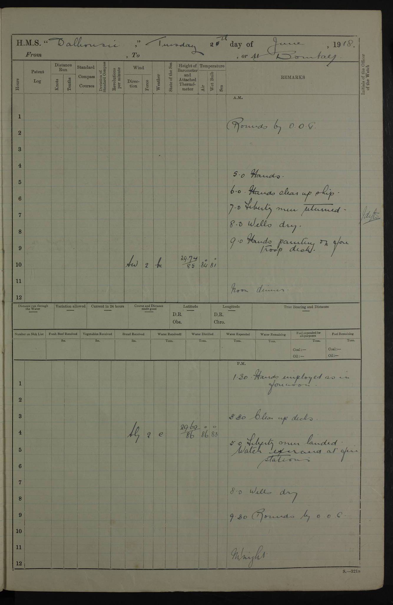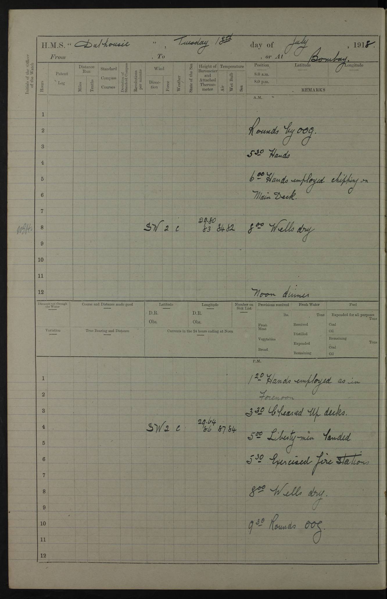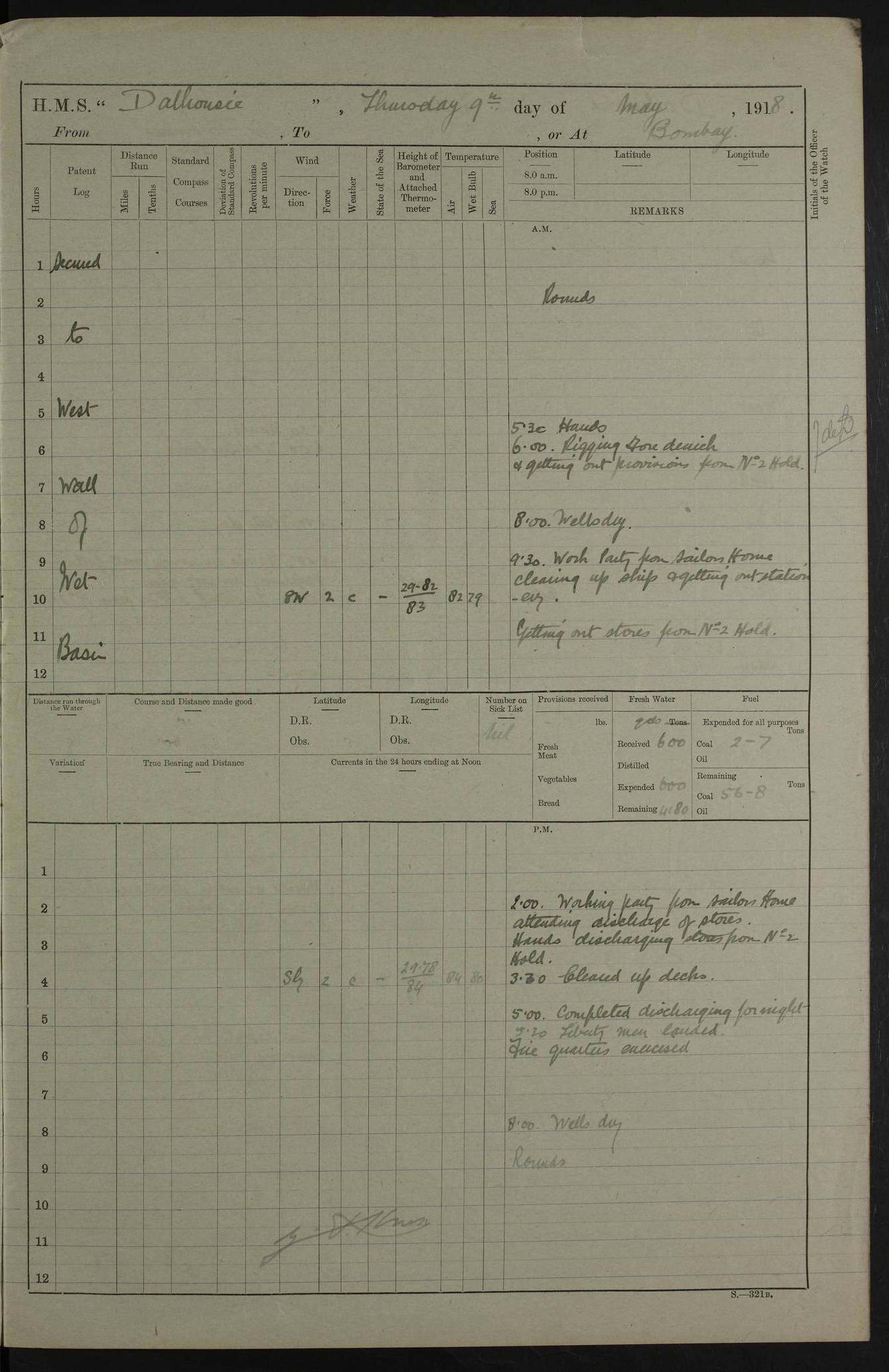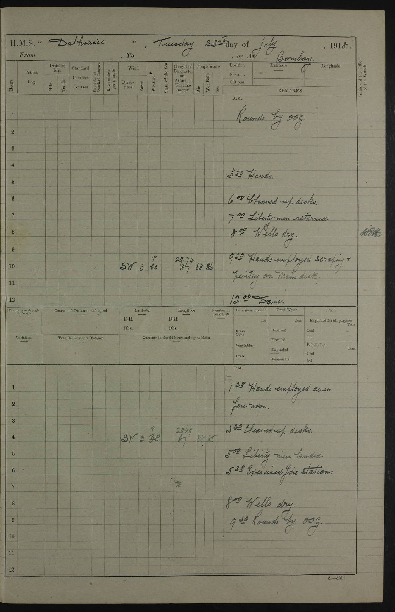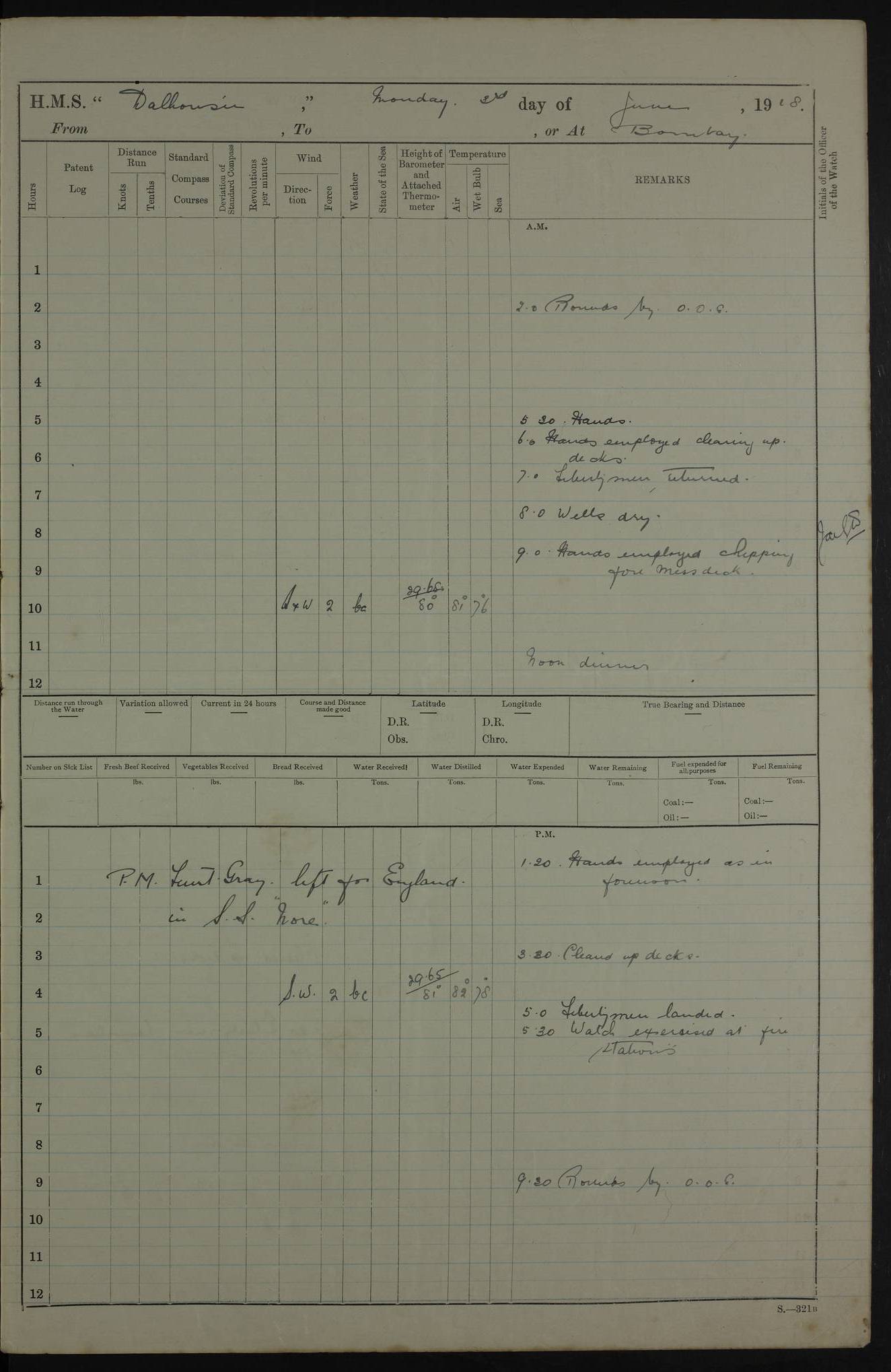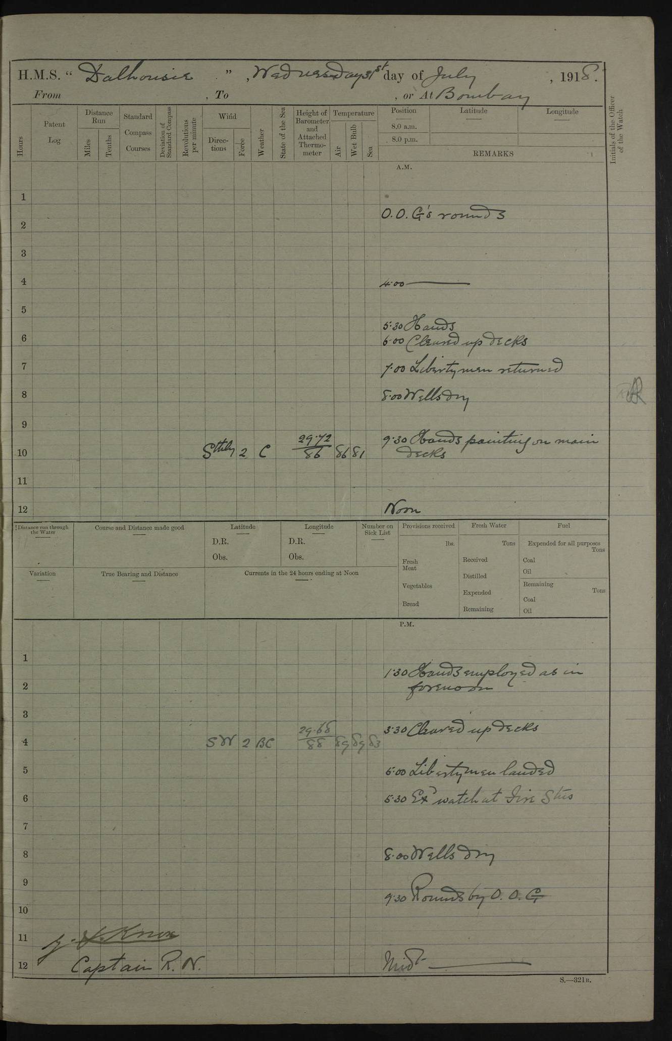 AM – Discharged To EKMA: PJ O’Connor, Lieutenant Royal Navy To Passage: 2 Indian Ratings To FLYCATCHER: D Butcher, Leading Seaman 4ef4fb19e53e0a0c910059d0: (https://s3.amazonaws.com:443/oldweather/ADM53-39410/0015_0.jpg) 26 February 1918 Place: Basrah Lat 30.5269, Long 47.8407 2:00am: Rounds 5:30am: Hands 6:00am: Morning Routine 7:45am: Working party to Depot 8:00am: Wells dry - Signal Books correct 9:10am: Divisions 10:00am: Hands employed painting in cabins & as requisite 12:00pm: Signal Books correct – Working party returned 1:20pm: Working party to Depot 3:45pm: Cleared up decks 4:00pm: Evening Quarters – Signal Books correct 4:30pm: Working party returned 5:10pm: Leave to Watch 6:00pm: Sunset - Fire Gear connected 7:30pm: Liberty men returned 8:00pm: Wells dry - Signal Books correct 9:00pm: Rounds – Signal Books correct PM – Joined From TARANTULA: J Baldwin, Leading Signalman From Hospital: Louis Mones, Engineering driver PM - Discharged To MANTIS: G Munay, Leading Signalman – C Killburn, Signalman To TARANTULA: CM Leary, Telegrapher 4ef4fb19e53e0a0c910059d1: (https://s3.amazonaws.com:443/oldweather/ADM53-39410/0015_1.jpg) 27 February 1918 Place: Basrah Lat 30.5269, Long 47.8407 2:00am: Rounds 5:30am: Hands 6:00am: Morning Routine 7:45am: Working party to Depot 8:00am: Wells dry - Signal Books correct 9:10am: Divisions 10:00am: Hands employed packing surveyed stores, cleaning out boats & painting in Warrant Ratings 12:00pm: Signal Books correct – Working party returned 1:20pm: Working party to Depot 3:45pm: Cleared up decks 4:00pm: Evening Quarters – Signal Books correct 4:30pm: Working party returned 5:10pm: Leave to Watch 6:00pm: Sunset - Fire Gear connected 7:30pm: Liberty men returned 8:00pm: Wells dry - Signal Books correct 9:00pm: Rounds – Signal Books correct AM – Joined From ELEPHANTA: No. 22 Sheik Kadir Sheik Mahomed, Lascar 2nd – No. 41 Abdool Rahman Sheik Dawood, Lamp Trimmer – No. 56 Mahomed Sabia Sheik Bosman, Stoker 2nd – No. 50A Sheik Mahomed Sheik Hassan, Stoker 2nd – No. 90 Abelino Fernandez, Topass – No. 86 Avelino Leitas, Topass 4ef4fb1ae53e0a0c910059d2: (https://s3.amazonaws.com:443/oldweather/ADM53-39410/0016_0.jpg) 28 February 1918 Place: Basrah Lat 30.5269, Long 47.8407 2:00am: Rounds 5:30am: Hands 6:00am: Morning Routine 7:45am: Working party to Depot 8:00am: Wells dry - Signal Books correct 9:10am: Divisions 10:00am: Hands employed discharging stores 12:00pm: Signal Books correct – Working party returned 1:00pm: Issued Quinine to Naval Ratings - Issued Quinine to Native Ratings 1:20pm: Working party to Depot 3:45pm: Cleared up decks 4:00pm: Evening Quarters – Signal Books correct 4:30pm: Working party returned 5:10pm: Leave to Watch 6:00pm: Sunset - Fire Gear connected 7:30pm: Liberty men returned 8:00pm: Wells dry - Signal Books correct 9:00pm: Rounds – Signal Books correct PM – Joined From SAPPHIRE: WC Woolley, Petty Officer PM - Discharged To TARANTULA: L Harris, Signalman To SEDGEFLY: T Hughes, Able Seaman To MANTIS: S Redshaw, Able Seaman To Depot: R Matheison, Stoker – H Philo, Stoker TO GRAYFLY: H Stockbridge, Senior Petty Officer 4ef4fb1ae53e0a0c910059d3: (https://s3.amazonaws.com:443/oldweather/ADM53-39410/0016_1.jpg) Log Page – Blank – no data on Page 4ef4fb1ae53e0a0c910059d4: (https://s3.amazonaws.com:443/oldweather/ADM53-39410/0017_0.jpg) Log Page – Blank – no data on Page 4ef4fb1ae53e0a0c910059d5: (https://s3.amazonaws.com:443/oldweather/ADM53-39410/0017_1.jpg) Log Page – Blank 4ef4fb1ae53e0a0c910059d6: (https://s3.amazonaws.com:443/oldweather/ADM53-39410/0018_0.jpg) Log Page – Blank 4ef4fb1ae53e0a0c910059d7: (https://s3.amazonaws.com:443/oldweather/ADM53-39410/0018_1.jpg) Log Page – Blank LOGS FOR MARCH 1918 4ef4fb1be53e0a0c910059d8: (https://s3.amazonaws.com:443/oldweather/ADM53-39411/0000_0.jpg) Log Page – Cover March 1918 4ef4fb1be53e0a0c910059d9: (https://s3.amazonaws.com:443/oldweather/ADM53-39411/0000_1.jpg) Log Page – Cover – March 1918 4ef4fb1be53e0a0c910059da: (https://s3.amazonaws.com:443/oldweather/ADM53-39411/0001_0.jpg) Log Page – Blank 4ef4fb1be53e0a0c910059db: (https://s3.amazonaws.com:443/oldweather/ADM53-39411/0001_1.jpg) Log Page – Blank – no data on Page 4ef4fb1ce53e0a0c910059dc: (https://s3.amazonaws.com:443/oldweather/ADM53-39411/0002_0.jpg) Log Page – Blank – no data on Page 4ef4fb1ce53e0a0c910059dd: (https://s3.amazonaws.com:443/oldweather/ADM53-39411/0002_1.jpg) 1 March 1918 Place: Basrah Lat 30.5269, Long 47.8407 1:00am: drew from Field Chest Treasury Officer Basrah Five thousand (5,000) Rupees only 2:00am: Rounds 5:30am: Hands 6:00am: Morning Routine 7:45am: Working party to Depot 8:00am: Wells dry – Signal Books correct – CHAKLA arrived with 5 Officers & 60 Ratings 12:00pm: Signal Books correct – Working party returned 1:15pm: Working party to Depot 2:00pm: Paid Lascar Ratings 3:45pm: Cleared up decks 4:00pm: Evening Quarters 4:30pm: Working party returned 5:10pm: Leave to Watch 5:30pm: 5 Petty Officers & 57 Ratings to Bandra for Passage 6:00pm: Sunset - Fire Gear connected 7:30pm: Liberty men returned 9:00pm: Rounds – Petty Officers returned AM – Joined From CHALKA: Hawkins, Paymaster Royal Navy PM - Discharged To FLYCATCHER: Dennis, Sub Lieutenant Royal Navy Volunteer Reserve To TARANTULA: L Harris, Signalman To SEDGEFLY: TG Hughes, Able Seaman To MANTIS: S Redshaw, Able Seaman To Depot: R Mathieson, Stoker To GRAYFLY: H Stockbridge, Senior Petty Officer 4ef4fb1ce53e0a0c910059de: (https://s3.amazonaws.com:443/oldweather/ADM53-39411/0003_0.jpg) 2 March 1918 Place: Basrah Lat 30.5269, Long 47.8407 2:00am: Rounds 5:30am: Hands 6:00am: Morning Routine 7:00am: Exercised Fire Stations 7:45am: Working party to Depot 8:00am: Wells dry - Signal Books correct 9:10am: Divisions 10:00am: Hands employed as requisite 12:00pm: Working party returned 1:15pm: Working party to Depot 3:45pm: Cleared up decks 4:00pm: Evening Quarters – Signal Books corr