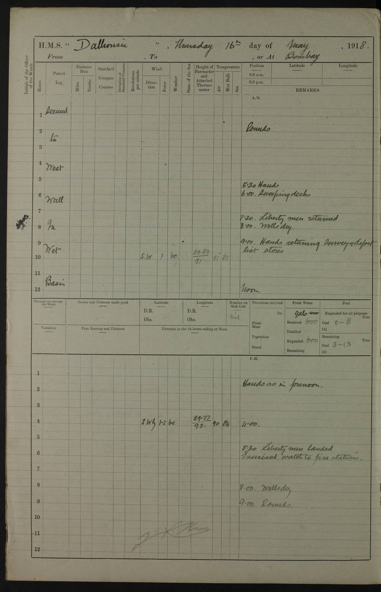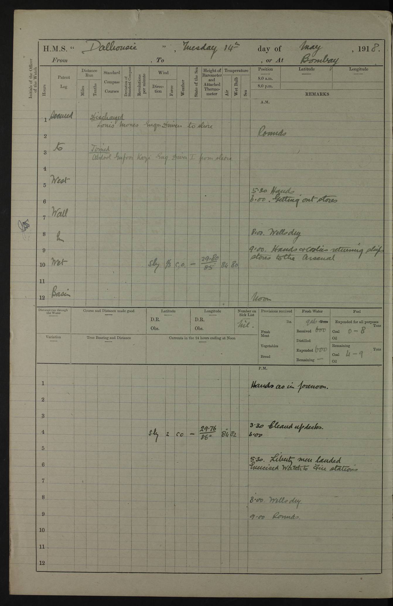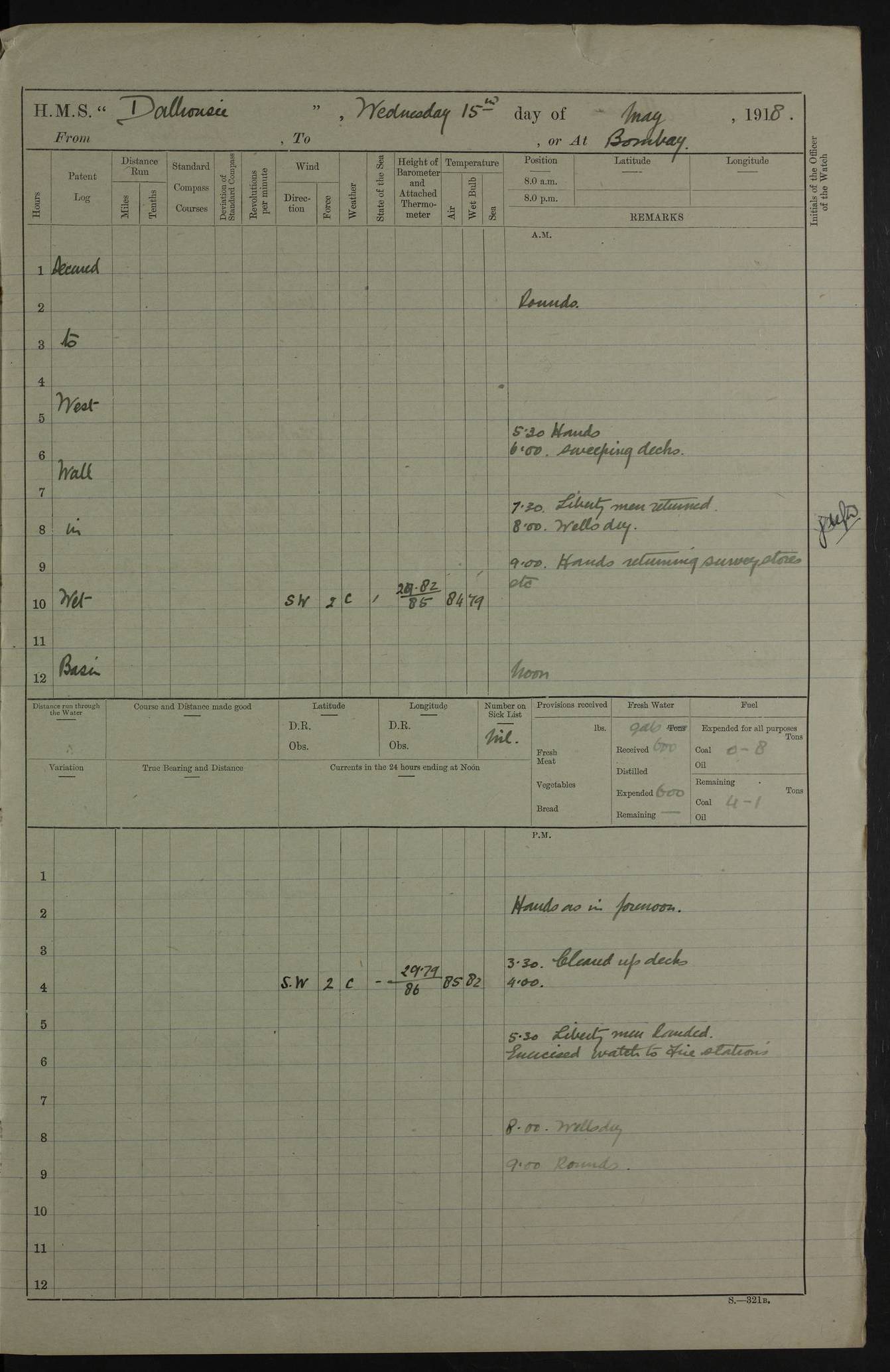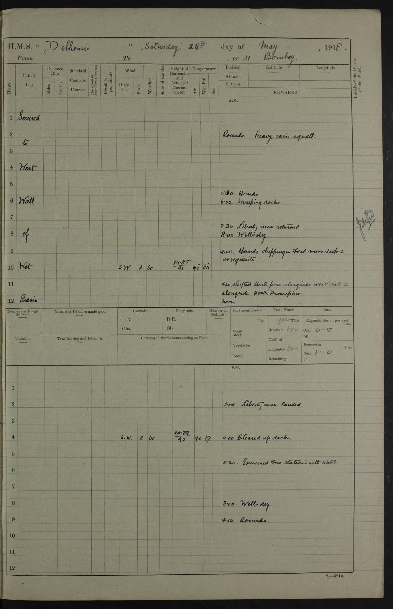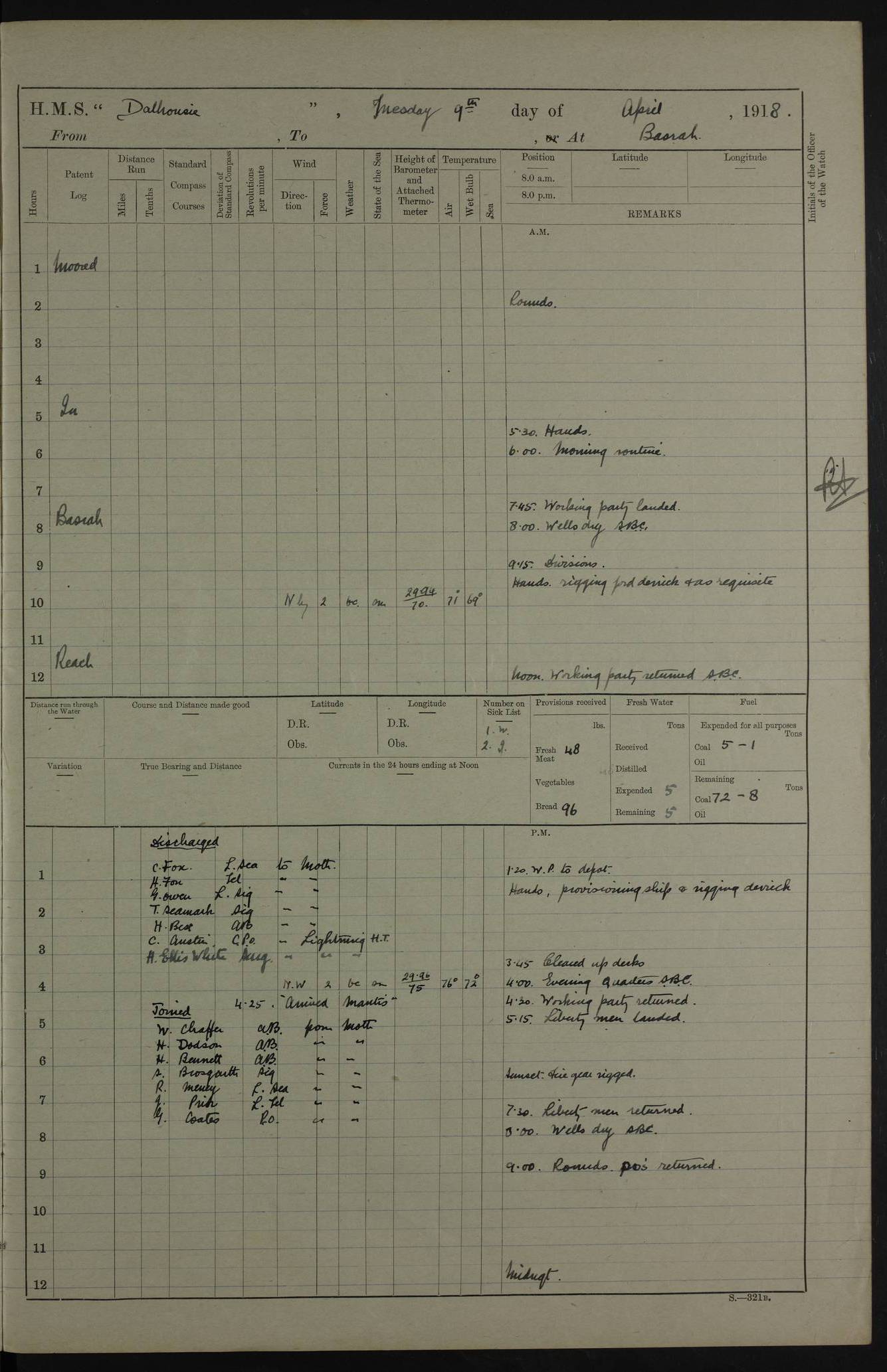 AM – Discharged To EKMA: PJ O’Connor, Lieutenant Royal Navy To Passage: 2 Indian Ratings To FLYCATCHER: D Butcher, Leading Seaman 4ef4fb19e53e0a0c910059d0: (https://s3.amazonaws.com:443/oldweather/ADM53-39410/0015_0.jpg) 26 February 1918 Place: Basrah Lat 30.5269, Long 47.8407 2:00am: Rounds 5:30am: Hands 6:00am: Morning Routine 7:45am: Working party to Depot 8:00am: Wells dry - Signal Books correct 9:10am: Divisions 10:00am: Hands employed painting in cabins & as requisite 12:00pm: Signal Books correct – Working party returned 1:20pm: Working party to Depot 3:45pm: Cleared up decks 4:00pm: Evening Quarters – Signal Books correct 4:30pm: Working party returned 5:10pm: Leave to Watch 6:00pm: Sunset - Fire Gear connected 7:30pm: Liberty men returned 8:00pm: Wells dry - Signal Books correct 9:00pm: Rounds – Signal Books correct PM – Joined From TARANTULA: J Baldwin, Leading Signalman From Hospital: Louis Mones, Engineering driver PM - Discharged To MANTIS: G Munay, Leading Signalman – C Killburn, Signalman To TARANTULA: CM Leary, Telegrapher 4ef4fb19e53e0a0c910059d1: (https://s3.amazonaws.com:443/oldweather/ADM53-39410/0015_1.jpg) 27 February 1918 Place: Basrah Lat 30.5269, Long 47.8407 2:00am: Rounds 5:30am: Hands 6:00am: Morning Routine 7:45am: Working party to Depot 8:00am: Wells dry - Signal Books correct 9:10am: Divisions 10:00am: Hands employed packing surveyed stores, cleaning out boats & painting in Warrant Ratings 12:00pm: Signal Books correct – Working party returned 1:20pm: Working party to Depot 3:45pm: Cleared up decks 4:00pm: Evening Quarters – Signal Books correct 4:30pm: Working party returned 5:10pm: Leave to Watch 6:00pm: Sunset - Fire Gear connected 7:30pm: Liberty men returned 8:00pm: Wells dry - Signal Books correct 9:00pm: Rounds – Signal Books correct AM – Joined From ELEPHANTA: No. 22 Sheik Kadir Sheik Mahomed, Lascar 2nd – No. 41 Abdool Rahman Sheik Dawood, Lamp Trimmer – No. 56 Mahomed Sabia Sheik Bosman, Stoker 2nd – No. 50A Sheik Mahomed Sheik Hassan, Stoker 2nd – No. 90 Abelino Fernandez, Topass – No. 86 Avelino Leitas, Topass 4ef4fb1ae53e0a0c910059d2: (https://s3.amazonaws.com:443/oldweather/ADM53-39410/0016_0.jpg) 28 February 1918 Place: Basrah Lat 30.5269, Long 47.8407 2:00am: Rounds 5:30am: Hands 6:00am: Morning Routine 7:45am: Working party to Depot 8:00am: Wells dry - Signal Books correct 9:10am: Divisions 10:00am: Hands employed discharging stores 12:00pm: Signal Books correct – Working party returned 1:00pm: Issued Quinine to Naval Ratings - Issued Quinine to Native Ratings 1:20pm: Working party to Depot 3:45pm: Cleared up decks 4:00pm: Evening Quarters – Signal Books correct 4:30pm: Working party returned 5:10pm: Leave to Watch 6:00pm: Sunset - Fire Gear connected 7:30pm: Liberty men returned 8:00pm: Wells dry - Signal Books correct 9:00pm: Rounds – Signal Books correct PM – Joined From SAPPHIRE: WC Woolley, Petty Officer PM - Discharged To TARANTULA: L Harris, Signalman To SEDGEFLY: T Hughes, Able Seaman To MANTIS: S Redshaw, Able Seaman To Depot: R Matheison, Stoker – H Philo, Stoker TO GRAYFLY: H Stockbridge, Senior Petty Officer 4ef4fb1ae53e0a0c910059d3: (https://s3.amazonaws.com:443/oldweather/ADM53-39410/0016_1.jpg) Log Page – Blank – no data on Page 4ef4fb1ae53e0a0c910059d4: (https://s3.amazonaws.com:443/oldweather/ADM53-39410/0017_0.jpg) Log Page – Blank – no data on Page 4ef4fb1ae53e0a0c910059d5: (https://s3.amazonaws.com:443/oldweather/ADM53-39410/0017_1.jpg) Log Page – Blank 4ef4fb1ae53e0a0c910059d6: (https://s3.amazonaws.com:443/oldweather/ADM53-39410/0018_0.jpg) Log Page – Blank 4ef4fb1ae53e0a0c910059d7: (https://s3.amazonaws.com:443/oldweather/ADM53-39410/0018_1.jpg) Log Page – Blank LOGS FOR MARCH 1918 4ef4fb1be53e0a0c910059d8: (https://s3.amazonaws.com:443/oldweather/ADM53-39411/0000_0.jpg) Log Page – Cover March 1918 4ef4fb1be53e0a0c910059d9: (https://s3.amazonaws.com:443/oldweather/ADM53-39411/0000_1.jpg) Log Page – Cover – March 1918 4ef4fb1be53e0a0c910059da: (https://s3.amazonaws.com:443/oldweather/ADM53-39411/0001_0.jpg) Log Page – Blank 4ef4fb1be53e0a0c910059db: (https://s3.amazonaws.com:443/oldweather/ADM53-39411/0001_1.jpg) Log Page – Blank – no data on Page 4ef4fb1ce53e0a0c910059dc: (https://s3.amazonaws.com:443/oldweather/ADM53-39411/0002_0.jpg) Log Page – Blank – no data on Page 4ef4fb1ce53e0a0c910059dd: (https://s3.amazonaws.com:443/oldweather/ADM53-39411/0002_1.jpg) 1 March 1918 Place: Basrah Lat 30.5269, Long 47.8407 1:00am: drew from Field Chest Treasury Officer Basrah Five thousand (5,000) Rupees only 2:00am: Rounds 5:30am: Hands 6:00am: Morning Routine 7:45am: Working party to Depot 8:00am: Wells dry – Signal Books correct – CHAKLA arrived with 5 Officers & 60 Ratings 12:00pm: Signal Books correct – Working party returned 1:15pm: Working party to Depot 2:00pm: Paid Lascar Ratings 3:45pm: Cleared up decks 4:00pm: Evening Quarters 4:30pm: Working party returned 5:10pm: Leave to Watch 5:30pm: 5 Petty Officers & 57 Ratings to Bandra for Passage 6:00pm: Sunset - Fire Gear connected 7:30pm: Liberty men returned 9:00pm: Rounds – Petty Officers returned AM – Joined From CHALKA: Hawkins, Paymaster Royal Navy PM - Discharged To FLYCATCHER: Dennis, Sub Lieutenant Royal Navy Volunteer Reserve To TARANTULA: L Harris, Signalman To SEDGEFLY: TG Hughes, Able Seaman To MANTIS: S Redshaw, Able Seaman To Depot: R Mathieson, Stoker To GRAYFLY: H Stockbridge, Senior Petty Officer 4ef4fb1ce53e0a0c910059de: (https://s3.amazonaws.com:443/oldweather/ADM53-39411/0003_0.jpg) 2 March 1918 Place: Basrah Lat 30.5269, Long 47.8407 2:00am: Rounds 5:30am: Hands 6:00am: Morning Routine 7:00am: Exercised Fire Stations 7:45am: Working party to Depot 8:00am: Wells dry - Signal Books correct 9:10am: Divisions 10:00am: Hands employed as requisite 12:00pm: Working party returned 1:15pm: Working party to Depot 3:45pm: Cleared up decks 4:00pm: Evening Quarters – Signal Books corr