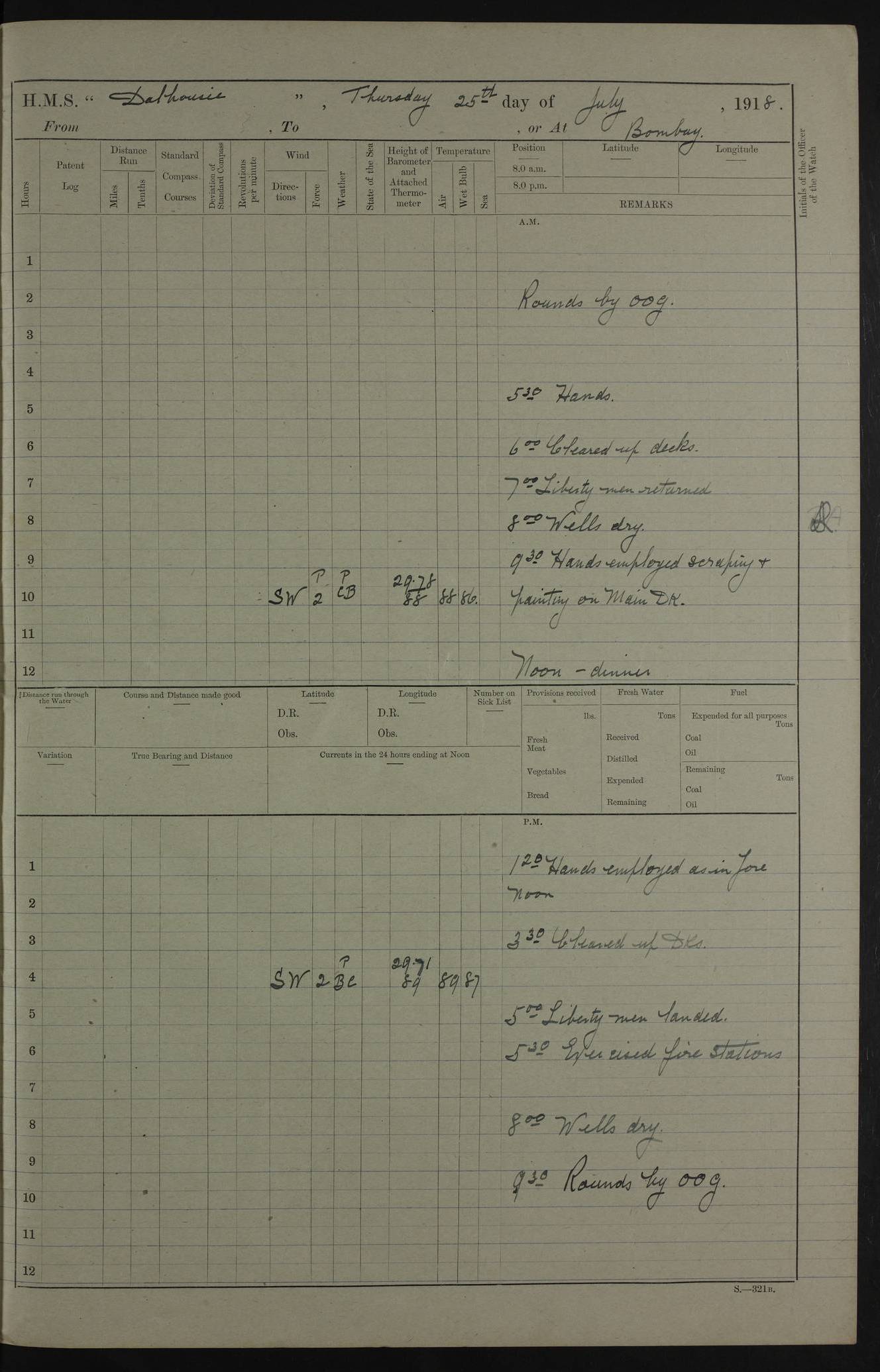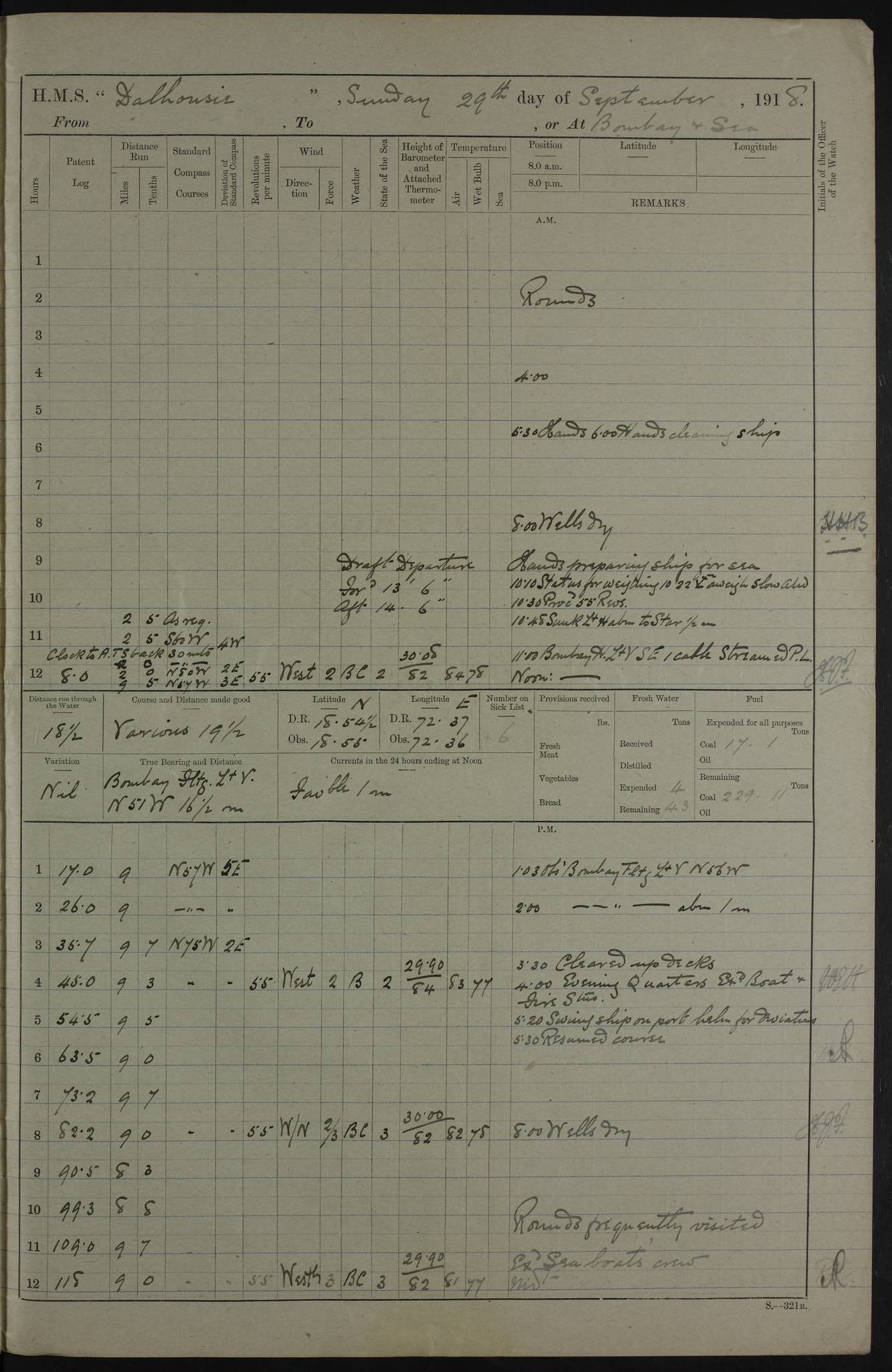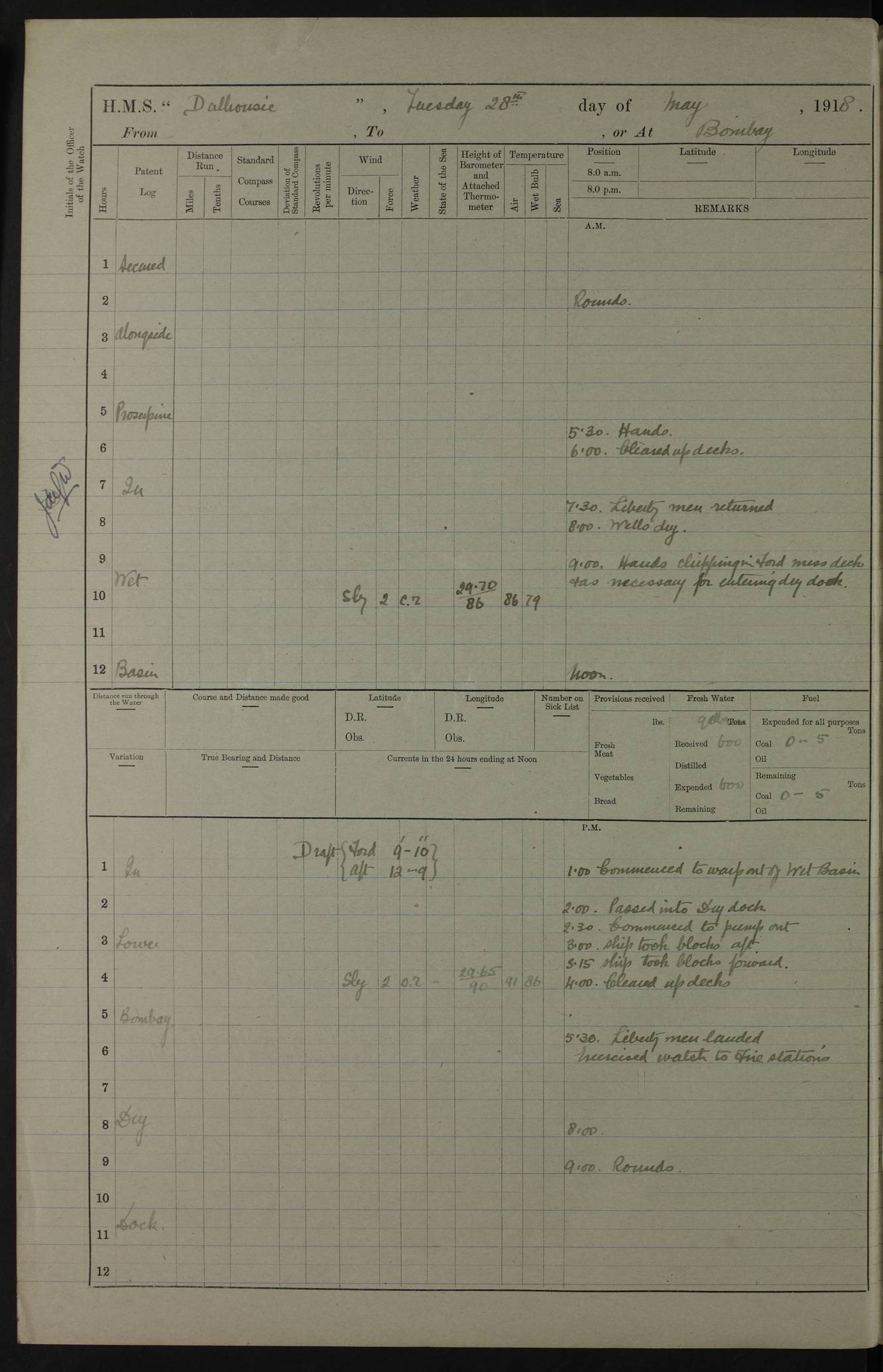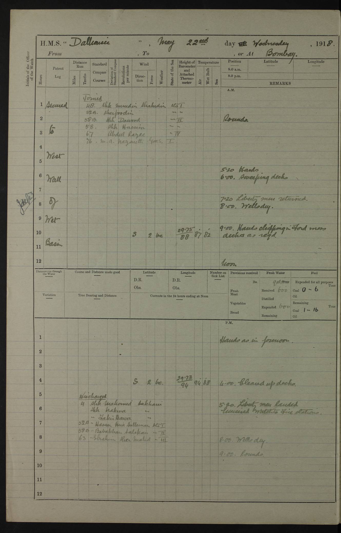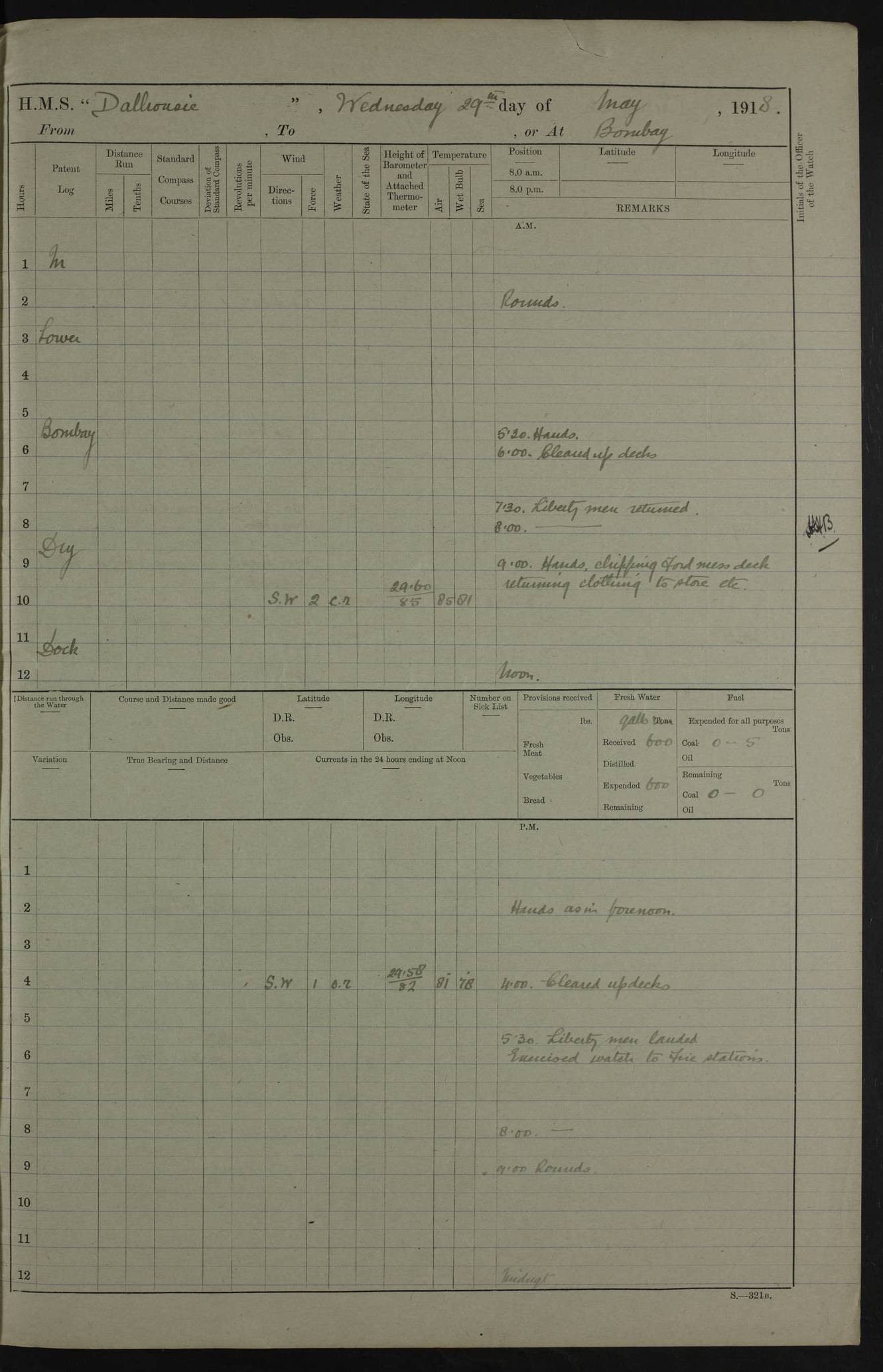 AM – Discharged To EKMA: PJ O’Connor, Lieutenant Royal Navy To Passage: 2 Indian Ratings To FLYCATCHER: D Butcher, Leading Seaman 4ef4fb19e53e0a0c910059d0: (https://s3.amazonaws.com:443/oldweather/ADM53-39410/0015_0.jpg) 26 February 1918 Place: Basrah Lat 30.5269, Long 47.8407 2:00am: Rounds 5:30am: Hands 6:00am: Morning Routine 7:45am: Working party to Depot 8:00am: Wells dry - Signal Books correct 9:10am: Divisions 10:00am: Hands employed painting in cabins & as requisite 12:00pm: Signal Books correct – Working party returned 1:20pm: Working party to Depot 3:45pm: Cleared up decks 4:00pm: Evening Quarters – Signal Books correct 4:30pm: Working party returned 5:10pm: Leave to Watch 6:00pm: Sunset - Fire Gear connected 7:30pm: Liberty men returned 8:00pm: Wells dry - Signal Books correct 9:00pm: Rounds – Signal Books correct PM – Joined From TARANTULA: J Baldwin, Leading Signalman From Hospital: Louis Mones, Engineering driver PM - Discharged To MANTIS: G Munay, Leading Signalman – C Killburn, Signalman To TARANTULA: CM Leary, Telegrapher 4ef4fb19e53e0a0c910059d1: (https://s3.amazonaws.com:443/oldweather/ADM53-39410/0015_1.jpg) 27 February 1918 Place: Basrah Lat 30.5269, Long 47.8407 2:00am: Rounds 5:30am: Hands 6:00am: Morning Routine 7:45am: Working party to Depot 8:00am: Wells dry - Signal Books correct 9:10am: Divisions 10:00am: Hands employed packing surveyed stores, cleaning out boats & painting in Warrant Ratings 12:00pm: Signal Books correct – Working party returned 1:20pm: Working party to Depot 3:45pm: Cleared up decks 4:00pm: Evening Quarters – Signal Books correct 4:30pm: Working party returned 5:10pm: Leave to Watch 6:00pm: Sunset - Fire Gear connected 7:30pm: Liberty men returned 8:00pm: Wells dry - Signal Books correct 9:00pm: Rounds – Signal Books correct AM – Joined From ELEPHANTA: No. 22 Sheik Kadir Sheik Mahomed, Lascar 2nd – No. 41 Abdool Rahman Sheik Dawood, Lamp Trimmer – No. 56 Mahomed Sabia Sheik Bosman, Stoker 2nd – No. 50A Sheik Mahomed Sheik Hassan, Stoker 2nd – No. 90 Abelino Fernandez, Topass – No. 86 Avelino Leitas, Topass 4ef4fb1ae53e0a0c910059d2: (https://s3.amazonaws.com:443/oldweather/ADM53-39410/0016_0.jpg) 28 February 1918 Place: Basrah Lat 30.5269, Long 47.8407 2:00am: Rounds 5:30am: Hands 6:00am: Morning Routine 7:45am: Working party to Depot 8:00am: Wells dry - Signal Books correct 9:10am: Divisions 10:00am: Hands employed discharging stores 12:00pm: Signal Books correct – Working party returned 1:00pm: Issued Quinine to Naval Ratings - Issued Quinine to Native Ratings 1:20pm: Working party to Depot 3:45pm: Cleared up decks 4:00pm: Evening Quarters – Signal Books correct 4:30pm: Working party returned 5:10pm: Leave to Watch 6:00pm: Sunset - Fire Gear connected 7:30pm: Liberty men returned 8:00pm: Wells dry - Signal Books correct 9:00pm: Rounds – Signal Books correct PM – Joined From SAPPHIRE: WC Woolley, Petty Officer PM - Discharged To TARANTULA: L Harris, Signalman To SEDGEFLY: T Hughes, Able Seaman To MANTIS: S Redshaw, Able Seaman To Depot: R Matheison, Stoker – H Philo, Stoker TO GRAYFLY: H Stockbridge, Senior Petty Officer 4ef4fb1ae53e0a0c910059d3: (https://s3.amazonaws.com:443/oldweather/ADM53-39410/0016_1.jpg) Log Page – Blank – no data on Page 4ef4fb1ae53e0a0c910059d4: (https://s3.amazonaws.com:443/oldweather/ADM53-39410/0017_0.jpg) Log Page – Blank – no data on Page 4ef4fb1ae53e0a0c910059d5: (https://s3.amazonaws.com:443/oldweather/ADM53-39410/0017_1.jpg) Log Page – Blank 4ef4fb1ae53e0a0c910059d6: (https://s3.amazonaws.com:443/oldweather/ADM53-39410/0018_0.jpg) Log Page – Blank 4ef4fb1ae53e0a0c910059d7: (https://s3.amazonaws.com:443/oldweather/ADM53-39410/0018_1.jpg) Log Page – Blank LOGS FOR MARCH 1918 4ef4fb1be53e0a0c910059d8: (https://s3.amazonaws.com:443/oldweather/ADM53-39411/0000_0.jpg) Log Page – Cover March 1918 4ef4fb1be53e0a0c910059d9: (https://s3.amazonaws.com:443/oldweather/ADM53-39411/0000_1.jpg) Log Page – Cover – March 1918 4ef4fb1be53e0a0c910059da: (https://s3.amazonaws.com:443/oldweather/ADM53-39411/0001_0.jpg) Log Page – Blank 4ef4fb1be53e0a0c910059db: (https://s3.amazonaws.com:443/oldweather/ADM53-39411/0001_1.jpg) Log Page – Blank – no data on Page 4ef4fb1ce53e0a0c910059dc: (https://s3.amazonaws.com:443/oldweather/ADM53-39411/0002_0.jpg) Log Page – Blank – no data on Page 4ef4fb1ce53e0a0c910059dd: (https://s3.amazonaws.com:443/oldweather/ADM53-39411/0002_1.jpg) 1 March 1918 Place: Basrah Lat 30.5269, Long 47.8407 1:00am: drew from Field Chest Treasury Officer Basrah Five thousand (5,000) Rupees only 2:00am: Rounds 5:30am: Hands 6:00am: Morning Routine 7:45am: Working party to Depot 8:00am: Wells dry – Signal Books correct – CHAKLA arrived with 5 Officers & 60 Ratings 12:00pm: Signal Books correct – Working party returned 1:15pm: Working party to Depot 2:00pm: Paid Lascar Ratings 3:45pm: Cleared up decks 4:00pm: Evening Quarters 4:30pm: Working party returned 5:10pm: Leave to Watch 5:30pm: 5 Petty Officers & 57 Ratings to Bandra for Passage 6:00pm: Sunset - Fire Gear connected 7:30pm: Liberty men returned 9:00pm: Rounds – Petty Officers returned AM – Joined From CHALKA: Hawkins, Paymaster Royal Navy PM - Discharged To FLYCATCHER: Dennis, Sub Lieutenant Royal Navy Volunteer Reserve To TARANTULA: L Harris, Signalman To SEDGEFLY: TG Hughes, Able Seaman To MANTIS: S Redshaw, Able Seaman To Depot: R Mathieson, Stoker To GRAYFLY: H Stockbridge, Senior Petty Officer 4ef4fb1ce53e0a0c910059de: (https://s3.amazonaws.com:443/oldweather/ADM53-39411/0003_0.jpg) 2 March 1918 Place: Basrah Lat 30.5269, Long 47.8407 2:00am: Rounds 5:30am: Hands 6:00am: Morning Routine 7:00am: Exercised Fire Stations 7:45am: Working party to Depot 8:00am: Wells dry - Signal Books correct 9:10am: Divisions 10:00am: Hands employed as requisite 12:00pm: Working party returned 1:15pm: Working party to Depot 3:45pm: Cleared up decks 4:00pm: Evening Quarters – Signal Books corr