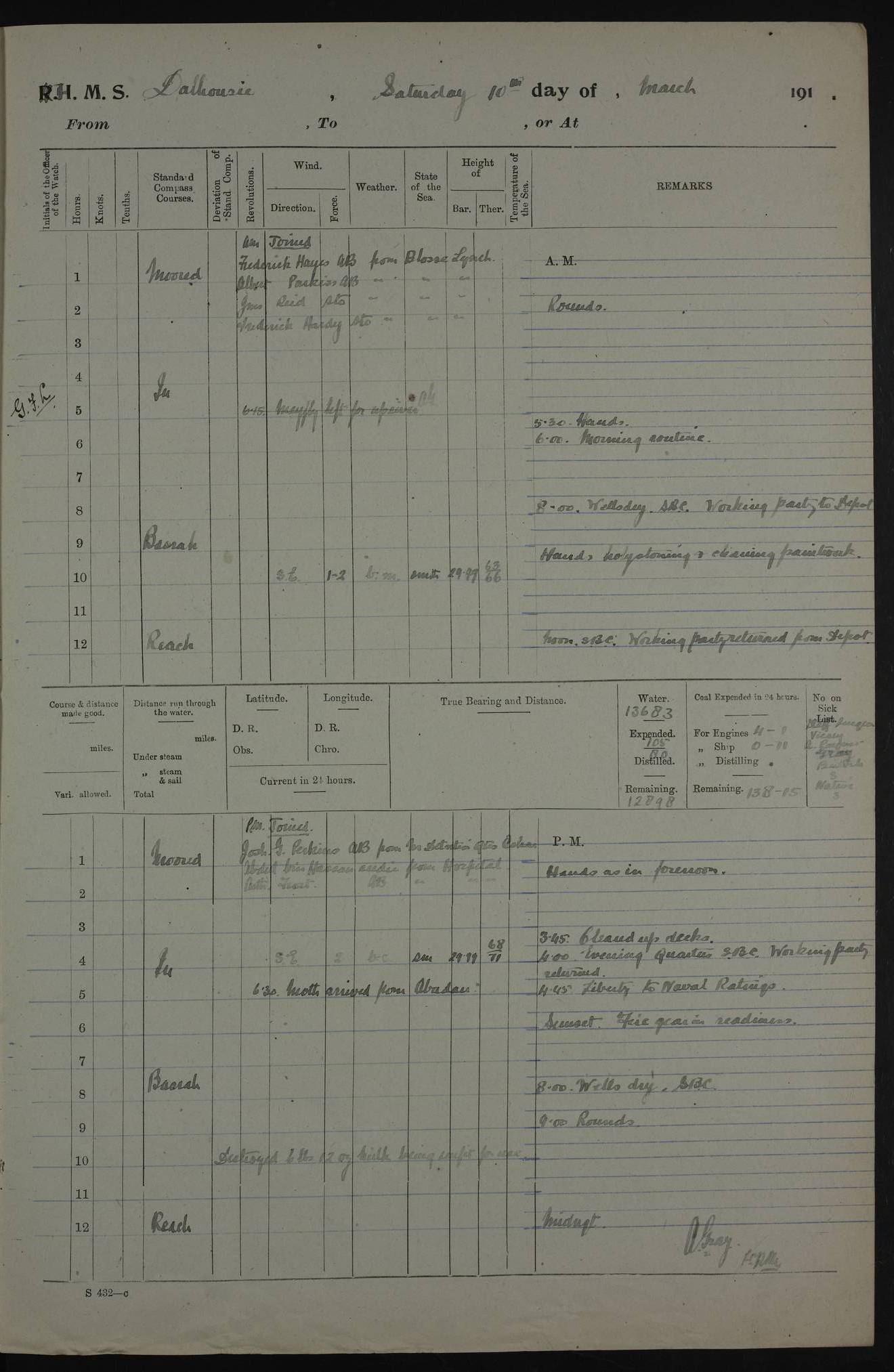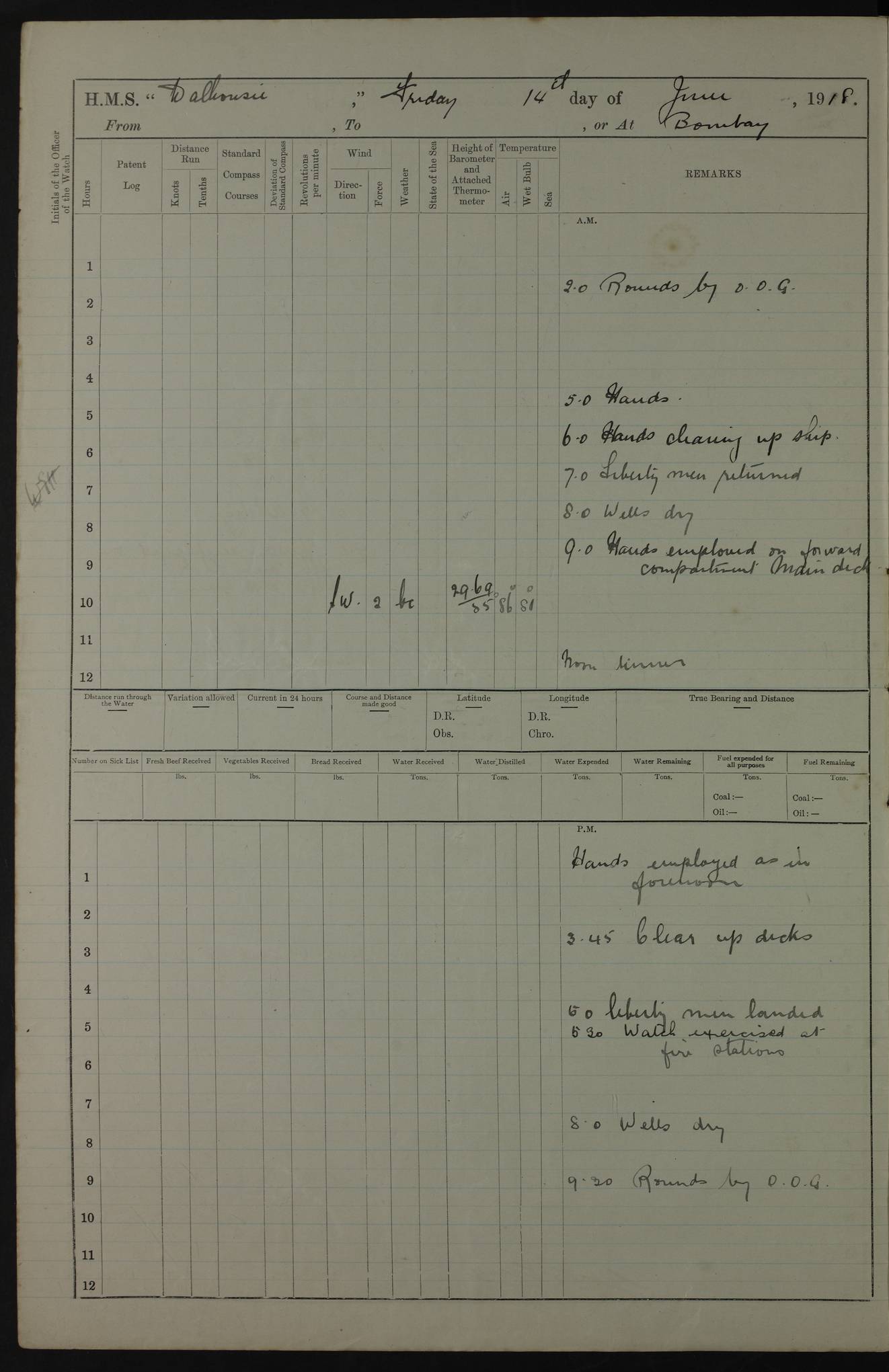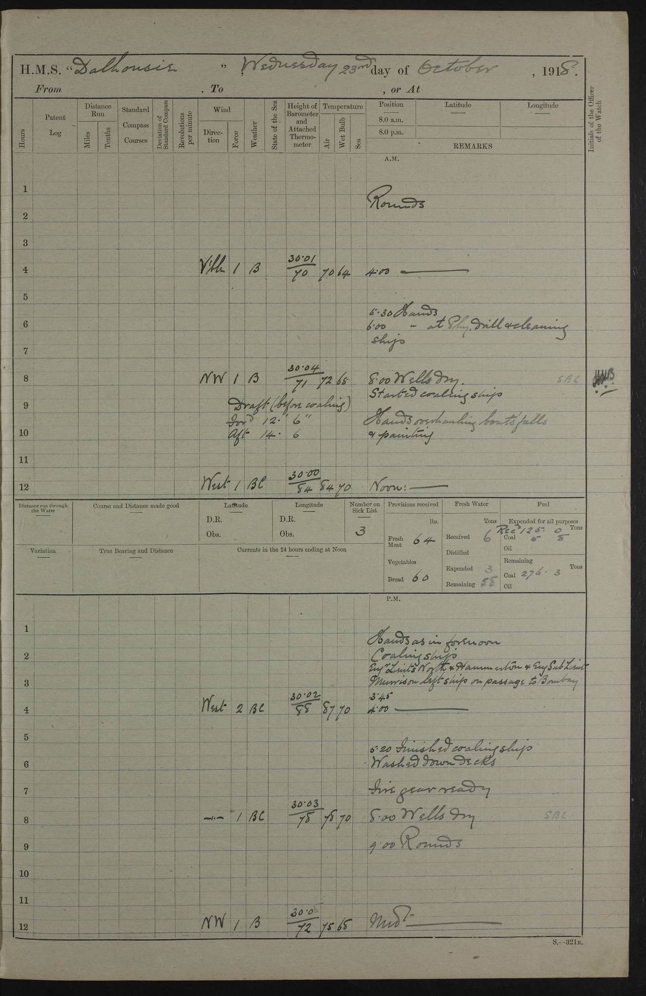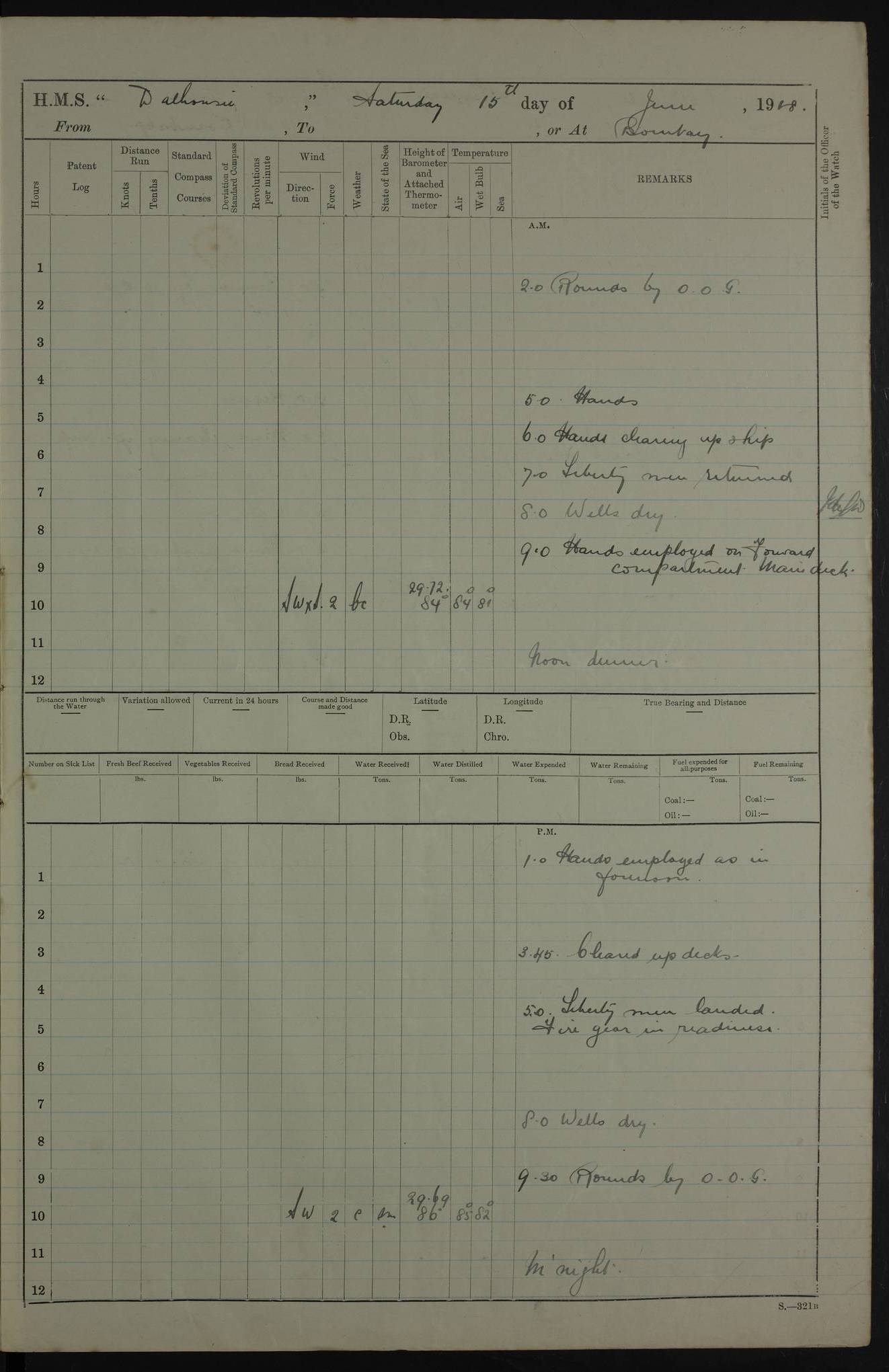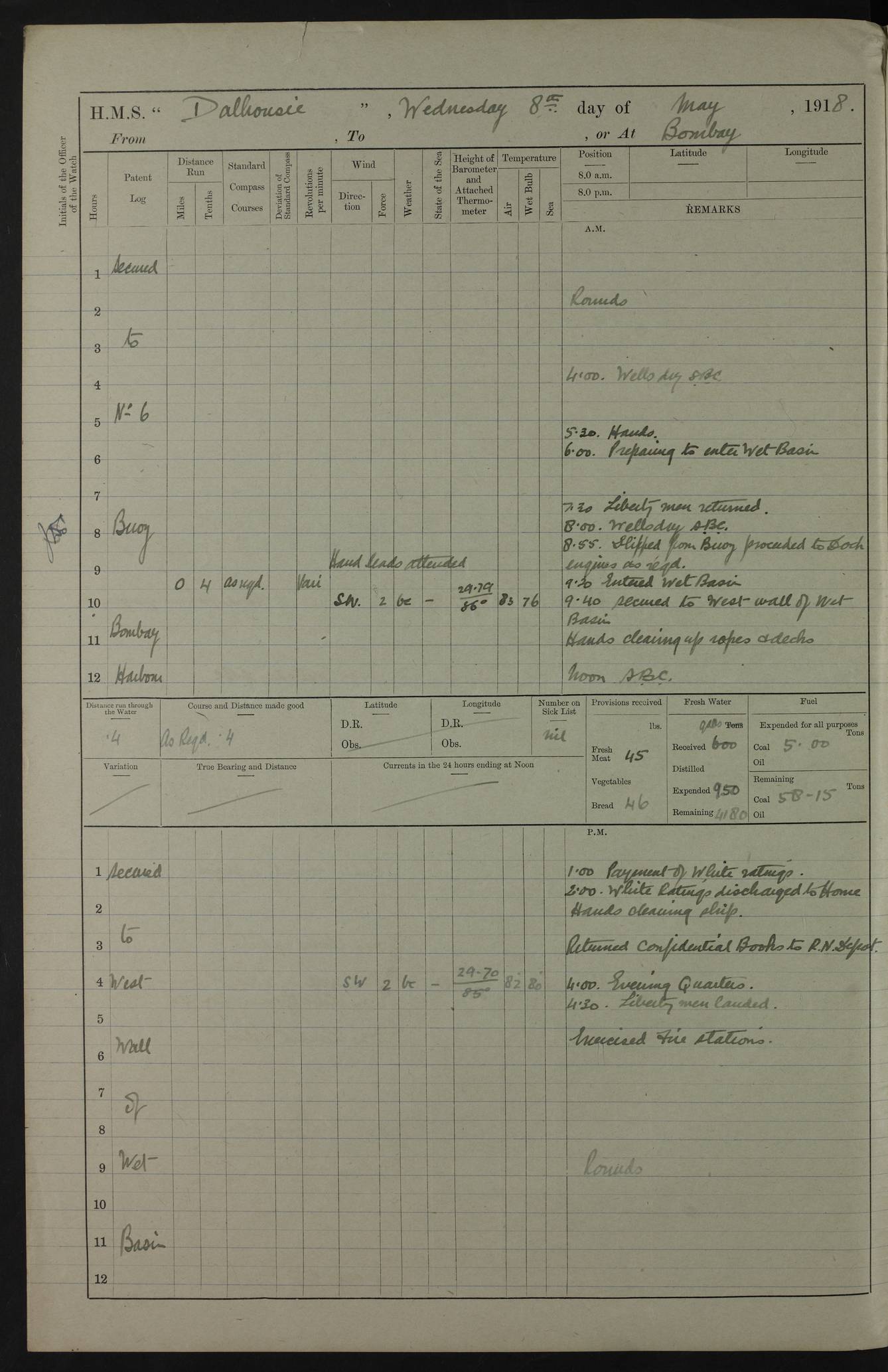 AM – Discharged To EKMA: PJ O’Connor, Lieutenant Royal Navy To Passage: 2 Indian Ratings To FLYCATCHER: D Butcher, Leading Seaman 4ef4fb19e53e0a0c910059d0: (https://s3.amazonaws.com:443/oldweather/ADM53-39410/0015_0.jpg) 26 February 1918 Place: Basrah Lat 30.5269, Long 47.8407 2:00am: Rounds 5:30am: Hands 6:00am: Morning Routine 7:45am: Working party to Depot 8:00am: Wells dry - Signal Books correct 9:10am: Divisions 10:00am: Hands employed painting in cabins & as requisite 12:00pm: Signal Books correct – Working party returned 1:20pm: Working party to Depot 3:45pm: Cleared up decks 4:00pm: Evening Quarters – Signal Books correct 4:30pm: Working party returned 5:10pm: Leave to Watch 6:00pm: Sunset - Fire Gear connected 7:30pm: Liberty men returned 8:00pm: Wells dry - Signal Books correct 9:00pm: Rounds – Signal Books correct PM – Joined From TARANTULA: J Baldwin, Leading Signalman From Hospital: Louis Mones, Engineering driver PM - Discharged To MANTIS: G Munay, Leading Signalman – C Killburn, Signalman To TARANTULA: CM Leary, Telegrapher 4ef4fb19e53e0a0c910059d1: (https://s3.amazonaws.com:443/oldweather/ADM53-39410/0015_1.jpg) 27 February 1918 Place: Basrah Lat 30.5269, Long 47.8407 2:00am: Rounds 5:30am: Hands 6:00am: Morning Routine 7:45am: Working party to Depot 8:00am: Wells dry - Signal Books correct 9:10am: Divisions 10:00am: Hands employed packing surveyed stores, cleaning out boats & painting in Warrant Ratings 12:00pm: Signal Books correct – Working party returned 1:20pm: Working party to Depot 3:45pm: Cleared up decks 4:00pm: Evening Quarters – Signal Books correct 4:30pm: Working party returned 5:10pm: Leave to Watch 6:00pm: Sunset - Fire Gear connected 7:30pm: Liberty men returned 8:00pm: Wells dry - Signal Books correct 9:00pm: Rounds – Signal Books correct AM – Joined From ELEPHANTA: No. 22 Sheik Kadir Sheik Mahomed, Lascar 2nd – No. 41 Abdool Rahman Sheik Dawood, Lamp Trimmer – No. 56 Mahomed Sabia Sheik Bosman, Stoker 2nd – No. 50A Sheik Mahomed Sheik Hassan, Stoker 2nd – No. 90 Abelino Fernandez, Topass – No. 86 Avelino Leitas, Topass 4ef4fb1ae53e0a0c910059d2: (https://s3.amazonaws.com:443/oldweather/ADM53-39410/0016_0.jpg) 28 February 1918 Place: Basrah Lat 30.5269, Long 47.8407 2:00am: Rounds 5:30am: Hands 6:00am: Morning Routine 7:45am: Working party to Depot 8:00am: Wells dry - Signal Books correct 9:10am: Divisions 10:00am: Hands employed discharging stores 12:00pm: Signal Books correct – Working party returned 1:00pm: Issued Quinine to Naval Ratings - Issued Quinine to Native Ratings 1:20pm: Working party to Depot 3:45pm: Cleared up decks 4:00pm: Evening Quarters – Signal Books correct 4:30pm: Working party returned 5:10pm: Leave to Watch 6:00pm: Sunset - Fire Gear connected 7:30pm: Liberty men returned 8:00pm: Wells dry - Signal Books correct 9:00pm: Rounds – Signal Books correct PM – Joined From SAPPHIRE: WC Woolley, Petty Officer PM - Discharged To TARANTULA: L Harris, Signalman To SEDGEFLY: T Hughes, Able Seaman To MANTIS: S Redshaw, Able Seaman To Depot: R Matheison, Stoker – H Philo, Stoker TO GRAYFLY: H Stockbridge, Senior Petty Officer 4ef4fb1ae53e0a0c910059d3: (https://s3.amazonaws.com:443/oldweather/ADM53-39410/0016_1.jpg) Log Page – Blank – no data on Page 4ef4fb1ae53e0a0c910059d4: (https://s3.amazonaws.com:443/oldweather/ADM53-39410/0017_0.jpg) Log Page – Blank – no data on Page 4ef4fb1ae53e0a0c910059d5: (https://s3.amazonaws.com:443/oldweather/ADM53-39410/0017_1.jpg) Log Page – Blank 4ef4fb1ae53e0a0c910059d6: (https://s3.amazonaws.com:443/oldweather/ADM53-39410/0018_0.jpg) Log Page – Blank 4ef4fb1ae53e0a0c910059d7: (https://s3.amazonaws.com:443/oldweather/ADM53-39410/0018_1.jpg) Log Page – Blank LOGS FOR MARCH 1918 4ef4fb1be53e0a0c910059d8: (https://s3.amazonaws.com:443/oldweather/ADM53-39411/0000_0.jpg) Log Page – Cover March 1918 4ef4fb1be53e0a0c910059d9: (https://s3.amazonaws.com:443/oldweather/ADM53-39411/0000_1.jpg) Log Page – Cover – March 1918 4ef4fb1be53e0a0c910059da: (https://s3.amazonaws.com:443/oldweather/ADM53-39411/0001_0.jpg) Log Page – Blank 4ef4fb1be53e0a0c910059db: (https://s3.amazonaws.com:443/oldweather/ADM53-39411/0001_1.jpg) Log Page – Blank – no data on Page 4ef4fb1ce53e0a0c910059dc: (https://s3.amazonaws.com:443/oldweather/ADM53-39411/0002_0.jpg) Log Page – Blank – no data on Page 4ef4fb1ce53e0a0c910059dd: (https://s3.amazonaws.com:443/oldweather/ADM53-39411/0002_1.jpg) 1 March 1918 Place: Basrah Lat 30.5269, Long 47.8407 1:00am: drew from Field Chest Treasury Officer Basrah Five thousand (5,000) Rupees only 2:00am: Rounds 5:30am: Hands 6:00am: Morning Routine 7:45am: Working party to Depot 8:00am: Wells dry – Signal Books correct – CHAKLA arrived with 5 Officers & 60 Ratings 12:00pm: Signal Books correct – Working party returned 1:15pm: Working party to Depot 2:00pm: Paid Lascar Ratings 3:45pm: Cleared up decks 4:00pm: Evening Quarters 4:30pm: Working party returned 5:10pm: Leave to Watch 5:30pm: 5 Petty Officers & 57 Ratings to Bandra for Passage 6:00pm: Sunset - Fire Gear connected 7:30pm: Liberty men returned 9:00pm: Rounds – Petty Officers returned AM – Joined From CHALKA: Hawkins, Paymaster Royal Navy PM - Discharged To FLYCATCHER: Dennis, Sub Lieutenant Royal Navy Volunteer Reserve To TARANTULA: L Harris, Signalman To SEDGEFLY: TG Hughes, Able Seaman To MANTIS: S Redshaw, Able Seaman To Depot: R Mathieson, Stoker To GRAYFLY: H Stockbridge, Senior Petty Officer 4ef4fb1ce53e0a0c910059de: (https://s3.amazonaws.com:443/oldweather/ADM53-39411/0003_0.jpg) 2 March 1918 Place: Basrah Lat 30.5269, Long 47.8407 2:00am: Rounds 5:30am: Hands 6:00am: Morning Routine 7:00am: Exercised Fire Stations 7:45am: Working party to Depot 8:00am: Wells dry - Signal Books correct 9:10am: Divisions 10:00am: Hands employed as requisite 12:00pm: Working party returned 1:15pm: Working party to Depot 3:45pm: Cleared up decks 4:00pm: Evening Quarters – Signal Books corr