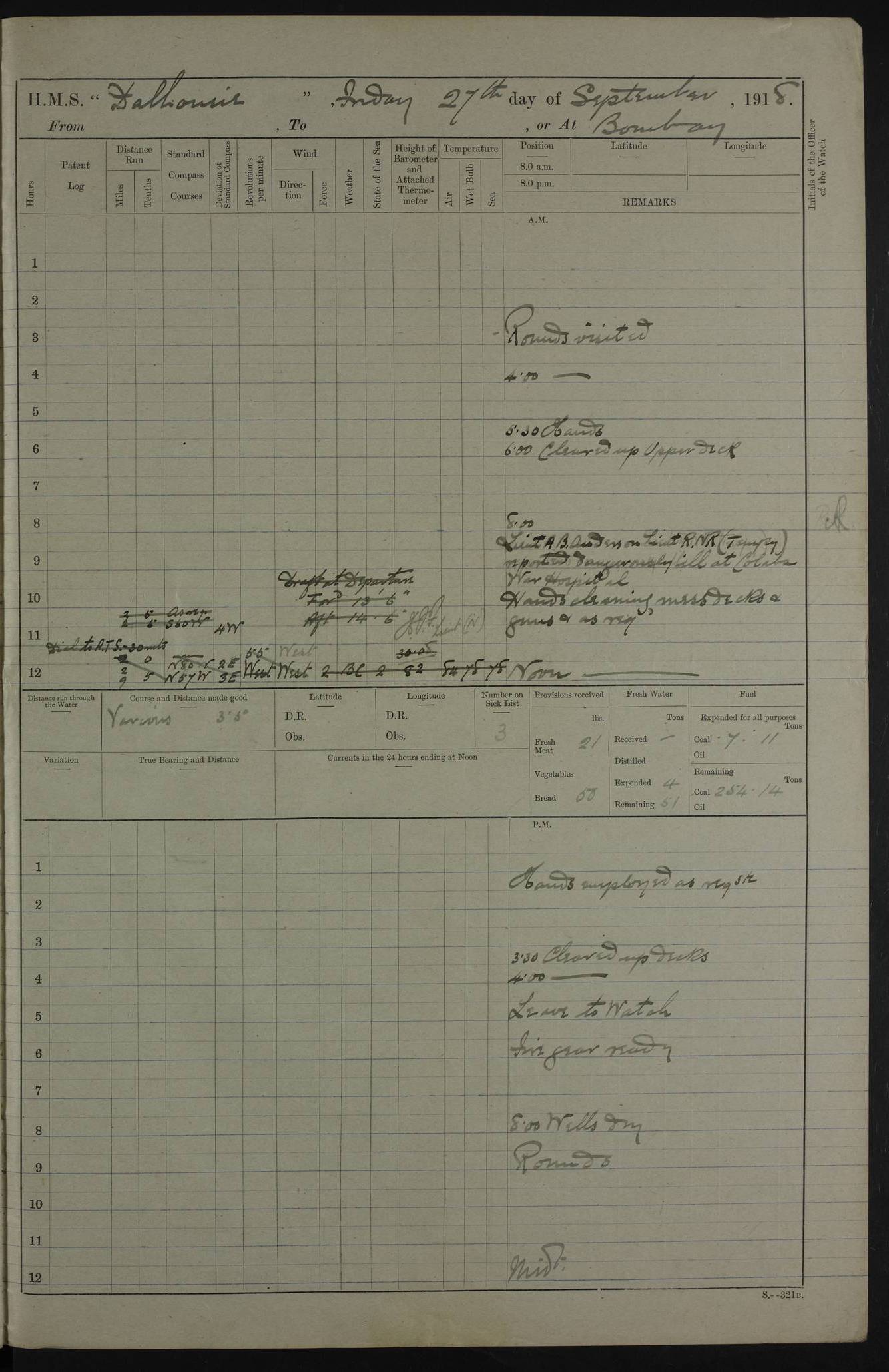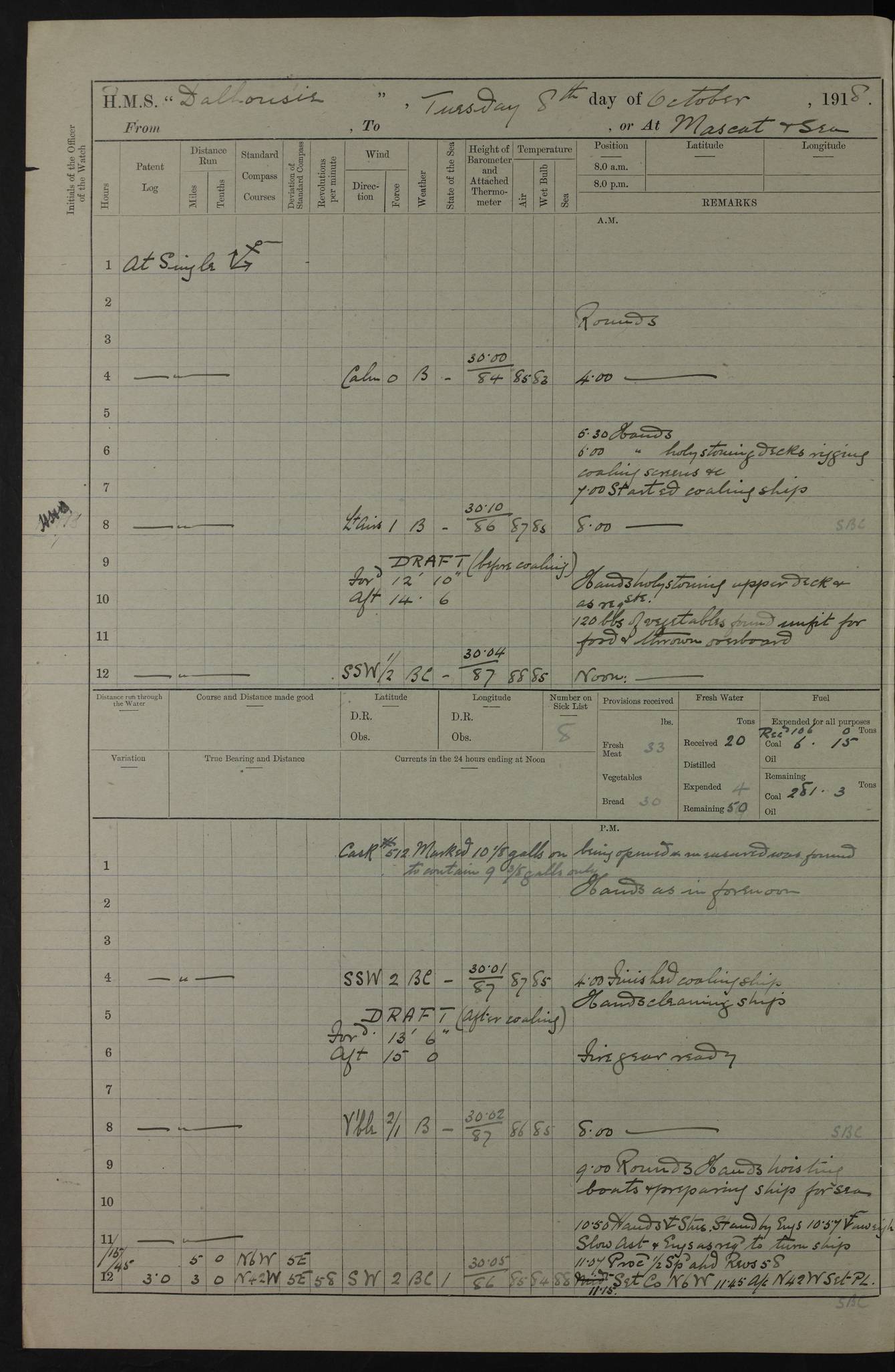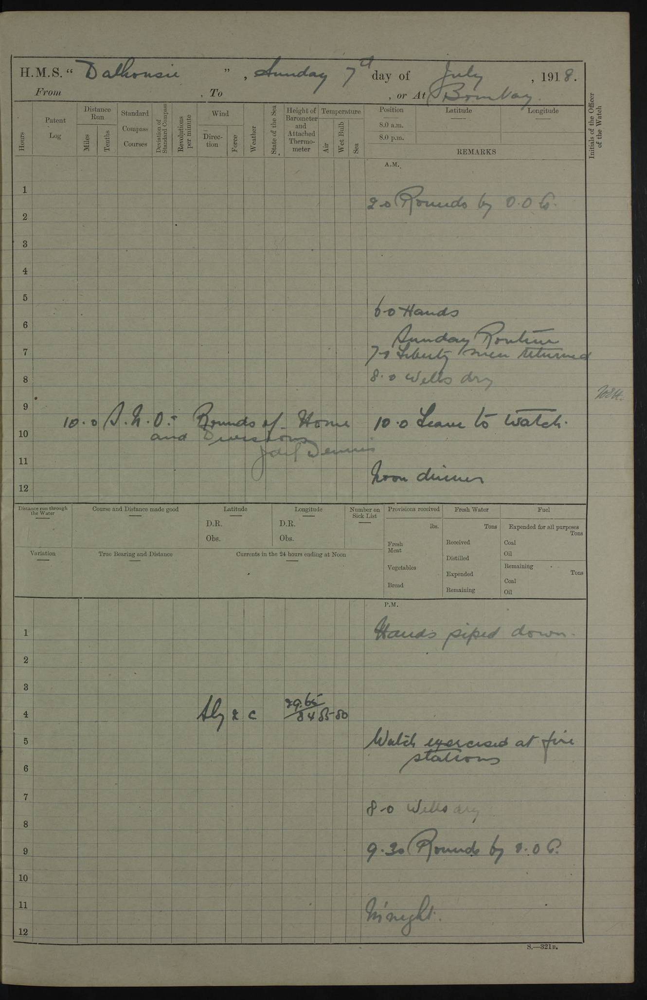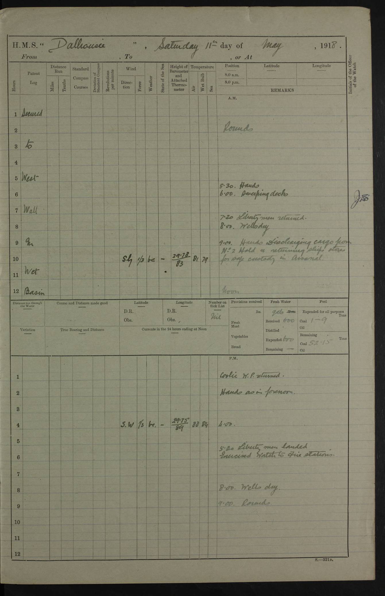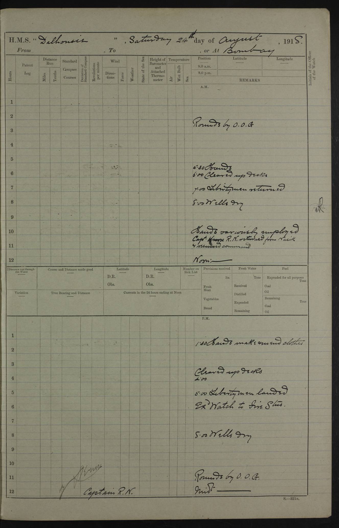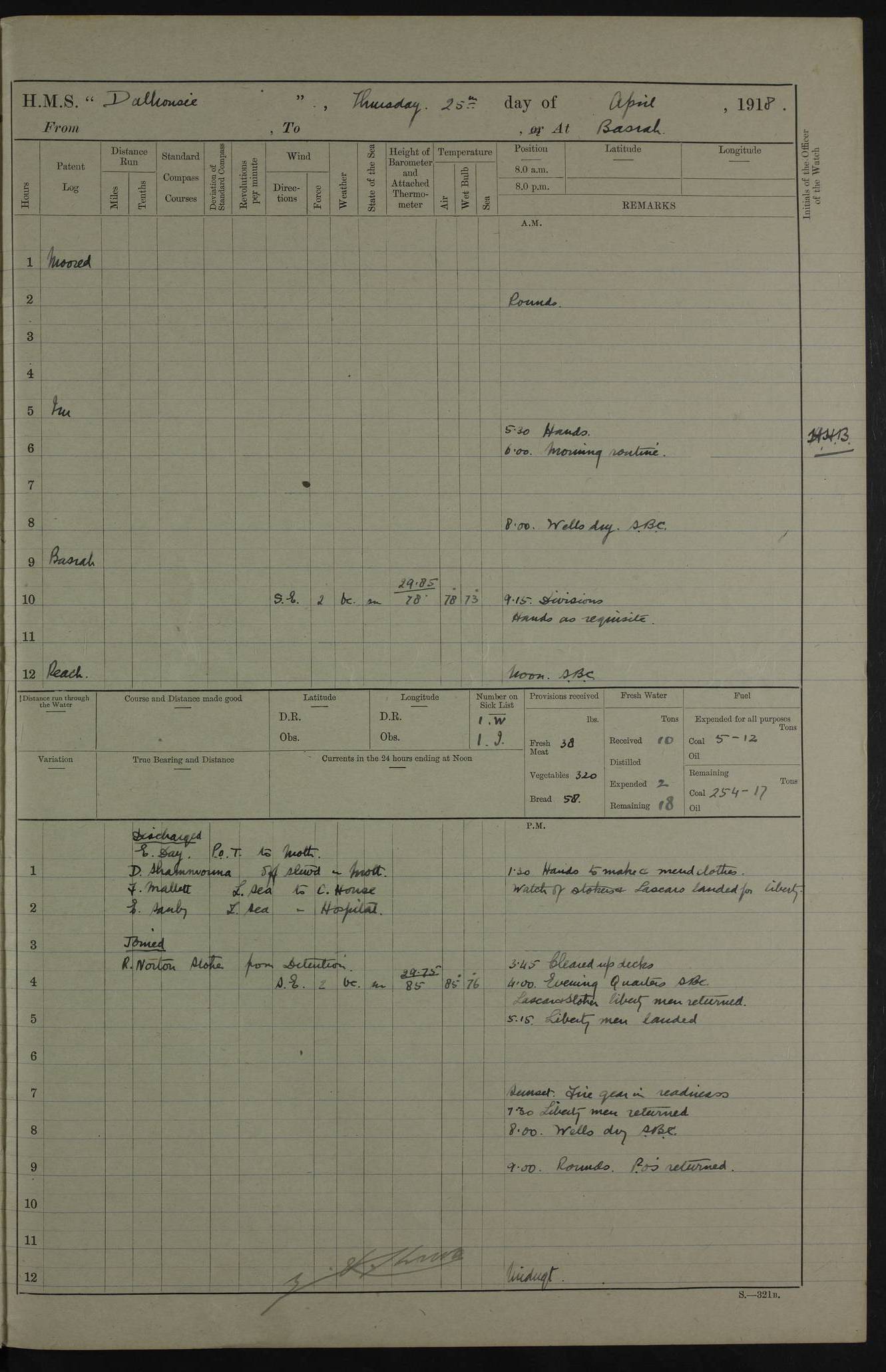 AM – Discharged To EKMA: PJ O’Connor, Lieutenant Royal Navy To Passage: 2 Indian Ratings To FLYCATCHER: D Butcher, Leading Seaman 4ef4fb19e53e0a0c910059d0: (https://s3.amazonaws.com:443/oldweather/ADM53-39410/0015_0.jpg) 26 February 1918 Place: Basrah Lat 30.5269, Long 47.8407 2:00am: Rounds 5:30am: Hands 6:00am: Morning Routine 7:45am: Working party to Depot 8:00am: Wells dry - Signal Books correct 9:10am: Divisions 10:00am: Hands employed painting in cabins & as requisite 12:00pm: Signal Books correct – Working party returned 1:20pm: Working party to Depot 3:45pm: Cleared up decks 4:00pm: Evening Quarters – Signal Books correct 4:30pm: Working party returned 5:10pm: Leave to Watch 6:00pm: Sunset - Fire Gear connected 7:30pm: Liberty men returned 8:00pm: Wells dry - Signal Books correct 9:00pm: Rounds – Signal Books correct PM – Joined From TARANTULA: J Baldwin, Leading Signalman From Hospital: Louis Mones, Engineering driver PM - Discharged To MANTIS: G Munay, Leading Signalman – C Killburn, Signalman To TARANTULA: CM Leary, Telegrapher 4ef4fb19e53e0a0c910059d1: (https://s3.amazonaws.com:443/oldweather/ADM53-39410/0015_1.jpg) 27 February 1918 Place: Basrah Lat 30.5269, Long 47.8407 2:00am: Rounds 5:30am: Hands 6:00am: Morning Routine 7:45am: Working party to Depot 8:00am: Wells dry - Signal Books correct 9:10am: Divisions 10:00am: Hands employed packing surveyed stores, cleaning out boats & painting in Warrant Ratings 12:00pm: Signal Books correct – Working party returned 1:20pm: Working party to Depot 3:45pm: Cleared up decks 4:00pm: Evening Quarters – Signal Books correct 4:30pm: Working party returned 5:10pm: Leave to Watch 6:00pm: Sunset - Fire Gear connected 7:30pm: Liberty men returned 8:00pm: Wells dry - Signal Books correct 9:00pm: Rounds – Signal Books correct AM – Joined From ELEPHANTA: No. 22 Sheik Kadir Sheik Mahomed, Lascar 2nd – No. 41 Abdool Rahman Sheik Dawood, Lamp Trimmer – No. 56 Mahomed Sabia Sheik Bosman, Stoker 2nd – No. 50A Sheik Mahomed Sheik Hassan, Stoker 2nd – No. 90 Abelino Fernandez, Topass – No. 86 Avelino Leitas, Topass 4ef4fb1ae53e0a0c910059d2: (https://s3.amazonaws.com:443/oldweather/ADM53-39410/0016_0.jpg) 28 February 1918 Place: Basrah Lat 30.5269, Long 47.8407 2:00am: Rounds 5:30am: Hands 6:00am: Morning Routine 7:45am: Working party to Depot 8:00am: Wells dry - Signal Books correct 9:10am: Divisions 10:00am: Hands employed discharging stores 12:00pm: Signal Books correct – Working party returned 1:00pm: Issued Quinine to Naval Ratings - Issued Quinine to Native Ratings 1:20pm: Working party to Depot 3:45pm: Cleared up decks 4:00pm: Evening Quarters – Signal Books correct 4:30pm: Working party returned 5:10pm: Leave to Watch 6:00pm: Sunset - Fire Gear connected 7:30pm: Liberty men returned 8:00pm: Wells dry - Signal Books correct 9:00pm: Rounds – Signal Books correct PM – Joined From SAPPHIRE: WC Woolley, Petty Officer PM - Discharged To TARANTULA: L Harris, Signalman To SEDGEFLY: T Hughes, Able Seaman To MANTIS: S Redshaw, Able Seaman To Depot: R Matheison, Stoker – H Philo, Stoker TO GRAYFLY: H Stockbridge, Senior Petty Officer 4ef4fb1ae53e0a0c910059d3: (https://s3.amazonaws.com:443/oldweather/ADM53-39410/0016_1.jpg) Log Page – Blank – no data on Page 4ef4fb1ae53e0a0c910059d4: (https://s3.amazonaws.com:443/oldweather/ADM53-39410/0017_0.jpg) Log Page – Blank – no data on Page 4ef4fb1ae53e0a0c910059d5: (https://s3.amazonaws.com:443/oldweather/ADM53-39410/0017_1.jpg) Log Page – Blank 4ef4fb1ae53e0a0c910059d6: (https://s3.amazonaws.com:443/oldweather/ADM53-39410/0018_0.jpg) Log Page – Blank 4ef4fb1ae53e0a0c910059d7: (https://s3.amazonaws.com:443/oldweather/ADM53-39410/0018_1.jpg) Log Page – Blank LOGS FOR MARCH 1918 4ef4fb1be53e0a0c910059d8: (https://s3.amazonaws.com:443/oldweather/ADM53-39411/0000_0.jpg) Log Page – Cover March 1918 4ef4fb1be53e0a0c910059d9: (https://s3.amazonaws.com:443/oldweather/ADM53-39411/0000_1.jpg) Log Page – Cover – March 1918 4ef4fb1be53e0a0c910059da: (https://s3.amazonaws.com:443/oldweather/ADM53-39411/0001_0.jpg) Log Page – Blank 4ef4fb1be53e0a0c910059db: (https://s3.amazonaws.com:443/oldweather/ADM53-39411/0001_1.jpg) Log Page – Blank – no data on Page 4ef4fb1ce53e0a0c910059dc: (https://s3.amazonaws.com:443/oldweather/ADM53-39411/0002_0.jpg) Log Page – Blank – no data on Page 4ef4fb1ce53e0a0c910059dd: (https://s3.amazonaws.com:443/oldweather/ADM53-39411/0002_1.jpg) 1 March 1918 Place: Basrah Lat 30.5269, Long 47.8407 1:00am: drew from Field Chest Treasury Officer Basrah Five thousand (5,000) Rupees only 2:00am: Rounds 5:30am: Hands 6:00am: Morning Routine 7:45am: Working party to Depot 8:00am: Wells dry – Signal Books correct – CHAKLA arrived with 5 Officers & 60 Ratings 12:00pm: Signal Books correct – Working party returned 1:15pm: Working party to Depot 2:00pm: Paid Lascar Ratings 3:45pm: Cleared up decks 4:00pm: Evening Quarters 4:30pm: Working party returned 5:10pm: Leave to Watch 5:30pm: 5 Petty Officers & 57 Ratings to Bandra for Passage 6:00pm: Sunset - Fire Gear connected 7:30pm: Liberty men returned 9:00pm: Rounds – Petty Officers returned AM – Joined From CHALKA: Hawkins, Paymaster Royal Navy PM - Discharged To FLYCATCHER: Dennis, Sub Lieutenant Royal Navy Volunteer Reserve To TARANTULA: L Harris, Signalman To SEDGEFLY: TG Hughes, Able Seaman To MANTIS: S Redshaw, Able Seaman To Depot: R Mathieson, Stoker To GRAYFLY: H Stockbridge, Senior Petty Officer 4ef4fb1ce53e0a0c910059de: (https://s3.amazonaws.com:443/oldweather/ADM53-39411/0003_0.jpg) 2 March 1918 Place: Basrah Lat 30.5269, Long 47.8407 2:00am: Rounds 5:30am: Hands 6:00am: Morning Routine 7:00am: Exercised Fire Stations 7:45am: Working party to Depot 8:00am: Wells dry - Signal Books correct 9:10am: Divisions 10:00am: Hands employed as requisite 12:00pm: Working party returned 1:15pm: Working party to Depot 3:45pm: Cleared up decks 4:00pm: Evening Quarters – Signal Books corr