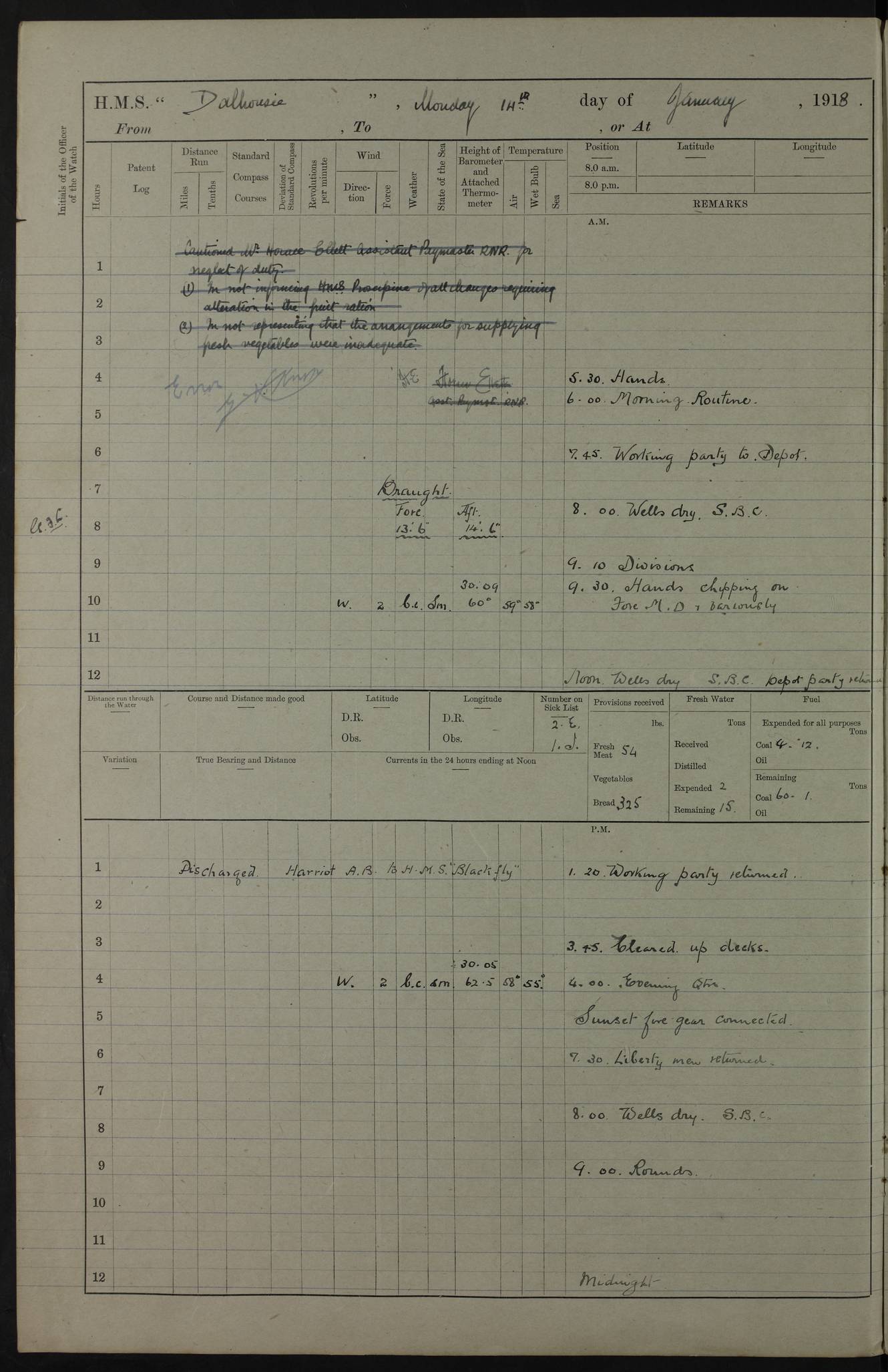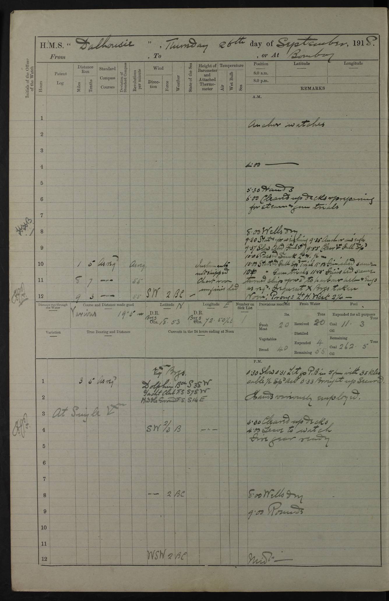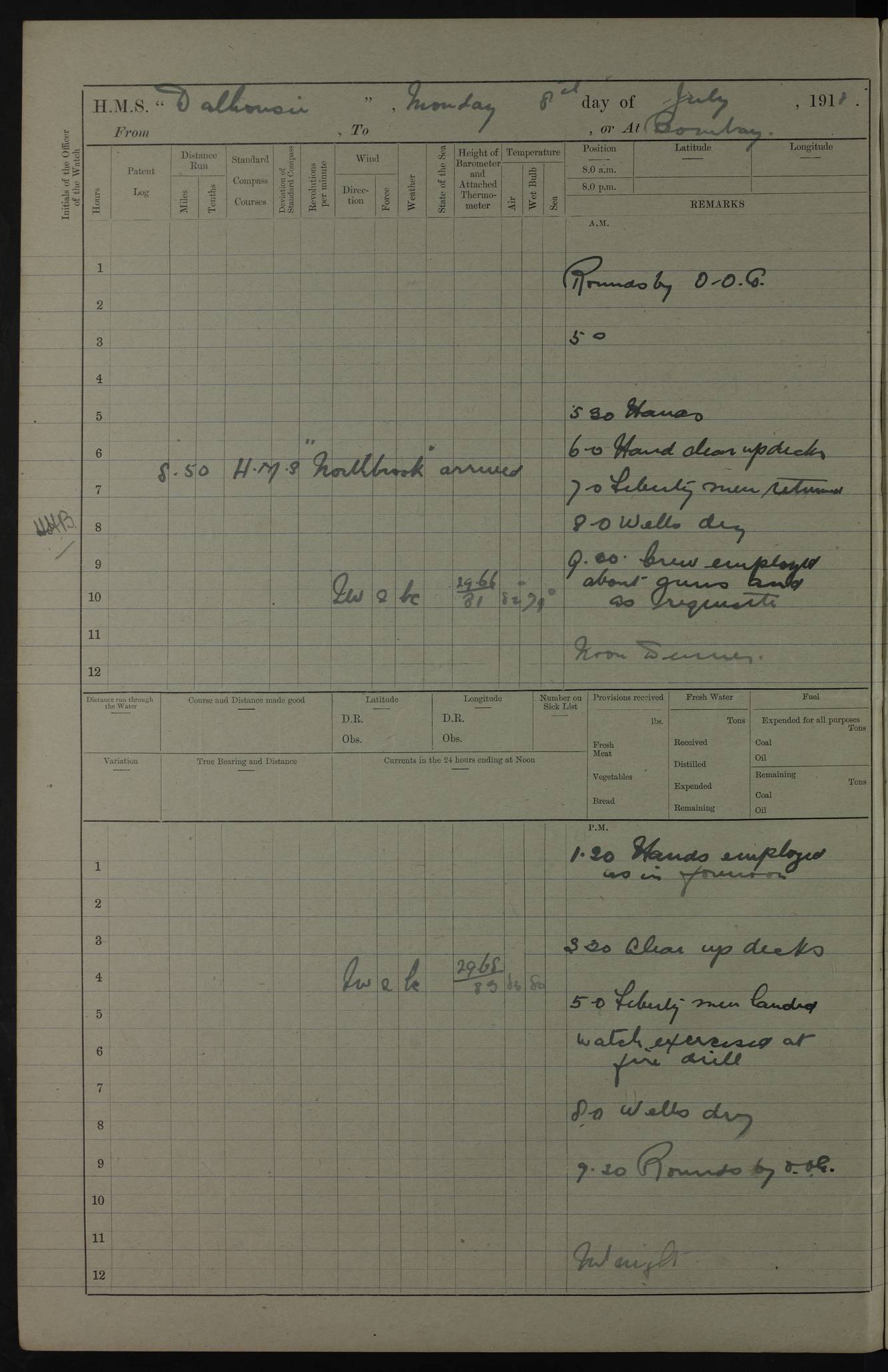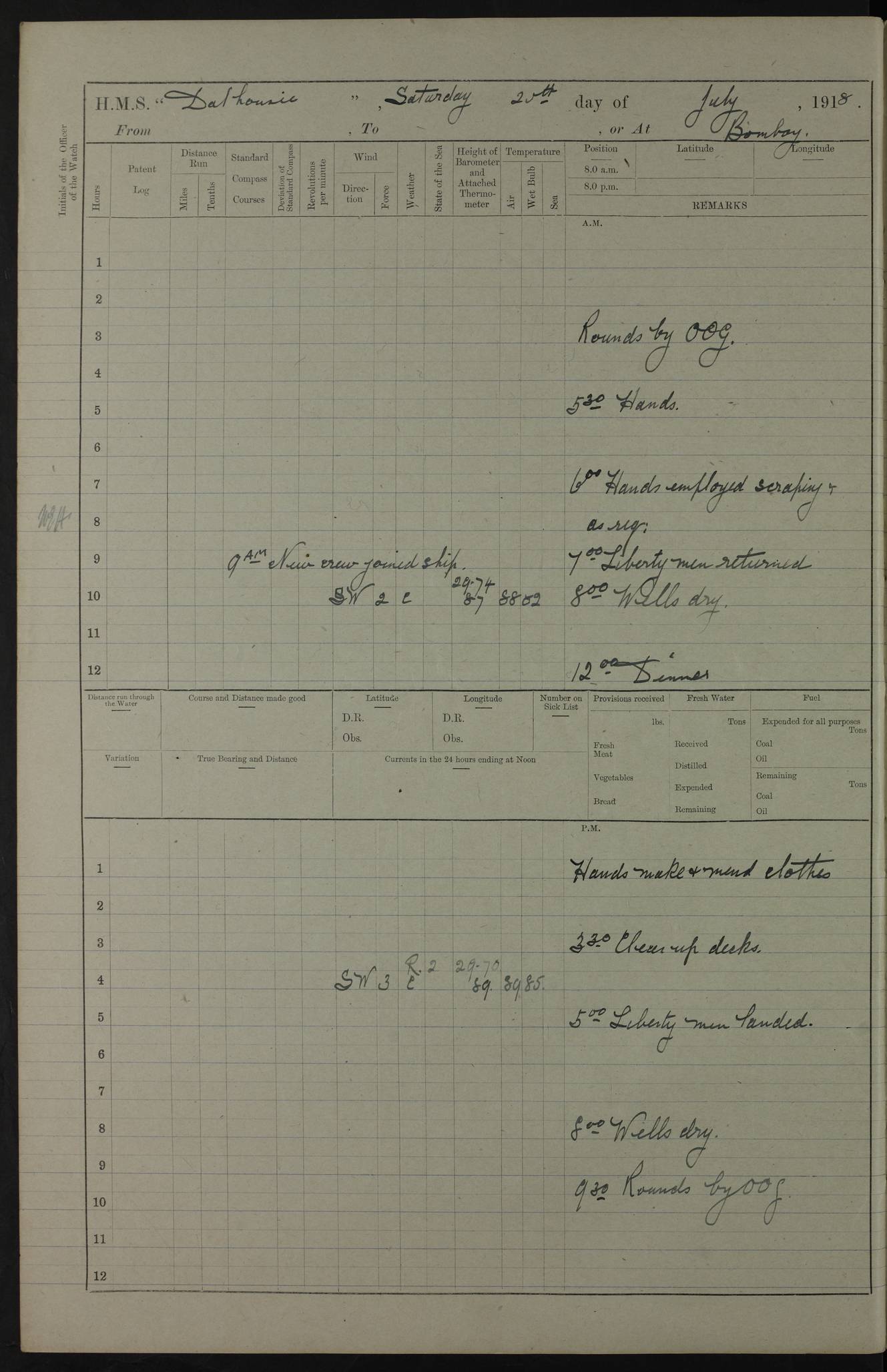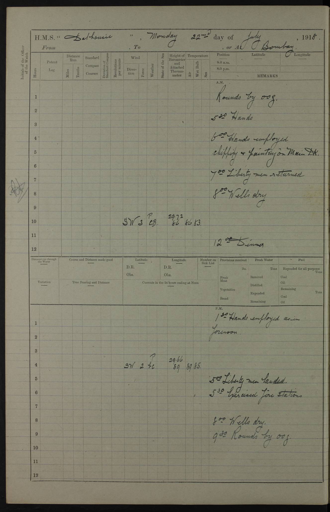 AM – Discharged To EKMA: PJ O’Connor, Lieutenant Royal Navy To Passage: 2 Indian Ratings To FLYCATCHER: D Butcher, Leading Seaman 4ef4fb19e53e0a0c910059d0: (https://s3.amazonaws.com:443/oldweather/ADM53-39410/0015_0.jpg) 26 February 1918 Place: Basrah Lat 30.5269, Long 47.8407 2:00am: Rounds 5:30am: Hands 6:00am: Morning Routine 7:45am: Working party to Depot 8:00am: Wells dry - Signal Books correct 9:10am: Divisions 10:00am: Hands employed painting in cabins & as requisite 12:00pm: Signal Books correct – Working party returned 1:20pm: Working party to Depot 3:45pm: Cleared up decks 4:00pm: Evening Quarters – Signal Books correct 4:30pm: Working party returned 5:10pm: Leave to Watch 6:00pm: Sunset - Fire Gear connected 7:30pm: Liberty men returned 8:00pm: Wells dry - Signal Books correct 9:00pm: Rounds – Signal Books correct PM – Joined From TARANTULA: J Baldwin, Leading Signalman From Hospital: Louis Mones, Engineering driver PM - Discharged To MANTIS: G Munay, Leading Signalman – C Killburn, Signalman To TARANTULA: CM Leary, Telegrapher 4ef4fb19e53e0a0c910059d1: (https://s3.amazonaws.com:443/oldweather/ADM53-39410/0015_1.jpg) 27 February 1918 Place: Basrah Lat 30.5269, Long 47.8407 2:00am: Rounds 5:30am: Hands 6:00am: Morning Routine 7:45am: Working party to Depot 8:00am: Wells dry - Signal Books correct 9:10am: Divisions 10:00am: Hands employed packing surveyed stores, cleaning out boats & painting in Warrant Ratings 12:00pm: Signal Books correct – Working party returned 1:20pm: Working party to Depot 3:45pm: Cleared up decks 4:00pm: Evening Quarters – Signal Books correct 4:30pm: Working party returned 5:10pm: Leave to Watch 6:00pm: Sunset - Fire Gear connected 7:30pm: Liberty men returned 8:00pm: Wells dry - Signal Books correct 9:00pm: Rounds – Signal Books correct AM – Joined From ELEPHANTA: No. 22 Sheik Kadir Sheik Mahomed, Lascar 2nd – No. 41 Abdool Rahman Sheik Dawood, Lamp Trimmer – No. 56 Mahomed Sabia Sheik Bosman, Stoker 2nd – No. 50A Sheik Mahomed Sheik Hassan, Stoker 2nd – No. 90 Abelino Fernandez, Topass – No. 86 Avelino Leitas, Topass 4ef4fb1ae53e0a0c910059d2: (https://s3.amazonaws.com:443/oldweather/ADM53-39410/0016_0.jpg) 28 February 1918 Place: Basrah Lat 30.5269, Long 47.8407 2:00am: Rounds 5:30am: Hands 6:00am: Morning Routine 7:45am: Working party to Depot 8:00am: Wells dry - Signal Books correct 9:10am: Divisions 10:00am: Hands employed discharging stores 12:00pm: Signal Books correct – Working party returned 1:00pm: Issued Quinine to Naval Ratings - Issued Quinine to Native Ratings 1:20pm: Working party to Depot 3:45pm: Cleared up decks 4:00pm: Evening Quarters – Signal Books correct 4:30pm: Working party returned 5:10pm: Leave to Watch 6:00pm: Sunset - Fire Gear connected 7:30pm: Liberty men returned 8:00pm: Wells dry - Signal Books correct 9:00pm: Rounds – Signal Books correct PM – Joined From SAPPHIRE: WC Woolley, Petty Officer PM - Discharged To TARANTULA: L Harris, Signalman To SEDGEFLY: T Hughes, Able Seaman To MANTIS: S Redshaw, Able Seaman To Depot: R Matheison, Stoker – H Philo, Stoker TO GRAYFLY: H Stockbridge, Senior Petty Officer 4ef4fb1ae53e0a0c910059d3: (https://s3.amazonaws.com:443/oldweather/ADM53-39410/0016_1.jpg) Log Page – Blank – no data on Page 4ef4fb1ae53e0a0c910059d4: (https://s3.amazonaws.com:443/oldweather/ADM53-39410/0017_0.jpg) Log Page – Blank – no data on Page 4ef4fb1ae53e0a0c910059d5: (https://s3.amazonaws.com:443/oldweather/ADM53-39410/0017_1.jpg) Log Page – Blank 4ef4fb1ae53e0a0c910059d6: (https://s3.amazonaws.com:443/oldweather/ADM53-39410/0018_0.jpg) Log Page – Blank 4ef4fb1ae53e0a0c910059d7: (https://s3.amazonaws.com:443/oldweather/ADM53-39410/0018_1.jpg) Log Page – Blank LOGS FOR MARCH 1918 4ef4fb1be53e0a0c910059d8: (https://s3.amazonaws.com:443/oldweather/ADM53-39411/0000_0.jpg) Log Page – Cover March 1918 4ef4fb1be53e0a0c910059d9: (https://s3.amazonaws.com:443/oldweather/ADM53-39411/0000_1.jpg) Log Page – Cover – March 1918 4ef4fb1be53e0a0c910059da: (https://s3.amazonaws.com:443/oldweather/ADM53-39411/0001_0.jpg) Log Page – Blank 4ef4fb1be53e0a0c910059db: (https://s3.amazonaws.com:443/oldweather/ADM53-39411/0001_1.jpg) Log Page – Blank – no data on Page 4ef4fb1ce53e0a0c910059dc: (https://s3.amazonaws.com:443/oldweather/ADM53-39411/0002_0.jpg) Log Page – Blank – no data on Page 4ef4fb1ce53e0a0c910059dd: (https://s3.amazonaws.com:443/oldweather/ADM53-39411/0002_1.jpg) 1 March 1918 Place: Basrah Lat 30.5269, Long 47.8407 1:00am: drew from Field Chest Treasury Officer Basrah Five thousand (5,000) Rupees only 2:00am: Rounds 5:30am: Hands 6:00am: Morning Routine 7:45am: Working party to Depot 8:00am: Wells dry – Signal Books correct – CHAKLA arrived with 5 Officers & 60 Ratings 12:00pm: Signal Books correct – Working party returned 1:15pm: Working party to Depot 2:00pm: Paid Lascar Ratings 3:45pm: Cleared up decks 4:00pm: Evening Quarters 4:30pm: Working party returned 5:10pm: Leave to Watch 5:30pm: 5 Petty Officers & 57 Ratings to Bandra for Passage 6:00pm: Sunset - Fire Gear connected 7:30pm: Liberty men returned 9:00pm: Rounds – Petty Officers returned AM – Joined From CHALKA: Hawkins, Paymaster Royal Navy PM - Discharged To FLYCATCHER: Dennis, Sub Lieutenant Royal Navy Volunteer Reserve To TARANTULA: L Harris, Signalman To SEDGEFLY: TG Hughes, Able Seaman To MANTIS: S Redshaw, Able Seaman To Depot: R Mathieson, Stoker To GRAYFLY: H Stockbridge, Senior Petty Officer 4ef4fb1ce53e0a0c910059de: (https://s3.amazonaws.com:443/oldweather/ADM53-39411/0003_0.jpg) 2 March 1918 Place: Basrah Lat 30.5269, Long 47.8407 2:00am: Rounds 5:30am: Hands 6:00am: Morning Routine 7:00am: Exercised Fire Stations 7:45am: Working party to Depot 8:00am: Wells dry - Signal Books correct 9:10am: Divisions 10:00am: Hands employed as requisite 12:00pm: Working party returned 1:15pm: Working party to Depot 3:45pm: Cleared up decks 4:00pm: Evening Quarters – Signal Books corr