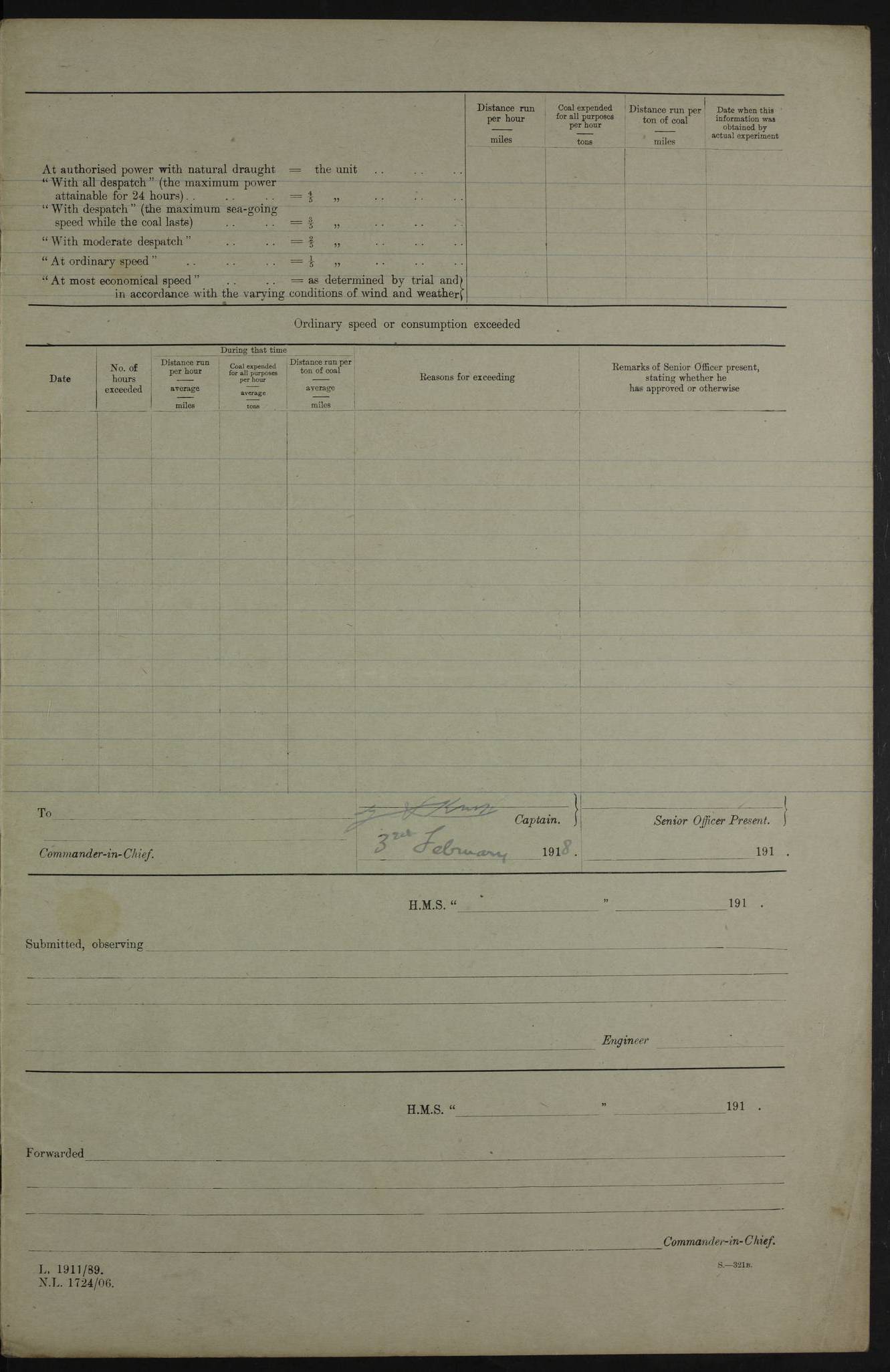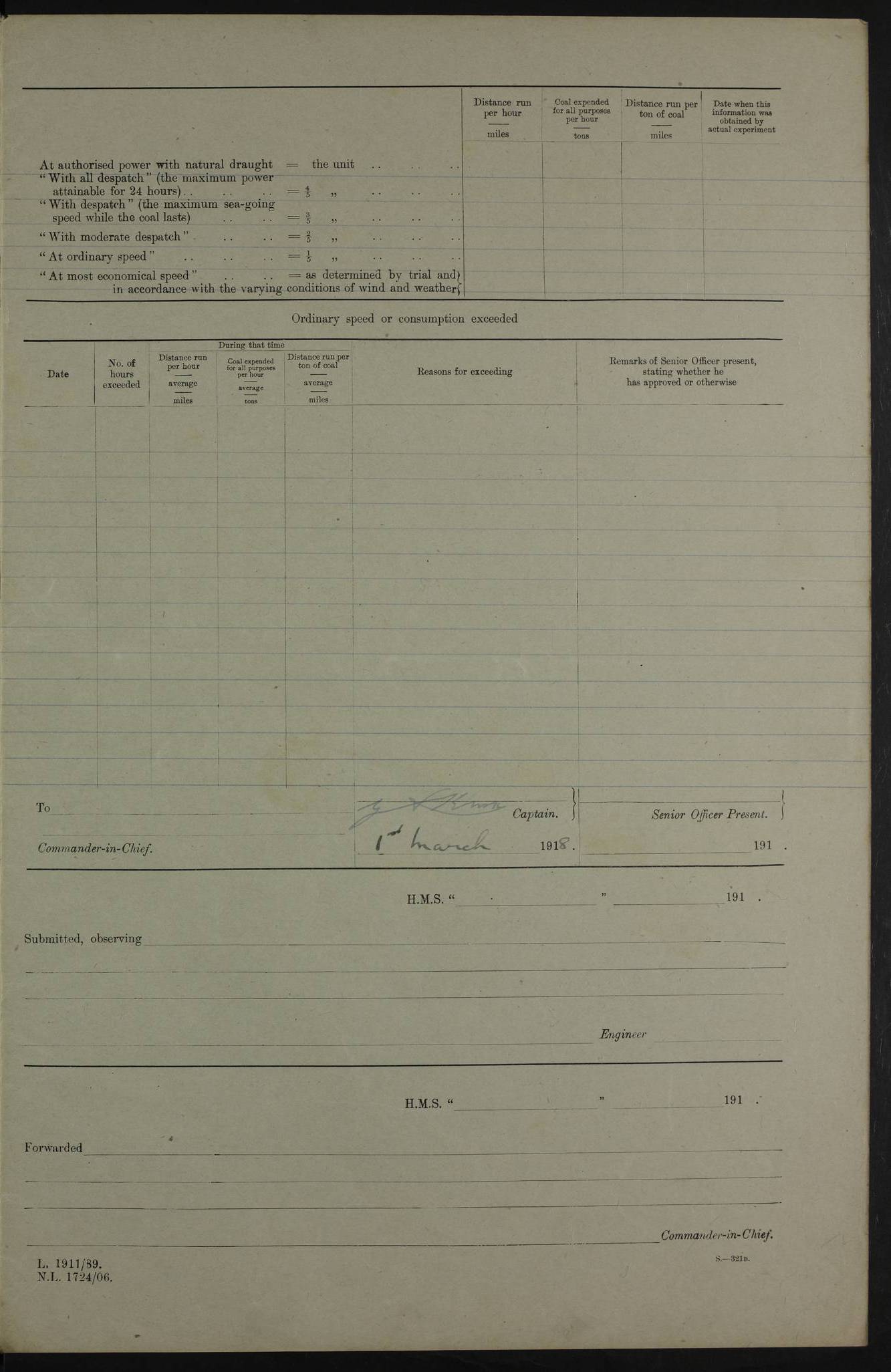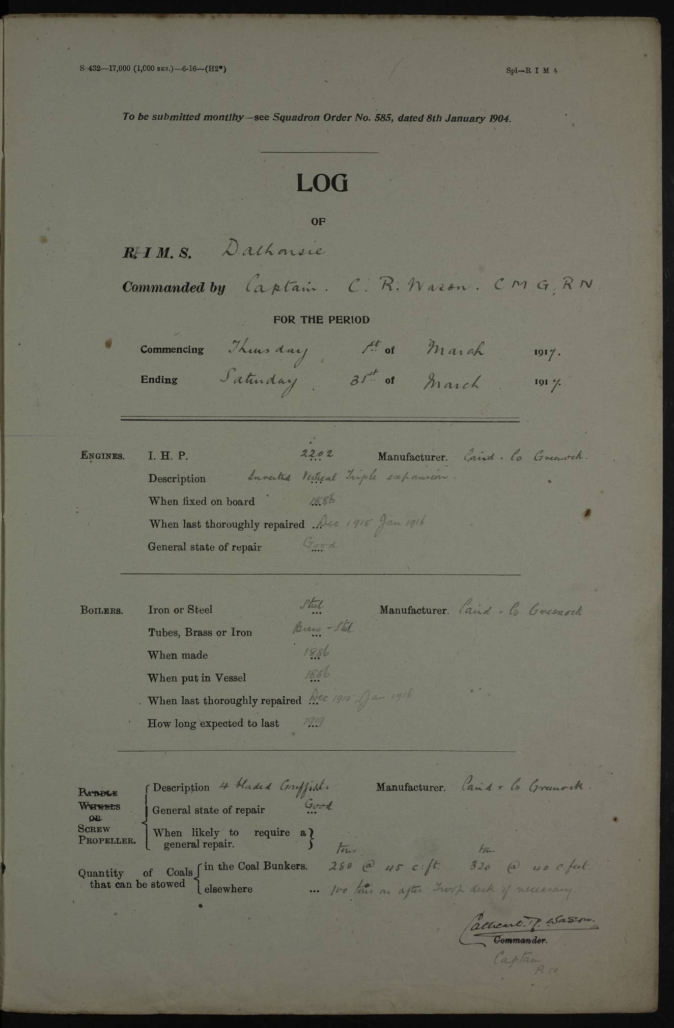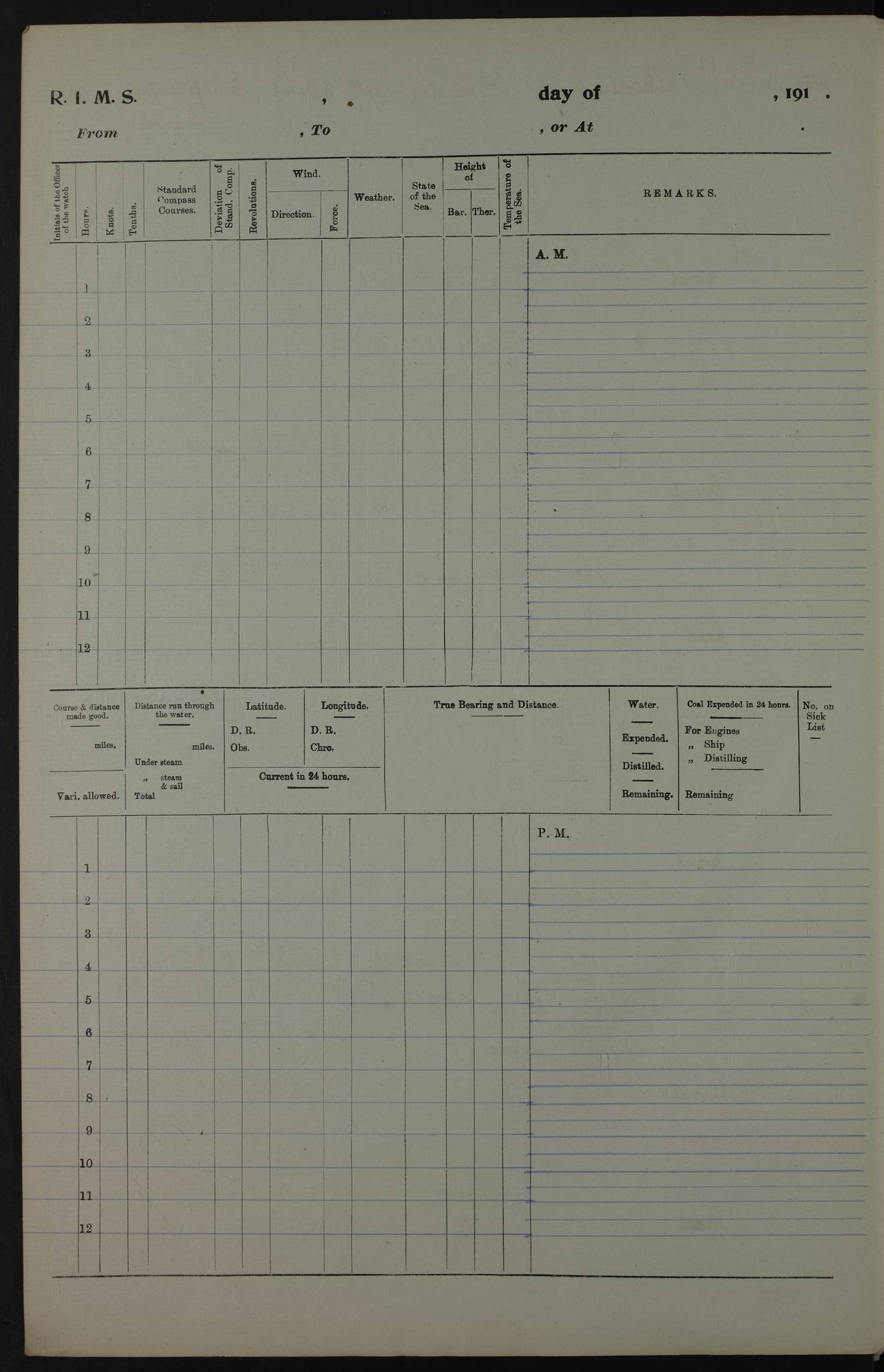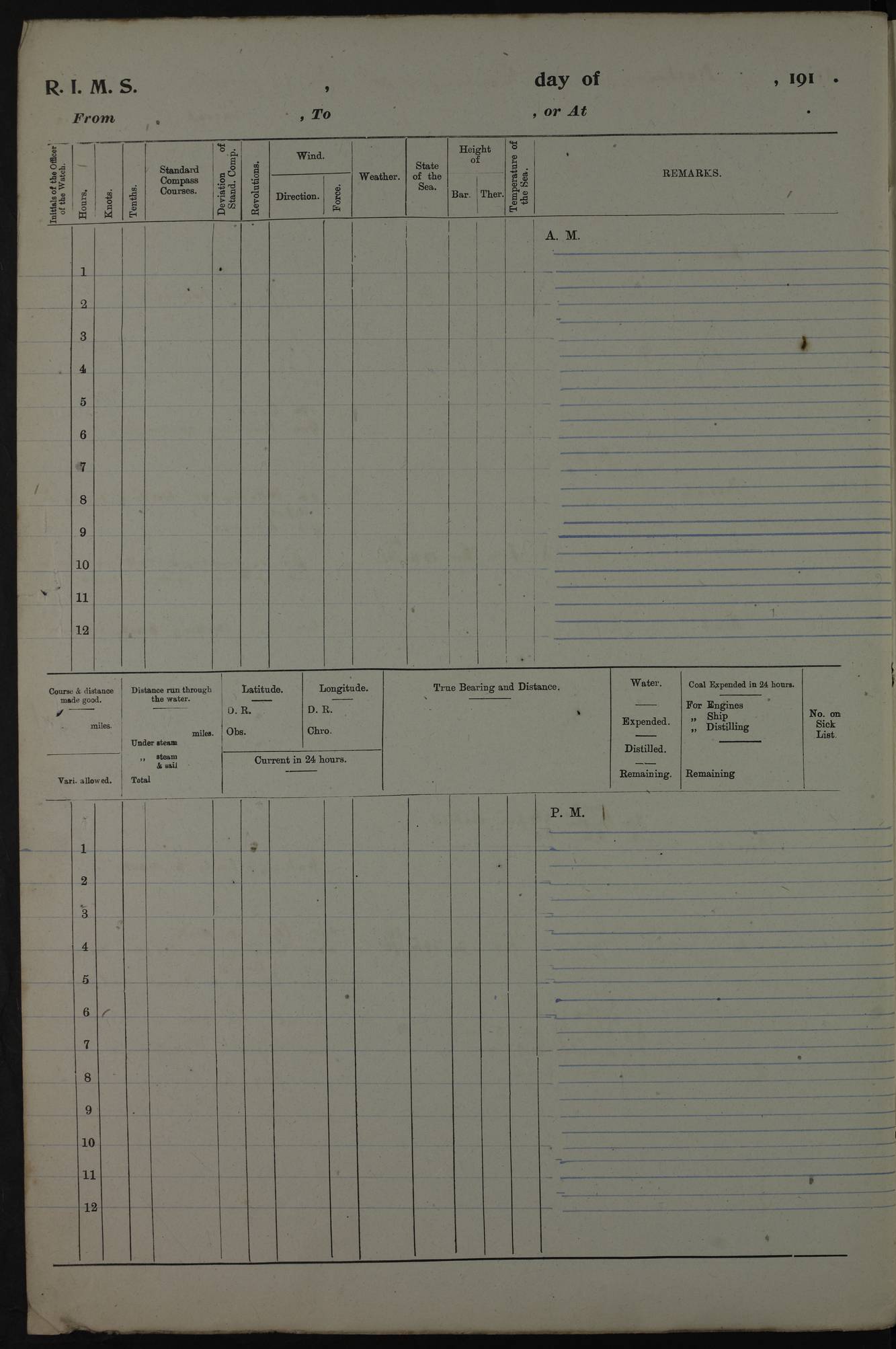 AM – Discharged To EKMA: PJ O’Connor, Lieutenant Royal Navy To Passage: 2 Indian Ratings To FLYCATCHER: D Butcher, Leading Seaman 4ef4fb19e53e0a0c910059d0: (https://s3.amazonaws.com:443/oldweather/ADM53-39410/0015_0.jpg) 26 February 1918 Place: Basrah Lat 30.5269, Long 47.8407 2:00am: Rounds 5:30am: Hands 6:00am: Morning Routine 7:45am: Working party to Depot 8:00am: Wells dry - Signal Books correct 9:10am: Divisions 10:00am: Hands employed painting in cabins & as requisite 12:00pm: Signal Books correct – Working party returned 1:20pm: Working party to Depot 3:45pm: Cleared up decks 4:00pm: Evening Quarters – Signal Books correct 4:30pm: Working party returned 5:10pm: Leave to Watch 6:00pm: Sunset - Fire Gear connected 7:30pm: Liberty men returned 8:00pm: Wells dry - Signal Books correct 9:00pm: Rounds – Signal Books correct PM – Joined From TARANTULA: J Baldwin, Leading Signalman From Hospital: Louis Mones, Engineering driver PM - Discharged To MANTIS: G Munay, Leading Signalman – C Killburn, Signalman To TARANTULA: CM Leary, Telegrapher 4ef4fb19e53e0a0c910059d1: (https://s3.amazonaws.com:443/oldweather/ADM53-39410/0015_1.jpg) 27 February 1918 Place: Basrah Lat 30.5269, Long 47.8407 2:00am: Rounds 5:30am: Hands 6:00am: Morning Routine 7:45am: Working party to Depot 8:00am: Wells dry - Signal Books correct 9:10am: Divisions 10:00am: Hands employed packing surveyed stores, cleaning out boats & painting in Warrant Ratings 12:00pm: Signal Books correct – Working party returned 1:20pm: Working party to Depot 3:45pm: Cleared up decks 4:00pm: Evening Quarters – Signal Books correct 4:30pm: Working party returned 5:10pm: Leave to Watch 6:00pm: Sunset - Fire Gear connected 7:30pm: Liberty men returned 8:00pm: Wells dry - Signal Books correct 9:00pm: Rounds – Signal Books correct AM – Joined From ELEPHANTA: No. 22 Sheik Kadir Sheik Mahomed, Lascar 2nd – No. 41 Abdool Rahman Sheik Dawood, Lamp Trimmer – No. 56 Mahomed Sabia Sheik Bosman, Stoker 2nd – No. 50A Sheik Mahomed Sheik Hassan, Stoker 2nd – No. 90 Abelino Fernandez, Topass – No. 86 Avelino Leitas, Topass 4ef4fb1ae53e0a0c910059d2: (https://s3.amazonaws.com:443/oldweather/ADM53-39410/0016_0.jpg) 28 February 1918 Place: Basrah Lat 30.5269, Long 47.8407 2:00am: Rounds 5:30am: Hands 6:00am: Morning Routine 7:45am: Working party to Depot 8:00am: Wells dry - Signal Books correct 9:10am: Divisions 10:00am: Hands employed discharging stores 12:00pm: Signal Books correct – Working party returned 1:00pm: Issued Quinine to Naval Ratings - Issued Quinine to Native Ratings 1:20pm: Working party to Depot 3:45pm: Cleared up decks 4:00pm: Evening Quarters – Signal Books correct 4:30pm: Working party returned 5:10pm: Leave to Watch 6:00pm: Sunset - Fire Gear connected 7:30pm: Liberty men returned 8:00pm: Wells dry - Signal Books correct 9:00pm: Rounds – Signal Books correct PM – Joined From SAPPHIRE: WC Woolley, Petty Officer PM - Discharged To TARANTULA: L Harris, Signalman To SEDGEFLY: T Hughes, Able Seaman To MANTIS: S Redshaw, Able Seaman To Depot: R Matheison, Stoker – H Philo, Stoker TO GRAYFLY: H Stockbridge, Senior Petty Officer 4ef4fb1ae53e0a0c910059d3: (https://s3.amazonaws.com:443/oldweather/ADM53-39410/0016_1.jpg) Log Page – Blank – no data on Page 4ef4fb1ae53e0a0c910059d4: (https://s3.amazonaws.com:443/oldweather/ADM53-39410/0017_0.jpg) Log Page – Blank – no data on Page 4ef4fb1ae53e0a0c910059d5: (https://s3.amazonaws.com:443/oldweather/ADM53-39410/0017_1.jpg) Log Page – Blank 4ef4fb1ae53e0a0c910059d6: (https://s3.amazonaws.com:443/oldweather/ADM53-39410/0018_0.jpg) Log Page – Blank 4ef4fb1ae53e0a0c910059d7: (https://s3.amazonaws.com:443/oldweather/ADM53-39410/0018_1.jpg) Log Page – Blank LOGS FOR MARCH 1918 4ef4fb1be53e0a0c910059d8: (https://s3.amazonaws.com:443/oldweather/ADM53-39411/0000_0.jpg) Log Page – Cover March 1918 4ef4fb1be53e0a0c910059d9: (https://s3.amazonaws.com:443/oldweather/ADM53-39411/0000_1.jpg) Log Page – Cover – March 1918 4ef4fb1be53e0a0c910059da: (https://s3.amazonaws.com:443/oldweather/ADM53-39411/0001_0.jpg) Log Page – Blank 4ef4fb1be53e0a0c910059db: (https://s3.amazonaws.com:443/oldweather/ADM53-39411/0001_1.jpg) Log Page – Blank – no data on Page 4ef4fb1ce53e0a0c910059dc: (https://s3.amazonaws.com:443/oldweather/ADM53-39411/0002_0.jpg) Log Page – Blank – no data on Page 4ef4fb1ce53e0a0c910059dd: (https://s3.amazonaws.com:443/oldweather/ADM53-39411/0002_1.jpg) 1 March 1918 Place: Basrah Lat 30.5269, Long 47.8407 1:00am: drew from Field Chest Treasury Officer Basrah Five thousand (5,000) Rupees only 2:00am: Rounds 5:30am: Hands 6:00am: Morning Routine 7:45am: Working party to Depot 8:00am: Wells dry – Signal Books correct – CHAKLA arrived with 5 Officers & 60 Ratings 12:00pm: Signal Books correct – Working party returned 1:15pm: Working party to Depot 2:00pm: Paid Lascar Ratings 3:45pm: Cleared up decks 4:00pm: Evening Quarters 4:30pm: Working party returned 5:10pm: Leave to Watch 5:30pm: 5 Petty Officers & 57 Ratings to Bandra for Passage 6:00pm: Sunset - Fire Gear connected 7:30pm: Liberty men returned 9:00pm: Rounds – Petty Officers returned AM – Joined From CHALKA: Hawkins, Paymaster Royal Navy PM - Discharged To FLYCATCHER: Dennis, Sub Lieutenant Royal Navy Volunteer Reserve To TARANTULA: L Harris, Signalman To SEDGEFLY: TG Hughes, Able Seaman To MANTIS: S Redshaw, Able Seaman To Depot: R Mathieson, Stoker To GRAYFLY: H Stockbridge, Senior Petty Officer 4ef4fb1ce53e0a0c910059de: (https://s3.amazonaws.com:443/oldweather/ADM53-39411/0003_0.jpg) 2 March 1918 Place: Basrah Lat 30.5269, Long 47.8407 2:00am: Rounds 5:30am: Hands 6:00am: Morning Routine 7:00am: Exercised Fire Stations 7:45am: Working party to Depot 8:00am: Wells dry - Signal Books correct 9:10am: Divisions 10:00am: Hands employed as requisite 12:00pm: Working party returned 1:15pm: Working party to Depot 3:45pm: Cleared up decks 4:00pm: Evening Quarters – Signal Books corr