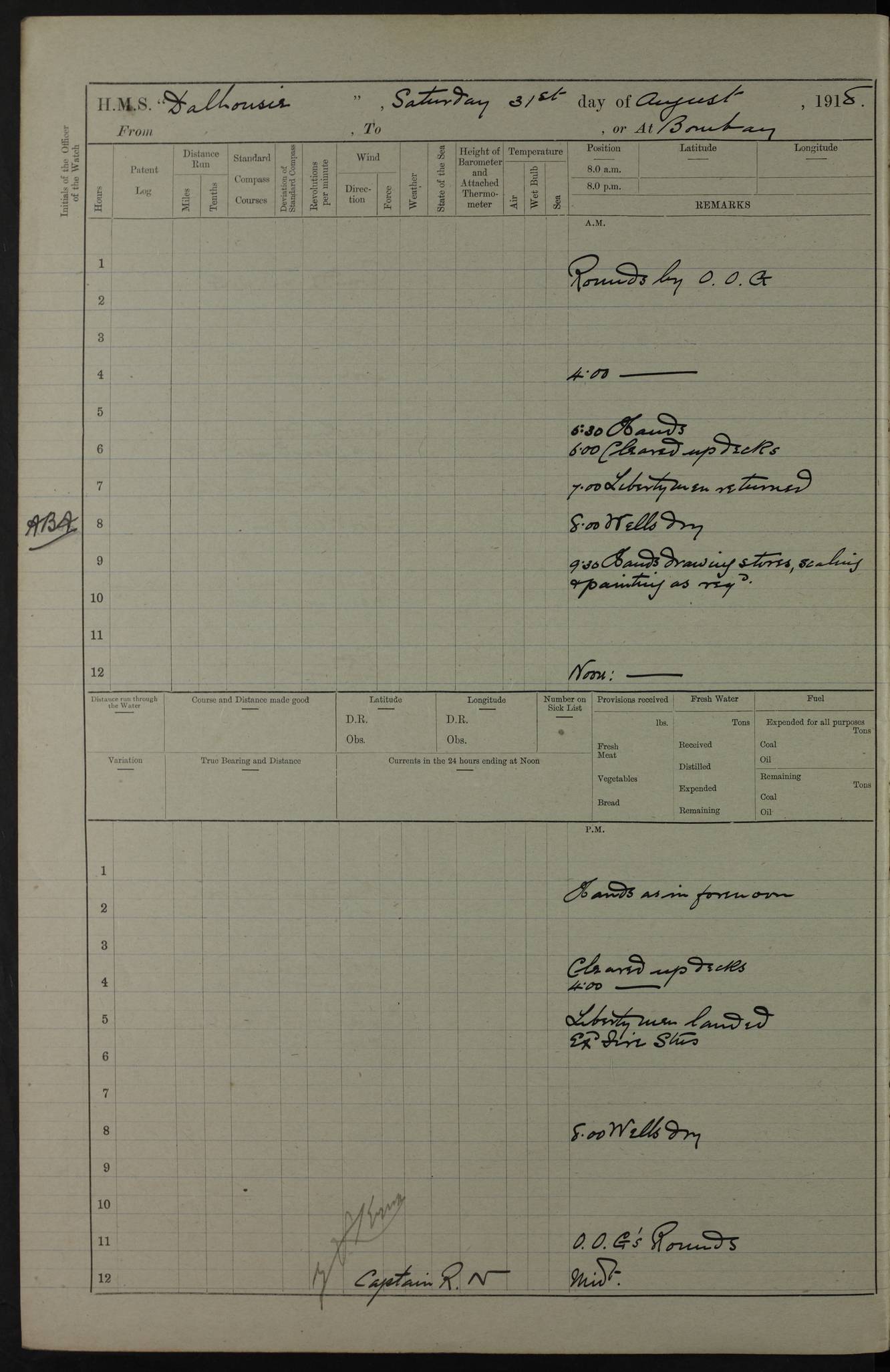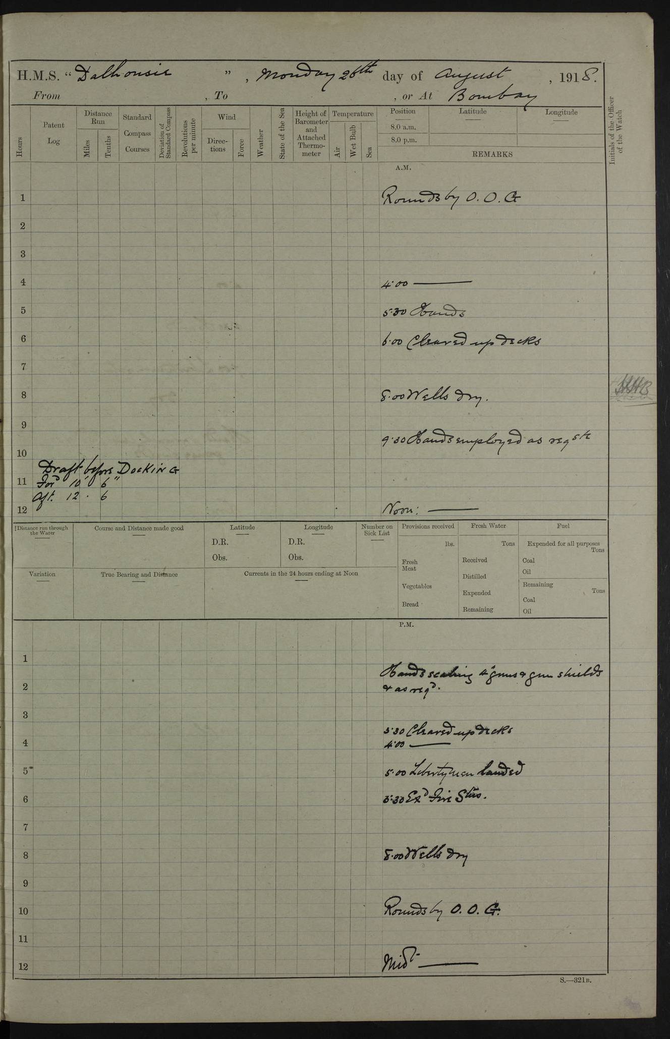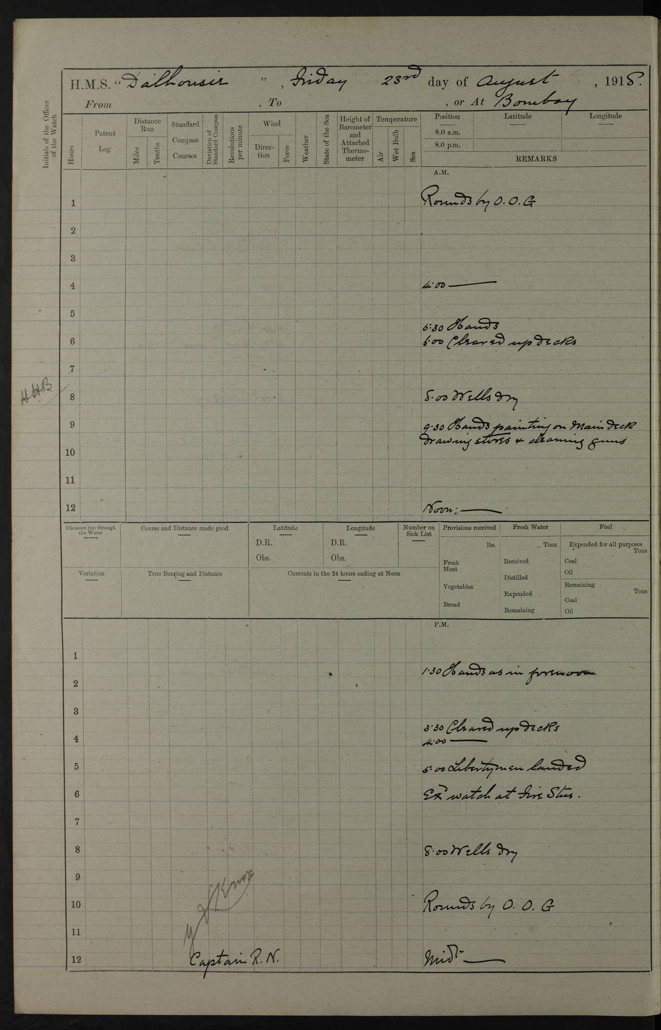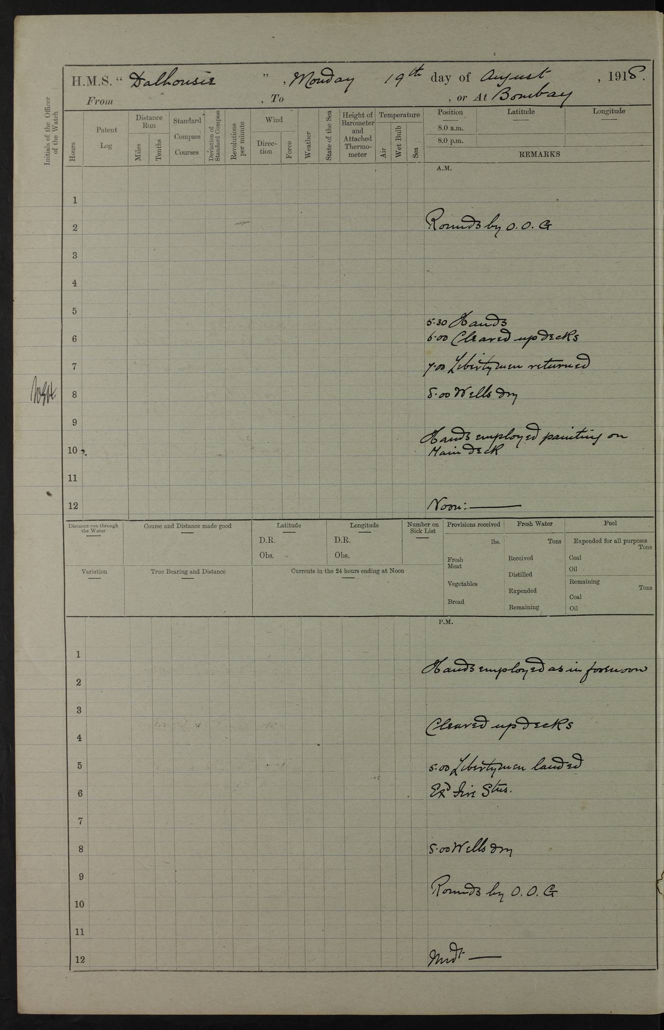 Notes: 1. Latitude/longitude, including for days in port, show representative decimal positions for each day, as calculated by the Old Weather project's analysis program. As such, they differ by varying amounts from the positions recorded, usually at noon, in the log pages. In addition, some latitudes/longitudes have been amended in edited logs for errors in the logs, for errors in identifying locations by the analysis program, or simply for greater accuracy. In all cases, refer to the log-page scans for the positions as originally recorded. Not all log pages contain this information and the ships' positions have therefore often been estimated. 2. Full account of any day is available by clicking on the link above that day. Groups of links refer to log book covers and introductory information; some may be blank. Editor’s notes: Where I have been able to research personnel, a ship, a place name, or other facts, I have placed underlined links in the narrative to help the reader find further information. As Dalhousie interacted with other ships I have tried to link to those ships for further research. I have linked most HMS to Wikipedia: http://en.wikipedia.org/wiki/List_of_ship_names_of_the_Royal_Navy. Some HMS logs are available at Log Book Home page. While many have been edited, some are still awaiting edit. ‘Log reset miles’ refers to the patent log – a rotored/propellered instrument towed behind the ship to measure distance travelled. Its ‘rotations' are frequently mentioned in the ship's logs as a means of determining speed. The patent log would be read and reset at intervals to determine how far the ship had travelled during a period of time. ‘Bower' refers to the anchors carried at the bow of the ship. The term Seedie is listed many times after crewmen’s names. Seedies and Kroomen (also Kroumen or Krumen) were African sailors recruited locally into the Royal Navy in the 19th and early 20th centuries. A more detailed reference may be found at: https://en.wikipedia.org/wiki/Seedies_and_Kroomen Many measurements will be mentioned in the logs such as ‘Cable, Fathom, Shackle, and Mile (Nautical Mile). Data can be found at: Imperial Measures of Length. There are several entries in the logs with the abbreviation S.B.C. My research indicates Signal Books Correct / Seen By Commander / Set Bridge Chronometer. The bridge chronometer would not have been the only chronometer on board but it was the critical piece and was intended to be checked by lunar or solar reading. The chronometer could be checked at noon by sextant sight but since the entries are at various times I have ‘standardised’ on Signal Books Correct unless otherwise noted. Follow the link for a list of all 142 ships met by R.I.M.S. Dalhousie in the period covered by the log-books, August 1916 to December 1918. |