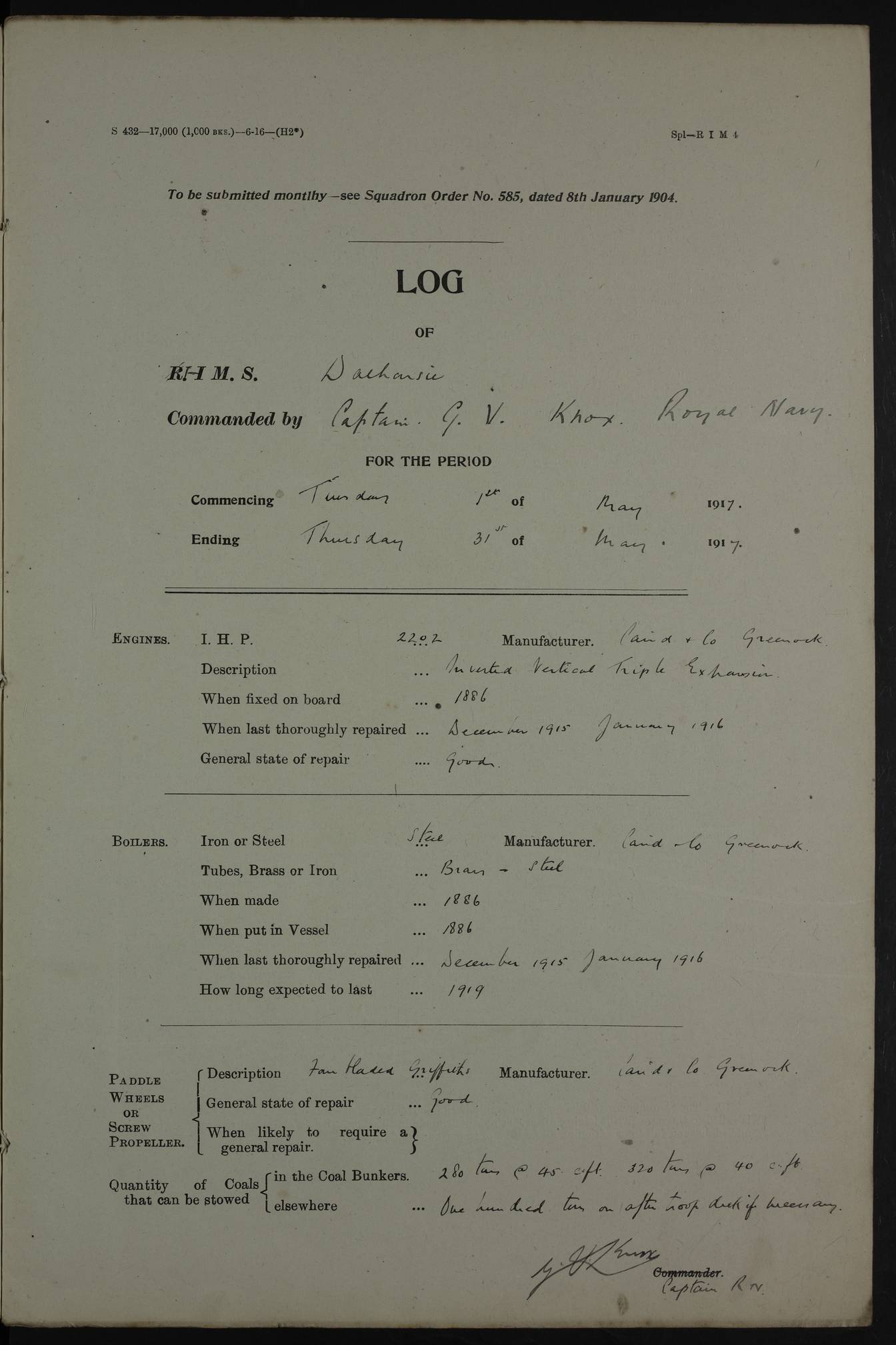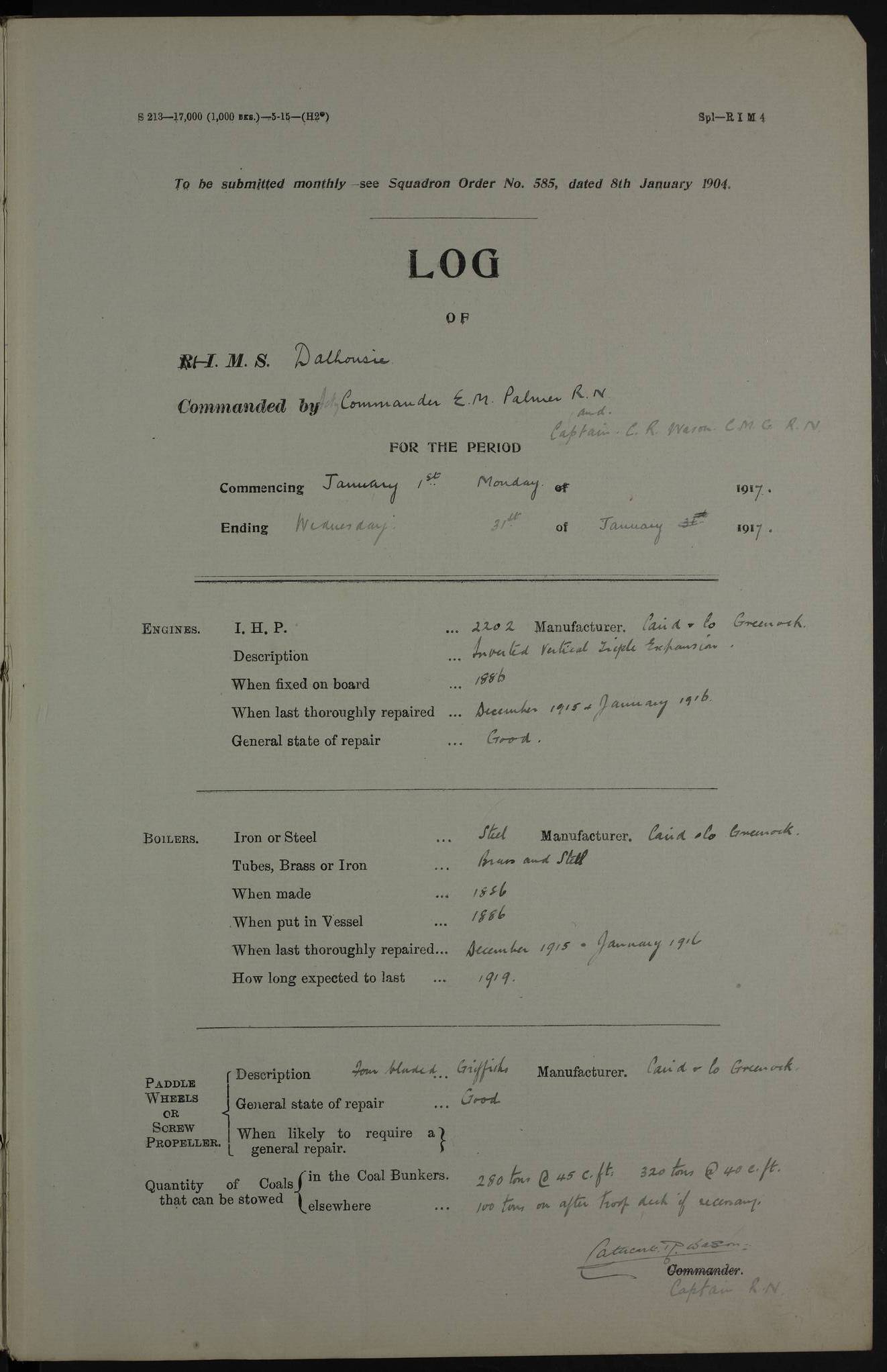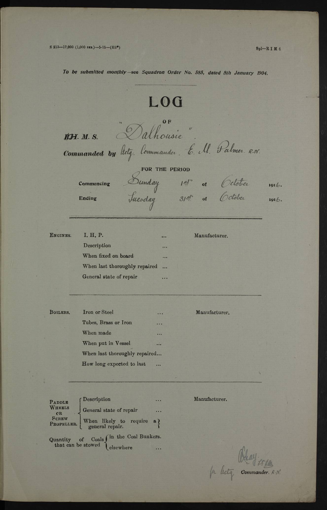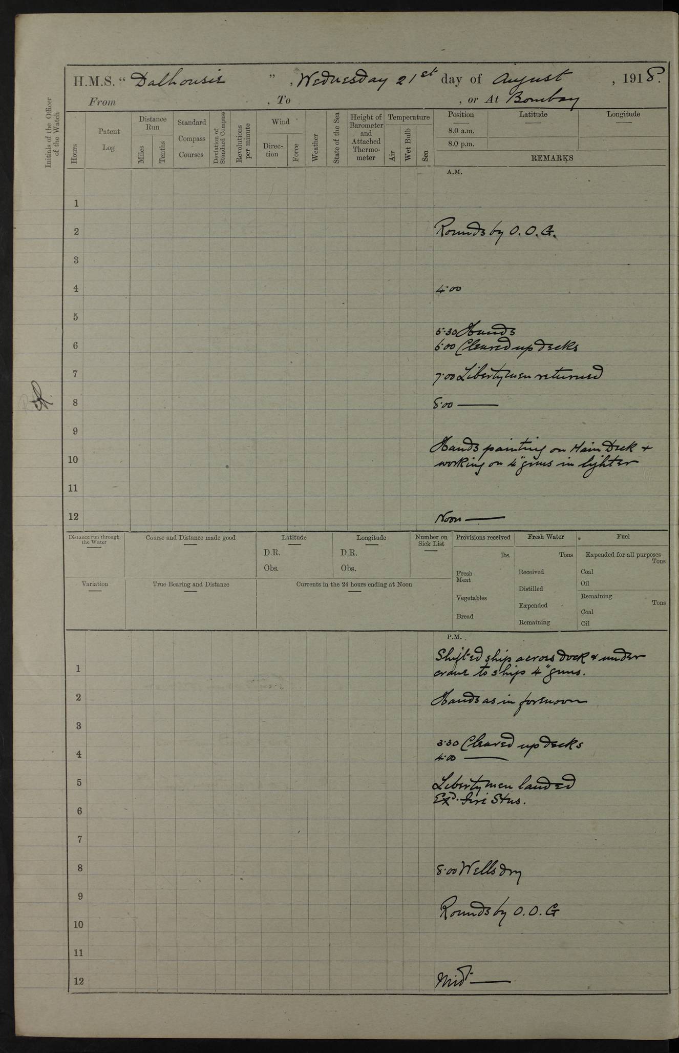 Notes: 1. Latitude/longitude, including for days in port, show representative decimal positions for each day, as calculated by the Old Weather project's analysis program. As such, they differ by varying amounts from the positions recorded, usually at noon, in the log pages. In addition, some latitudes/longitudes have been amended in edited logs for errors in the logs, for errors in identifying locations by the analysis program, or simply for greater accuracy. In all cases, refer to the log-page scans for the positions as originally recorded. Not all log pages contain this information and the ships' positions have therefore often been estimated. 2. Full account of any day is available by clicking on the link above that day. Groups of links refer to log book covers and introductory information; some may be blank. Editor’s notes: Where I have been able to research personnel, a ship, a place name, or other facts, I have placed underlined links in the narrative to help the reader find further information. As Dalhousie interacted with other ships I have tried to link to those ships for further research. I have linked most HMS to Wikipedia: http://en.wikipedia.org/wiki/List_of_ship_names_of_the_Royal_Navy. Some HMS logs are available at Log Book Home page. While many have been edited, some are still awaiting edit. ‘Log reset miles’ refers to the patent log – a rotored/propellered instrument towed behind the ship to measure distance travelled. Its ‘rotations' are frequently mentioned in the ship's logs as a means of determining speed. The patent log would be read and reset at intervals to determine how far the ship had travelled during a period of time. ‘Bower' refers to the anchors carried at the bow of the ship. The term Seedie is listed many times after crewmen’s names. Seedies and Kroomen (also Kroumen or Krumen) were African sailors recruited locally into the Royal Navy in the 19th and early 20th centuries. A more detailed reference may be found at: https://en.wikipedia.org/wiki/Seedies_and_Kroomen Many measurements will be mentioned in the logs such as ‘Cable, Fathom, Shackle, and Mile (Nautical Mile). Data can be found at: Imperial Measures of Length. There are several entries in the logs with the abbreviation S.B.C. My research indicates Signal Books Correct / Seen By Commander / Set Bridge Chronometer. The bridge chronometer would not have been the only chronometer on board but it was the critical piece and was intended to be checked by lunar or solar reading. The chronometer could be checked at noon by sextant sight but since the entries are at various times I have ‘standardised’ on Signal Books Correct unless otherwise noted. Follow the link for a list of all 142 ships met by R.I.M.S. Dalhousie in the period covered by the log-books, August 1916 to December 1918. |