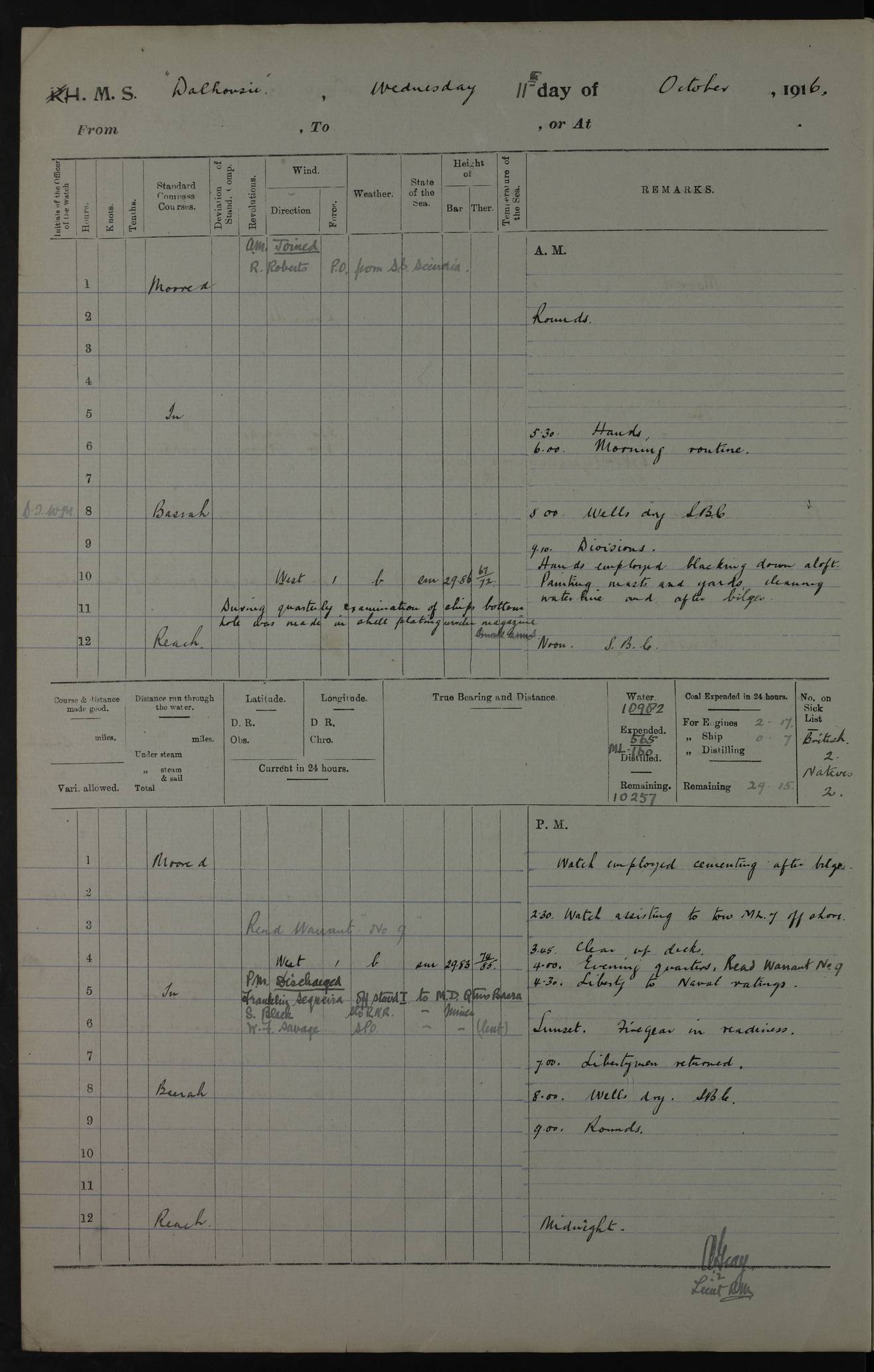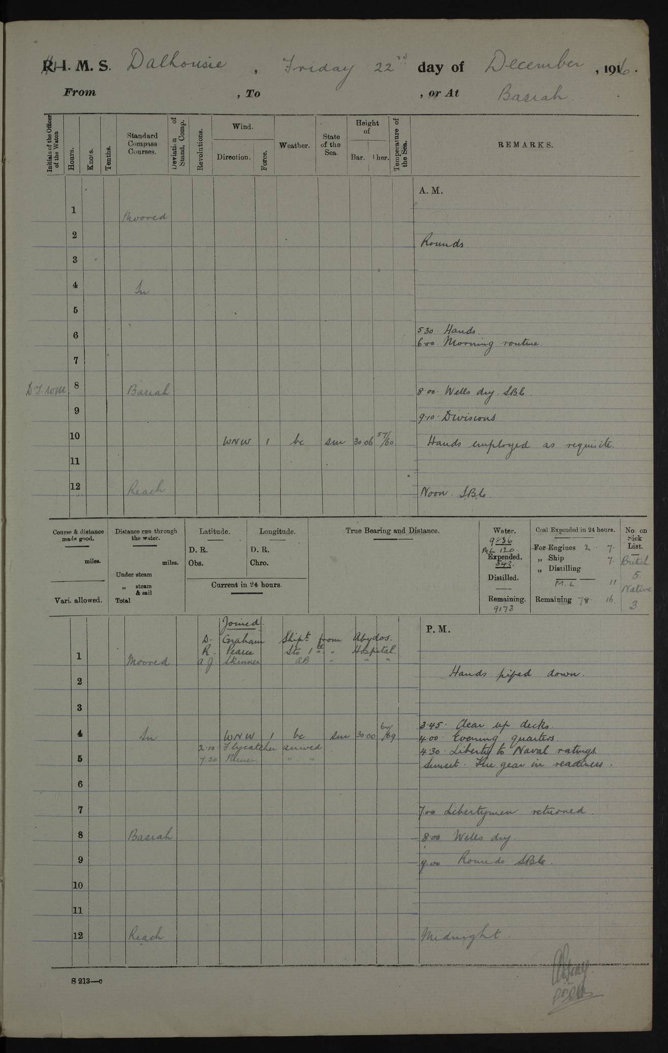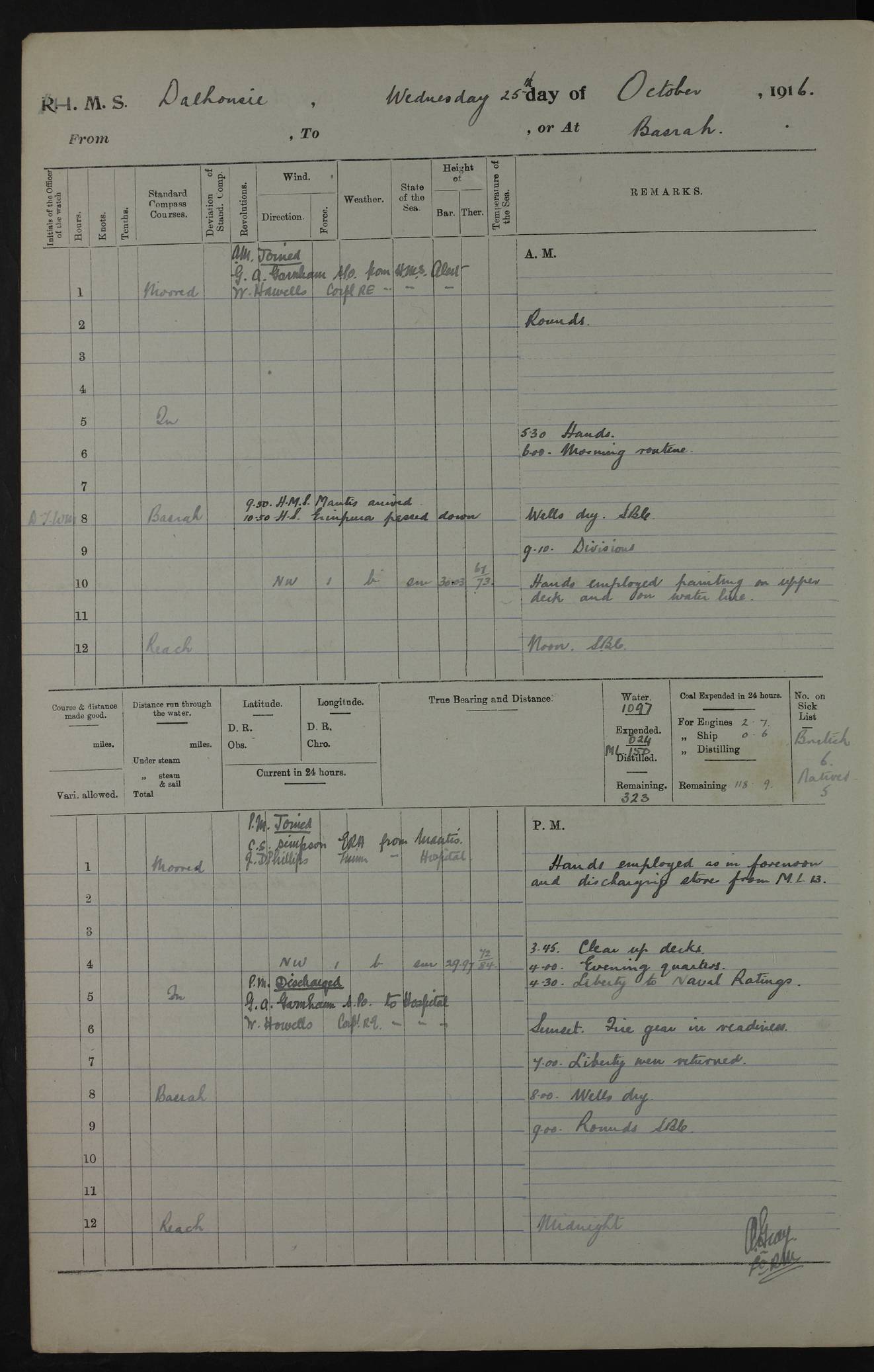 4ef4fa9fe53e0a0c91005725: (https://s3.amazonaws.com:443/oldweather/ADM53-39394/0008_1.jpg) 10 October 1916 Place: Basrah Lat 30.5269, Long 47.8407 2:00am: Rounds 5:30am: Hands 6:00am: Morning Routine 6:35am: FLYCATCHER arrive 7:05am: FLYCATCHER left and proceeded up river 8:00am: Wells dry - Ship’s Book Correct 9:10am: Divisions 10:00am: Hands employed painting down aloft 12:00pm: Ship’s Book Correct 2:00pm: Hands employed painting down aloft 3:45pm: Cleared up decks 4:00pm: Evening Quarters – Ship’s Book Correct 5:00pm: Liberty men to shore 6:00pm: Sunset - Fire Gear in readiness 7:00pm: Liberty men returned 8:00pm: Wells dry - Ship’s Book Correct 9:00pm: Rounds - Ship’s Book Correct AM – Joined From No. 3 Mess: TP Hughes, Ordinary seaman AM – Discharged TO FLYCATCHER for GRAYFLY: GE Booth, Boy Telegrapher PM – Joined From Hospital: S Black, Stoker Royal Navy Reserve – Massein, Seedie PM - Discharged To Hospital: A Ball, carpenter’s crew – TP Hughes, Ordinary seaman – Seedies: J Meyer – Adam Deriah – AG Massein – Noor Farch 4ef4fa9fe53e0a0c91005726: (https://s3.amazonaws.com:443/oldweather/ADM53-39394/0009_0.jpg) 11 October 1916 Place: Basrah Lat 30.5269, Long 47.8407 2:00am: Rounds 5:30am: Hands 6:00am: Morning Routine 8:00am: Wells dry - Ship’s Book Correct 9:10am: Divisions - Hands employed blacking down aloft, painting masts & Yards, cleaning waterline & after bilge 11:00am: During Quarterly examination of ship’s bottom hole was made in shell plating under magazine 12:00pm: Ship’s Book Correct 1:00pm: Watch employed cementing after bilge 2:30pm: Watch assisting tow of Motor Launch 7 off shore 3:45pm: Cleared up decks 4:00pm: Evening Quarters – Read Warrant No. 9 4:45pm: Liberty to Naval Ratings 6:00pm: Sunset - Fire Gear in readiness 7:00pm: Liberty men returned 8:00pm: Wells dry - Ship’s Book Correct 9:00pm: Rounds - Ship’s Book Correct AM – Joined From SS SCINDIA: R Roberts, Petty Officer PM - Discharged To Military Depot Quarters Basrah: Franklin Sequeira, Officer Steward 1st Class To MINER: S Black, Stoker Royal Navy Reserve – WF Savage, Senior Petty Officer 4ef4fa9fe53e0a0c91005727: (https://s3.amazonaws.com:443/oldweather/ADM53-39394/0009_1.jpg) 12 October 1916 Place: Basrah Lat 30.5269, Long 47.8407 2:00am: Rounds 5:30am: Hands 6:00am: Morning Routine 8:00am: Wells dry - Ship’s Book Correct 9:10am: Divisions - Hands employed cleaning after bilges, working on steamboat’s boiler, & on ship’s waterline 12:00pm: Ship’s Book Correct 1:00pm: Issued Quinine to Naval Ratings 2:00pm: Issued Quinine to native Ratings 3:00pm: Watch of Lascars to shore 3:30pm: Hospital Ship BARALA passed up 3:45pm: Cleared up decks 4:00pm: Hospital Ship ELORA passed up - Evening Quarters – Ship’s Book Correct 4:45pm: Liberty to Naval Ratings 6:00pm: Sunset - Fire Gear in readiness 7:00pm: Liberty men returned 8:00pm: Wells dry - Ship’s Book Correct 9:00pm: Rounds – Ship’s Book Correct 10:05pm: HMS FLYCATCHER arrived 11:00pm: Destroyed 8 tins milk, 2 pounds coffee, 7 tins tobacco being unfit for use. AM – Joined From Motor Launch 6: A Smith, Deckhand From SS ARANKOLA: RG Robinson PM - Discharged To Hospital: Ali Essa, Seedie To Motor Launch 6: A Smith, Deckhand 4ef4faa0e53e0a0c91005728: (https://s3.amazonaws.com:443/oldweather/ADM53-39394/0010_0.jpg) 13 October 1916 Place: Basrah Lat 30.5269, Long 47.8407 2:00am: Rounds 5:30am: Hands 6:00am: Morning Routine 8:00am: Wells dry - Ship’s Book Correct 9:10am: Divisions - Hands employed oiling wire hawser, cleaning out tank room, & cementing bilges 12:00pm: Ship’s Book Correct 1:30pm: Hospital Ship VARIDA passed up 2:00pm: Hands employed as in forenoon, & painting out Officers’ cabins 3:45pm: Cleared up decks 4:00pm: Evening Quarters – Ship’s Book Correct 4:45pm: Liberty to Naval Ratings 6:00pm: Sunset - Fire Gear in readiness 7:00pm: Liberty men returned 8:00pm: Wells dry - Ship’s Book Correct 9:00pm: Rounds - Ship’s Book Correct AM – Joined From No. 2 Mess: W Burnett, Leading Seaman From Hospital: EH Humphreys, Lieutenant Royal Navy Reserve PM – Joined From Motor Launch 6: R Heslop, Trimmer PM - Discharged To Hospital: Ali Ega, Seedie – Ali Hassan, Seedie To MANTIS: W May, Able Seaman No. 14 A Sheik Essadr Ami, Lascar 1st – invalided & sent to Bombay. 4ef4faa0e53e0a0c91005729: (https://s3.amazonaws.com:443/oldweather/ADM53-39394/0010_1.jpg) 14 October 1916 Place: Basrah Lat 30.5269, Long 47.8407 2:00am: Rounds 5:30am: Hands 6:00am: Morning Routine 7:00am: Exercised fire Stations 8:00am: Wells dry - Ship’s Book Correct 10:00am: Hands cleaning ship 12:00pm: Ship’s Book Correct 3:45pm: Cleared up decks 4:00pm: Evening Quarters – Ship’s Book Correct 4:45pm: Liberty to Naval Ratings 6:00pm: Sunset - Fire Gear in readiness 7:00pm: Liberty men returned 8:00pm: Wells dry - Ship’s Book Correct 9:00pm: Rounds - Ship’s Book Correct AM – Joined From ALERT: E Phillips, Plumber – D Graham, Shipwright 2nd From Hospital: Juma Myer, Seedie PM – Joined From Shore: Autom De Costa, Officer’s Steward – Binidad Durada, Cook PM - Discharged To Hospital: Hassan Mahomed, Seedie – Ismail Warsuma, Seedie – R Heslop, Trimmer 4ef4faa0e53e0a0c9100572a: (https://s3.amazonaws.com:443/oldweather/ADM53-39394/0011_0.jpg) 15 October 1916 Place: Basrah Lat 30.5269, Long 47.8407 2:00am: Rounds 5:30am: Hands 6:00am: Morning Routine 6:40am: Church of England Church party landed 7:30am:Roman Catholic Church party landed 7:40am: Church of England party returned 8:00am: Wells dry – Ship’s Book Correct 8:40am: Roman Catholic party returned 9:45am: Divisions – Liberty to Watch of Lascars 12:00pm: Ship’s Book Correct 1:00pm: Issued Quinine to naval Ratings 2:00pm: Issued Quinine to Native Ratings 3:45pm: Cleared up decks 4:00pm: Evening Quarters 4:30pm: Hospital Ship VARSOVA passed up 4:45pm: Liberty to Naval Ratings 6:00pm: Sunset - Fire Gear in readiness 7:00pm: Liberty men return