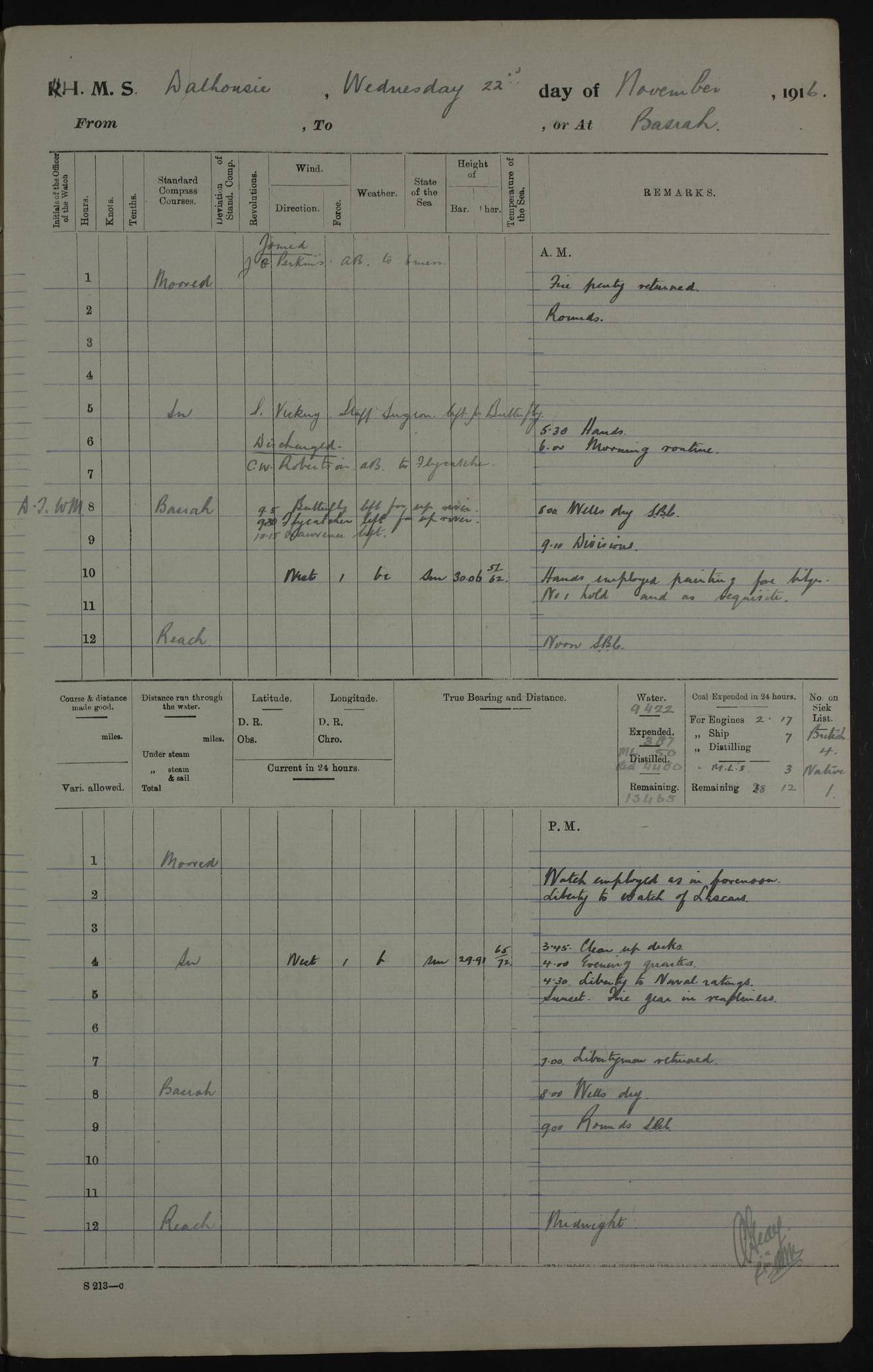 4ef4faa1e53e0a0c91005733: (https://s3.amazonaws.com:443/oldweather/ADM53-39394/0015_1.jpg) 24 October 1916 Place: Basrah Lat 30.5269, Long 47.8407 2:00am: Rounds 5:30am: Hands 6:00am: Morning Routine 8:00am: Wells dry - Ship’s Book Correct 9:10am: Divisions 9:50am: HMS FLYCATCHER proceeded up river 10:00am: Hands employed painting ship’s side & as requisite 12:00pm: Ship’s Book Correct 2:00pm: Hands employed as in forenoon 2:20pm: Hospital Ship ERINPURA passed up 3:45pm: Cleared up decks 4:00pm: Evening Quarters – Ship’s Book Correct 4:30pm: Liberty to Naval Ratings 6:00pm: Sunset - Fire Gear in readiness 7:00pm: Liberty men returned 8:00pm: Wells dry – Ship’s Book Correct 8:30pm: HMS FLYCATCHER arrived 9:00pm: Rounds - Ship’s Book Correct AM – Joined From Mess 2: HR Morgan Ordinary Seaman PM – Joined From SS TORILLA: J Grayson, Signalman - F Kelly Royal Navy Volunteer Reserve PM - Discharged To Hospital: WG Cox, Ordinary Seaman 4ef4faa2e53e0a0c91005734: (https://s3.amazonaws.com:443/oldweather/ADM53-39394/0016_0.jpg) 25 October 1916 Place: Basrah Lat 30.5269, Long 47.8407 2:00am: Rounds 5:30am: Hands 6:00am: Morning Routine 8:00am: Wells dry - Ship’s Book Correct 9:10am: Divisions 9:50am: HMS MANTIS arrived 10:00am: Hands employed painting on upper deck & on water line 10:50am: Hospital Ship ERINPURA passed down 12:00pm: Ship’s Book Correct 2:00pm: Hands employed as in forenoon & discharging stores from Motor Launch 13 3:45pm: Cleared up decks 4:00pm: Evening Quarters – Ship’s Book Correct 4:30pm: Liberty to Naval Ratings 6:00pm: Sunset - Fire Gear in readiness 7:00pm: Liberty men returned 8:00pm: Wells dry - Ship’s Book Correct 9:00pm: Rounds - Ship’s Book Correct AM – Joined From ALERT: GA Garnham, Stoker Petty Officer – W Howells Corporal Royal Engineer PM – Joined From MANTIS: CS Simpson, Engine Room Artificer From Hospital: JD Phillips, Trimmer PM - Discharged To Hospital: GA Garnham Stoker Petty Officer – W Howells, Corporal Royal Engineer 4ef4faa2e53e0a0c91005735: (https://s3.amazonaws.com:443/oldweather/ADM53-39394/0016_1.jpg) 26 October 1916 Place: Basrah Lat 30.5269, Long 47.8407 2:00am: Rounds 5:30am: Hands 6:00am: Morning Routine 8:00am: Wells dry - Ship’s Book Correct 9:10am: Divisions 9:30am: Watch of Lascars to shore 10:00am: Hands employed painting & repairing awnings 12:00pm: Ship’s Book Correct 1:00pm: Quinine issued to Naval Ratings – Hands employed as in forenoon & cementing water tanks 2:00pm: Quinine issued to Native Ratings 3:45pm: Cleared up decks 4:00pm: Evening Quarters – Ship’s Book Correct 4:30pm: Liberty to Naval Ratings 6:00pm: Sunset - Fire Gear in readiness 7:00pm: Liberty men returned 8:00pm: Wells dry - Ship’s Book Correct 9:00pm: Rounds - Ship’s Book Correct AM – Joined From Motor Launch 14: T Lerny, Trimmer From Motor Launch 10: A Roberts, Petty Officer PM – Joined From Hospital: Merco Vretemitchich, Officer’s Steward – A Bruce, Petty Officer Telegrapher – R Heslop, Trimmer – G Funey, Stoker Royal Navy Reserve From MANTIS: W May, Able Seaman – CS Cook, Able Seaman From Motor Launch 3: WJ Evans, Stoker Royal Navy Reserve PM - Discharged To Hospital: CS Cook, Able Seaman – HR Morgan, Ordinary Seaman – G Lawrence, 2nd Hand – GW Harrison, Seaman Royal Navy Reserve – T Lerney, Trimmer To Motor Launch 3: WJ Evans, Stoker Royal Navy Reserve 4ef4faa2e53e0a0c91005736: (https://s3.amazonaws.com:443/oldweather/ADM53-39394/0017_0.jpg) 27 October 1916 Place: Basrah Lat 30.5269, Long 47.8407 2:00am: Rounds 5:30am: Hands 6:00am: Morning Routine 7:15am: Hospital Ship ERINPURA passed up 8:00am: Wells dry - Ship’s Book Correct 9:10am: Divisions 10:00am: Hands employed repairing awnings, painting out Forepeak & painting in upper deck 12:00pm: Ship’s Book Correct 2:00pm: Hands employed as in forenoon 3:42pm: HMS PROSERPINE arrived 3:45pm: Cleared up decks 3:55pm: Hospital Ship ERINPURA passed down 4:00pm: Evening Quarters – Ship’s Book Correct 4:30pm: Liberty to Naval Ratings 6:00pm: Sunset - Fire Gear in readiness 7:00pm: Liberty men returned 8:00pm: Wells dry - Ship’s Book Correct 9:00pm: Rounds - Ship’s Book Correct AM – Joined From Passage: AH Price – RG Ehwell – EC deM Morgan – Temporary Surgeons PM – Joined From CHAKALA: 1 Chief Engine Room Artificer – 3 Engine Room Artificer - 1 Petty Officers – 1 Leading Seaman – 2 Leading Stoker – 1 Stoker 1 – 11 Stoker – 3 Able Seaman– 1 Signalman Australian Naval Volunteer Reserve – 3 Carpenter’s Crew From PROSERPINE: 1 Petty Officer – 1 Seaman Royal Navy Reserve – 1 Trimmer PM - Discharged To Motor Launch 4: J Taney, Stoker Royal Navy Reserve 4ef4faa2e53e0a0c91005737: (https://s3.amazonaws.com:443/oldweather/ADM53-39394/0017_1.jpg) 28 October 1916 Place: Basrah Lat 30.5269, Long 47.8407 2:00am: Rounds 5:30am: Hands 6:00am: Morning Routine 7:50am: Hospital Ship TAKADA passed up 8:00am: Wells dry - Ship’s Book Correct 9:10am: Divisions 10:00am: Saturday Routine 12:00pm: Ship’s Book Correct 2:00pm: Hands employed discharging stores & as requisite 3:45pm: Cleared up decks 4:00pm: Evening Quarters – Ship’s Book Correct 4:30pm: Liberty to Naval Ratings 6:00pm: Sunset - Fire Gear in readiness 7:00pm: Liberty men returned 7:40pm: Motor Launch SCOTIA in collision with No. 1 Cutter making hole in starboard quarter 7:45pm: Hoisted No. 1 Cutter 8:00pm: Wells dry - Ship’s Book Correct 9:00pm: Rounds - Ship’s Book Correct AM – Joined From PROSERPINE: AM Miller, Carpenter’s crew PM – Joined From Hospital: J McCaw, Engine Room Artificer From Motor Launch 3: HG Shaw, Chief Stoker PM - Discharged To Hospital: F Dubbler, Leading Stoker – J Phillips, Able Seaman To MINER: J Grayson, Signalman To MANTIS: W May, Able Seaman To MANTIS for GADFLY: D McDonald, Seaman Royal Navy Reserve – R McNeil, Seaman Royal Navy Reserve – A Gilbert, Able Seaman To SS OZARDA: Moreo Vretenitchich, Officer’s steward 4ef4faa