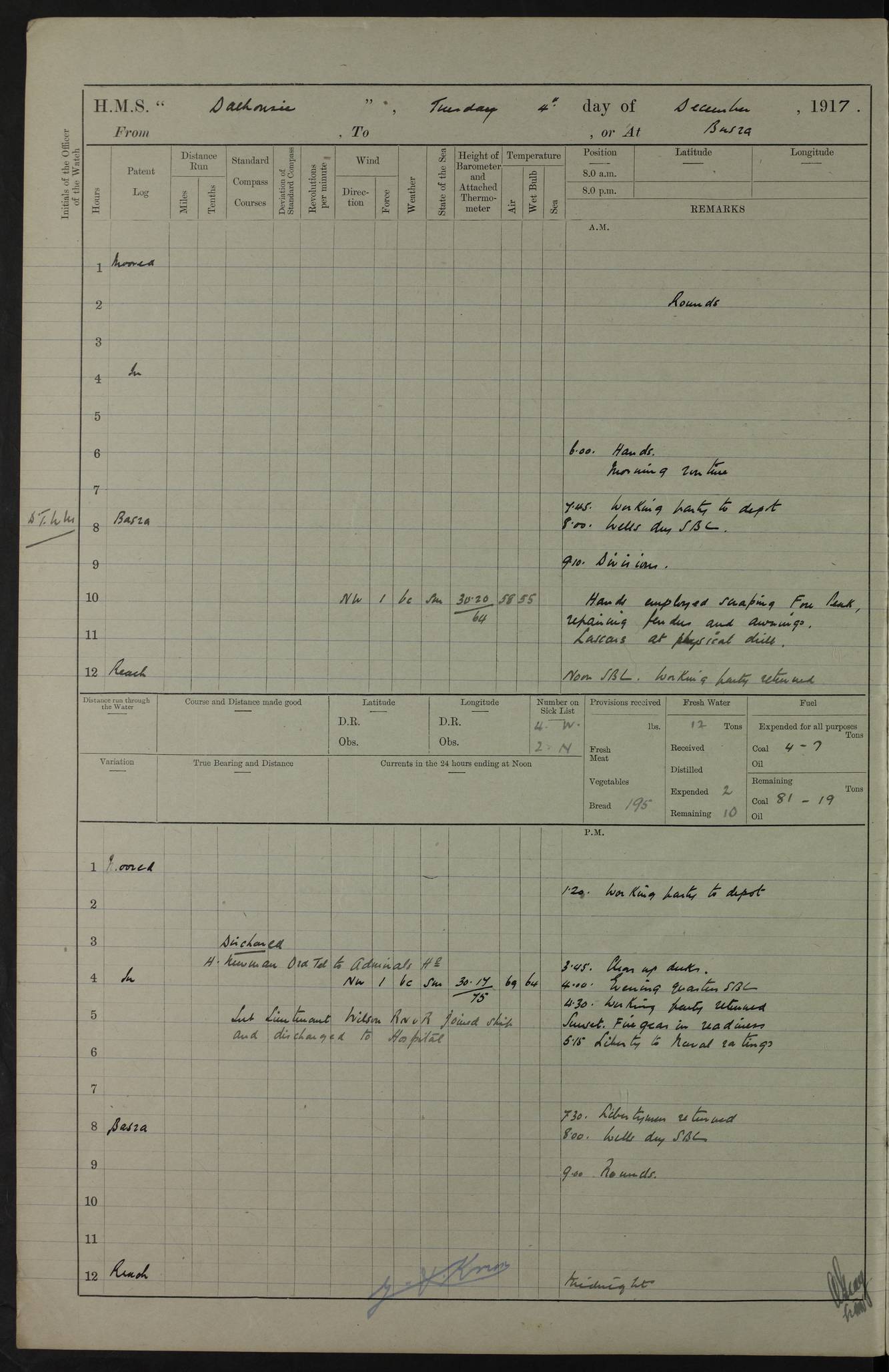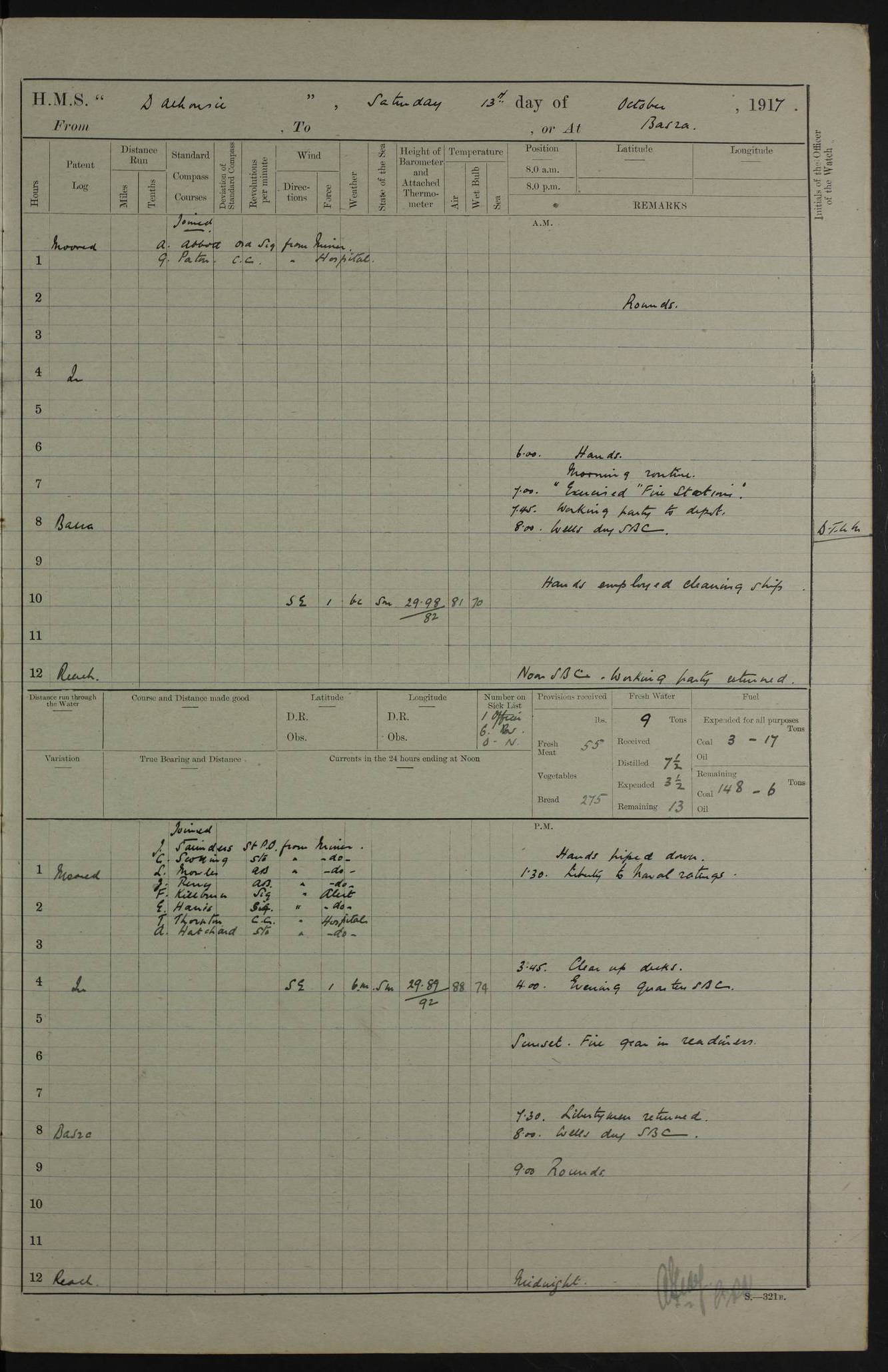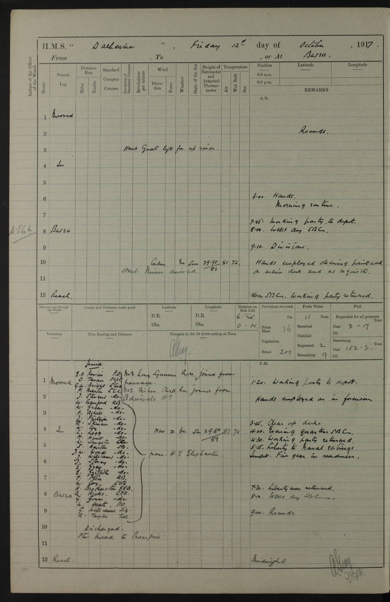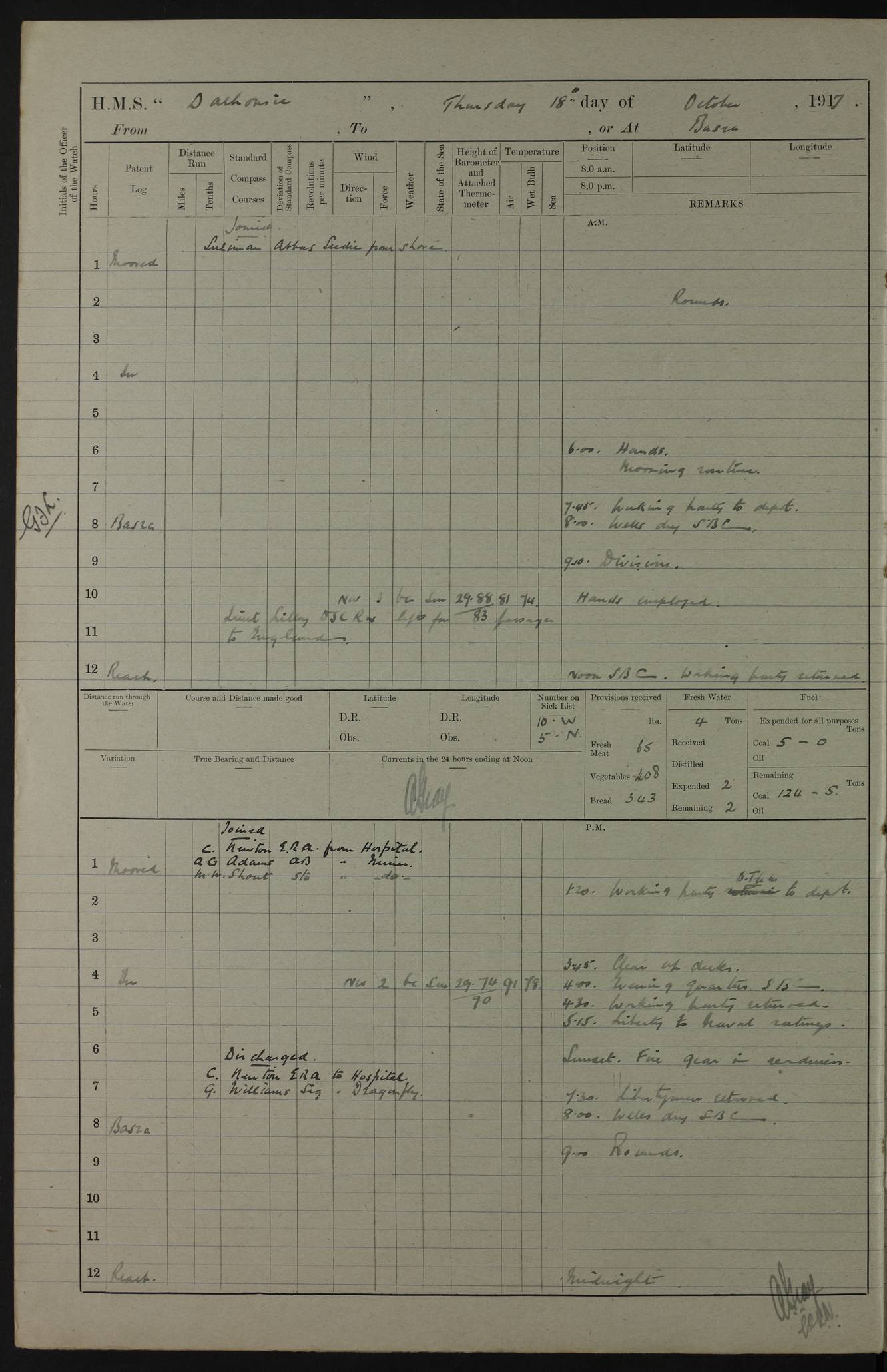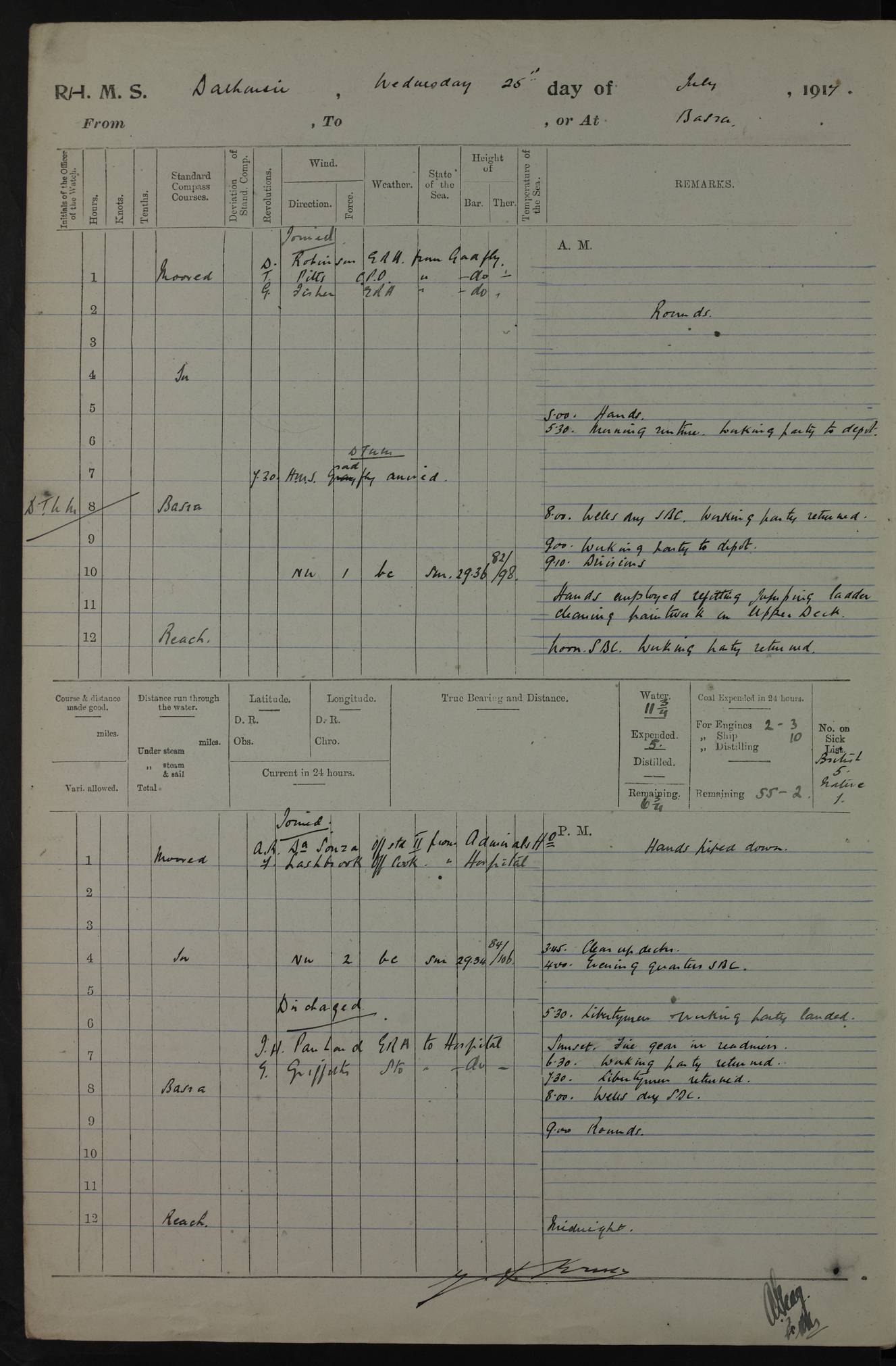 4ef4fafae53e0a0c91005922: (https://s3.amazonaws.com:443/oldweather/ADM53-39406/0008_0.jpg) 12 October 1917 Place: Basrah Lat 30.5269, Long 47.8407 2:00am: Rounds 3:00am: HMS GNAT left for up river 6:00am: Hands - Morning Routine 7:45am: Working party to Depot 8:00am: Wells dry - Signal Books correct 9:10am: Divisions 10:00am: Hands employed cleaning paintwork on Main Deck & as requisite 10:30am: MINER arrived 12:00pm: Signal Books correct – Working party returned 1:20pm: Working party to depot 2:00pm: Hands employed as in forenoon 3:45pm: Cleared up decks 4:00pm: Evening Quarters – Signal Books correct 4:30pm: Working party returned 5:15pm: Liberty to Naval Ratings 6:00pm: Sunset - Fire Gear in readiness 7:30pm: Liberty men returned 8:00pm: Wells dry - Signal Books correct 9:00pm: Rounds – Signal Books correct PM – Joined From Passage: Mr. Long, Gunner Royal Indian Marine From Admiral’s House: Mr Hicks, Clerk Royal Navy From ELEPHANTA: E.H. Ravine,Petty Officer - C Tavener Shipwright - G.W. Bright, Leading Seaman - F Martin, Leading Carpenter's Crew - J Stevens,Leading Carpenter's Crew - W Crawford, Able Seaman - W Green, Able Seaman - F Askell, Able Seaman - J Phillips, Able Seaman - A Skinner, Able Seaman - W Cox, Able Seaman - C Legg, Able Seaman- H Hunt, Able Seaman- W Sangston, Carpenter's Crew - S Newton, Stoker - J.W. Woods, Stoker - J Williams, Stoker - J Storey, Stoker - E Gray, Stoker - E Griffiths, Stoker- T Prin, Able Seaman - W Cox, Leading Stoker - H Brockerston, Engine Room Artificer - A Hicks, Chief Petty Officer - G Gomes, Chief Petty Officer – W Heath. Petty Officer - G Williams, Signalman - A Taylor Telegrapher PM - Discharged To PROSERPINE: Mead, Private Royal Marines Light Infantry 4ef4fafae53e0a0c91005923: (https://s3.amazonaws.com:443/oldweather/ADM53-39406/0008_1.jpg) 13 October 1917 Place: Basrah Lat 30.5269, Long 47.8407 2:00am: Rounds 6:00am: Hands - Morning Routine 7:00am: Exercised Fire Stations 7:45am: Working party to Depot 8:00am: Wells dry - Signal Books correct 9:10am: Divisions 10:00am: Hands employed cleaning ship 12:00pm: Signal Books correct – Working party returned 1:00pm: Hands piped down 1:30pm: Liberty to Naval Ratings 3:45pm: Cleared up decks 4:00pm: Evening Quarters – Signal Books correct 6:00pm: Sunset - Fire Gear in readiness 7:30pm: Liberty men returned 8:00pm: Wells dry - Signal Books correct 9:00pm: Rounds – Signal Books correct AM – Joined From MINER: A Abbott, Ordinary Seaman From Hospital: G Paton, CXX PM – Joined From MINER: J Sarinders, Stoker Petty Officer - C Scotting, Stoker - L Mowles, Able Seaman - J Perry, Able Seaman From ALERT: F Killburn, Signalman - E Harris, Signalman From Hospital: T Thornton , Carpenter's Crew - A Hatchard, Stoker 4ef4fafae53e0a0c91005924: (https://s3.amazonaws.com:443/oldweather/ADM53-39406/0009_0.jpg) 14 October 1917 Place: Basrah Lat 30.5269, Long 47.8407 2:00am: Rounds 5:30am: Hands 6:00am: Morning Routine 6:50am: Roman Catholic Church party landed 7:30am: Working party to Depot 8:00am: Wells dry – Signal Books correct – Roman Catholics returned 8:30am: Church of England party to PROSERPINE 8:45am: Wesleyans landed 9:40am: Church of England parties returned - Divisions 10:30am: Liberty to Lascars 11:00am: Wesleyans returned 12:00pm: Signal Books correct – Working party returned 1:30pm: Liberty to Naval ratings 3:45pm: Cleared up decks 4:00pm: Evening Quarters – Signal Books correct 6:00pm: Sunset - Fire Gear in readiness 7:30pm: Liberty men returned 8:00pm: Wells dry - Signal Books correct 9:00pm: Rounds – Signal Books correct AM – Discharged To Leave: D Azendo, Officer’s Clerk - Saliman Hassan, Tindal To Admiral’s House: Mahomed Soban, Seedie PM - Discharged To FIREFLY: J Saunders, Stoker Petty Officer - A Hicks, Chief Petty Officer To Admiral’s House: J Chalk, Leading Seaman 4ef4fafae53e0a0c91005925: (https://s3.amazonaws.com:443/oldweather/ADM53-39406/0009_1.jpg) 15 October 1917 Place: Basrah Lat 30.5269, Long 47.8407 2:00am: Rounds 6:00am: Hands - Morning Routine 7:45am: Working party to Depot 8:00am: Wells dry - Signal Books correct 9:10am: Divisions 10:00am: Hands employed reeving new Cutter’s Falls & as requisite 12:00pm: Signal Books correct – Working party returned 1:00pm: Hands piped down 1:30pm: Liberty to Naval Ratings 3:45pm: Cleared up decks 4:00pm: Evening Quarters – Signal Books correct 5:15pm: Liberty to Naval Ratings 6:00pm: Sunset - Fire Gear in readiness 7:30pm: Liberty men returned 8:00pm: Wells dry - Signal Books correct 9:00pm: Rounds – Signal Books correct AM – Joined For Passage to England: G Wilson Lieutenant Commander, Royal Navy PM – Joined From Hospital: S.G. Knight, Able Seaman- T Doolan, Petty Officer PM - Discharged To Admiral’s House: J Kinnear, Writer 1st 4ef4fafbe53e0a0c91005926: (https://s3.amazonaws.com:443/oldweather/ADM53-39406/0010_0.jpg) 16 October 1917 Place: Basrah Lat 30.5269, Long 47.8407 2:00am: Rounds 6:00am: Hands - Morning Routine 7:45am: Working party to Depot 8:00am: Wells dry - Signal Books correct 9:10am: Divisions 10:00am: Hands employed as requisite 12:00pm: Signal Books correct – Working party returned 1:30pm: Working party to Depot 3:45pm: Cleared up decks 4:00pm: Evening Quarters – Signal Books correct 4:30pm: Working party returned 6:00pm: Sunset - Fire Gear in readiness 7:30pm: Liberty men returned 8:00pm: Wells dry - Signal Books correct 9:00pm: Rounds – Signal Books correct PM – Joined From Hospital: J Young, Engine Room Artificer From DRAGONFLY: R Hotten, Engine Room Artificer From Patrol Steamer 59: H Peckham, Seaman Royal Navy Reserve - M Murray, Seaman Royal Navy Reserve PM - Discharged To DRAGONFLY: H Brotherton, Engine Room Artificer 4ef4fafbe53e0a0c91005927: (https://s3.amazonaws.com:443/oldweather/ADM53-39406/0010_1.jpg) 17 October 1917 Place: Basrah Lat 30.5269, Long 47.8407 2:00am: Rounds 6:00am: Hands - Morning Routine 7:45am: Working party to Depot 8:00am: Wells dry -