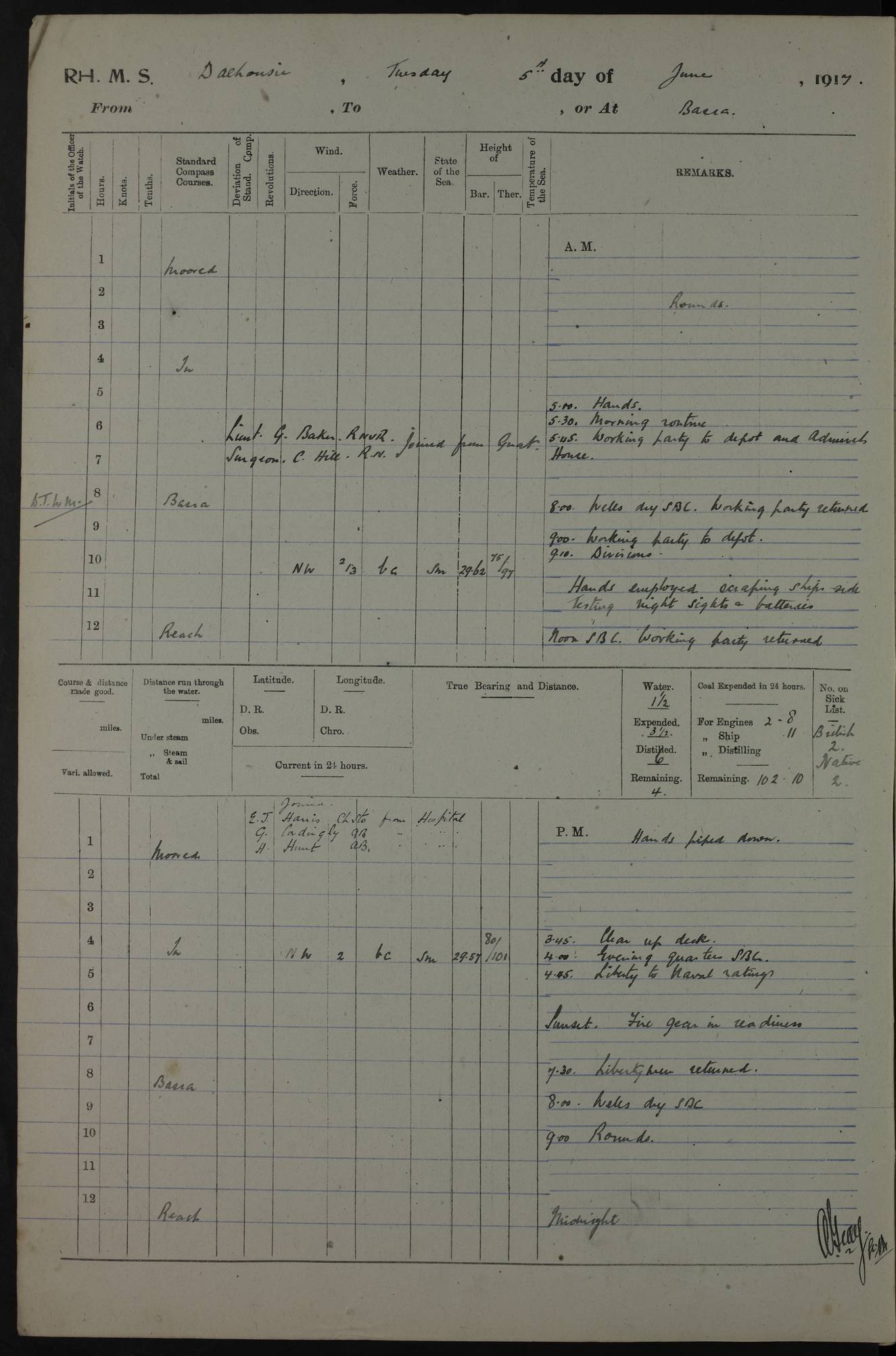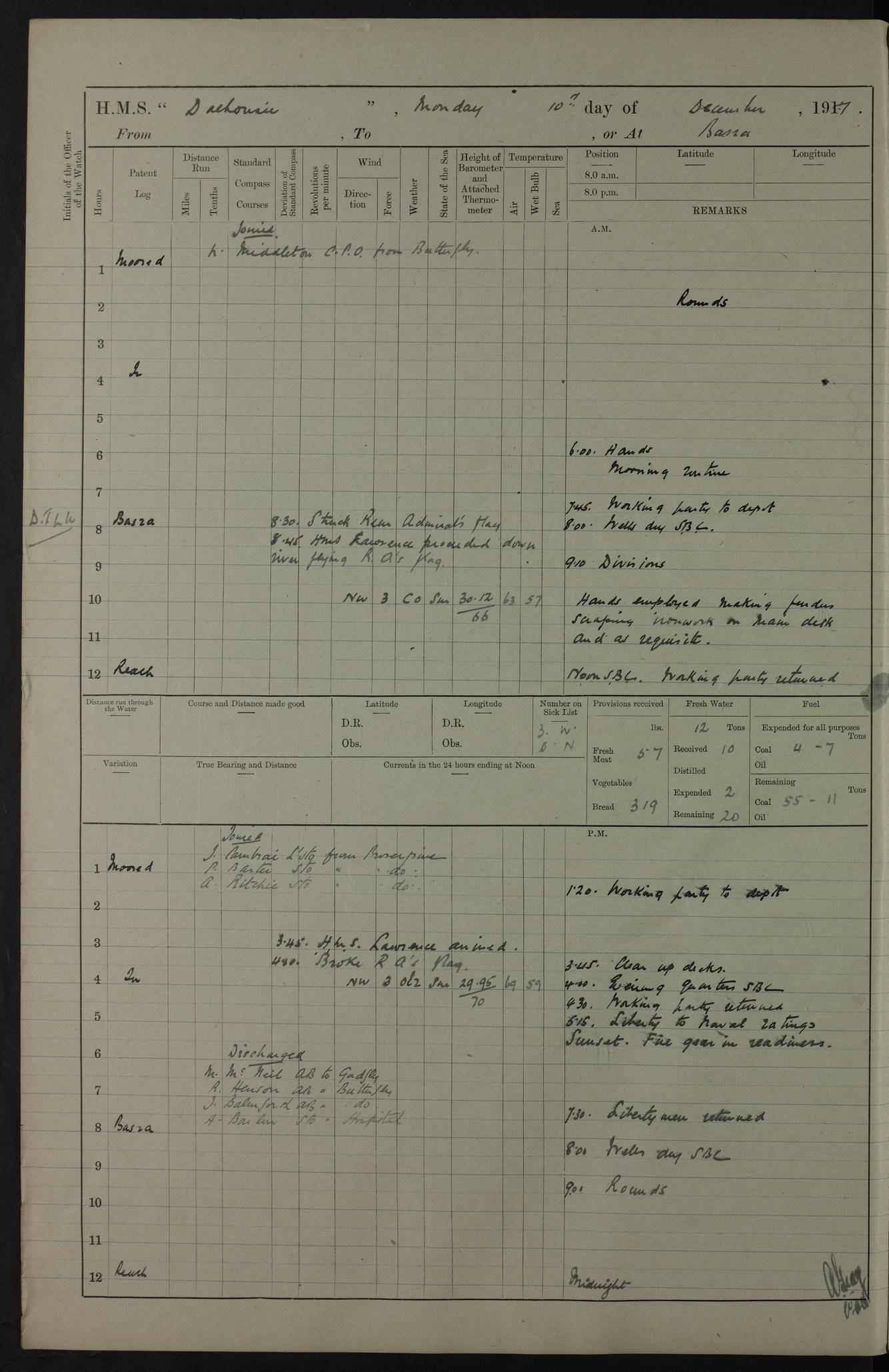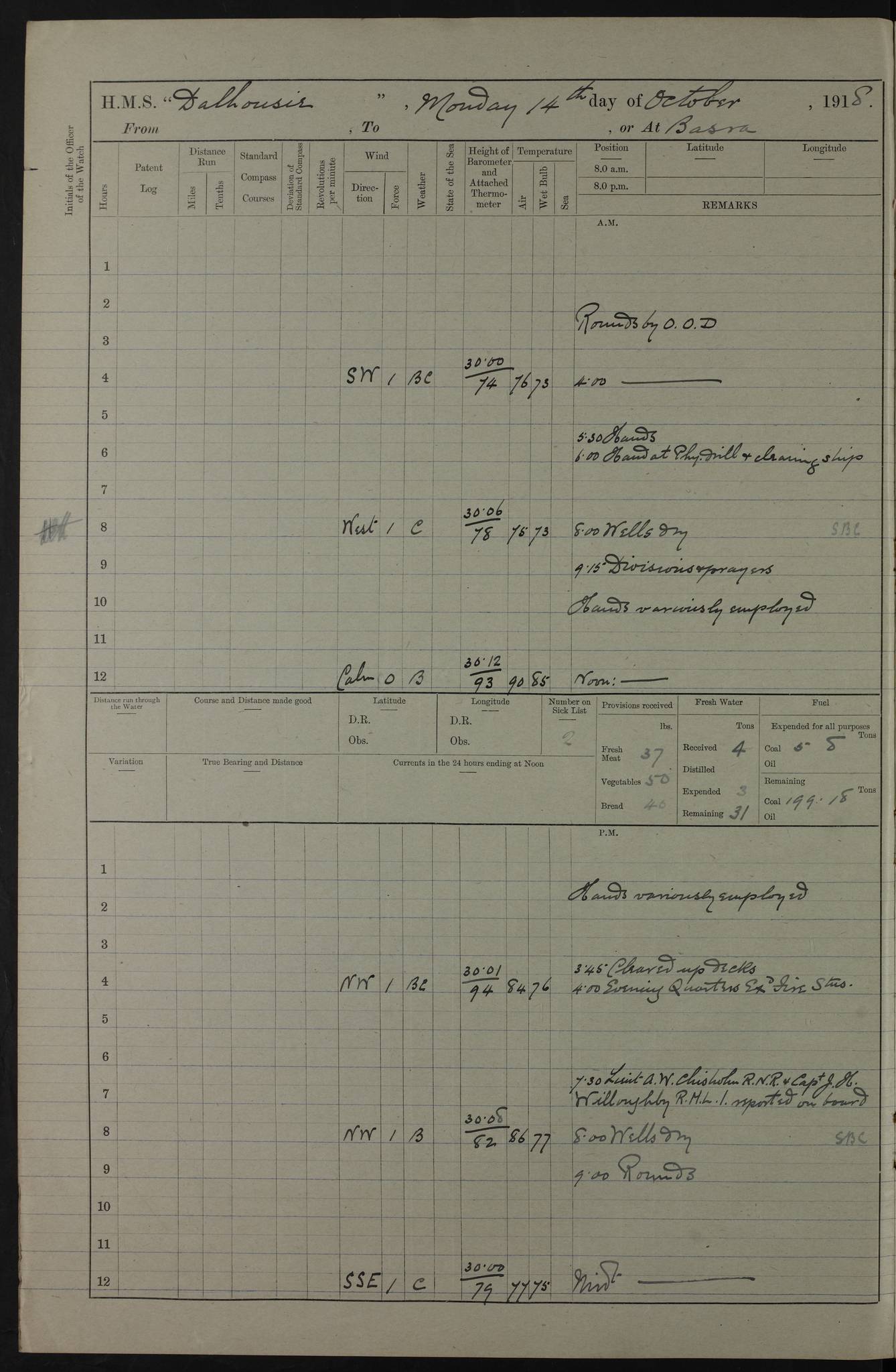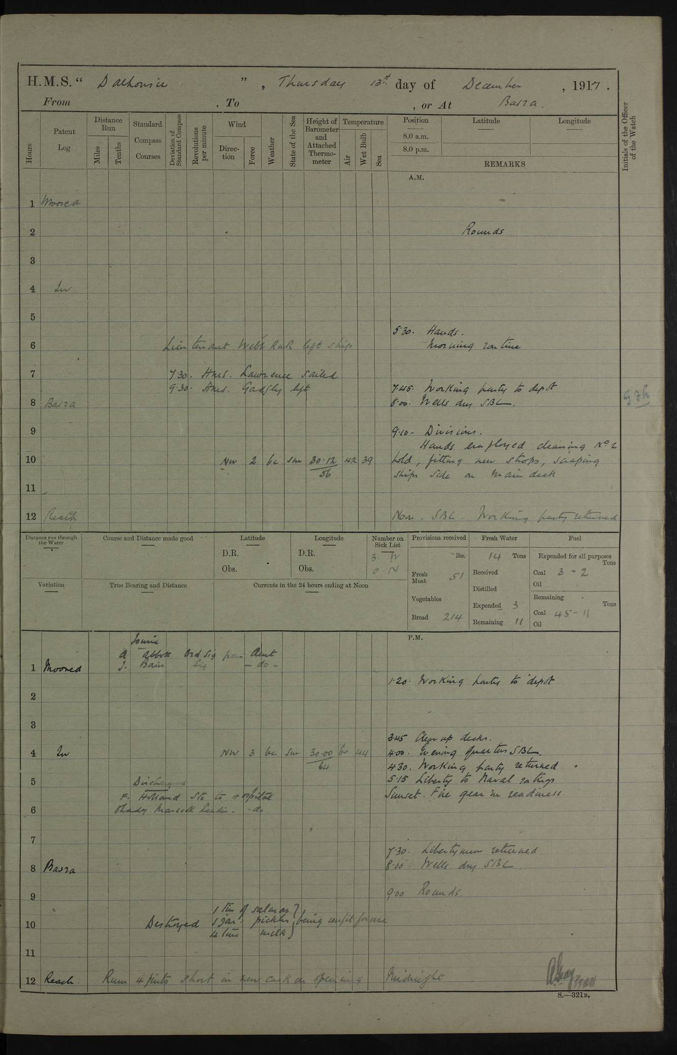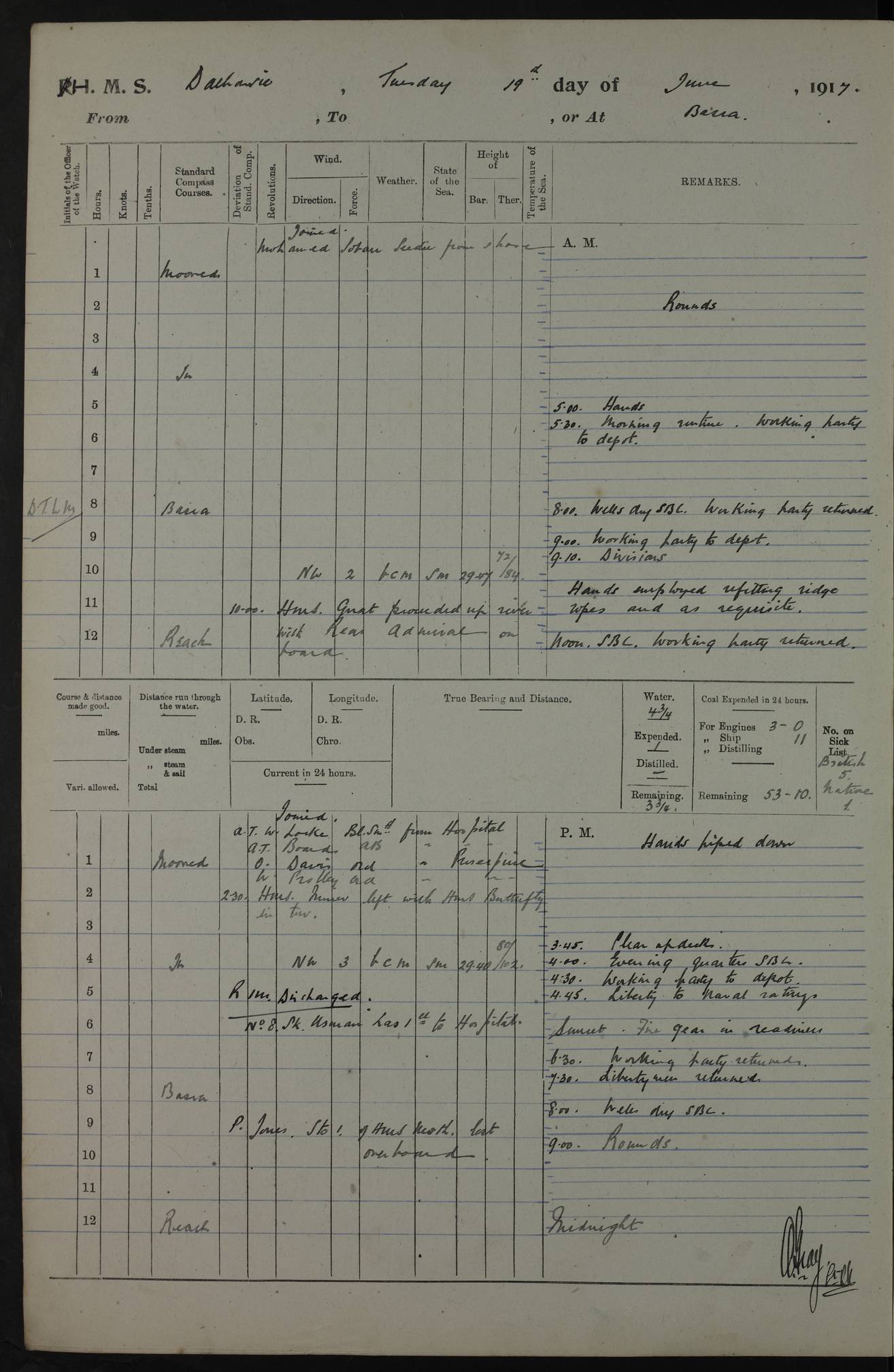 4ef4fafae53e0a0c91005922: (https://s3.amazonaws.com:443/oldweather/ADM53-39406/0008_0.jpg) 12 October 1917 Place: Basrah Lat 30.5269, Long 47.8407 2:00am: Rounds 3:00am: HMS GNAT left for up river 6:00am: Hands - Morning Routine 7:45am: Working party to Depot 8:00am: Wells dry - Signal Books correct 9:10am: Divisions 10:00am: Hands employed cleaning paintwork on Main Deck & as requisite 10:30am: MINER arrived 12:00pm: Signal Books correct – Working party returned 1:20pm: Working party to depot 2:00pm: Hands employed as in forenoon 3:45pm: Cleared up decks 4:00pm: Evening Quarters – Signal Books correct 4:30pm: Working party returned 5:15pm: Liberty to Naval Ratings 6:00pm: Sunset - Fire Gear in readiness 7:30pm: Liberty men returned 8:00pm: Wells dry - Signal Books correct 9:00pm: Rounds – Signal Books correct PM – Joined From Passage: Mr. Long, Gunner Royal Indian Marine From Admiral’s House: Mr Hicks, Clerk Royal Navy From ELEPHANTA: E.H. Ravine,Petty Officer - C Tavener Shipwright - G.W. Bright, Leading Seaman - F Martin, Leading Carpenter's Crew - J Stevens,Leading Carpenter's Crew - W Crawford, Able Seaman - W Green, Able Seaman - F Askell, Able Seaman - J Phillips, Able Seaman - A Skinner, Able Seaman - W Cox, Able Seaman - C Legg, Able Seaman- H Hunt, Able Seaman- W Sangston, Carpenter's Crew - S Newton, Stoker - J.W. Woods, Stoker - J Williams, Stoker - J Storey, Stoker - E Gray, Stoker - E Griffiths, Stoker- T Prin, Able Seaman - W Cox, Leading Stoker - H Brockerston, Engine Room Artificer - A Hicks, Chief Petty Officer - G Gomes, Chief Petty Officer – W Heath. Petty Officer - G Williams, Signalman - A Taylor Telegrapher PM - Discharged To PROSERPINE: Mead, Private Royal Marines Light Infantry 4ef4fafae53e0a0c91005923: (https://s3.amazonaws.com:443/oldweather/ADM53-39406/0008_1.jpg) 13 October 1917 Place: Basrah Lat 30.5269, Long 47.8407 2:00am: Rounds 6:00am: Hands - Morning Routine 7:00am: Exercised Fire Stations 7:45am: Working party to Depot 8:00am: Wells dry - Signal Books correct 9:10am: Divisions 10:00am: Hands employed cleaning ship 12:00pm: Signal Books correct – Working party returned 1:00pm: Hands piped down 1:30pm: Liberty to Naval Ratings 3:45pm: Cleared up decks 4:00pm: Evening Quarters – Signal Books correct 6:00pm: Sunset - Fire Gear in readiness 7:30pm: Liberty men returned 8:00pm: Wells dry - Signal Books correct 9:00pm: Rounds – Signal Books correct AM – Joined From MINER: A Abbott, Ordinary Seaman From Hospital: G Paton, CXX PM – Joined From MINER: J Sarinders, Stoker Petty Officer - C Scotting, Stoker - L Mowles, Able Seaman - J Perry, Able Seaman From ALERT: F Killburn, Signalman - E Harris, Signalman From Hospital: T Thornton , Carpenter's Crew - A Hatchard, Stoker 4ef4fafae53e0a0c91005924: (https://s3.amazonaws.com:443/oldweather/ADM53-39406/0009_0.jpg) 14 October 1917 Place: Basrah Lat 30.5269, Long 47.8407 2:00am: Rounds 5:30am: Hands 6:00am: Morning Routine 6:50am: Roman Catholic Church party landed 7:30am: Working party to Depot 8:00am: Wells dry – Signal Books correct – Roman Catholics returned 8:30am: Church of England party to PROSERPINE 8:45am: Wesleyans landed 9:40am: Church of England parties returned - Divisions 10:30am: Liberty to Lascars 11:00am: Wesleyans returned 12:00pm: Signal Books correct – Working party returned 1:30pm: Liberty to Naval ratings 3:45pm: Cleared up decks 4:00pm: Evening Quarters – Signal Books correct 6:00pm: Sunset - Fire Gear in readiness 7:30pm: Liberty men returned 8:00pm: Wells dry - Signal Books correct 9:00pm: Rounds – Signal Books correct AM – Discharged To Leave: D Azendo, Officer’s Clerk - Saliman Hassan, Tindal To Admiral’s House: Mahomed Soban, Seedie PM - Discharged To FIREFLY: J Saunders, Stoker Petty Officer - A Hicks, Chief Petty Officer To Admiral’s House: J Chalk, Leading Seaman 4ef4fafae53e0a0c91005925: (https://s3.amazonaws.com:443/oldweather/ADM53-39406/0009_1.jpg) 15 October 1917 Place: Basrah Lat 30.5269, Long 47.8407 2:00am: Rounds 6:00am: Hands - Morning Routine 7:45am: Working party to Depot 8:00am: Wells dry - Signal Books correct 9:10am: Divisions 10:00am: Hands employed reeving new Cutter’s Falls & as requisite 12:00pm: Signal Books correct – Working party returned 1:00pm: Hands piped down 1:30pm: Liberty to Naval Ratings 3:45pm: Cleared up decks 4:00pm: Evening Quarters – Signal Books correct 5:15pm: Liberty to Naval Ratings 6:00pm: Sunset - Fire Gear in readiness 7:30pm: Liberty men returned 8:00pm: Wells dry - Signal Books correct 9:00pm: Rounds – Signal Books correct AM – Joined For Passage to England: G Wilson Lieutenant Commander, Royal Navy PM – Joined From Hospital: S.G. Knight, Able Seaman- T Doolan, Petty Officer PM - Discharged To Admiral’s House: J Kinnear, Writer 1st 4ef4fafbe53e0a0c91005926: (https://s3.amazonaws.com:443/oldweather/ADM53-39406/0010_0.jpg) 16 October 1917 Place: Basrah Lat 30.5269, Long 47.8407 2:00am: Rounds 6:00am: Hands - Morning Routine 7:45am: Working party to Depot 8:00am: Wells dry - Signal Books correct 9:10am: Divisions 10:00am: Hands employed as requisite 12:00pm: Signal Books correct – Working party returned 1:30pm: Working party to Depot 3:45pm: Cleared up decks 4:00pm: Evening Quarters – Signal Books correct 4:30pm: Working party returned 6:00pm: Sunset - Fire Gear in readiness 7:30pm: Liberty men returned 8:00pm: Wells dry - Signal Books correct 9:00pm: Rounds – Signal Books correct PM – Joined From Hospital: J Young, Engine Room Artificer From DRAGONFLY: R Hotten, Engine Room Artificer From Patrol Steamer 59: H Peckham, Seaman Royal Navy Reserve - M Murray, Seaman Royal Navy Reserve PM - Discharged To DRAGONFLY: H Brotherton, Engine Room Artificer 4ef4fafbe53e0a0c91005927: (https://s3.amazonaws.com:443/oldweather/ADM53-39406/0010_1.jpg) 17 October 1917 Place: Basrah Lat 30.5269, Long 47.8407 2:00am: Rounds 6:00am: Hands - Morning Routine 7:45am: Working party to Depot 8:00am: Wells dry -