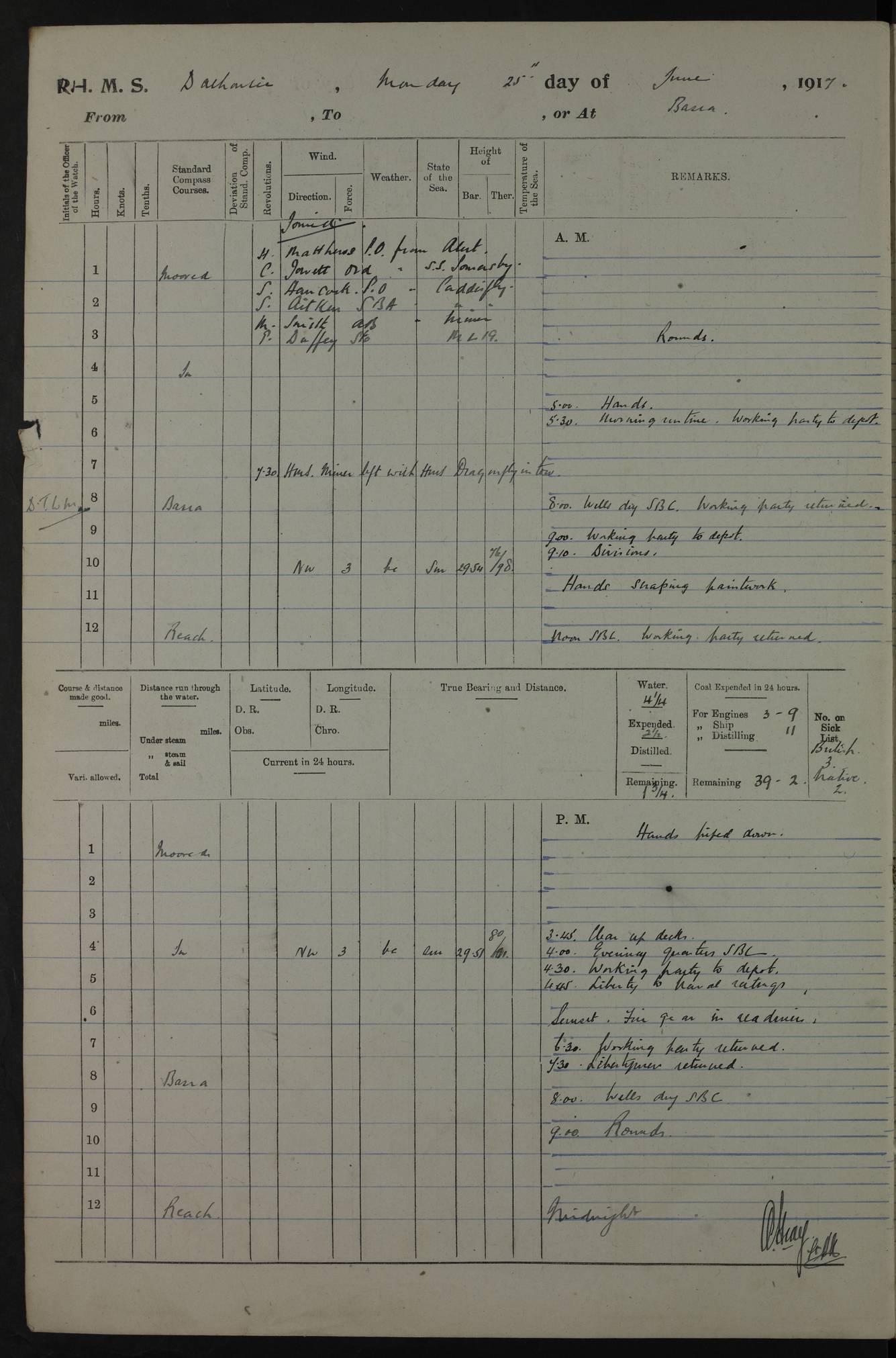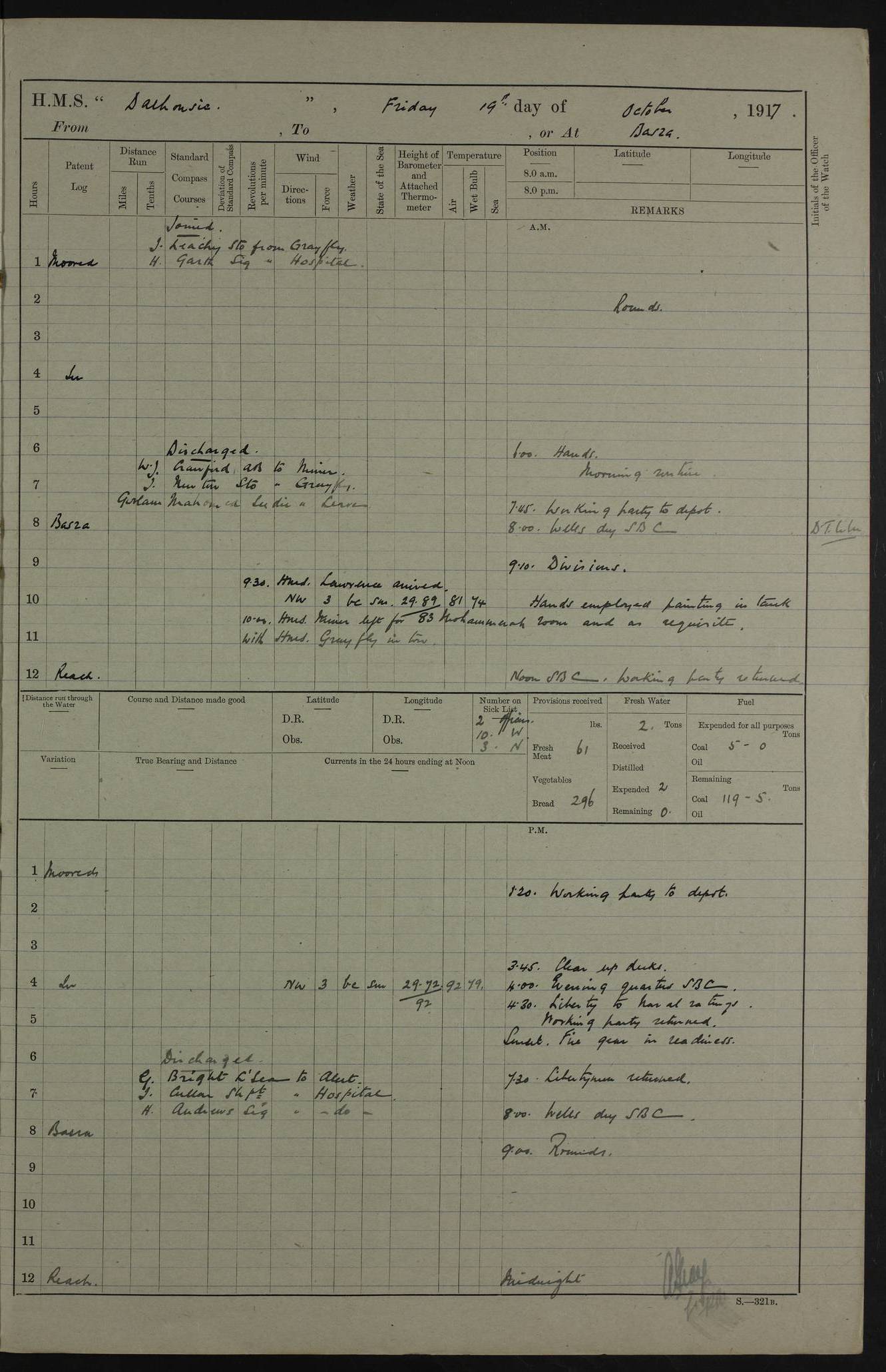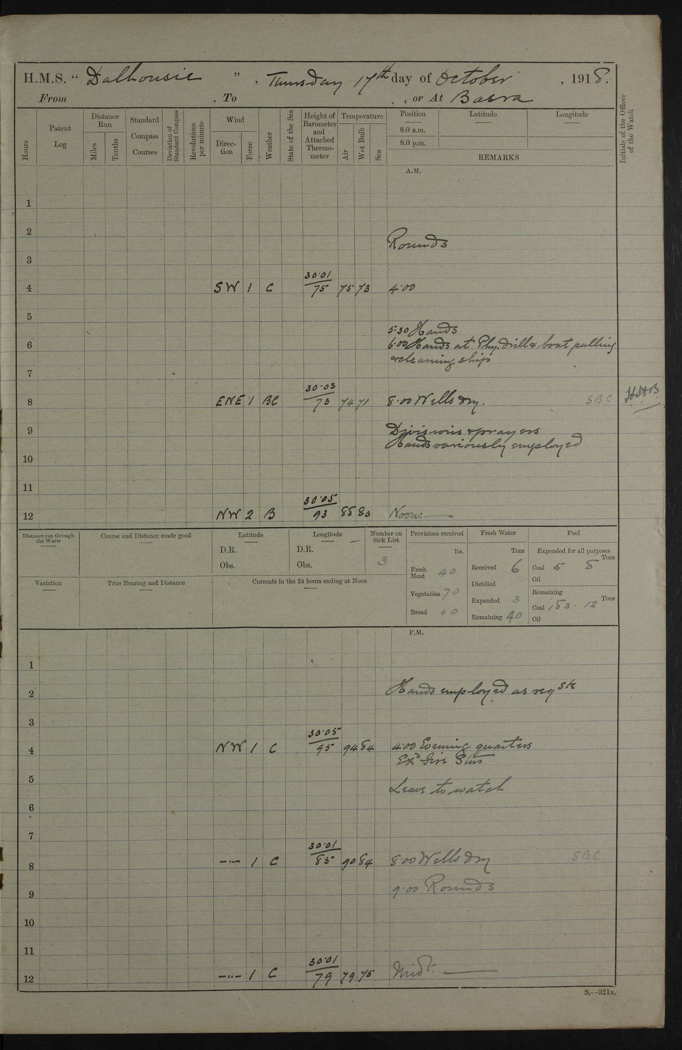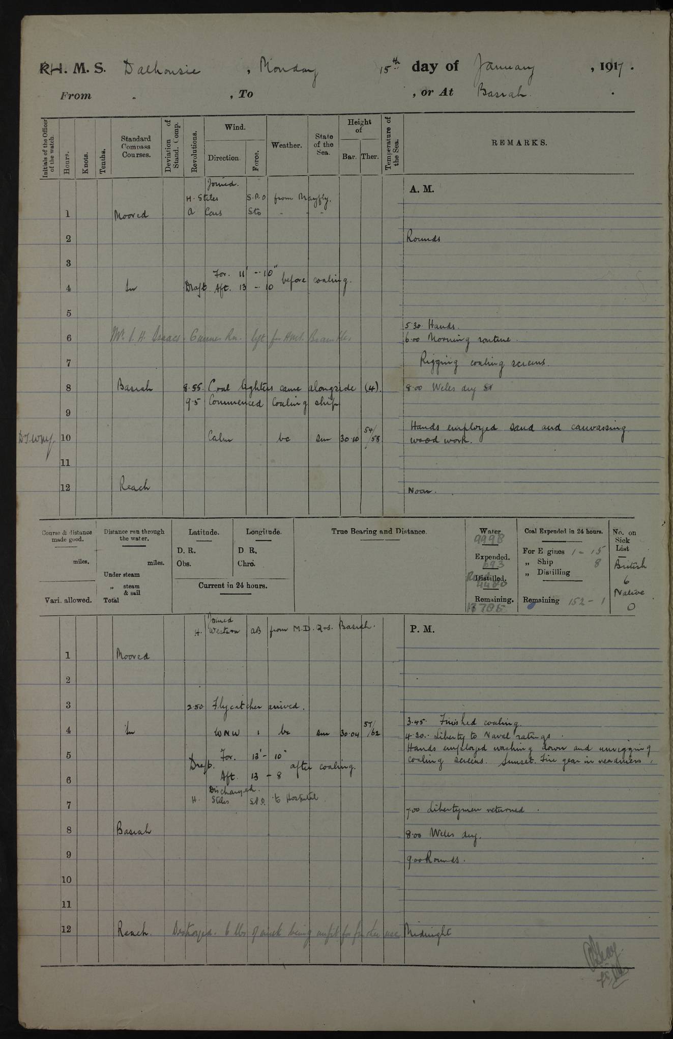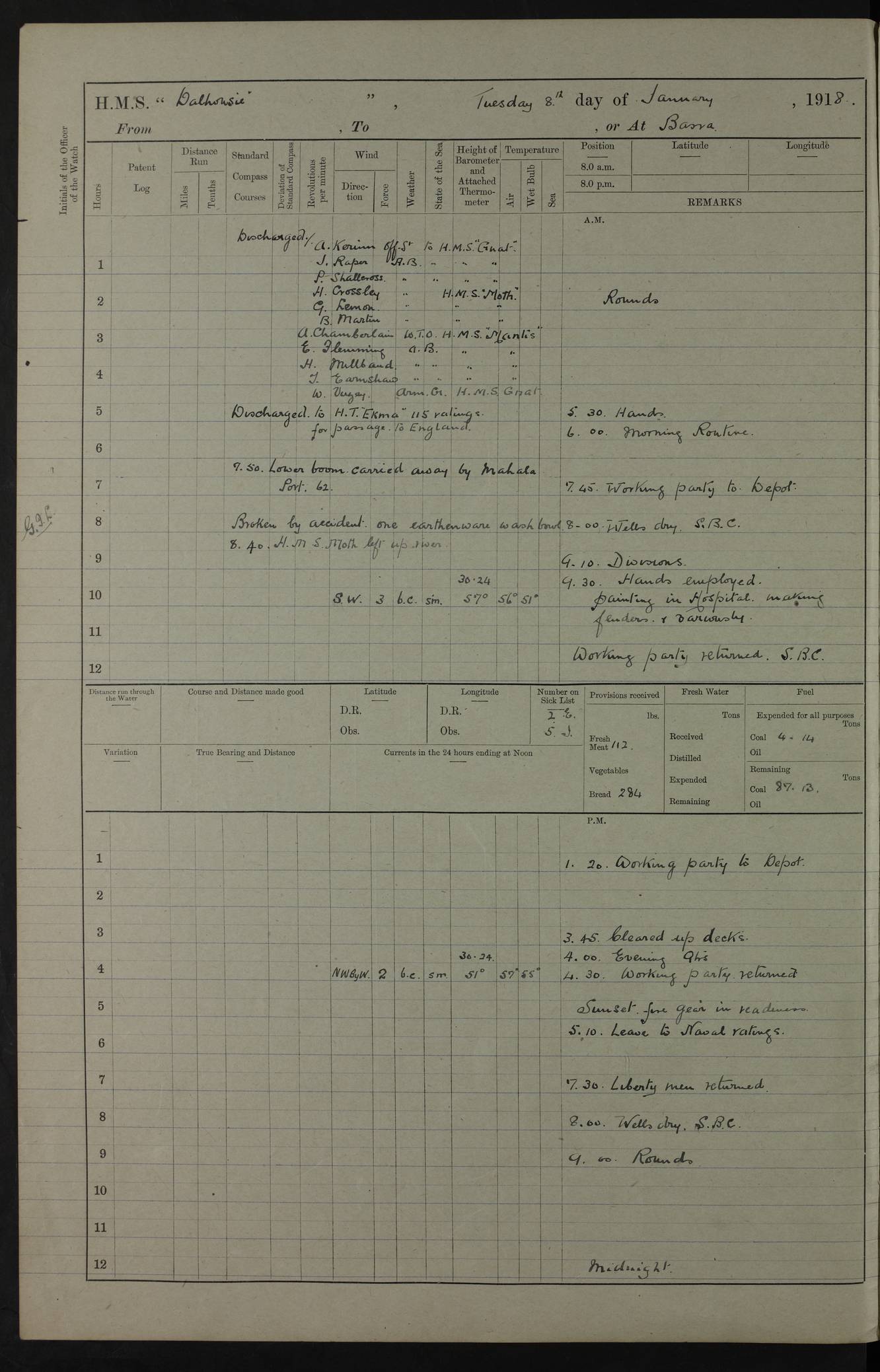 4ef4fafae53e0a0c91005922: (https://s3.amazonaws.com:443/oldweather/ADM53-39406/0008_0.jpg) 12 October 1917 Place: Basrah Lat 30.5269, Long 47.8407 2:00am: Rounds 3:00am: HMS GNAT left for up river 6:00am: Hands - Morning Routine 7:45am: Working party to Depot 8:00am: Wells dry - Signal Books correct 9:10am: Divisions 10:00am: Hands employed cleaning paintwork on Main Deck & as requisite 10:30am: MINER arrived 12:00pm: Signal Books correct – Working party returned 1:20pm: Working party to depot 2:00pm: Hands employed as in forenoon 3:45pm: Cleared up decks 4:00pm: Evening Quarters – Signal Books correct 4:30pm: Working party returned 5:15pm: Liberty to Naval Ratings 6:00pm: Sunset - Fire Gear in readiness 7:30pm: Liberty men returned 8:00pm: Wells dry - Signal Books correct 9:00pm: Rounds – Signal Books correct PM – Joined From Passage: Mr. Long, Gunner Royal Indian Marine From Admiral’s House: Mr Hicks, Clerk Royal Navy From ELEPHANTA: E.H. Ravine,Petty Officer - C Tavener Shipwright - G.W. Bright, Leading Seaman - F Martin, Leading Carpenter's Crew - J Stevens,Leading Carpenter's Crew - W Crawford, Able Seaman - W Green, Able Seaman - F Askell, Able Seaman - J Phillips, Able Seaman - A Skinner, Able Seaman - W Cox, Able Seaman - C Legg, Able Seaman- H Hunt, Able Seaman- W Sangston, Carpenter's Crew - S Newton, Stoker - J.W. Woods, Stoker - J Williams, Stoker - J Storey, Stoker - E Gray, Stoker - E Griffiths, Stoker- T Prin, Able Seaman - W Cox, Leading Stoker - H Brockerston, Engine Room Artificer - A Hicks, Chief Petty Officer - G Gomes, Chief Petty Officer – W Heath. Petty Officer - G Williams, Signalman - A Taylor Telegrapher PM - Discharged To PROSERPINE: Mead, Private Royal Marines Light Infantry 4ef4fafae53e0a0c91005923: (https://s3.amazonaws.com:443/oldweather/ADM53-39406/0008_1.jpg) 13 October 1917 Place: Basrah Lat 30.5269, Long 47.8407 2:00am: Rounds 6:00am: Hands - Morning Routine 7:00am: Exercised Fire Stations 7:45am: Working party to Depot 8:00am: Wells dry - Signal Books correct 9:10am: Divisions 10:00am: Hands employed cleaning ship 12:00pm: Signal Books correct – Working party returned 1:00pm: Hands piped down 1:30pm: Liberty to Naval Ratings 3:45pm: Cleared up decks 4:00pm: Evening Quarters – Signal Books correct 6:00pm: Sunset - Fire Gear in readiness 7:30pm: Liberty men returned 8:00pm: Wells dry - Signal Books correct 9:00pm: Rounds – Signal Books correct AM – Joined From MINER: A Abbott, Ordinary Seaman From Hospital: G Paton, CXX PM – Joined From MINER: J Sarinders, Stoker Petty Officer - C Scotting, Stoker - L Mowles, Able Seaman - J Perry, Able Seaman From ALERT: F Killburn, Signalman - E Harris, Signalman From Hospital: T Thornton , Carpenter's Crew - A Hatchard, Stoker 4ef4fafae53e0a0c91005924: (https://s3.amazonaws.com:443/oldweather/ADM53-39406/0009_0.jpg) 14 October 1917 Place: Basrah Lat 30.5269, Long 47.8407 2:00am: Rounds 5:30am: Hands 6:00am: Morning Routine 6:50am: Roman Catholic Church party landed 7:30am: Working party to Depot 8:00am: Wells dry – Signal Books correct – Roman Catholics returned 8:30am: Church of England party to PROSERPINE 8:45am: Wesleyans landed 9:40am: Church of England parties returned - Divisions 10:30am: Liberty to Lascars 11:00am: Wesleyans returned 12:00pm: Signal Books correct – Working party returned 1:30pm: Liberty to Naval ratings 3:45pm: Cleared up decks 4:00pm: Evening Quarters – Signal Books correct 6:00pm: Sunset - Fire Gear in readiness 7:30pm: Liberty men returned 8:00pm: Wells dry - Signal Books correct 9:00pm: Rounds – Signal Books correct AM – Discharged To Leave: D Azendo, Officer’s Clerk - Saliman Hassan, Tindal To Admiral’s House: Mahomed Soban, Seedie PM - Discharged To FIREFLY: J Saunders, Stoker Petty Officer - A Hicks, Chief Petty Officer To Admiral’s House: J Chalk, Leading Seaman 4ef4fafae53e0a0c91005925: (https://s3.amazonaws.com:443/oldweather/ADM53-39406/0009_1.jpg) 15 October 1917 Place: Basrah Lat 30.5269, Long 47.8407 2:00am: Rounds 6:00am: Hands - Morning Routine 7:45am: Working party to Depot 8:00am: Wells dry - Signal Books correct 9:10am: Divisions 10:00am: Hands employed reeving new Cutter’s Falls & as requisite 12:00pm: Signal Books correct – Working party returned 1:00pm: Hands piped down 1:30pm: Liberty to Naval Ratings 3:45pm: Cleared up decks 4:00pm: Evening Quarters – Signal Books correct 5:15pm: Liberty to Naval Ratings 6:00pm: Sunset - Fire Gear in readiness 7:30pm: Liberty men returned 8:00pm: Wells dry - Signal Books correct 9:00pm: Rounds – Signal Books correct AM – Joined For Passage to England: G Wilson Lieutenant Commander, Royal Navy PM – Joined From Hospital: S.G. Knight, Able Seaman- T Doolan, Petty Officer PM - Discharged To Admiral’s House: J Kinnear, Writer 1st 4ef4fafbe53e0a0c91005926: (https://s3.amazonaws.com:443/oldweather/ADM53-39406/0010_0.jpg) 16 October 1917 Place: Basrah Lat 30.5269, Long 47.8407 2:00am: Rounds 6:00am: Hands - Morning Routine 7:45am: Working party to Depot 8:00am: Wells dry - Signal Books correct 9:10am: Divisions 10:00am: Hands employed as requisite 12:00pm: Signal Books correct – Working party returned 1:30pm: Working party to Depot 3:45pm: Cleared up decks 4:00pm: Evening Quarters – Signal Books correct 4:30pm: Working party returned 6:00pm: Sunset - Fire Gear in readiness 7:30pm: Liberty men returned 8:00pm: Wells dry - Signal Books correct 9:00pm: Rounds – Signal Books correct PM – Joined From Hospital: J Young, Engine Room Artificer From DRAGONFLY: R Hotten, Engine Room Artificer From Patrol Steamer 59: H Peckham, Seaman Royal Navy Reserve - M Murray, Seaman Royal Navy Reserve PM - Discharged To DRAGONFLY: H Brotherton, Engine Room Artificer 4ef4fafbe53e0a0c91005927: (https://s3.amazonaws.com:443/oldweather/ADM53-39406/0010_1.jpg) 17 October 1917 Place: Basrah Lat 30.5269, Long 47.8407 2:00am: Rounds 6:00am: Hands - Morning Routine 7:45am: Working party to Depot 8:00am: Wells dry -