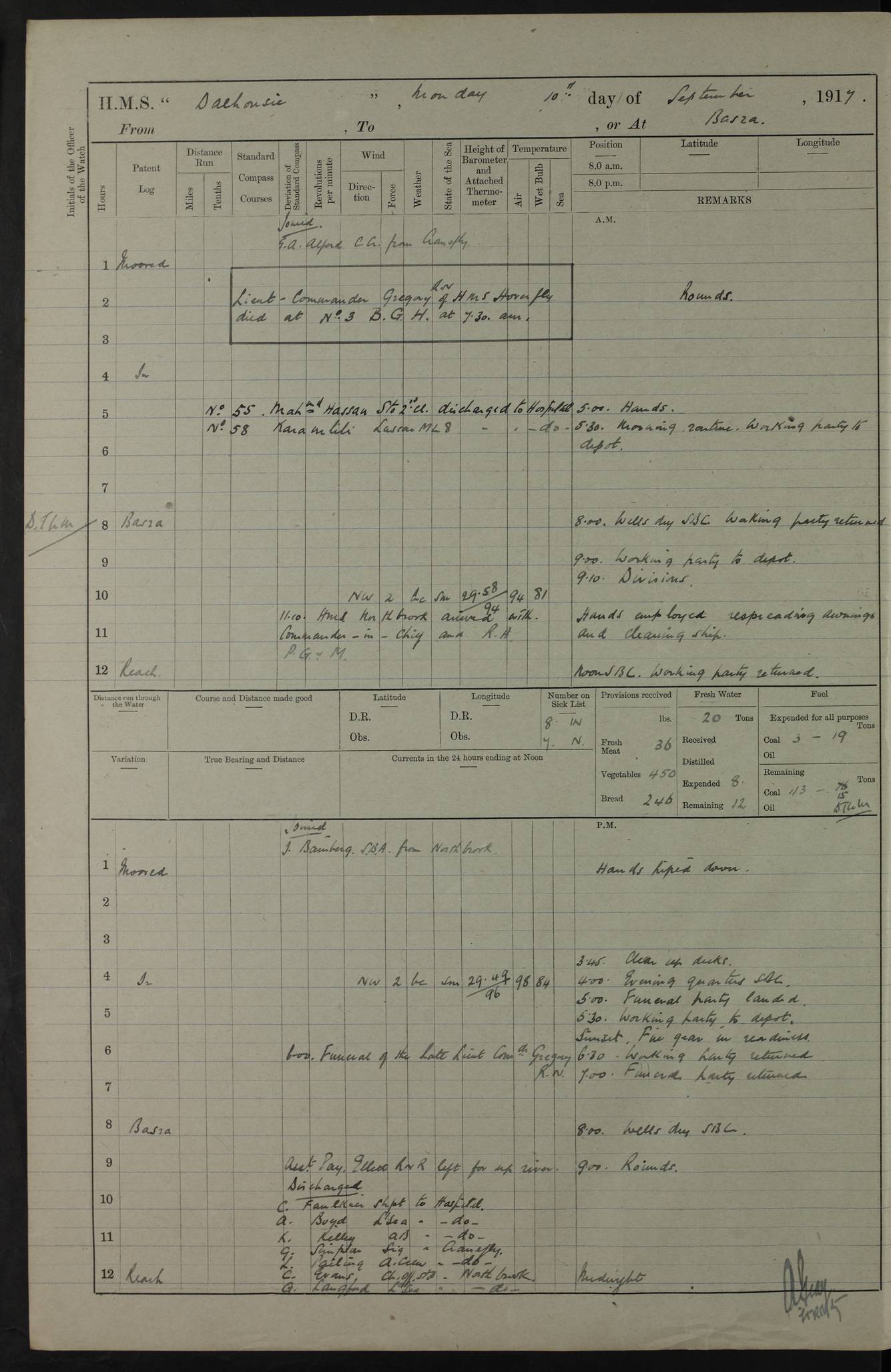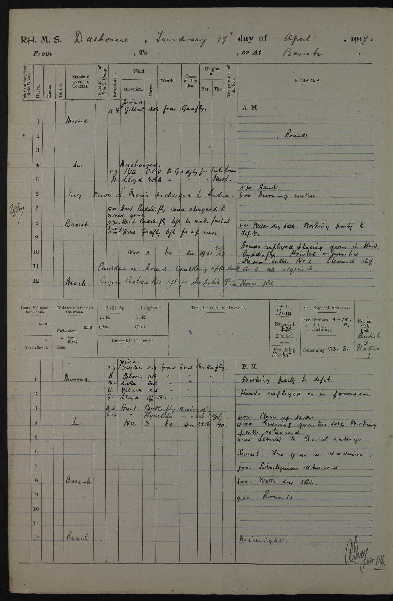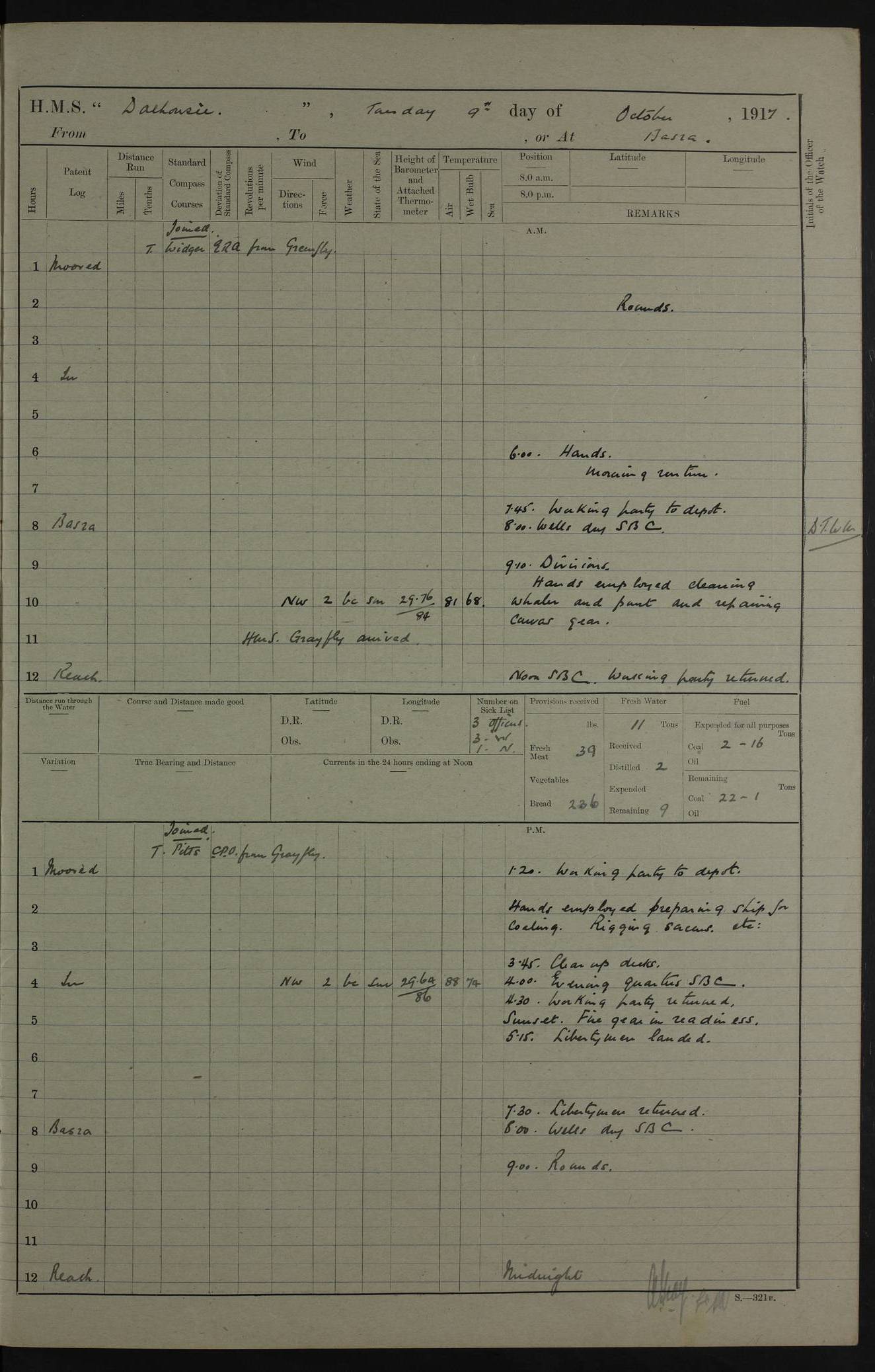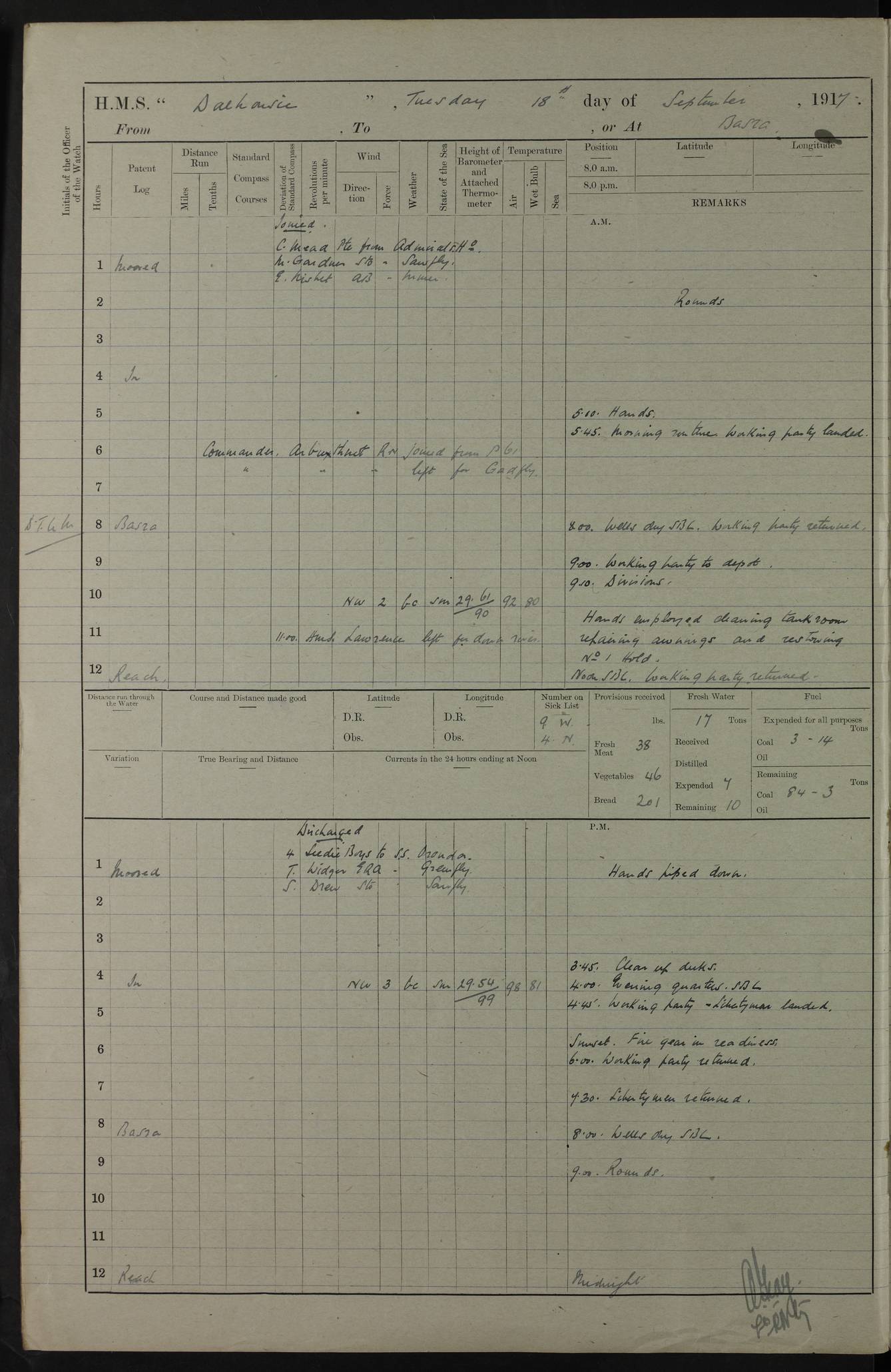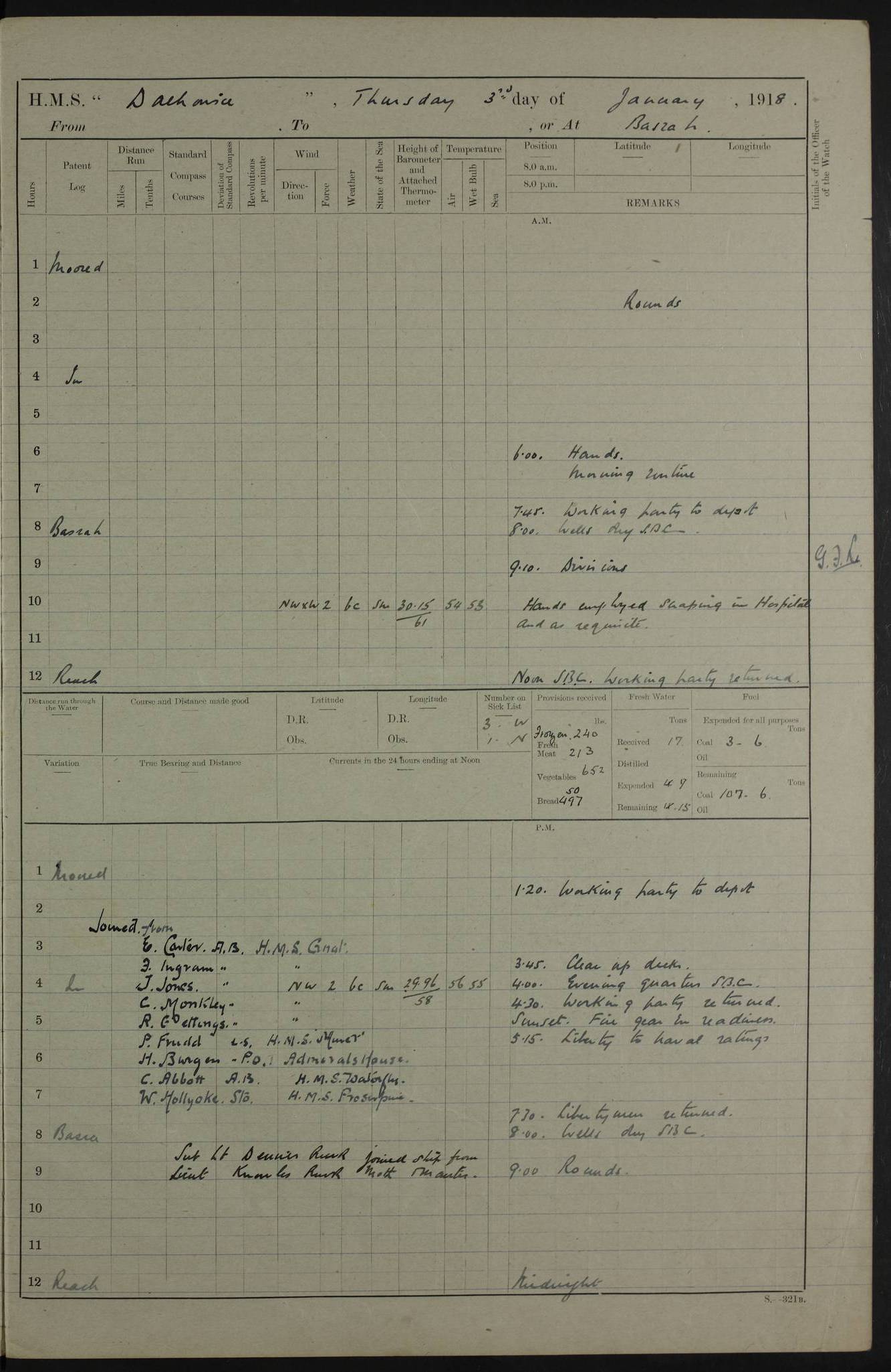 4ef4fafae53e0a0c91005922: (https://s3.amazonaws.com:443/oldweather/ADM53-39406/0008_0.jpg) 12 October 1917 Place: Basrah Lat 30.5269, Long 47.8407 2:00am: Rounds 3:00am: HMS GNAT left for up river 6:00am: Hands - Morning Routine 7:45am: Working party to Depot 8:00am: Wells dry - Signal Books correct 9:10am: Divisions 10:00am: Hands employed cleaning paintwork on Main Deck & as requisite 10:30am: MINER arrived 12:00pm: Signal Books correct – Working party returned 1:20pm: Working party to depot 2:00pm: Hands employed as in forenoon 3:45pm: Cleared up decks 4:00pm: Evening Quarters – Signal Books correct 4:30pm: Working party returned 5:15pm: Liberty to Naval Ratings 6:00pm: Sunset - Fire Gear in readiness 7:30pm: Liberty men returned 8:00pm: Wells dry - Signal Books correct 9:00pm: Rounds – Signal Books correct PM – Joined From Passage: Mr. Long, Gunner Royal Indian Marine From Admiral’s House: Mr Hicks, Clerk Royal Navy From ELEPHANTA: E.H. Ravine,Petty Officer - C Tavener Shipwright - G.W. Bright, Leading Seaman - F Martin, Leading Carpenter's Crew - J Stevens,Leading Carpenter's Crew - W Crawford, Able Seaman - W Green, Able Seaman - F Askell, Able Seaman - J Phillips, Able Seaman - A Skinner, Able Seaman - W Cox, Able Seaman - C Legg, Able Seaman- H Hunt, Able Seaman- W Sangston, Carpenter's Crew - S Newton, Stoker - J.W. Woods, Stoker - J Williams, Stoker - J Storey, Stoker - E Gray, Stoker - E Griffiths, Stoker- T Prin, Able Seaman - W Cox, Leading Stoker - H Brockerston, Engine Room Artificer - A Hicks, Chief Petty Officer - G Gomes, Chief Petty Officer – W Heath. Petty Officer - G Williams, Signalman - A Taylor Telegrapher PM - Discharged To PROSERPINE: Mead, Private Royal Marines Light Infantry 4ef4fafae53e0a0c91005923: (https://s3.amazonaws.com:443/oldweather/ADM53-39406/0008_1.jpg) 13 October 1917 Place: Basrah Lat 30.5269, Long 47.8407 2:00am: Rounds 6:00am: Hands - Morning Routine 7:00am: Exercised Fire Stations 7:45am: Working party to Depot 8:00am: Wells dry - Signal Books correct 9:10am: Divisions 10:00am: Hands employed cleaning ship 12:00pm: Signal Books correct – Working party returned 1:00pm: Hands piped down 1:30pm: Liberty to Naval Ratings 3:45pm: Cleared up decks 4:00pm: Evening Quarters – Signal Books correct 6:00pm: Sunset - Fire Gear in readiness 7:30pm: Liberty men returned 8:00pm: Wells dry - Signal Books correct 9:00pm: Rounds – Signal Books correct AM – Joined From MINER: A Abbott, Ordinary Seaman From Hospital: G Paton, CXX PM – Joined From MINER: J Sarinders, Stoker Petty Officer - C Scotting, Stoker - L Mowles, Able Seaman - J Perry, Able Seaman From ALERT: F Killburn, Signalman - E Harris, Signalman From Hospital: T Thornton , Carpenter's Crew - A Hatchard, Stoker 4ef4fafae53e0a0c91005924: (https://s3.amazonaws.com:443/oldweather/ADM53-39406/0009_0.jpg) 14 October 1917 Place: Basrah Lat 30.5269, Long 47.8407 2:00am: Rounds 5:30am: Hands 6:00am: Morning Routine 6:50am: Roman Catholic Church party landed 7:30am: Working party to Depot 8:00am: Wells dry – Signal Books correct – Roman Catholics returned 8:30am: Church of England party to PROSERPINE 8:45am: Wesleyans landed 9:40am: Church of England parties returned - Divisions 10:30am: Liberty to Lascars 11:00am: Wesleyans returned 12:00pm: Signal Books correct – Working party returned 1:30pm: Liberty to Naval ratings 3:45pm: Cleared up decks 4:00pm: Evening Quarters – Signal Books correct 6:00pm: Sunset - Fire Gear in readiness 7:30pm: Liberty men returned 8:00pm: Wells dry - Signal Books correct 9:00pm: Rounds – Signal Books correct AM – Discharged To Leave: D Azendo, Officer’s Clerk - Saliman Hassan, Tindal To Admiral’s House: Mahomed Soban, Seedie PM - Discharged To FIREFLY: J Saunders, Stoker Petty Officer - A Hicks, Chief Petty Officer To Admiral’s House: J Chalk, Leading Seaman 4ef4fafae53e0a0c91005925: (https://s3.amazonaws.com:443/oldweather/ADM53-39406/0009_1.jpg) 15 October 1917 Place: Basrah Lat 30.5269, Long 47.8407 2:00am: Rounds 6:00am: Hands - Morning Routine 7:45am: Working party to Depot 8:00am: Wells dry - Signal Books correct 9:10am: Divisions 10:00am: Hands employed reeving new Cutter’s Falls & as requisite 12:00pm: Signal Books correct – Working party returned 1:00pm: Hands piped down 1:30pm: Liberty to Naval Ratings 3:45pm: Cleared up decks 4:00pm: Evening Quarters – Signal Books correct 5:15pm: Liberty to Naval Ratings 6:00pm: Sunset - Fire Gear in readiness 7:30pm: Liberty men returned 8:00pm: Wells dry - Signal Books correct 9:00pm: Rounds – Signal Books correct AM – Joined For Passage to England: G Wilson Lieutenant Commander, Royal Navy PM – Joined From Hospital: S.G. Knight, Able Seaman- T Doolan, Petty Officer PM - Discharged To Admiral’s House: J Kinnear, Writer 1st 4ef4fafbe53e0a0c91005926: (https://s3.amazonaws.com:443/oldweather/ADM53-39406/0010_0.jpg) 16 October 1917 Place: Basrah Lat 30.5269, Long 47.8407 2:00am: Rounds 6:00am: Hands - Morning Routine 7:45am: Working party to Depot 8:00am: Wells dry - Signal Books correct 9:10am: Divisions 10:00am: Hands employed as requisite 12:00pm: Signal Books correct – Working party returned 1:30pm: Working party to Depot 3:45pm: Cleared up decks 4:00pm: Evening Quarters – Signal Books correct 4:30pm: Working party returned 6:00pm: Sunset - Fire Gear in readiness 7:30pm: Liberty men returned 8:00pm: Wells dry - Signal Books correct 9:00pm: Rounds – Signal Books correct PM – Joined From Hospital: J Young, Engine Room Artificer From DRAGONFLY: R Hotten, Engine Room Artificer From Patrol Steamer 59: H Peckham, Seaman Royal Navy Reserve - M Murray, Seaman Royal Navy Reserve PM - Discharged To DRAGONFLY: H Brotherton, Engine Room Artificer 4ef4fafbe53e0a0c91005927: (https://s3.amazonaws.com:443/oldweather/ADM53-39406/0010_1.jpg) 17 October 1917 Place: Basrah Lat 30.5269, Long 47.8407 2:00am: Rounds 6:00am: Hands - Morning Routine 7:45am: Working party to Depot 8:00am: Wells dry -