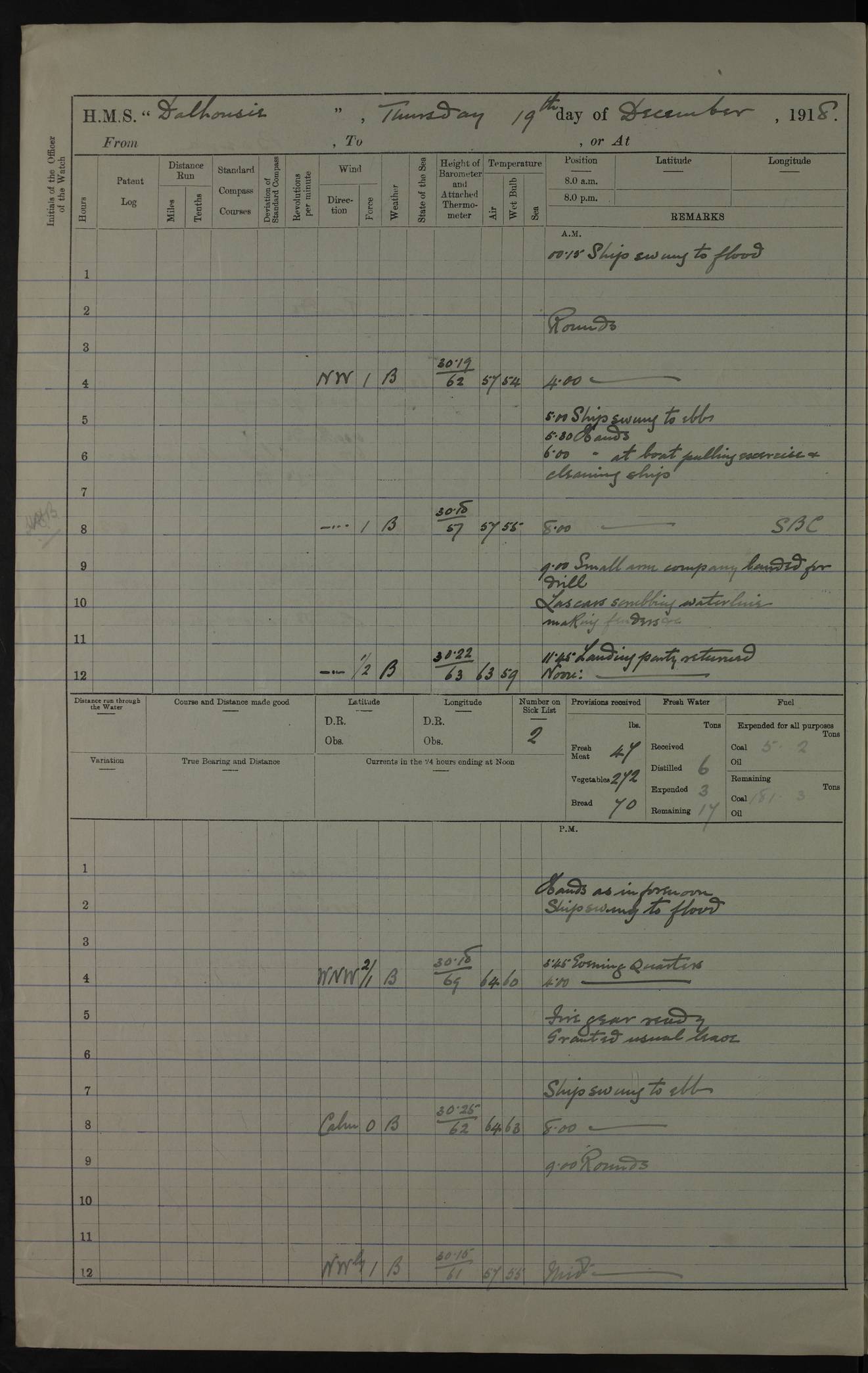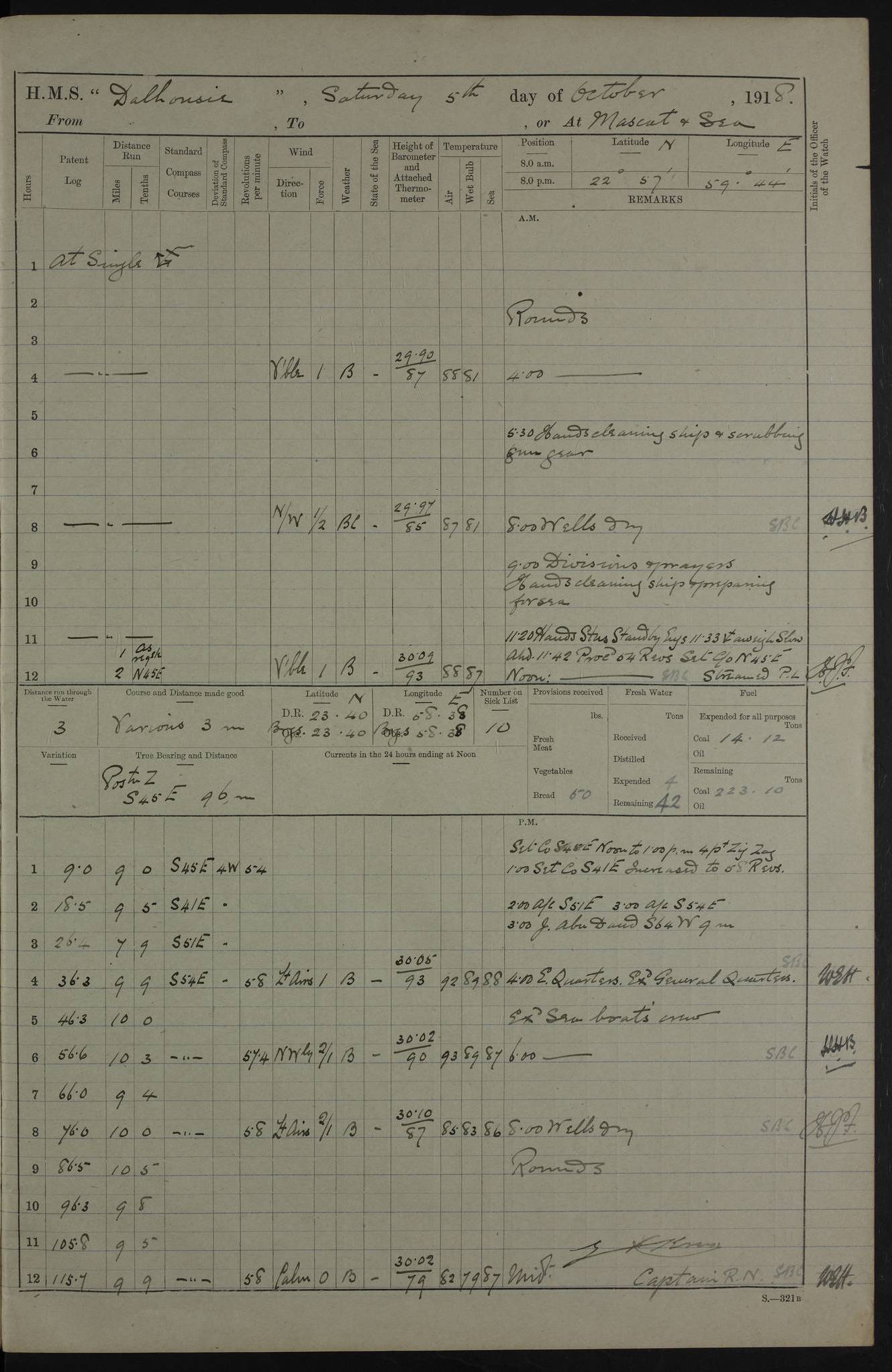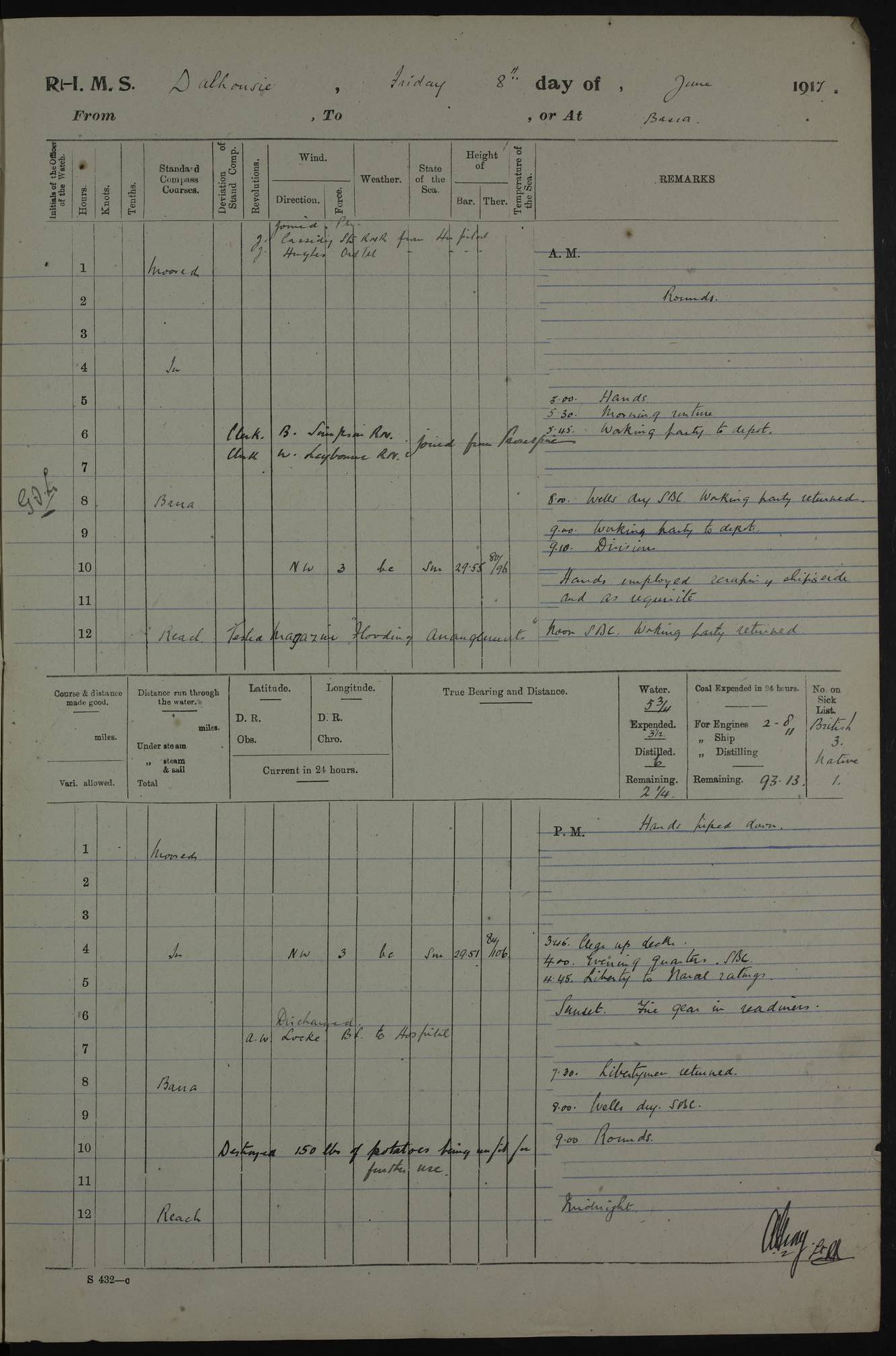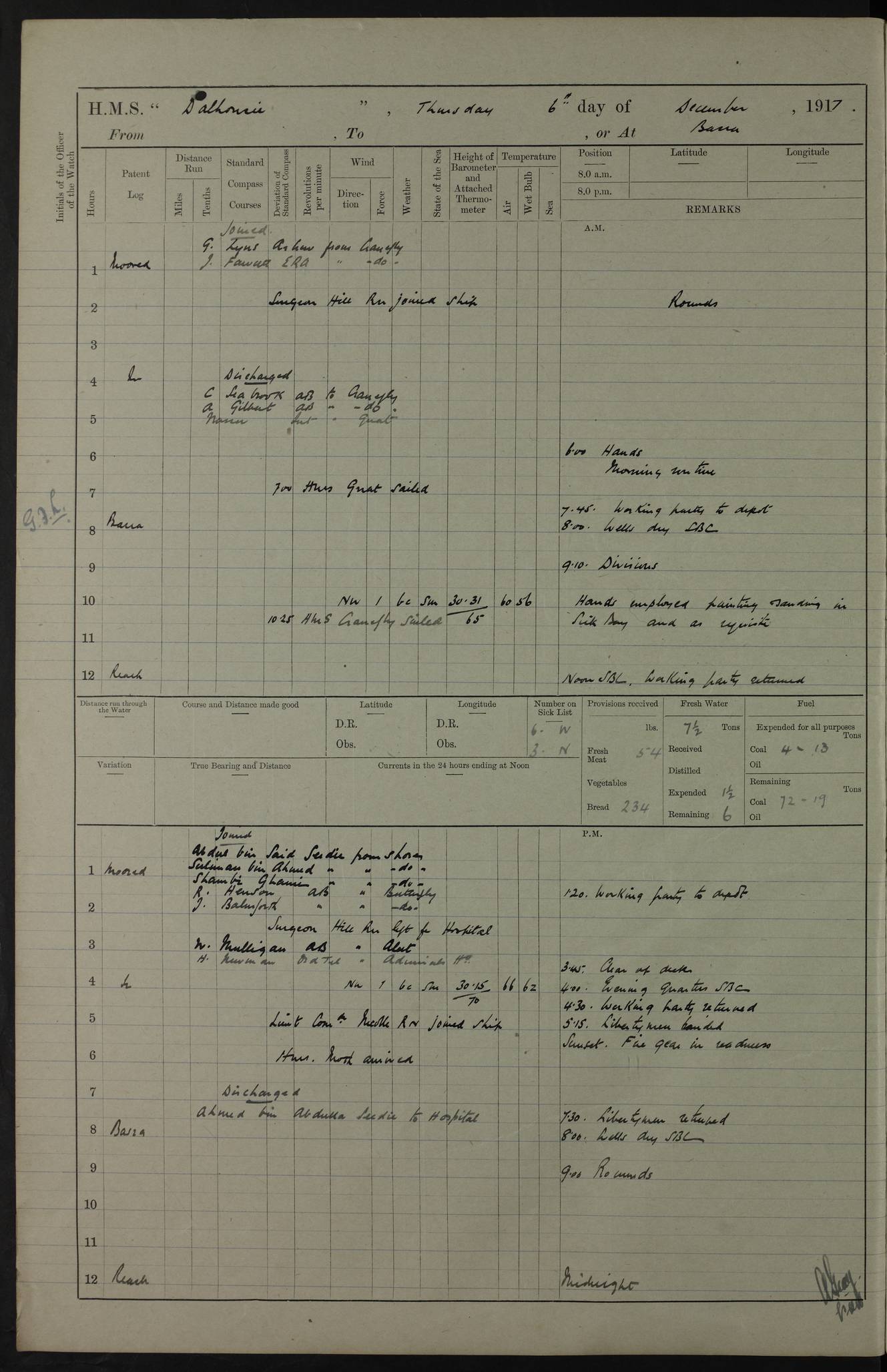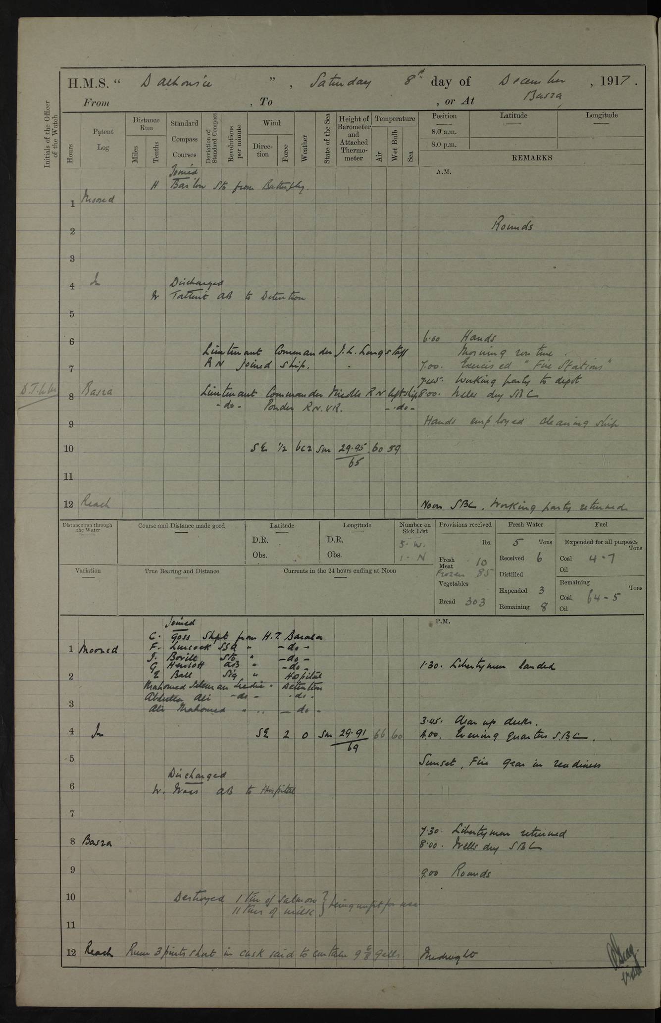 4ef4fafae53e0a0c91005922: (https://s3.amazonaws.com:443/oldweather/ADM53-39406/0008_0.jpg) 12 October 1917 Place: Basrah Lat 30.5269, Long 47.8407 2:00am: Rounds 3:00am: HMS GNAT left for up river 6:00am: Hands - Morning Routine 7:45am: Working party to Depot 8:00am: Wells dry - Signal Books correct 9:10am: Divisions 10:00am: Hands employed cleaning paintwork on Main Deck & as requisite 10:30am: MINER arrived 12:00pm: Signal Books correct – Working party returned 1:20pm: Working party to depot 2:00pm: Hands employed as in forenoon 3:45pm: Cleared up decks 4:00pm: Evening Quarters – Signal Books correct 4:30pm: Working party returned 5:15pm: Liberty to Naval Ratings 6:00pm: Sunset - Fire Gear in readiness 7:30pm: Liberty men returned 8:00pm: Wells dry - Signal Books correct 9:00pm: Rounds – Signal Books correct PM – Joined From Passage: Mr. Long, Gunner Royal Indian Marine From Admiral’s House: Mr Hicks, Clerk Royal Navy From ELEPHANTA: E.H. Ravine,Petty Officer - C Tavener Shipwright - G.W. Bright, Leading Seaman - F Martin, Leading Carpenter's Crew - J Stevens,Leading Carpenter's Crew - W Crawford, Able Seaman - W Green, Able Seaman - F Askell, Able Seaman - J Phillips, Able Seaman - A Skinner, Able Seaman - W Cox, Able Seaman - C Legg, Able Seaman- H Hunt, Able Seaman- W Sangston, Carpenter's Crew - S Newton, Stoker - J.W. Woods, Stoker - J Williams, Stoker - J Storey, Stoker - E Gray, Stoker - E Griffiths, Stoker- T Prin, Able Seaman - W Cox, Leading Stoker - H Brockerston, Engine Room Artificer - A Hicks, Chief Petty Officer - G Gomes, Chief Petty Officer – W Heath. Petty Officer - G Williams, Signalman - A Taylor Telegrapher PM - Discharged To PROSERPINE: Mead, Private Royal Marines Light Infantry 4ef4fafae53e0a0c91005923: (https://s3.amazonaws.com:443/oldweather/ADM53-39406/0008_1.jpg) 13 October 1917 Place: Basrah Lat 30.5269, Long 47.8407 2:00am: Rounds 6:00am: Hands - Morning Routine 7:00am: Exercised Fire Stations 7:45am: Working party to Depot 8:00am: Wells dry - Signal Books correct 9:10am: Divisions 10:00am: Hands employed cleaning ship 12:00pm: Signal Books correct – Working party returned 1:00pm: Hands piped down 1:30pm: Liberty to Naval Ratings 3:45pm: Cleared up decks 4:00pm: Evening Quarters – Signal Books correct 6:00pm: Sunset - Fire Gear in readiness 7:30pm: Liberty men returned 8:00pm: Wells dry - Signal Books correct 9:00pm: Rounds – Signal Books correct AM – Joined From MINER: A Abbott, Ordinary Seaman From Hospital: G Paton, CXX PM – Joined From MINER: J Sarinders, Stoker Petty Officer - C Scotting, Stoker - L Mowles, Able Seaman - J Perry, Able Seaman From ALERT: F Killburn, Signalman - E Harris, Signalman From Hospital: T Thornton , Carpenter's Crew - A Hatchard, Stoker 4ef4fafae53e0a0c91005924: (https://s3.amazonaws.com:443/oldweather/ADM53-39406/0009_0.jpg) 14 October 1917 Place: Basrah Lat 30.5269, Long 47.8407 2:00am: Rounds 5:30am: Hands 6:00am: Morning Routine 6:50am: Roman Catholic Church party landed 7:30am: Working party to Depot 8:00am: Wells dry – Signal Books correct – Roman Catholics returned 8:30am: Church of England party to PROSERPINE 8:45am: Wesleyans landed 9:40am: Church of England parties returned - Divisions 10:30am: Liberty to Lascars 11:00am: Wesleyans returned 12:00pm: Signal Books correct – Working party returned 1:30pm: Liberty to Naval ratings 3:45pm: Cleared up decks 4:00pm: Evening Quarters – Signal Books correct 6:00pm: Sunset - Fire Gear in readiness 7:30pm: Liberty men returned 8:00pm: Wells dry - Signal Books correct 9:00pm: Rounds – Signal Books correct AM – Discharged To Leave: D Azendo, Officer’s Clerk - Saliman Hassan, Tindal To Admiral’s House: Mahomed Soban, Seedie PM - Discharged To FIREFLY: J Saunders, Stoker Petty Officer - A Hicks, Chief Petty Officer To Admiral’s House: J Chalk, Leading Seaman 4ef4fafae53e0a0c91005925: (https://s3.amazonaws.com:443/oldweather/ADM53-39406/0009_1.jpg) 15 October 1917 Place: Basrah Lat 30.5269, Long 47.8407 2:00am: Rounds 6:00am: Hands - Morning Routine 7:45am: Working party to Depot 8:00am: Wells dry - Signal Books correct 9:10am: Divisions 10:00am: Hands employed reeving new Cutter’s Falls & as requisite 12:00pm: Signal Books correct – Working party returned 1:00pm: Hands piped down 1:30pm: Liberty to Naval Ratings 3:45pm: Cleared up decks 4:00pm: Evening Quarters – Signal Books correct 5:15pm: Liberty to Naval Ratings 6:00pm: Sunset - Fire Gear in readiness 7:30pm: Liberty men returned 8:00pm: Wells dry - Signal Books correct 9:00pm: Rounds – Signal Books correct AM – Joined For Passage to England: G Wilson Lieutenant Commander, Royal Navy PM – Joined From Hospital: S.G. Knight, Able Seaman- T Doolan, Petty Officer PM - Discharged To Admiral’s House: J Kinnear, Writer 1st 4ef4fafbe53e0a0c91005926: (https://s3.amazonaws.com:443/oldweather/ADM53-39406/0010_0.jpg) 16 October 1917 Place: Basrah Lat 30.5269, Long 47.8407 2:00am: Rounds 6:00am: Hands - Morning Routine 7:45am: Working party to Depot 8:00am: Wells dry - Signal Books correct 9:10am: Divisions 10:00am: Hands employed as requisite 12:00pm: Signal Books correct – Working party returned 1:30pm: Working party to Depot 3:45pm: Cleared up decks 4:00pm: Evening Quarters – Signal Books correct 4:30pm: Working party returned 6:00pm: Sunset - Fire Gear in readiness 7:30pm: Liberty men returned 8:00pm: Wells dry - Signal Books correct 9:00pm: Rounds – Signal Books correct PM – Joined From Hospital: J Young, Engine Room Artificer From DRAGONFLY: R Hotten, Engine Room Artificer From Patrol Steamer 59: H Peckham, Seaman Royal Navy Reserve - M Murray, Seaman Royal Navy Reserve PM - Discharged To DRAGONFLY: H Brotherton, Engine Room Artificer 4ef4fafbe53e0a0c91005927: (https://s3.amazonaws.com:443/oldweather/ADM53-39406/0010_1.jpg) 17 October 1917 Place: Basrah Lat 30.5269, Long 47.8407 2:00am: Rounds 6:00am: Hands - Morning Routine 7:45am: Working party to Depot 8:00am: Wells dry -