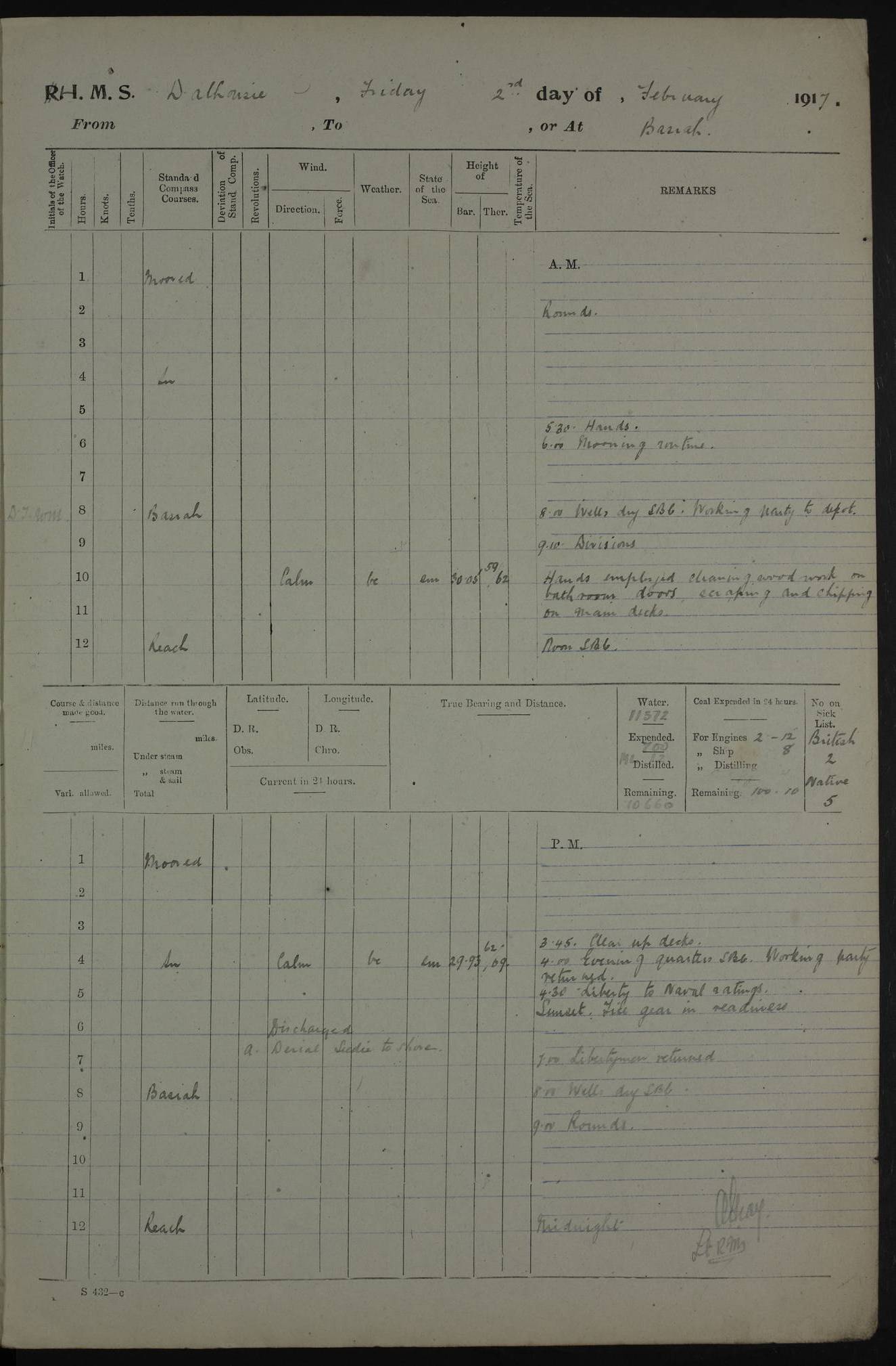 4ef4fafde53e0a0c91005933: (https://s3.amazonaws.com:443/oldweather/ADM53-39406/0016_1.jpg) 29 October 1917 Place: Basrah Lat 30.5269, Long 47.8407 2:00am: Rounds 6:00am: Hands - Morning Routine 7:30am: SCARAB moved to Pier7:45am: Working party to Depot 8:00am: Wells dry - Signal Books correct 9:10am: Divisions 10:00am: Hands employed making wire stops & as requisite 12:00pm: Signal Books correct – Working party returned 1:20pm: Working party to Depot 2:00pm: Hands employed as in forenoon 3:45pm: Cleared up decks 4:00pm: Evening Quarters – Signal Books correct 4:30pm: Working party returned 5:15pm: Liberty to Naval Ratings to attend Boxing competition 6:00pm: Sunset - Fire Gear in readiness 8:00pm: Wells dry - Signal Books correct 9:00pm: Rounds – Signal Books correct 12:00mid: Liberty men returned AM – Discharged To PROSERPINE: J Robertson, Able Seaman 4ef4fafde53e0a0c91005934: (https://s3.amazonaws.com:443/oldweather/ADM53-39406/0017_0.jpg) 30 October 1917 Place: Basrah Lat 30.5269, Long 47.8407 2:00am: Rounds 6:00am: Hands - Morning Routine 7:45am: Working party to Depot 8:00am: Wells dry - Signal Books correct 9:10am: Divisions 10:00am: Native Ratings piped down 12:00pm: Signal Books correct – Working party returned 1:20pm: Working party to Depot 3:45pm: Cleared up decks 4:00pm: Evening Quarters – Signal Books correct 4:30pm: Working party returned 5:15pm: Liberty to Naval Ratings to attend Boxing competition 6:00pm: Sunset - Fire Gear in readiness 7:30pm: Liberty men returned for Tanooma 8:00pm: Wells dry - Signal Books correct 9:00pm: Rounds – Signal Books correct 12:00mid: Liberty men returned 4ef4fafde53e0a0c91005935: (https://s3.amazonaws.com:443/oldweather/ADM53-39406/0017_1.jpg) 31 October 1917 Place: Basrah Lat 30.5269, Long 47.8407 2:00am: Rounds 6:00am: Hands - Morning Routine 7:45am: Working party to Depot 8:00am: Wells dry - Signal Books correct 9:10am: Divisions 10:00am: Hands employed chipping in Warrant Ratings, Store Room, & as requisite 12:00pm: Signal Books correct – Working party returned 1:20pm: Working party to Depot 3:45pm: Cleared up decks 4:00pm: Evening Quarters – Signal Books correct 4:30pm: Working party returned 5:15pm: Liberty to Naval Ratings to attend Boxing competition 6:00pm: Sunset - Fire Gear in readiness 8:00pm: Wells dry - Signal Books correct 9:00pm: Rounds – Signal Books correct 12:00mid: Liberty men returned 4ef4fafde53e0a0c91005936: (https://s3.amazonaws.com:443/oldweather/ADM53-39406/0018_0.jpg) Log Page – Blank – No Data 4ef4fafde53e0a0c91005937: (https://s3.amazonaws.com:443/oldweather/ADM53-39406/0018_1.jpg) Log Page – Blank 4ef4fafee53e0a0c91005938: (https://s3.amazonaws.com:443/oldweather/ADM53-39406/0019_0.jpg) Log Page – Blank 4ef4fafee53e0a0c91005939: (https://s3.amazonaws.com:443/oldweather/ADM53-39406/0019_1.jpg) Log Page – Blank LOGS FOR NOVEMBER 1917 4ef4fafee53e0a0c9100593a: (https://s3.amazonaws.com:443/oldweather/ADM53-39407/0000_0.jpg) Log Page – Cover - November 1917 4ef4fafee53e0a0c9100593b: (https://s3.amazonaws.com:443/oldweather/ADM53-39407/0000_1.jpg) Log Page – Cover - November 1917 4ef4faffe53e0a0c9100593c: (https://s3.amazonaws.com:443/oldweather/ADM53-39407/0001_0.jpg) Log Page – Blank 4ef4faffe53e0a0c9100593d: (https://s3.amazonaws.com:443/oldweather/ADM53-39407/0001_1.jpg) Log Page – Blank – No Data 4ef4faffe53e0a0c9100593e: (https://s3.amazonaws.com:443/oldweather/ADM53-39407/0002_0.jpg) Log Page – Blank – No Data 4ef4faffe53e0a0c9100593f: (https://s3.amazonaws.com:443/oldweather/ADM53-39407/0002_1.jpg) 1 November 1917 Place: Basrah Lat 30.5269, Long 47.8407 2:00am: Rounds 6:00am: Hands - Morning Routine 7:45am: Working party to Depot 8:00am: Wells dry - Signal Books correct 9:10am: Divisions 10:00am: Hands employed scraping in Warrant Ratings Storeroom, fitting new boat’s fenders, & as requisite 12:00pm: Signal Books correct – Working party returned 1:00pm: Issued Quinine to Naval Ratings – Issued Quinine to Native Ratings -= Paid ship’s company in full (White Ratings) 1:20pm: Working party to Depot 3:45pm: Cleared up decks 4:00pm: Evening Quarters – Signal Books correct 4:30pm: Working party returned 5:15pm: Liberty to Naval Ratings 6:00pm: Sunset - Fire Gear in readiness 7:30pm: Liberty men returned 8:00pm: Wells dry - Signal Books correct 9:00pm: Rounds – Signal Books correct AM – Joined From EDWARD ROSS: A Scarborough Stoker Petty Officer 4ef4faffe53e0a0c91005940: (https://s3.amazonaws.com:443/oldweather/ADM53-39407/0003_0.jpg) 2 November 1917 Place: Basrah Lat 30.5269, Long 47.8407 2:00am: Rounds 6:00am: Hands - Morning Routine 7:45am: Working party to Depot 8:00am: Wells dry - Signal Books correct 9:10am: Divisions 10:00am: Hands employed scrubbing awnings & as requisite 12:00pm: Signal Books correct – Working party returned 1:00pm: Paid ship’s company in full (Native Ratings) 1:20pm: Working party to Depot 3:45pm: Cleared up decks 4:00pm: Evening Quarters – Signal Books correct 4:30pm: Working party returned 5:15pm: Liberty to Naval Ratings 6:00pm: Sunset - Fire Gear in readiness 7:30pm: Liberty men returned 8:00pm: Wells dry - Signal Books correct 9:00pm: Rounds – Signal Books correct 4ef4fb00e53e0a0c91005941: (https://s3.amazonaws.com:443/oldweather/ADM53-39407/0003_1.jpg) 3 November 1917 Place: Basrah Lat 30.5269, Long 47.8407 2:00am: Rounds 6:00am: Hands - Morning Routine 7:00am: Exercised Fire Stations 7:45am: Working party to Depot 8:00am: Wells dry - Signal Books correct 9:10am: Divisions 10:00am: Hands employed cleaning ship 12:00pm: Signal Books correct – Working party returned 1:00pm: Hands piped down 3:45pm: Cleared up decks 4:00pm: Evening Quarters – Signal Books correct 5:15pm: Liberty to Naval Ratings 6:00pm: Sunset - Fire Gear in readiness 7:30pm: Liberty men returned 8:00pm: Wells dry - Signal Books correct 9:00pm: Rounds – Signal Books correct 4ef4fb00e53e0a0c91005942: (https://s3.amazonaws.com:443/oldweather/ADM53-3940