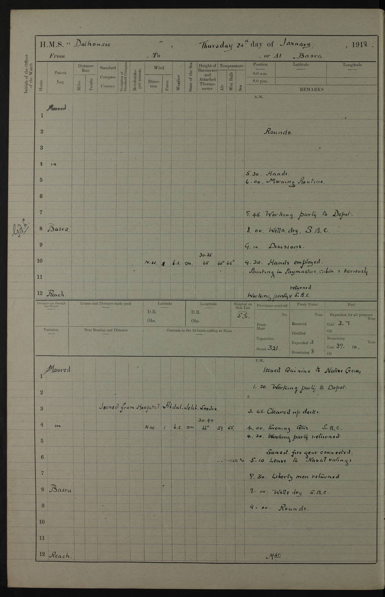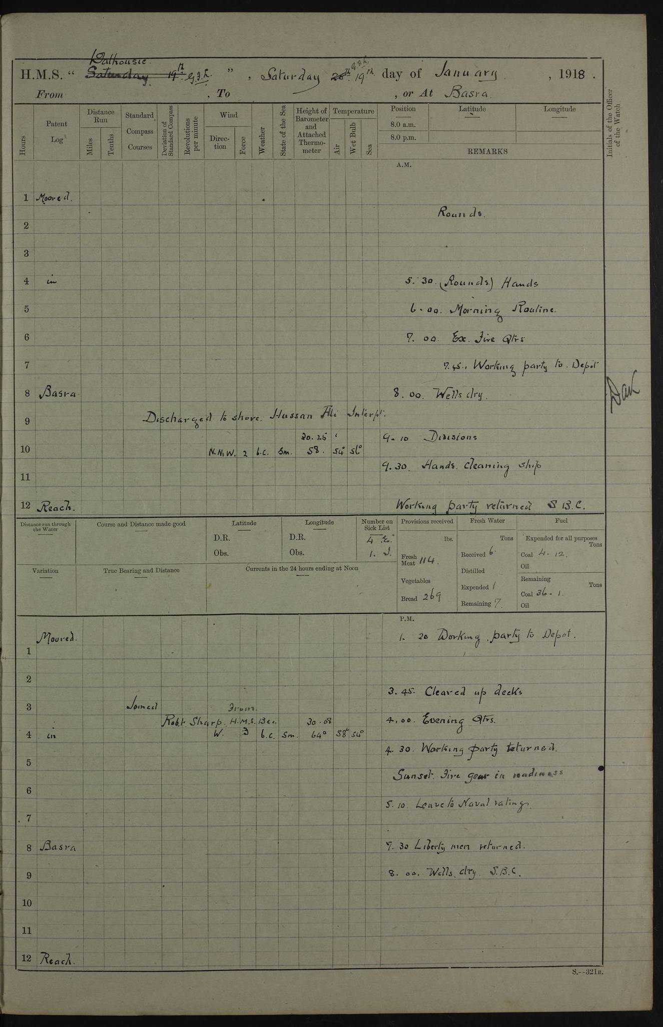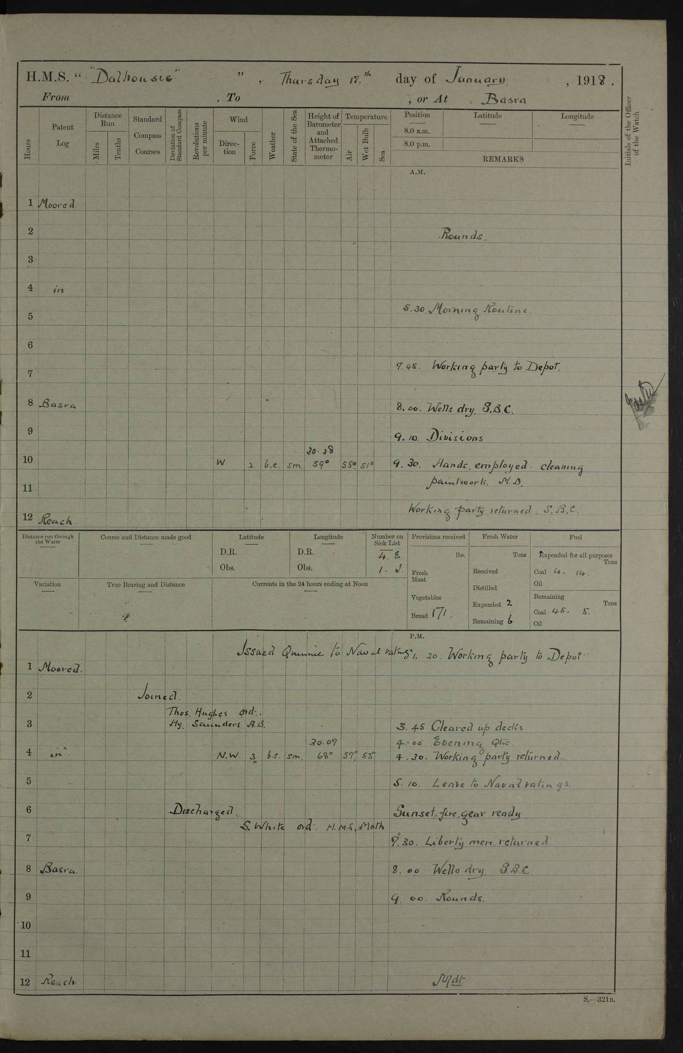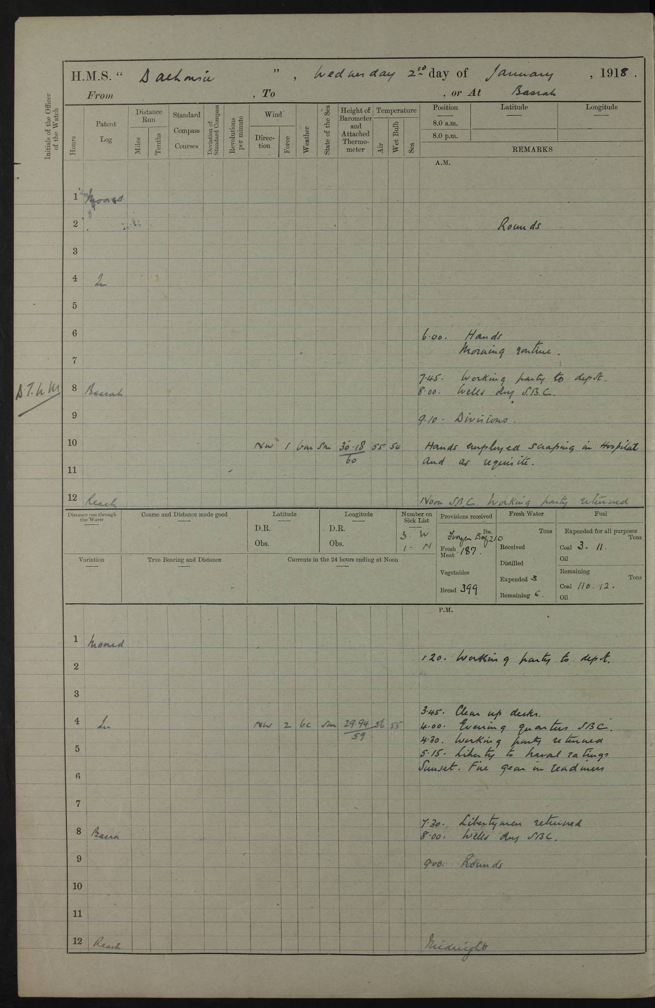 4ef4fb11e53e0a0c910059a4: (https://s3.amazonaws.com:443/oldweather/ADM53-39409/0013_0.jpg) 22 January 1918 Place: Basrah Lat 30.5269, Long 47.8407 2:00am: Rounds 5:30am: Morning Routine 7:45am: Working party to Depot 8:00am: Wells dry - Signal Books correct 9:10am: Divisions 10:00am: Hands employed cleaning ship’s side 12:00pm: Signal Books correct – Working party returned 1:20pm: Working party to Depot 3:45pm: Cleared up decks 4:00pm: Evening Quarters – Signal Books correct 4:30pm: Working party returned 5:10pm: Liberty to Naval Ratings 6:00pm: Sunset - Fire Gear in readiness 7:30pm: Liberty men returned 8:00pm: Wells dry - Signal Books correct 9:00pm: Rounds – Signal Books correct PM – Joined From MANTIS: E P Flemming, Leading Seaman From MOTH: M J Haclan, Leading Seaman From BEE: E Saxby, Leading Seaman PM - Discharged To HOVERFLY: F Dale, Able Seaman To MANTIS: H. Saunders, Able Seaman To GNAT: W. Beaumont, Ordinary Seaman - L. Dannell, Ordinary Seaman To TARANTULA: F. Smith, Leading Seaman To BEE: H. Frost Able Seaman To Passage: Perera, Officer's Steward - S De Souza Officer's Steward - E Fargesion Chief Petty Officer - J Moore, Chief Petty Officer - J Maloney, Petty Officer - J Harnott, Petty Officer To BLACKFLY: G Kirk, Petty Officer 4ef4fb11e53e0a0c910059a5: (https://s3.amazonaws.com:443/oldweather/ADM53-39409/0013_1.jpg) 23 January 1918 Place: Basrah Lat 30.5269, Long 47.8407 2:00am: Rounds 5:00am: Hands 5:30am: Morning Routine 7:45am: Working party to Depot 8:00am: Wells dry - Signal Books correct 9:10am: Divisions 10:00am: Hands employed scraping waterline 12:00pm: Signal Books correct – Working party returned 1:20pm: Working party to Depot 3:45pm: Cleared up decks 4:00pm: Evening Quarters – Signal Books correct 4:30pm: Working party returned 5:10pm: Liberty to Naval Ratings 6:00pm: Sunset - Fire Gear in readiness 7:30pm: Liberty men returned 8:00pm: Wells dry - Signal Books correct 9:00pm: Rounds – Signal Books correct PM – Joined From Hospital: W Slinger, Petty Officer From Patrol Ship 58: W Wheatley, Ordinary Seaman – A Beam, Stoker 4ef4fb12e53e0a0c910059a6: (https://s3.amazonaws.com:443/oldweather/ADM53-39409/0014_0.jpg) 24 January 1918 Place: Basrah Lat 30.5269, Long 47.8407 2:00am: Rounds 5:30am: Hands 6:00am: Morning Routine 7:45am: Working party to Depot 8:00am: Wells dry - Signal Books correct 9:10am: Divisions 10:00am: Hands employed painting in Paymaster’s cabin & as requisite 12:00pm: Signal Books correct – Working party returned 1:00pm: Issued Quinine to Native Ratings 1:20pm: Working party to Depot 3:45pm: Cleared up decks 4:00pm: Evening Quarters – Signal Books correct 4:30pm: Working party returned 5:10pm: Liberty to Naval Ratings 6:00pm: Sunset - Fire Gear in readiness 7:30pm: Liberty men returned 8:00pm: Wells dry - Signal Books correct 9:00pm: Rounds – Signal Books correct PM – Joined From Hospital: Abdul Jelib, Seedie 4ef4fb12e53e0a0c910059a7: (https://s3.amazonaws.com:443/oldweather/ADM53-39409/0014_1.jpg) 25 January 1918 Place: Basrah Lat 30.5269, Long 47.8407 2:00am: Rounds 5:30am: Hands 6:00am: Morning Routine 7:45am: Working party to Depot 8:00am: Wells dry - Signal Books correct 9:10am: Divisions 10:00am: Hands employed painting in Warrant Ratings cabin & as requisite 12:00pm: Signal Books correct – Working party returned 1:20pm: Working party to Depot 3:45pm: Cleared up decks 4:00pm: Evening Quarters – Signal Books correct 4:30pm: Working party returned 5:10pm: Liberty to Naval Ratings 6:00pm: Sunset - Fire Gear in readiness 7:30pm: Liberty men returned 8:00pm: Wells dry - Signal Books correct 9:00pm: Rounds – Signal Books correct PM – Joined From HOVERFLY: WP Blatchford, Stoker From Motor Launch 7: H Gardner, Stoker Petty Officer PM - Discharged To Hospital: A Abbott, Ordinary Seaman 4ef4fb12e53e0a0c910059a8: (https://s3.amazonaws.com:443/oldweather/ADM53-39409/0015_0.jpg) 26 January 1918 Place: Basrah Lat 30.5269, Long 47.8407 2:00am: Rounds 5:30am: Morning Routine 7:00am: Exercised Fire stations 8:00am: Wells dry 9:10am: Divisions 9:30am: Saturday Routine 12:00pm: Signal Books correct – Working party returned 1:30pm: Leave to Naval ratings 3:45pm: Cleared up decks 4:00pm: Evening Quarters – Signal Books correct 6:00pm: Sunset - Fire Gear in readiness 7:30pm: Liberty men returned 8:00pm: Wells dry - Signal Books correct 9:00pm: Rounds – Signal Books correct 4ef4fb12e53e0a0c910059a9: (https://s3.amazonaws.com:443/oldweather/ADM53-39409/0015_1.jpg) 27 January 1918 Place: Basrah Lat 30.5269, Long 47.8407 2:00am: Rounds 5:30am: Hands 6:00am: Morning Routine 7:45am: Working party to Depot 8:00am: Wells dry – Signal Books correct 8:30am: Non Conformist Church party landed 9:15am: Divisions 9:30am: Divine service 11:00am: Piped down 1:00pm: Issued Quinine to Naval Ratings - Issued Quinine to Native Ratings 1:30pm: Liberty to Naval Ratings 3:45pm: Cleared up decks 4:00pm: Evening Quarters – Signal Books correct 6:00pm: Sunset - Fire Gear in readiness 7:30pm: Liberty men returned 8:00pm: Wells dry - Signal Books correct 9:00pm: Rounds – Signal Books correct PM – Joined From Hospital: JR Holland, Stoker 4ef4fb12e53e0a0c910059aa: (https://s3.amazonaws.com:443/oldweather/ADM53-39409/0016_0.jpg) 28 January 1918 Place: Basrah Lat 30.5269, Long 47.8407 2:00am: Rounds 5:30am: Hands 6:00am: Morning Routine 7:45am: Working party to Depot 8:00am: Wells dry - Signal Books correct 9:10am: Divisions 10:00am: Hands employed scraping jalousies Main Deck 12:00pm: Working party returned 1:20pm: Working party to Depot 3:45pm: Cleared up decks 4:00pm: Evening Quarters 4:30pm: Working party returned 5:10pm: Liberty to Naval Ratings 6:00pm: Sunset - Fire Gear in readiness 7:30pm: Liberty men returned 8:00pm: Wells dry - Signal Books correct 9:00pm: Rounds – Signal Books correct 4ef4fb12e53e0a0c910059ab: (https://s3.amazonaws.com:443/oldweather/ADM53-39409/0016_1.jpg) 29 January 1918 Place: Basrah Lat 30.5269, Long 47.8407 2