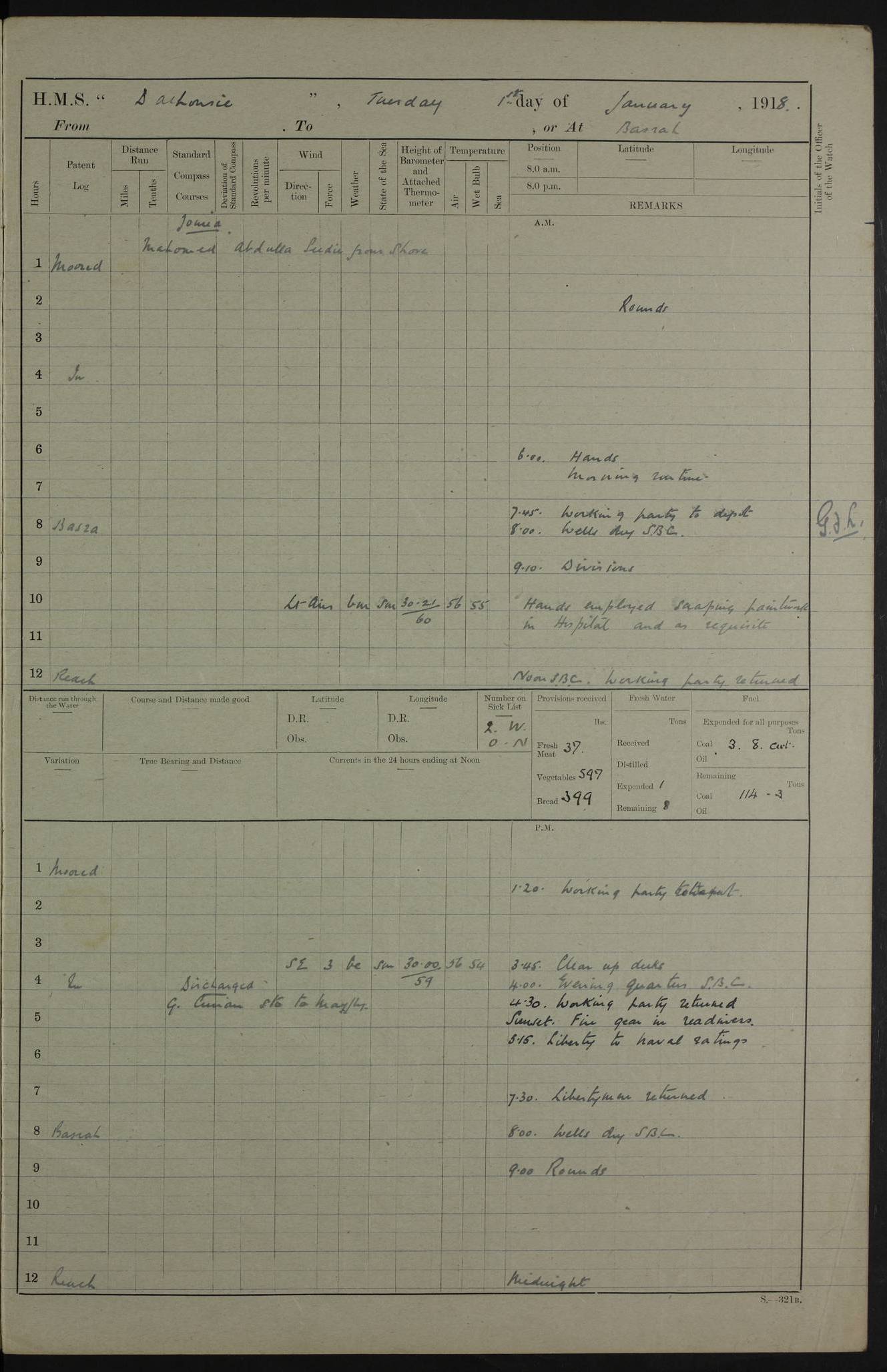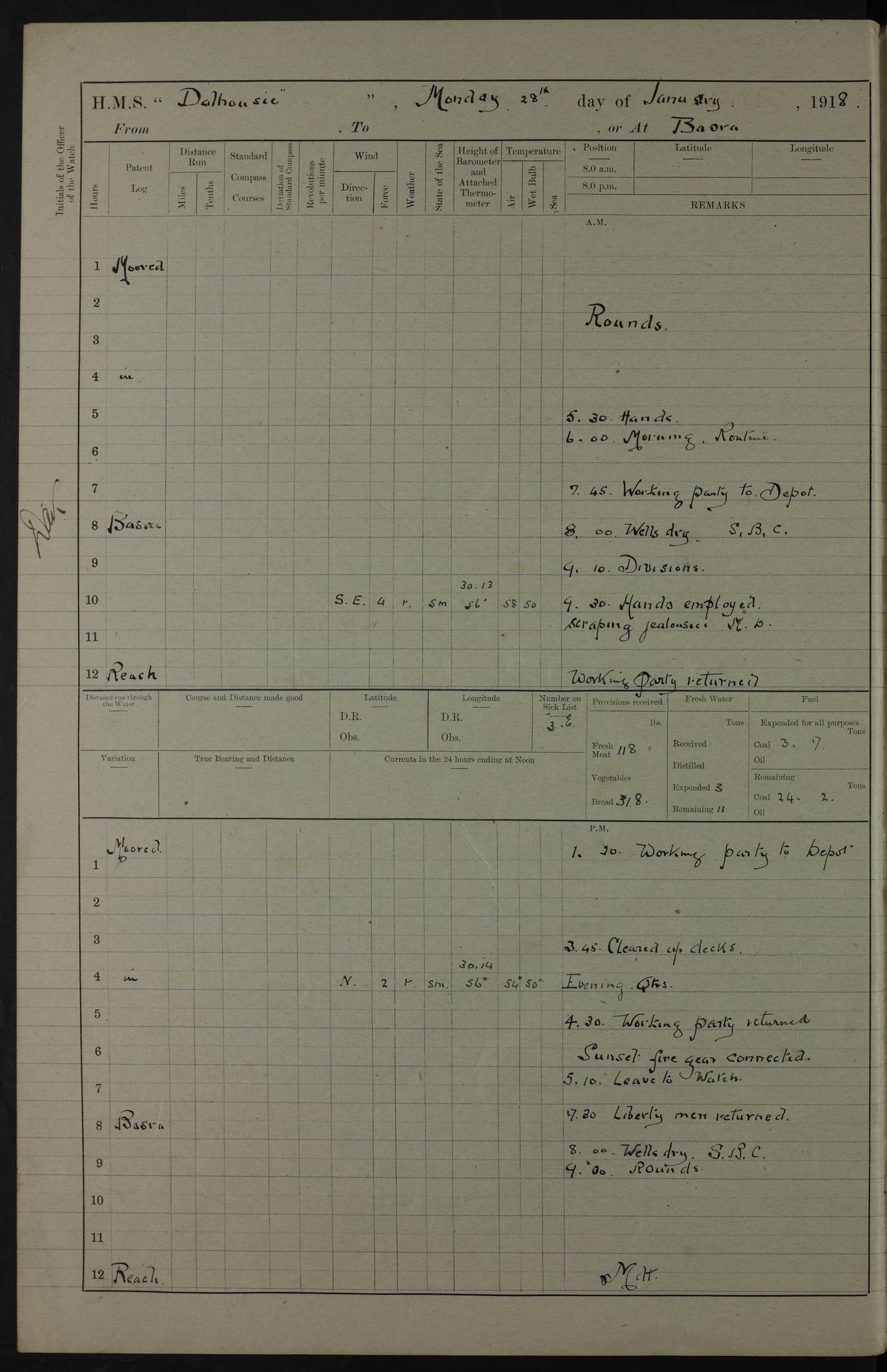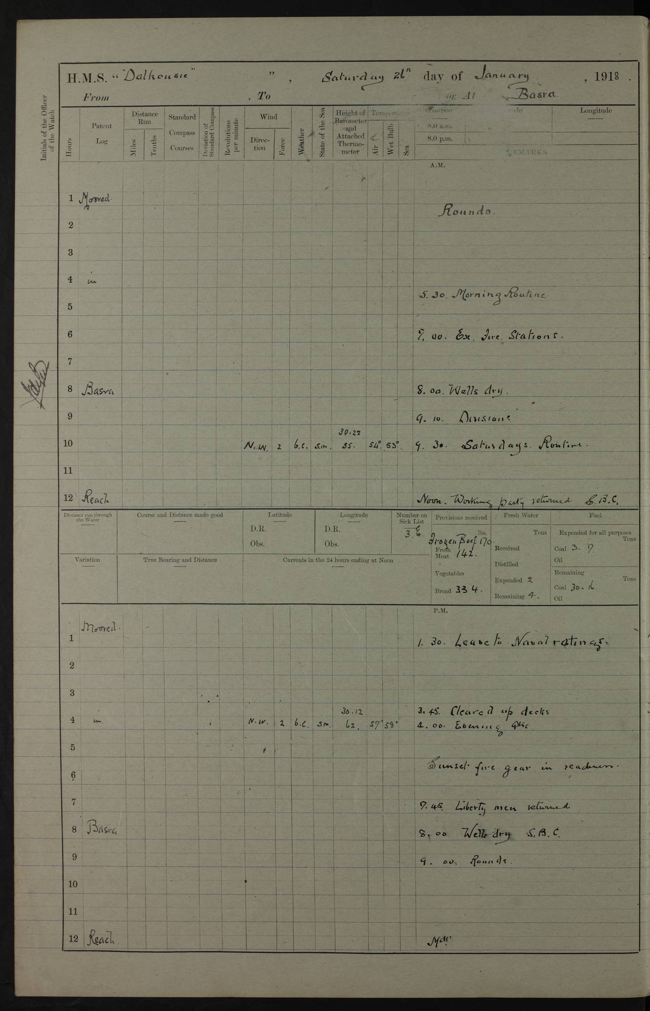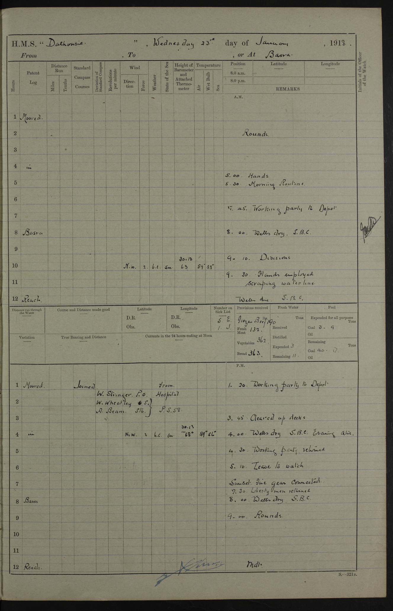 4ef4fb11e53e0a0c910059a4: (https://s3.amazonaws.com:443/oldweather/ADM53-39409/0013_0.jpg) 22 January 1918 Place: Basrah Lat 30.5269, Long 47.8407 2:00am: Rounds 5:30am: Morning Routine 7:45am: Working party to Depot 8:00am: Wells dry - Signal Books correct 9:10am: Divisions 10:00am: Hands employed cleaning ship’s side 12:00pm: Signal Books correct – Working party returned 1:20pm: Working party to Depot 3:45pm: Cleared up decks 4:00pm: Evening Quarters – Signal Books correct 4:30pm: Working party returned 5:10pm: Liberty to Naval Ratings 6:00pm: Sunset - Fire Gear in readiness 7:30pm: Liberty men returned 8:00pm: Wells dry - Signal Books correct 9:00pm: Rounds – Signal Books correct PM – Joined From MANTIS: E P Flemming, Leading Seaman From MOTH: M J Haclan, Leading Seaman From BEE: E Saxby, Leading Seaman PM - Discharged To HOVERFLY: F Dale, Able Seaman To MANTIS: H. Saunders, Able Seaman To GNAT: W. Beaumont, Ordinary Seaman - L. Dannell, Ordinary Seaman To TARANTULA: F. Smith, Leading Seaman To BEE: H. Frost Able Seaman To Passage: Perera, Officer's Steward - S De Souza Officer's Steward - E Fargesion Chief Petty Officer - J Moore, Chief Petty Officer - J Maloney, Petty Officer - J Harnott, Petty Officer To BLACKFLY: G Kirk, Petty Officer 4ef4fb11e53e0a0c910059a5: (https://s3.amazonaws.com:443/oldweather/ADM53-39409/0013_1.jpg) 23 January 1918 Place: Basrah Lat 30.5269, Long 47.8407 2:00am: Rounds 5:00am: Hands 5:30am: Morning Routine 7:45am: Working party to Depot 8:00am: Wells dry - Signal Books correct 9:10am: Divisions 10:00am: Hands employed scraping waterline 12:00pm: Signal Books correct – Working party returned 1:20pm: Working party to Depot 3:45pm: Cleared up decks 4:00pm: Evening Quarters – Signal Books correct 4:30pm: Working party returned 5:10pm: Liberty to Naval Ratings 6:00pm: Sunset - Fire Gear in readiness 7:30pm: Liberty men returned 8:00pm: Wells dry - Signal Books correct 9:00pm: Rounds – Signal Books correct PM – Joined From Hospital: W Slinger, Petty Officer From Patrol Ship 58: W Wheatley, Ordinary Seaman – A Beam, Stoker 4ef4fb12e53e0a0c910059a6: (https://s3.amazonaws.com:443/oldweather/ADM53-39409/0014_0.jpg) 24 January 1918 Place: Basrah Lat 30.5269, Long 47.8407 2:00am: Rounds 5:30am: Hands 6:00am: Morning Routine 7:45am: Working party to Depot 8:00am: Wells dry - Signal Books correct 9:10am: Divisions 10:00am: Hands employed painting in Paymaster’s cabin & as requisite 12:00pm: Signal Books correct – Working party returned 1:00pm: Issued Quinine to Native Ratings 1:20pm: Working party to Depot 3:45pm: Cleared up decks 4:00pm: Evening Quarters – Signal Books correct 4:30pm: Working party returned 5:10pm: Liberty to Naval Ratings 6:00pm: Sunset - Fire Gear in readiness 7:30pm: Liberty men returned 8:00pm: Wells dry - Signal Books correct 9:00pm: Rounds – Signal Books correct PM – Joined From Hospital: Abdul Jelib, Seedie 4ef4fb12e53e0a0c910059a7: (https://s3.amazonaws.com:443/oldweather/ADM53-39409/0014_1.jpg) 25 January 1918 Place: Basrah Lat 30.5269, Long 47.8407 2:00am: Rounds 5:30am: Hands 6:00am: Morning Routine 7:45am: Working party to Depot 8:00am: Wells dry - Signal Books correct 9:10am: Divisions 10:00am: Hands employed painting in Warrant Ratings cabin & as requisite 12:00pm: Signal Books correct – Working party returned 1:20pm: Working party to Depot 3:45pm: Cleared up decks 4:00pm: Evening Quarters – Signal Books correct 4:30pm: Working party returned 5:10pm: Liberty to Naval Ratings 6:00pm: Sunset - Fire Gear in readiness 7:30pm: Liberty men returned 8:00pm: Wells dry - Signal Books correct 9:00pm: Rounds – Signal Books correct PM – Joined From HOVERFLY: WP Blatchford, Stoker From Motor Launch 7: H Gardner, Stoker Petty Officer PM - Discharged To Hospital: A Abbott, Ordinary Seaman 4ef4fb12e53e0a0c910059a8: (https://s3.amazonaws.com:443/oldweather/ADM53-39409/0015_0.jpg) 26 January 1918 Place: Basrah Lat 30.5269, Long 47.8407 2:00am: Rounds 5:30am: Morning Routine 7:00am: Exercised Fire stations 8:00am: Wells dry 9:10am: Divisions 9:30am: Saturday Routine 12:00pm: Signal Books correct – Working party returned 1:30pm: Leave to Naval ratings 3:45pm: Cleared up decks 4:00pm: Evening Quarters – Signal Books correct 6:00pm: Sunset - Fire Gear in readiness 7:30pm: Liberty men returned 8:00pm: Wells dry - Signal Books correct 9:00pm: Rounds – Signal Books correct 4ef4fb12e53e0a0c910059a9: (https://s3.amazonaws.com:443/oldweather/ADM53-39409/0015_1.jpg) 27 January 1918 Place: Basrah Lat 30.5269, Long 47.8407 2:00am: Rounds 5:30am: Hands 6:00am: Morning Routine 7:45am: Working party to Depot 8:00am: Wells dry – Signal Books correct 8:30am: Non Conformist Church party landed 9:15am: Divisions 9:30am: Divine service 11:00am: Piped down 1:00pm: Issued Quinine to Naval Ratings - Issued Quinine to Native Ratings 1:30pm: Liberty to Naval Ratings 3:45pm: Cleared up decks 4:00pm: Evening Quarters – Signal Books correct 6:00pm: Sunset - Fire Gear in readiness 7:30pm: Liberty men returned 8:00pm: Wells dry - Signal Books correct 9:00pm: Rounds – Signal Books correct PM – Joined From Hospital: JR Holland, Stoker 4ef4fb12e53e0a0c910059aa: (https://s3.amazonaws.com:443/oldweather/ADM53-39409/0016_0.jpg) 28 January 1918 Place: Basrah Lat 30.5269, Long 47.8407 2:00am: Rounds 5:30am: Hands 6:00am: Morning Routine 7:45am: Working party to Depot 8:00am: Wells dry - Signal Books correct 9:10am: Divisions 10:00am: Hands employed scraping jalousies Main Deck 12:00pm: Working party returned 1:20pm: Working party to Depot 3:45pm: Cleared up decks 4:00pm: Evening Quarters 4:30pm: Working party returned 5:10pm: Liberty to Naval Ratings 6:00pm: Sunset - Fire Gear in readiness 7:30pm: Liberty men returned 8:00pm: Wells dry - Signal Books correct 9:00pm: Rounds – Signal Books correct 4ef4fb12e53e0a0c910059ab: (https://s3.amazonaws.com:443/oldweather/ADM53-39409/0016_1.jpg) 29 January 1918 Place: Basrah Lat 30.5269, Long 47.8407 2