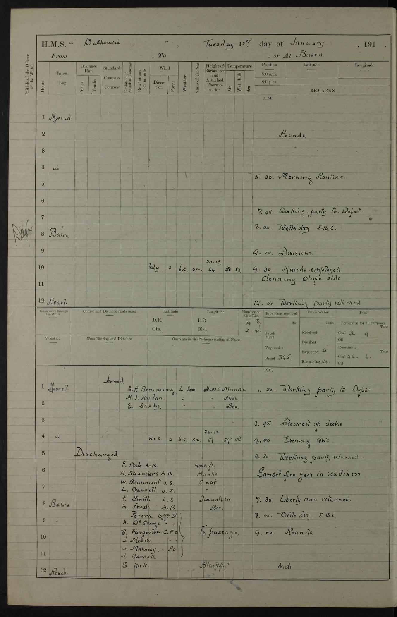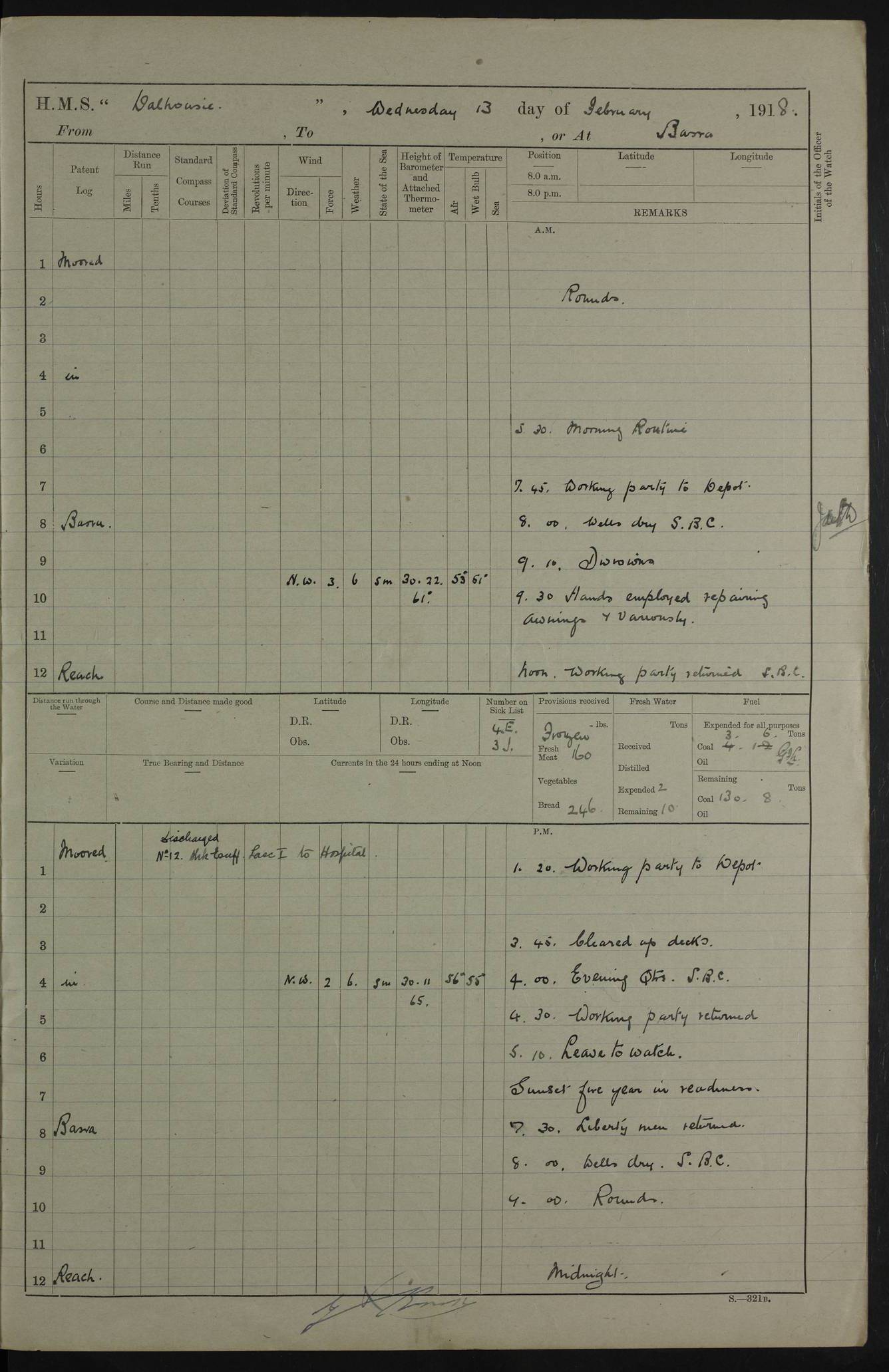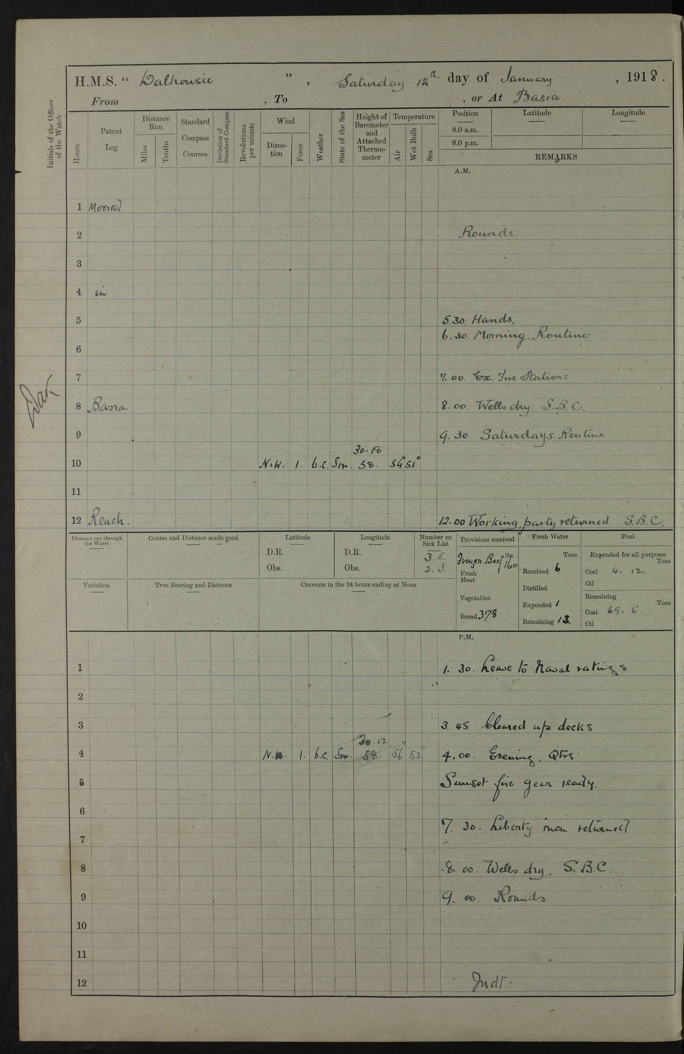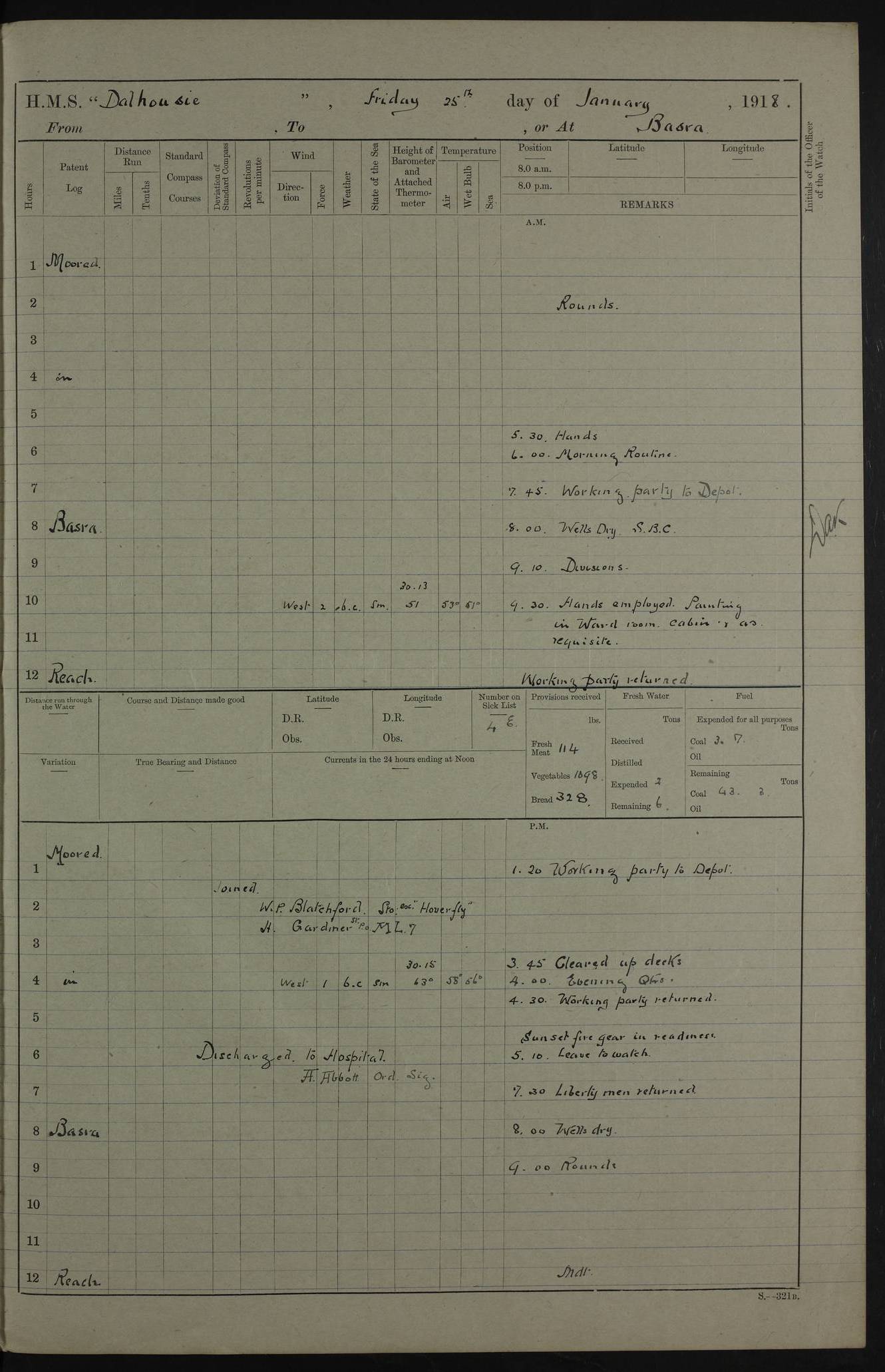 4ef4fb11e53e0a0c910059a4: (https://s3.amazonaws.com:443/oldweather/ADM53-39409/0013_0.jpg) 22 January 1918 Place: Basrah Lat 30.5269, Long 47.8407 2:00am: Rounds 5:30am: Morning Routine 7:45am: Working party to Depot 8:00am: Wells dry - Signal Books correct 9:10am: Divisions 10:00am: Hands employed cleaning ship’s side 12:00pm: Signal Books correct – Working party returned 1:20pm: Working party to Depot 3:45pm: Cleared up decks 4:00pm: Evening Quarters – Signal Books correct 4:30pm: Working party returned 5:10pm: Liberty to Naval Ratings 6:00pm: Sunset - Fire Gear in readiness 7:30pm: Liberty men returned 8:00pm: Wells dry - Signal Books correct 9:00pm: Rounds – Signal Books correct PM – Joined From MANTIS: E P Flemming, Leading Seaman From MOTH: M J Haclan, Leading Seaman From BEE: E Saxby, Leading Seaman PM - Discharged To HOVERFLY: F Dale, Able Seaman To MANTIS: H. Saunders, Able Seaman To GNAT: W. Beaumont, Ordinary Seaman - L. Dannell, Ordinary Seaman To TARANTULA: F. Smith, Leading Seaman To BEE: H. Frost Able Seaman To Passage: Perera, Officer's Steward - S De Souza Officer's Steward - E Fargesion Chief Petty Officer - J Moore, Chief Petty Officer - J Maloney, Petty Officer - J Harnott, Petty Officer To BLACKFLY: G Kirk, Petty Officer 4ef4fb11e53e0a0c910059a5: (https://s3.amazonaws.com:443/oldweather/ADM53-39409/0013_1.jpg) 23 January 1918 Place: Basrah Lat 30.5269, Long 47.8407 2:00am: Rounds 5:00am: Hands 5:30am: Morning Routine 7:45am: Working party to Depot 8:00am: Wells dry - Signal Books correct 9:10am: Divisions 10:00am: Hands employed scraping waterline 12:00pm: Signal Books correct – Working party returned 1:20pm: Working party to Depot 3:45pm: Cleared up decks 4:00pm: Evening Quarters – Signal Books correct 4:30pm: Working party returned 5:10pm: Liberty to Naval Ratings 6:00pm: Sunset - Fire Gear in readiness 7:30pm: Liberty men returned 8:00pm: Wells dry - Signal Books correct 9:00pm: Rounds – Signal Books correct PM – Joined From Hospital: W Slinger, Petty Officer From Patrol Ship 58: W Wheatley, Ordinary Seaman – A Beam, Stoker 4ef4fb12e53e0a0c910059a6: (https://s3.amazonaws.com:443/oldweather/ADM53-39409/0014_0.jpg) 24 January 1918 Place: Basrah Lat 30.5269, Long 47.8407 2:00am: Rounds 5:30am: Hands 6:00am: Morning Routine 7:45am: Working party to Depot 8:00am: Wells dry - Signal Books correct 9:10am: Divisions 10:00am: Hands employed painting in Paymaster’s cabin & as requisite 12:00pm: Signal Books correct – Working party returned 1:00pm: Issued Quinine to Native Ratings 1:20pm: Working party to Depot 3:45pm: Cleared up decks 4:00pm: Evening Quarters – Signal Books correct 4:30pm: Working party returned 5:10pm: Liberty to Naval Ratings 6:00pm: Sunset - Fire Gear in readiness 7:30pm: Liberty men returned 8:00pm: Wells dry - Signal Books correct 9:00pm: Rounds – Signal Books correct PM – Joined From Hospital: Abdul Jelib, Seedie 4ef4fb12e53e0a0c910059a7: (https://s3.amazonaws.com:443/oldweather/ADM53-39409/0014_1.jpg) 25 January 1918 Place: Basrah Lat 30.5269, Long 47.8407 2:00am: Rounds 5:30am: Hands 6:00am: Morning Routine 7:45am: Working party to Depot 8:00am: Wells dry - Signal Books correct 9:10am: Divisions 10:00am: Hands employed painting in Warrant Ratings cabin & as requisite 12:00pm: Signal Books correct – Working party returned 1:20pm: Working party to Depot 3:45pm: Cleared up decks 4:00pm: Evening Quarters – Signal Books correct 4:30pm: Working party returned 5:10pm: Liberty to Naval Ratings 6:00pm: Sunset - Fire Gear in readiness 7:30pm: Liberty men returned 8:00pm: Wells dry - Signal Books correct 9:00pm: Rounds – Signal Books correct PM – Joined From HOVERFLY: WP Blatchford, Stoker From Motor Launch 7: H Gardner, Stoker Petty Officer PM - Discharged To Hospital: A Abbott, Ordinary Seaman 4ef4fb12e53e0a0c910059a8: (https://s3.amazonaws.com:443/oldweather/ADM53-39409/0015_0.jpg) 26 January 1918 Place: Basrah Lat 30.5269, Long 47.8407 2:00am: Rounds 5:30am: Morning Routine 7:00am: Exercised Fire stations 8:00am: Wells dry 9:10am: Divisions 9:30am: Saturday Routine 12:00pm: Signal Books correct – Working party returned 1:30pm: Leave to Naval ratings 3:45pm: Cleared up decks 4:00pm: Evening Quarters – Signal Books correct 6:00pm: Sunset - Fire Gear in readiness 7:30pm: Liberty men returned 8:00pm: Wells dry - Signal Books correct 9:00pm: Rounds – Signal Books correct 4ef4fb12e53e0a0c910059a9: (https://s3.amazonaws.com:443/oldweather/ADM53-39409/0015_1.jpg) 27 January 1918 Place: Basrah Lat 30.5269, Long 47.8407 2:00am: Rounds 5:30am: Hands 6:00am: Morning Routine 7:45am: Working party to Depot 8:00am: Wells dry – Signal Books correct 8:30am: Non Conformist Church party landed 9:15am: Divisions 9:30am: Divine service 11:00am: Piped down 1:00pm: Issued Quinine to Naval Ratings - Issued Quinine to Native Ratings 1:30pm: Liberty to Naval Ratings 3:45pm: Cleared up decks 4:00pm: Evening Quarters – Signal Books correct 6:00pm: Sunset - Fire Gear in readiness 7:30pm: Liberty men returned 8:00pm: Wells dry - Signal Books correct 9:00pm: Rounds – Signal Books correct PM – Joined From Hospital: JR Holland, Stoker 4ef4fb12e53e0a0c910059aa: (https://s3.amazonaws.com:443/oldweather/ADM53-39409/0016_0.jpg) 28 January 1918 Place: Basrah Lat 30.5269, Long 47.8407 2:00am: Rounds 5:30am: Hands 6:00am: Morning Routine 7:45am: Working party to Depot 8:00am: Wells dry - Signal Books correct 9:10am: Divisions 10:00am: Hands employed scraping jalousies Main Deck 12:00pm: Working party returned 1:20pm: Working party to Depot 3:45pm: Cleared up decks 4:00pm: Evening Quarters 4:30pm: Working party returned 5:10pm: Liberty to Naval Ratings 6:00pm: Sunset - Fire Gear in readiness 7:30pm: Liberty men returned 8:00pm: Wells dry - Signal Books correct 9:00pm: Rounds – Signal Books correct 4ef4fb12e53e0a0c910059ab: (https://s3.amazonaws.com:443/oldweather/ADM53-39409/0016_1.jpg) 29 January 1918 Place: Basrah Lat 30.5269, Long 47.8407 2